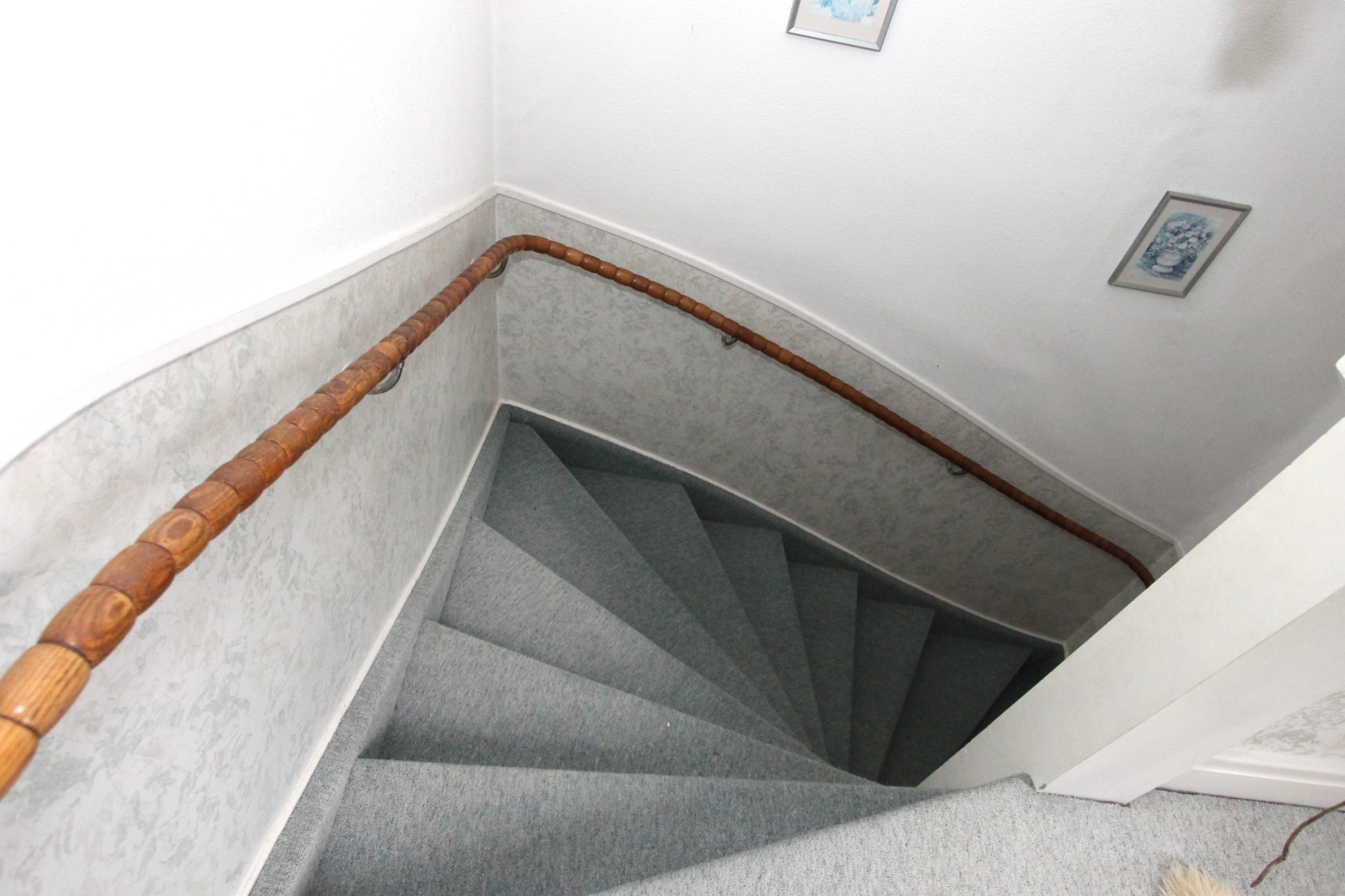 En fin trappa leder oss upp till det övre planet. Den är klädd med heltäckningsmatta, bröstning på väggen. En mycket vacker ledstång som förmodligen är tillverkad i Alsterbro. Ljus och trevlig hall med utgång till den rymliga balkongen. Stor "gåinigargderob".