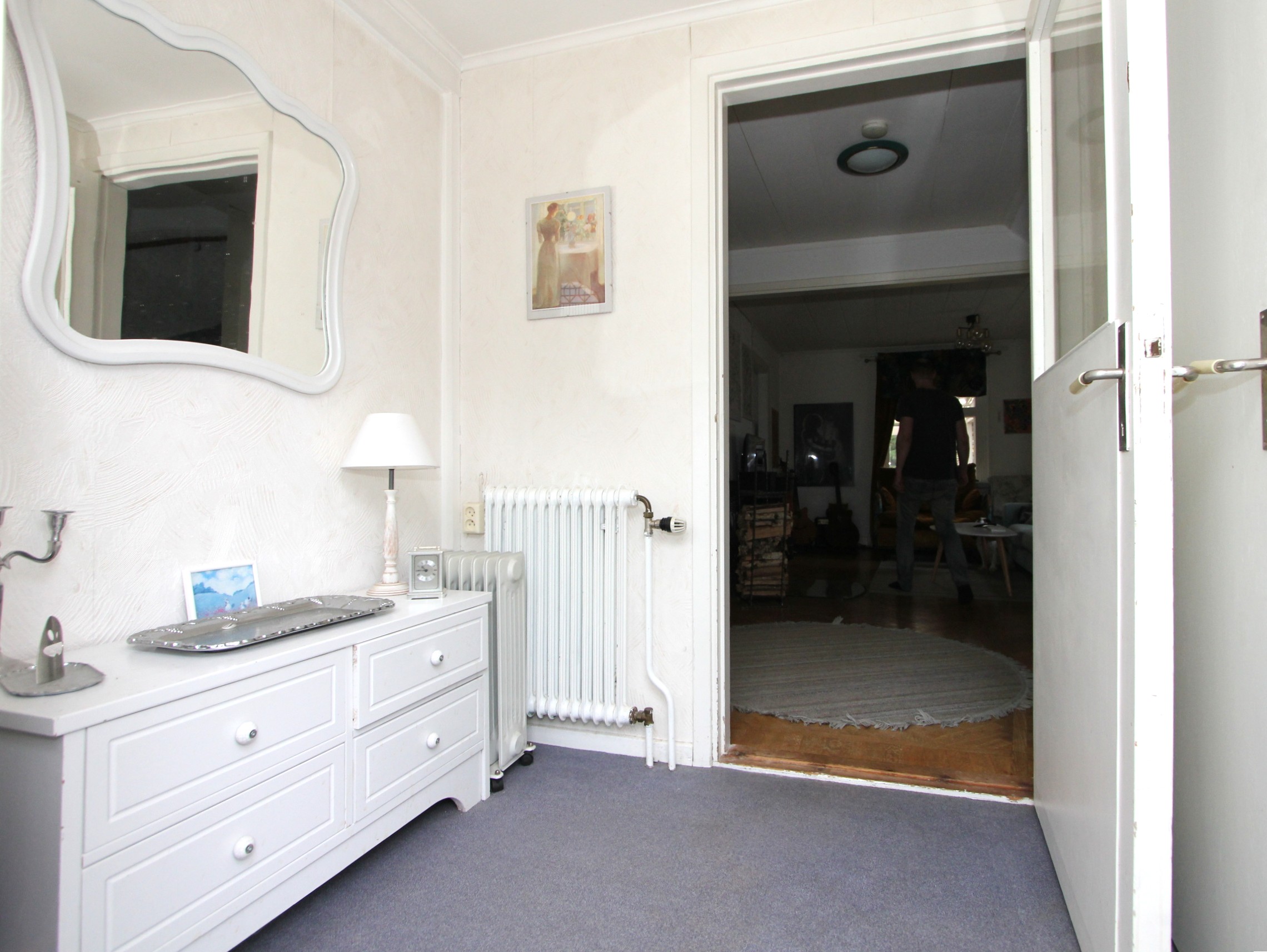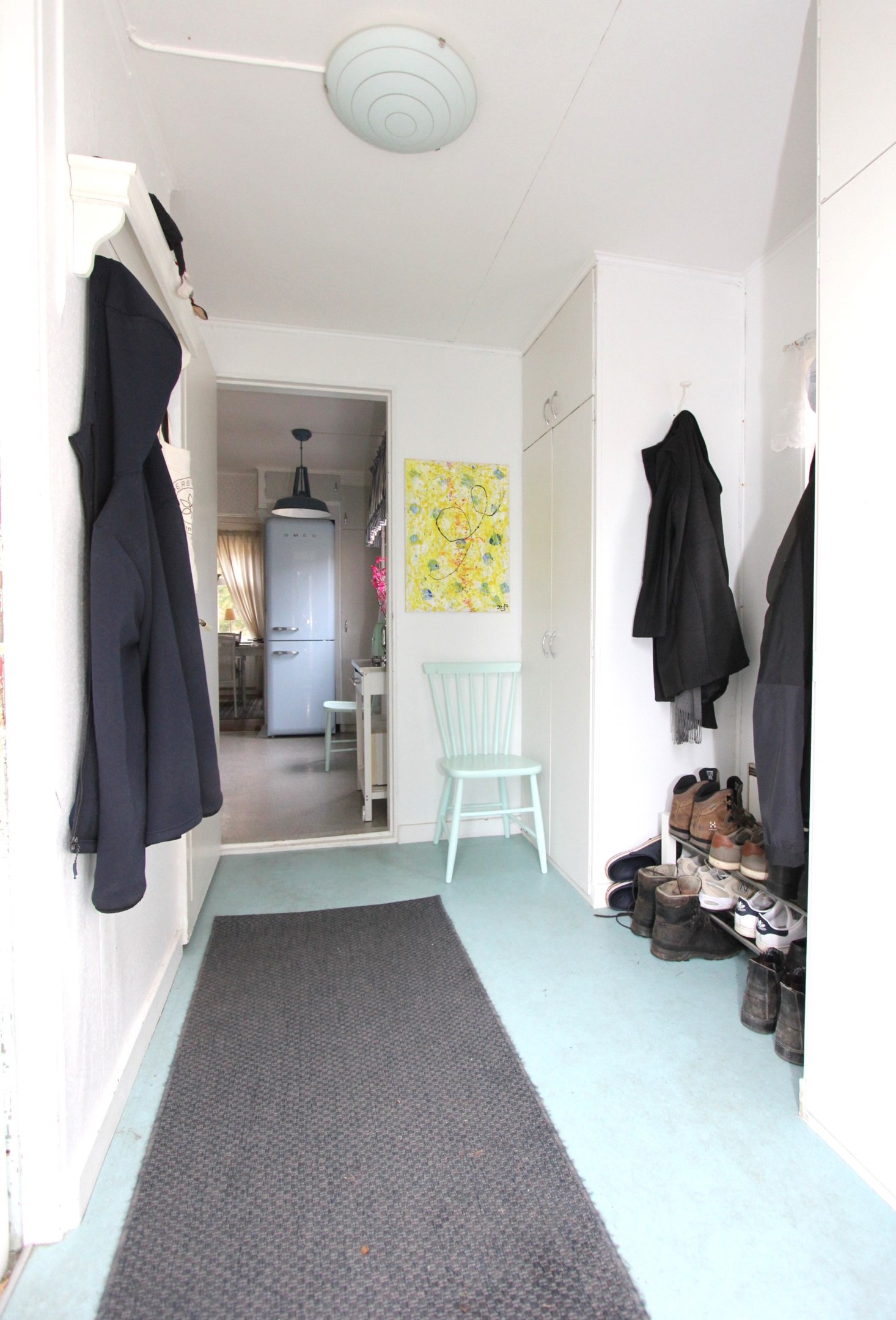 Det blir liksom den entrén man använder mest.. Man har parkerat bilen i carporten eller ställt cykeln utanför. Rymlig groventré med 2 dubbelgarderober med överskåp samt klädavhängning. 1 fönster. Nergång till källaren.