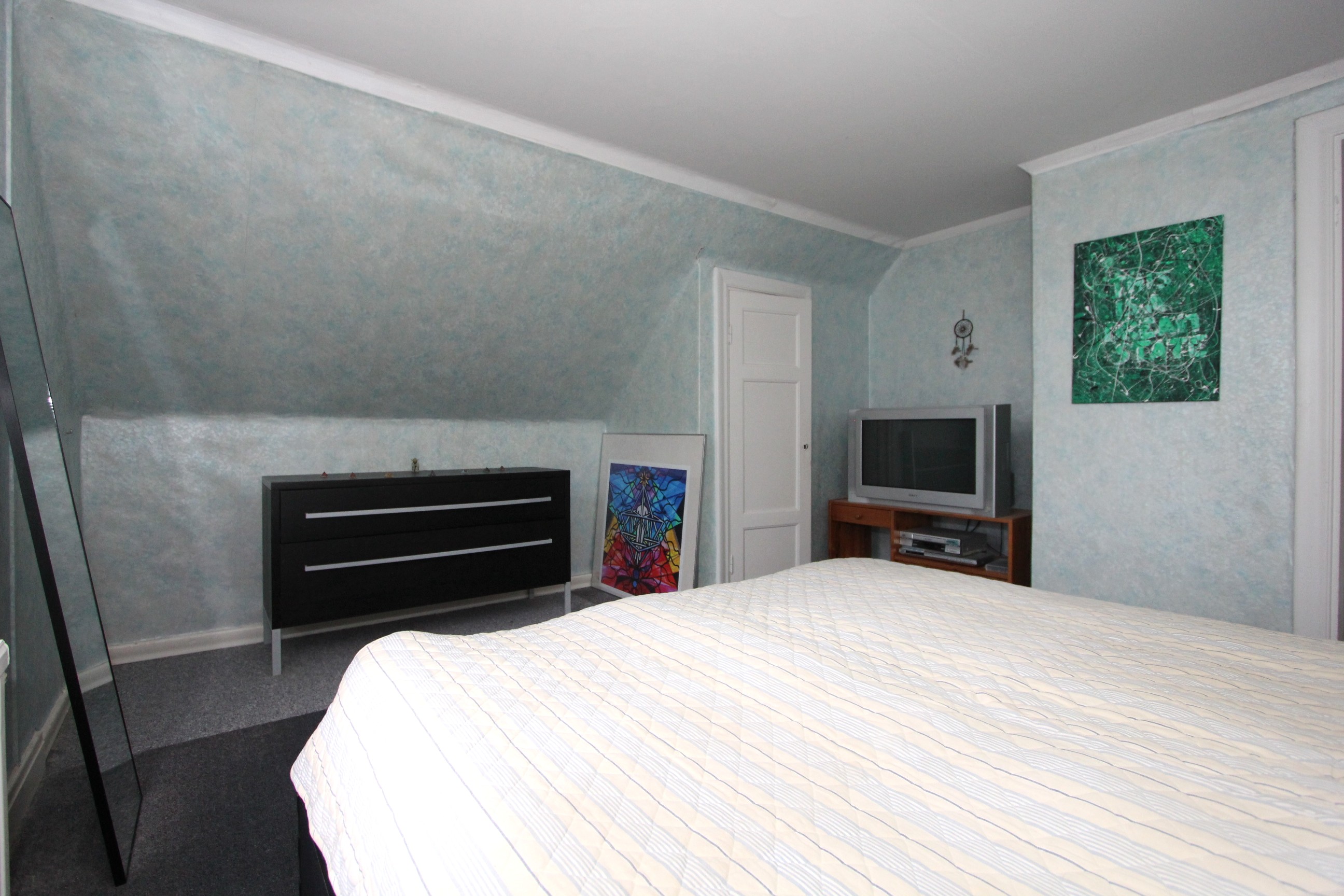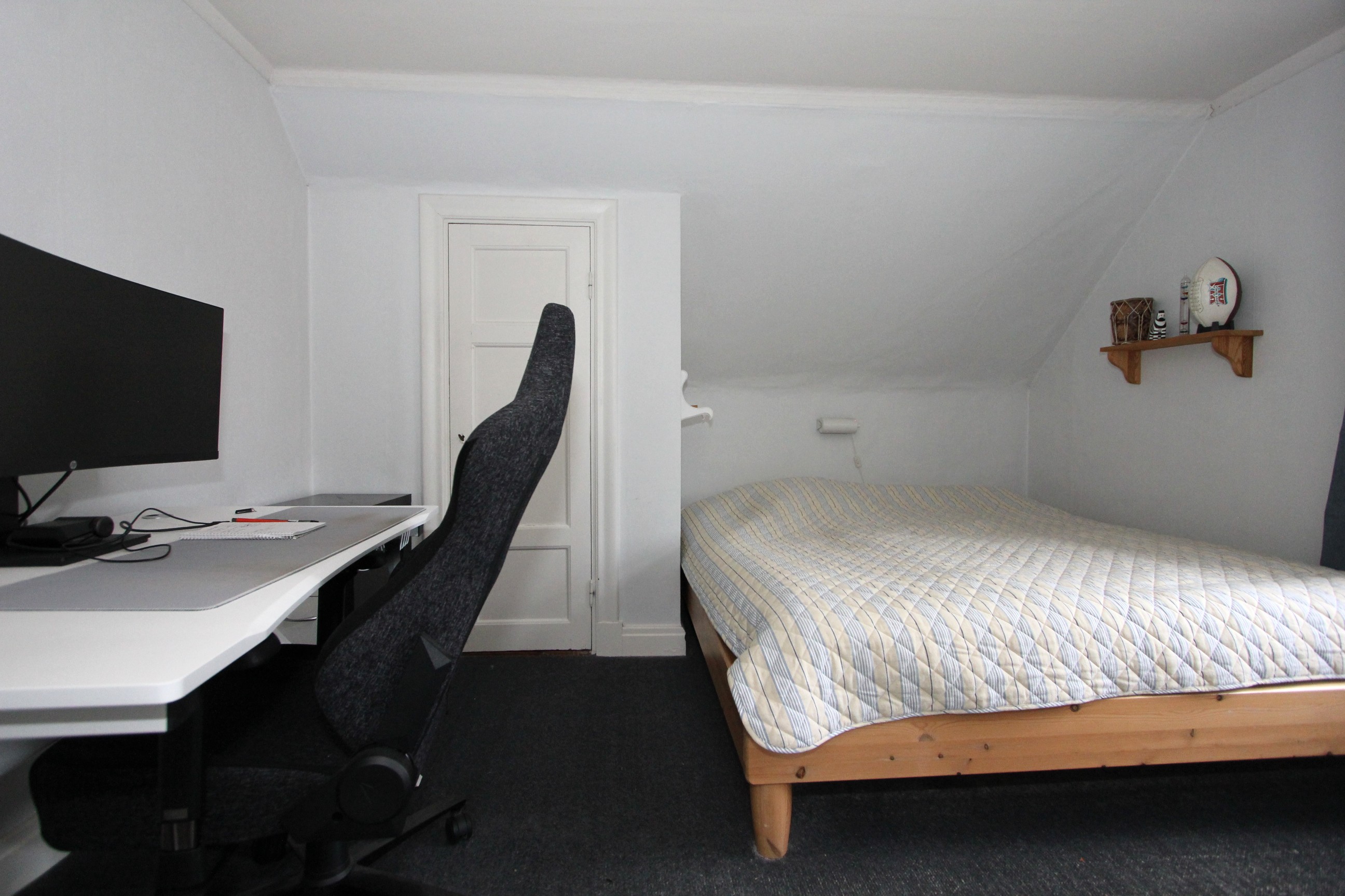 På andra sidan ligger sovrum 2. Ett rymligt sovrum som utöver garderoben även har plats under snedtaket. 1 fönster, heltäckningsmatta.