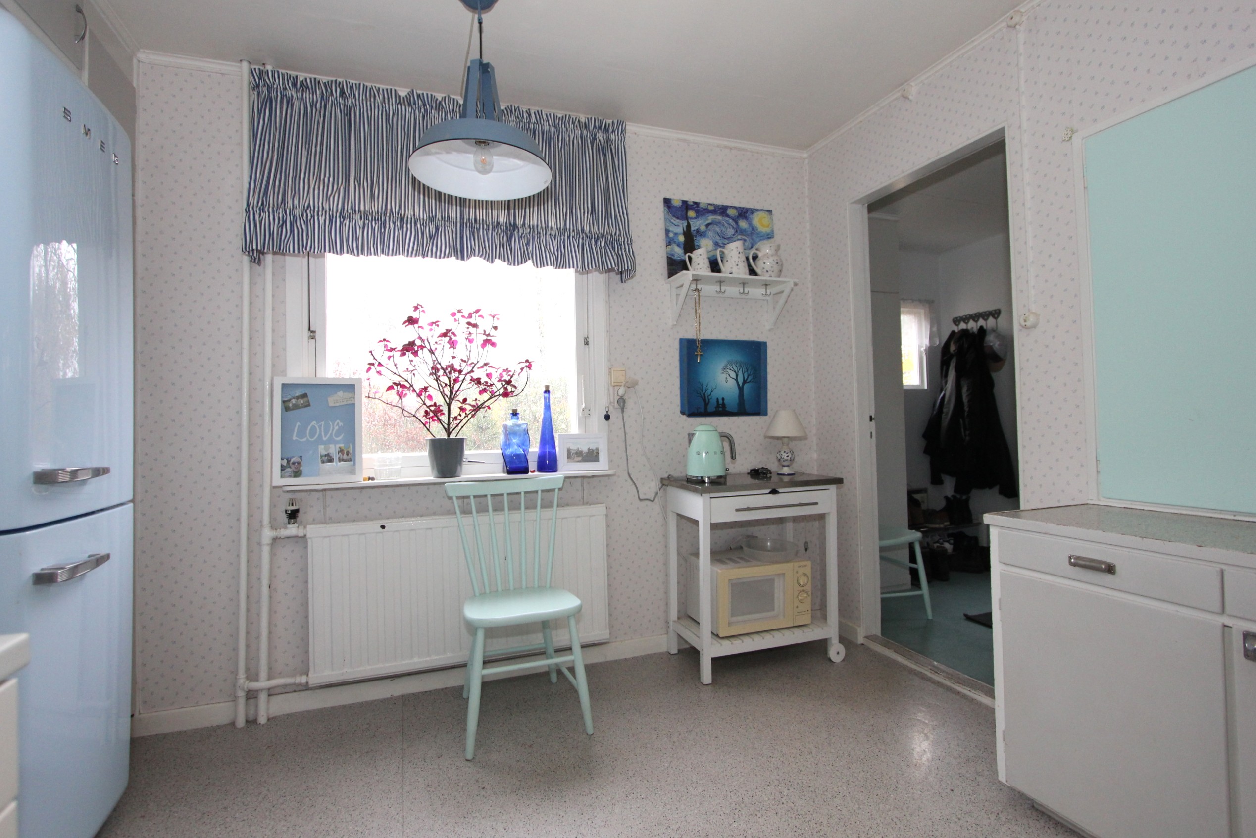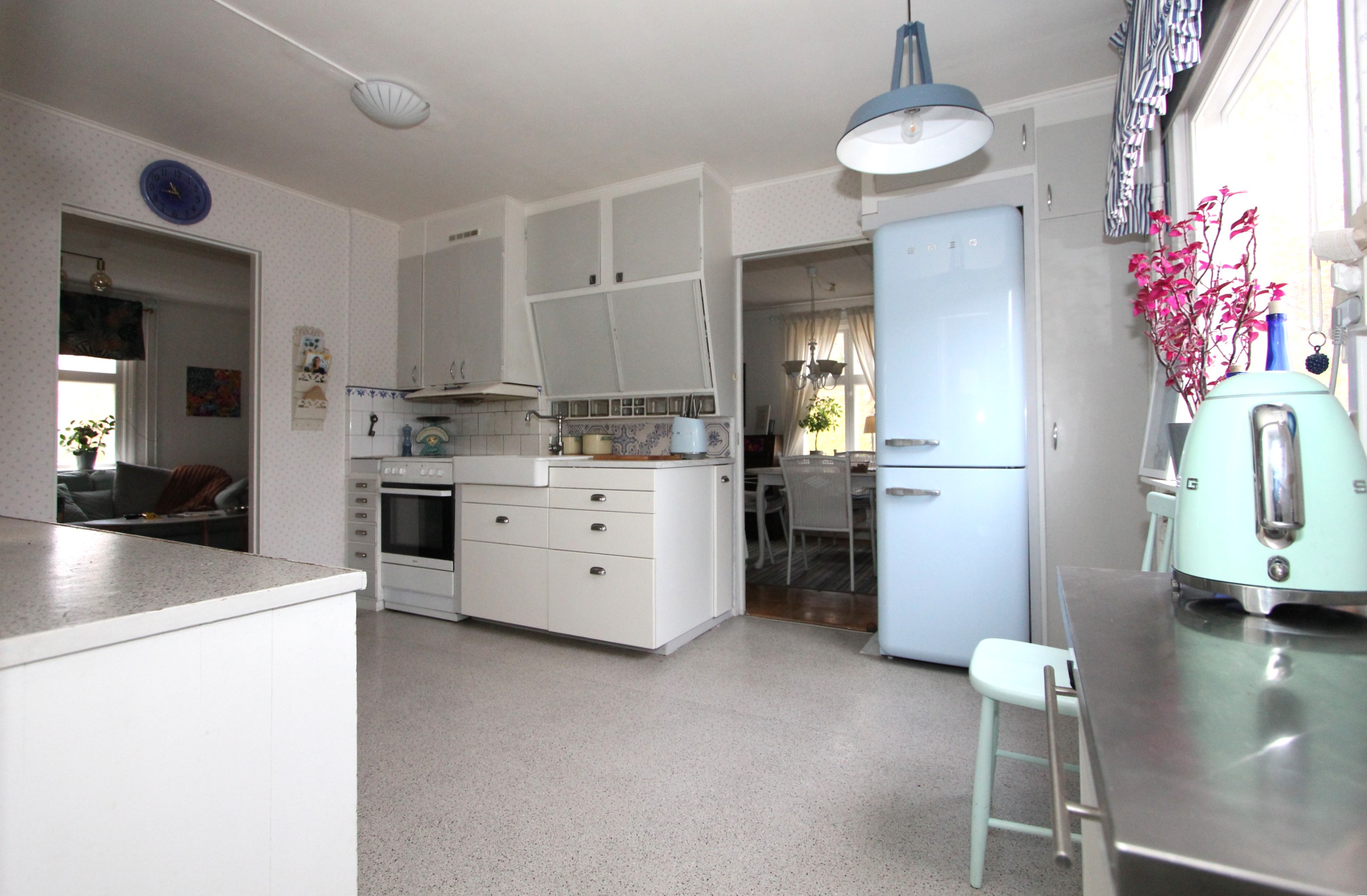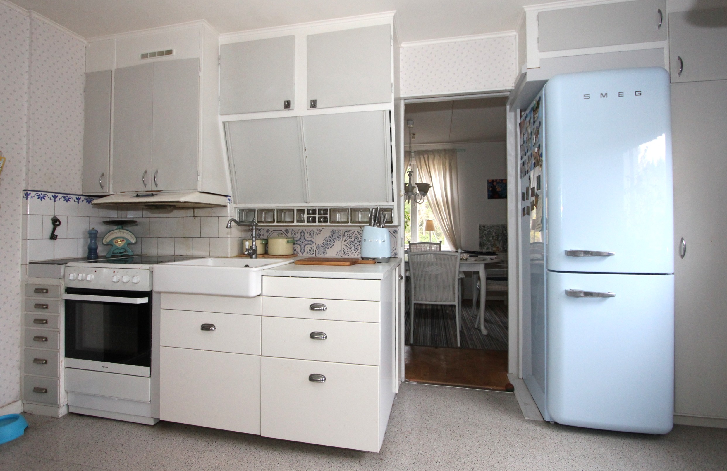 Därefter ligger det mysiga köket där man blandat gammalt och nytt. Bland annat finns de snedställda väggskåpen kvar med undersittande förvaringshylla i glas. Diskho i porslin. Ny kyl/frys från Smeg. Spis och fläkt. 2 fönster samt plastmatta.