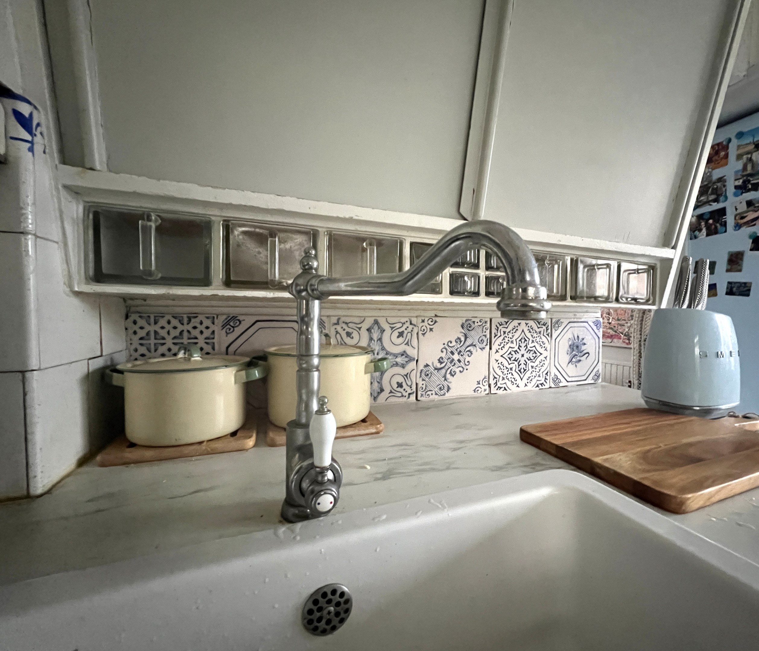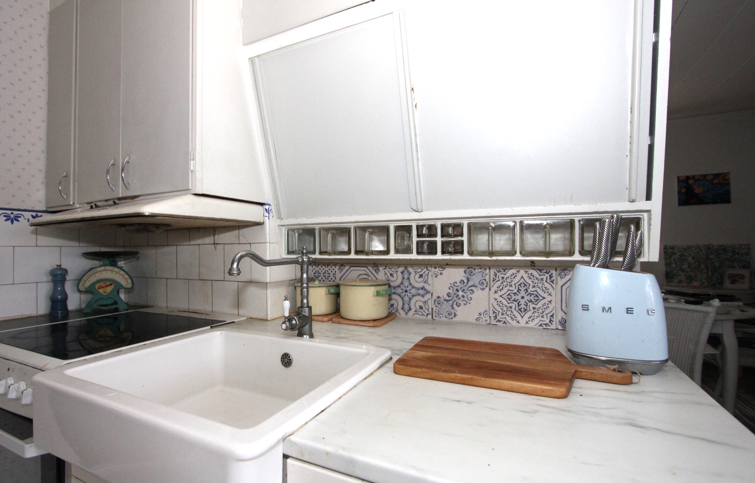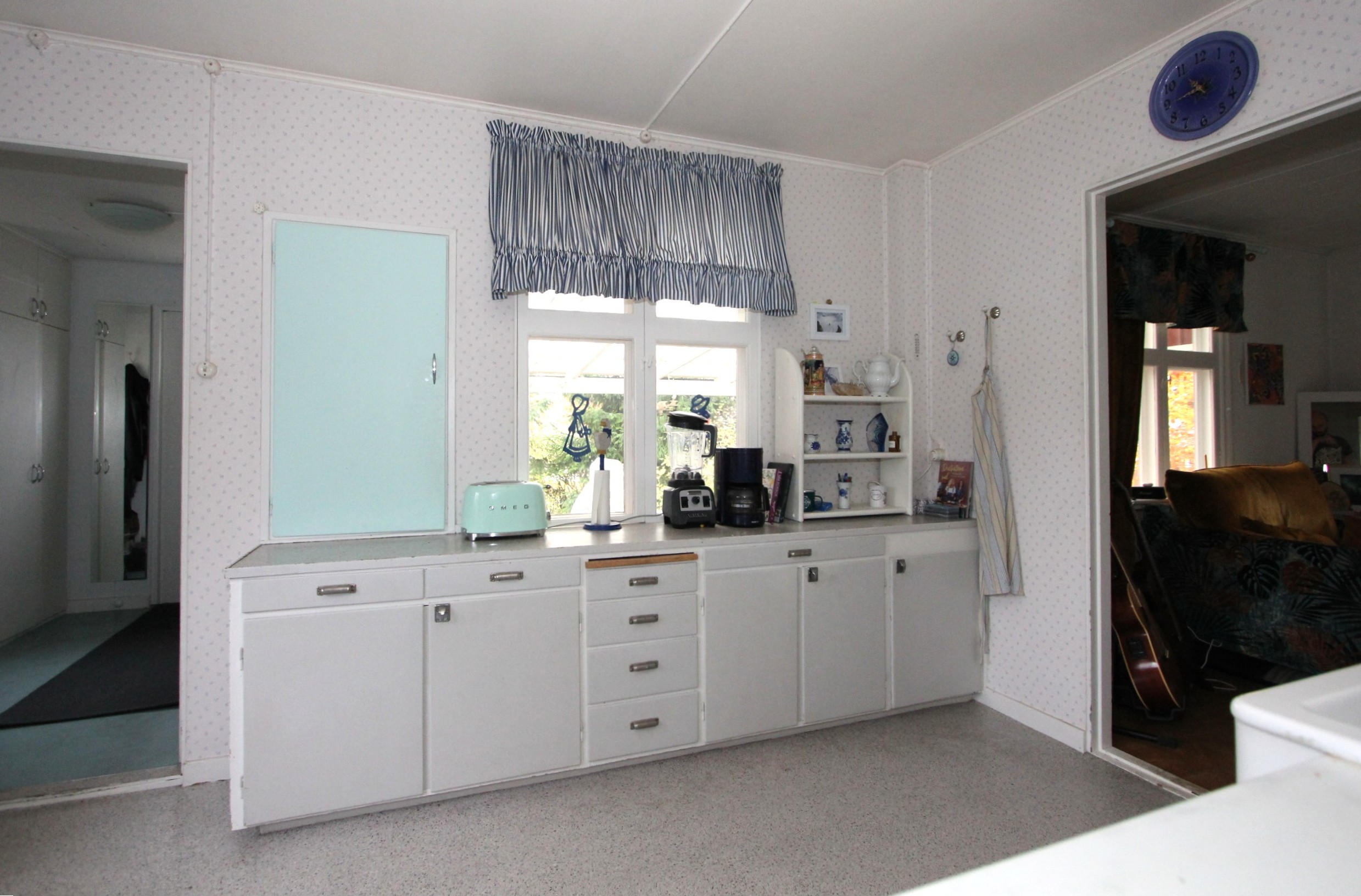 Därefter ligger det mysiga köket där man blandat gammalt och nytt. Bland annat finns de snedställda väggskåpen kvar med undersittande förvaringshylla i glas. Diskho i porslin. Ny kyl/frys från Smeg. Spis och fläkt. 2 fönster samt plastmatta.