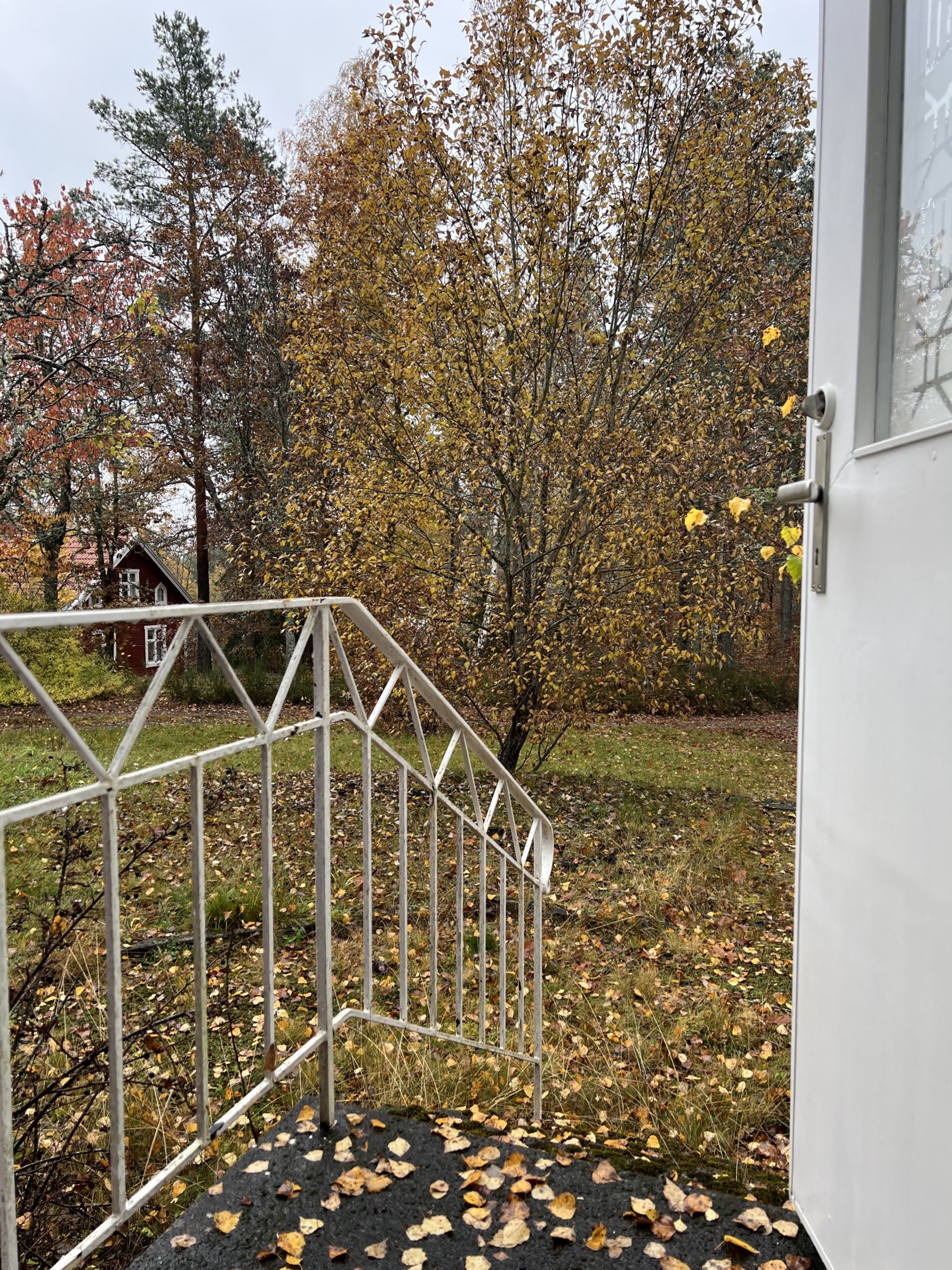 Rymlig uteplats precis utanför köket vid groventrén. Trätrall och plasttak.