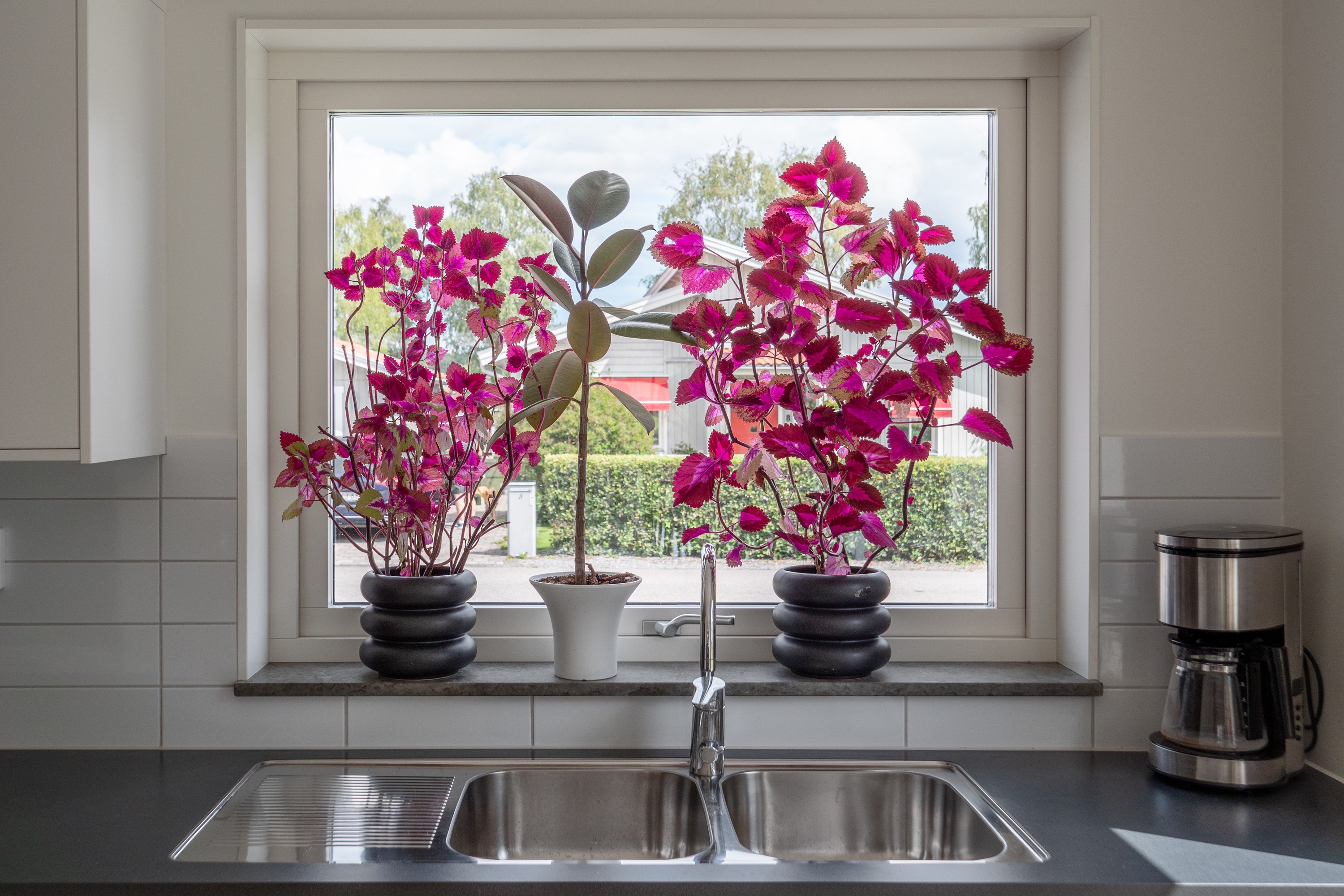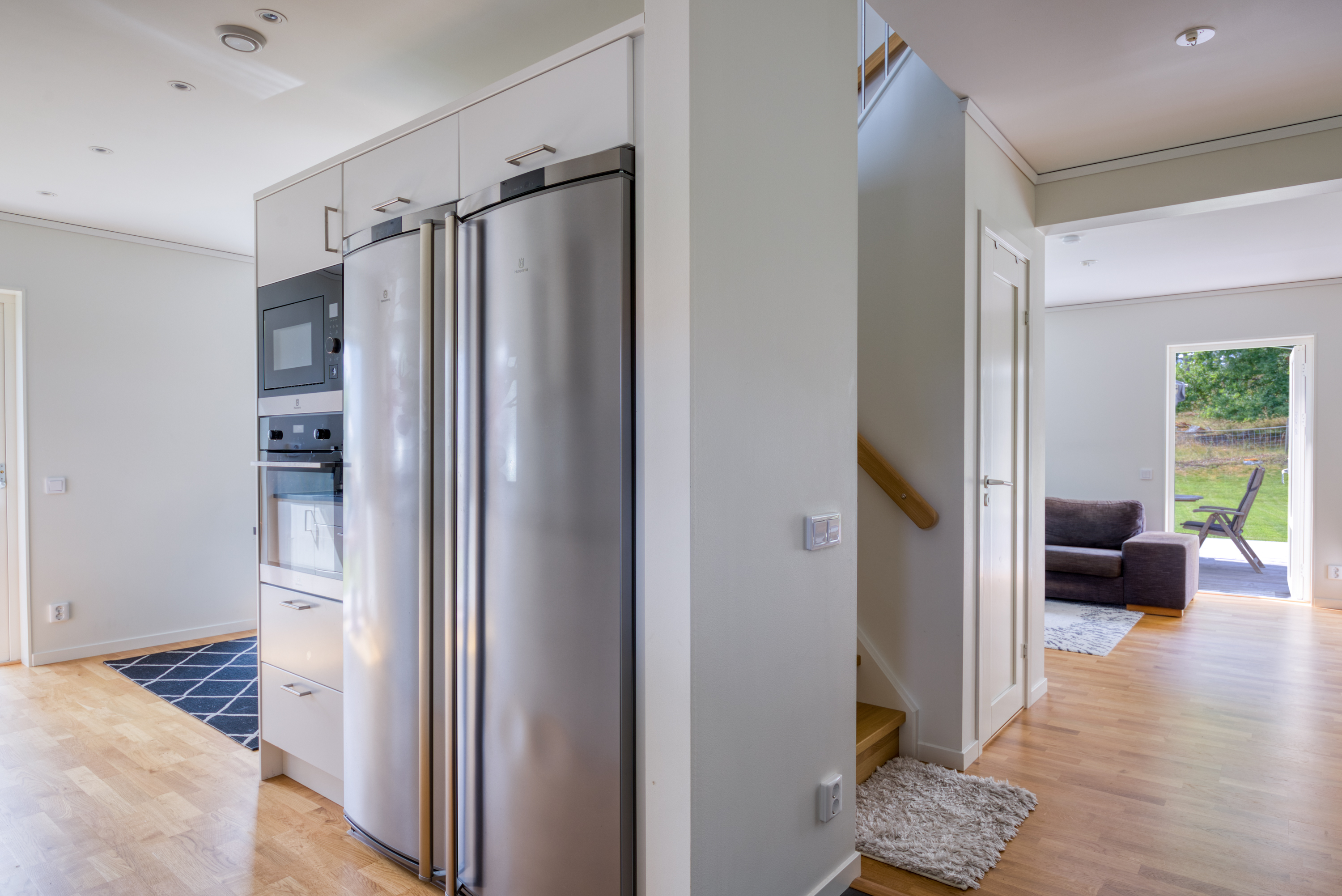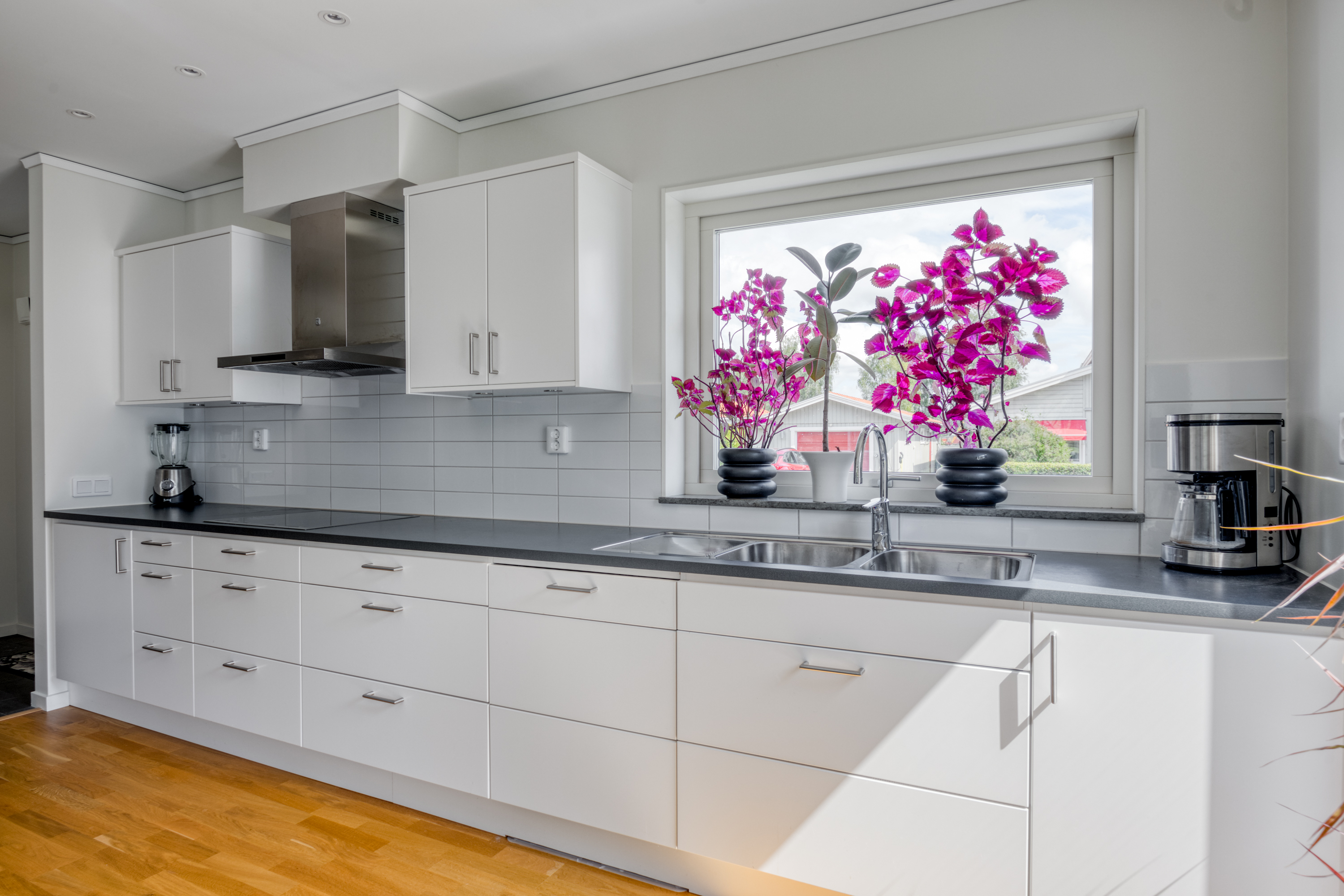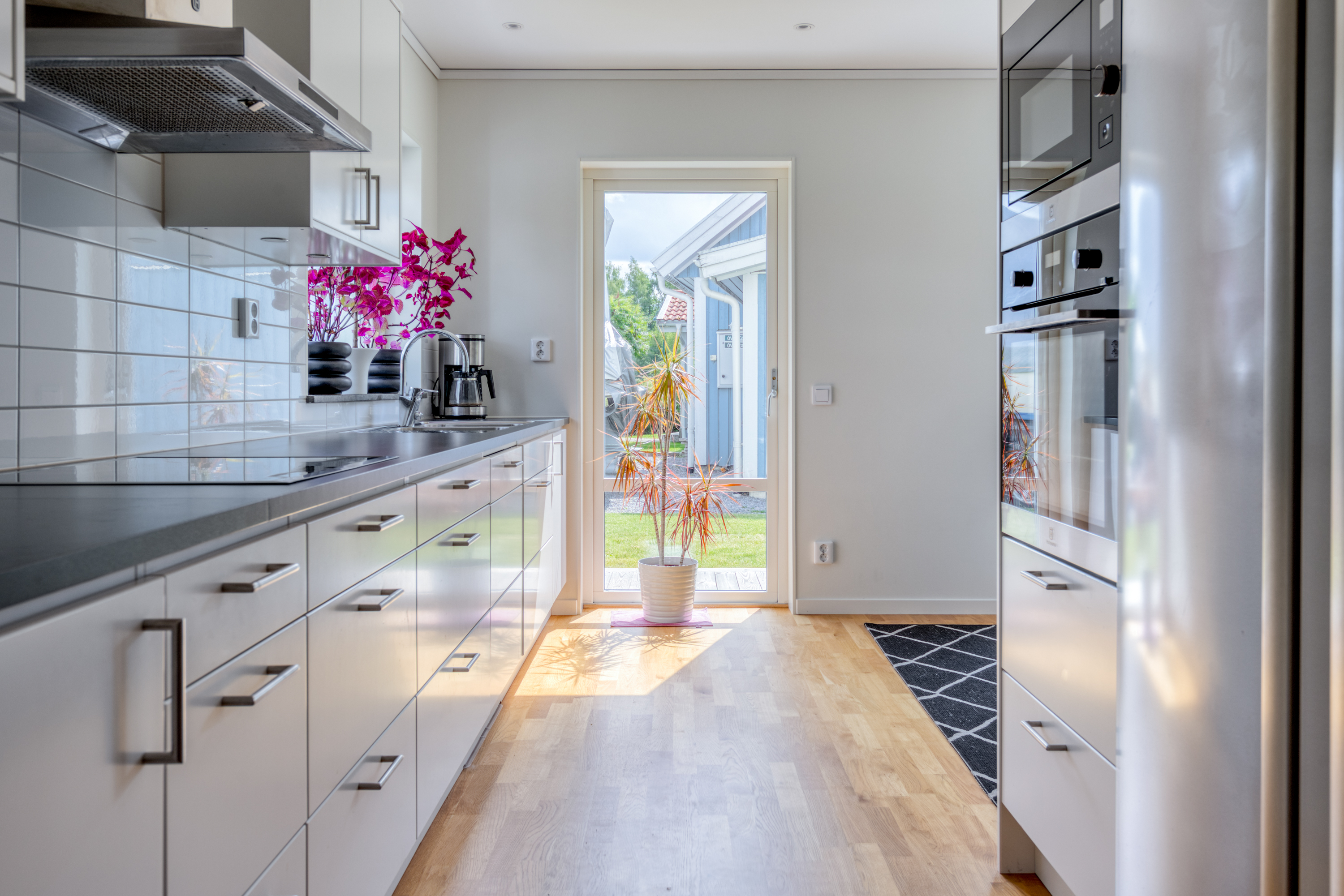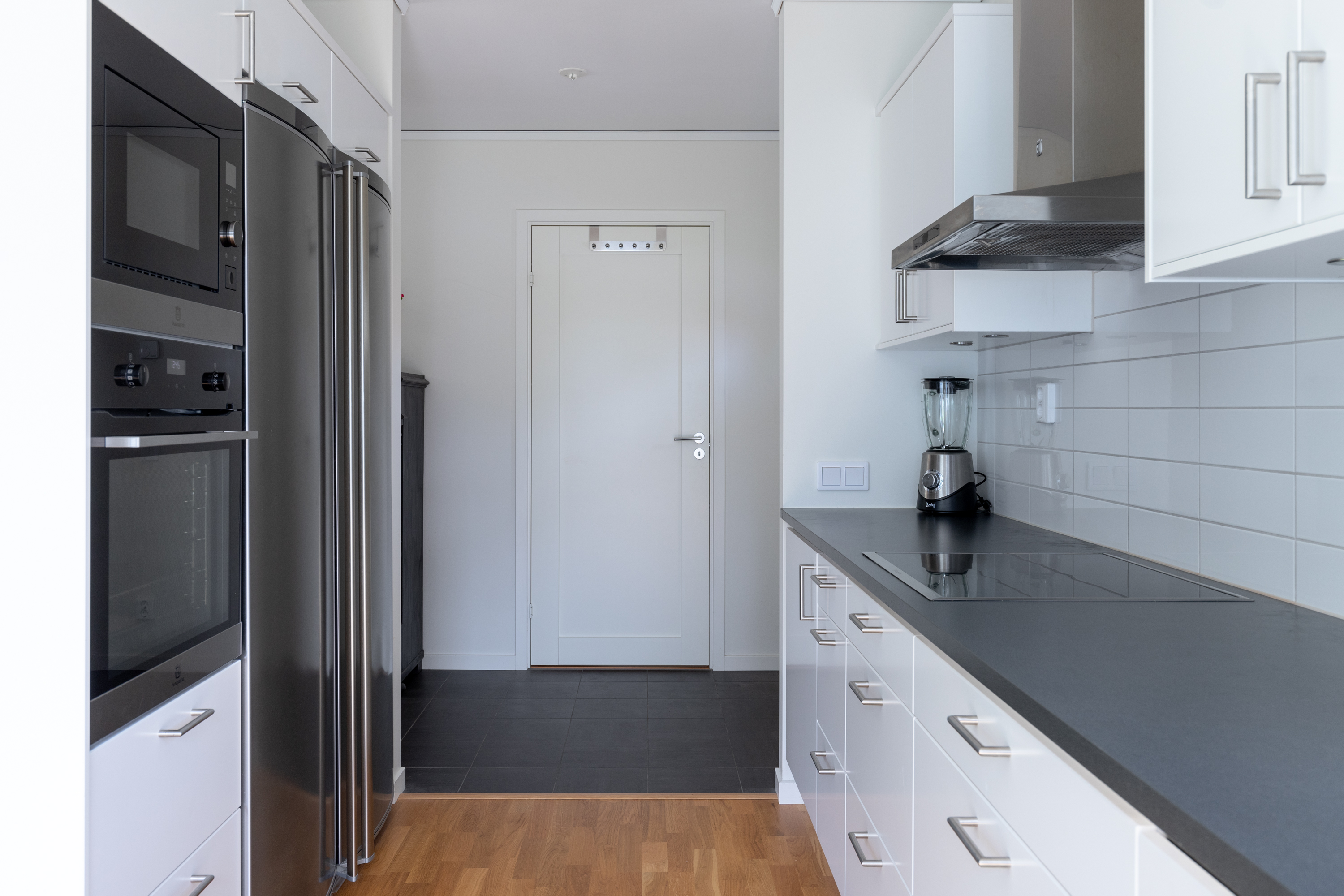 Smakfullt kök från 2018 med gott om arbetsytor och förvaring. Vita skåpsluckor och bänkskivor i mörk arbetsbänk. Köksutrustning i form av induktionshäll, fläkt, ugn, mikro, kyl och frys. Ekparkettgolv samt vitmålade väggar. Ljusinsläpp från flera håll håll. Stor matplats för minst 6-8 personer.