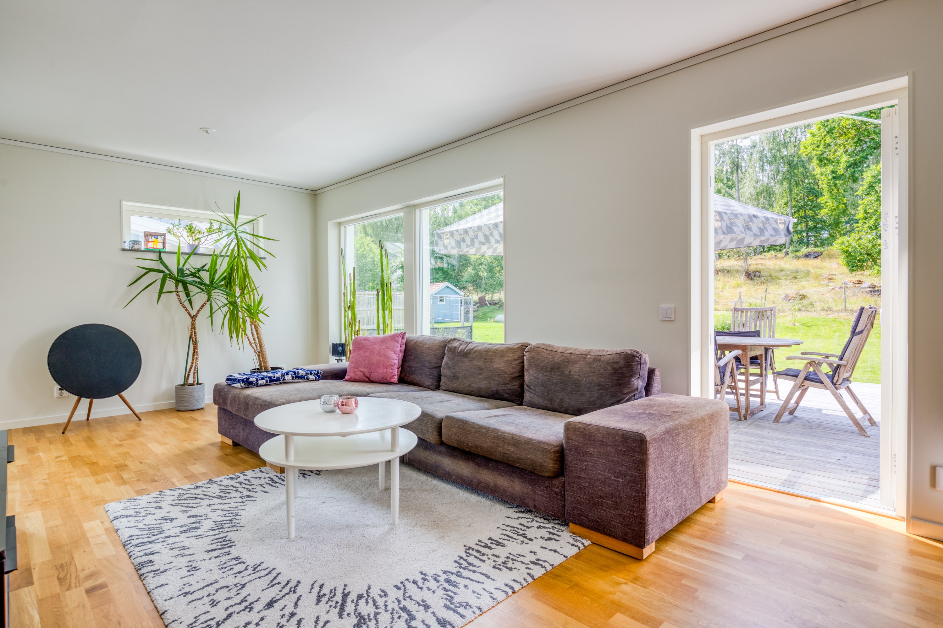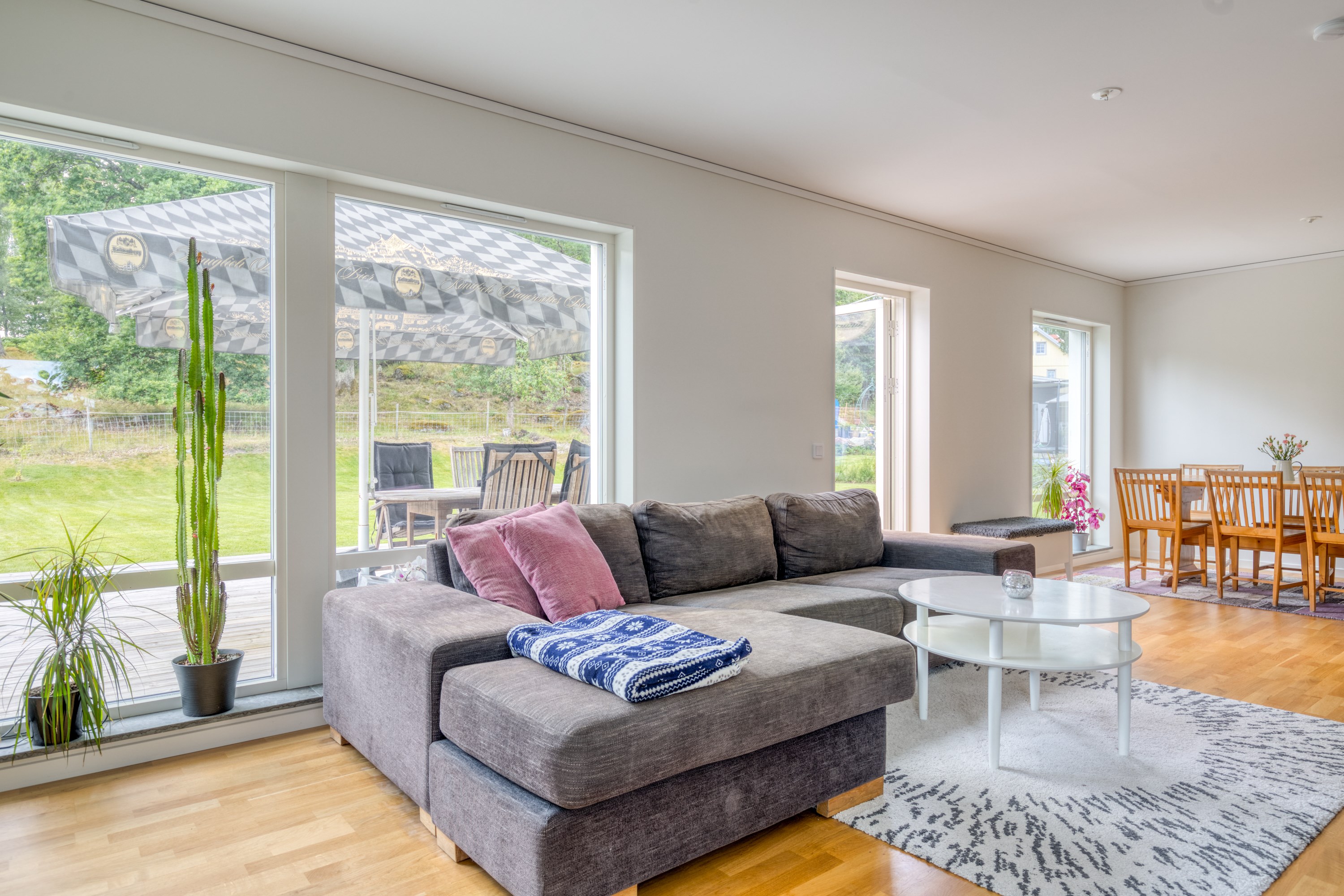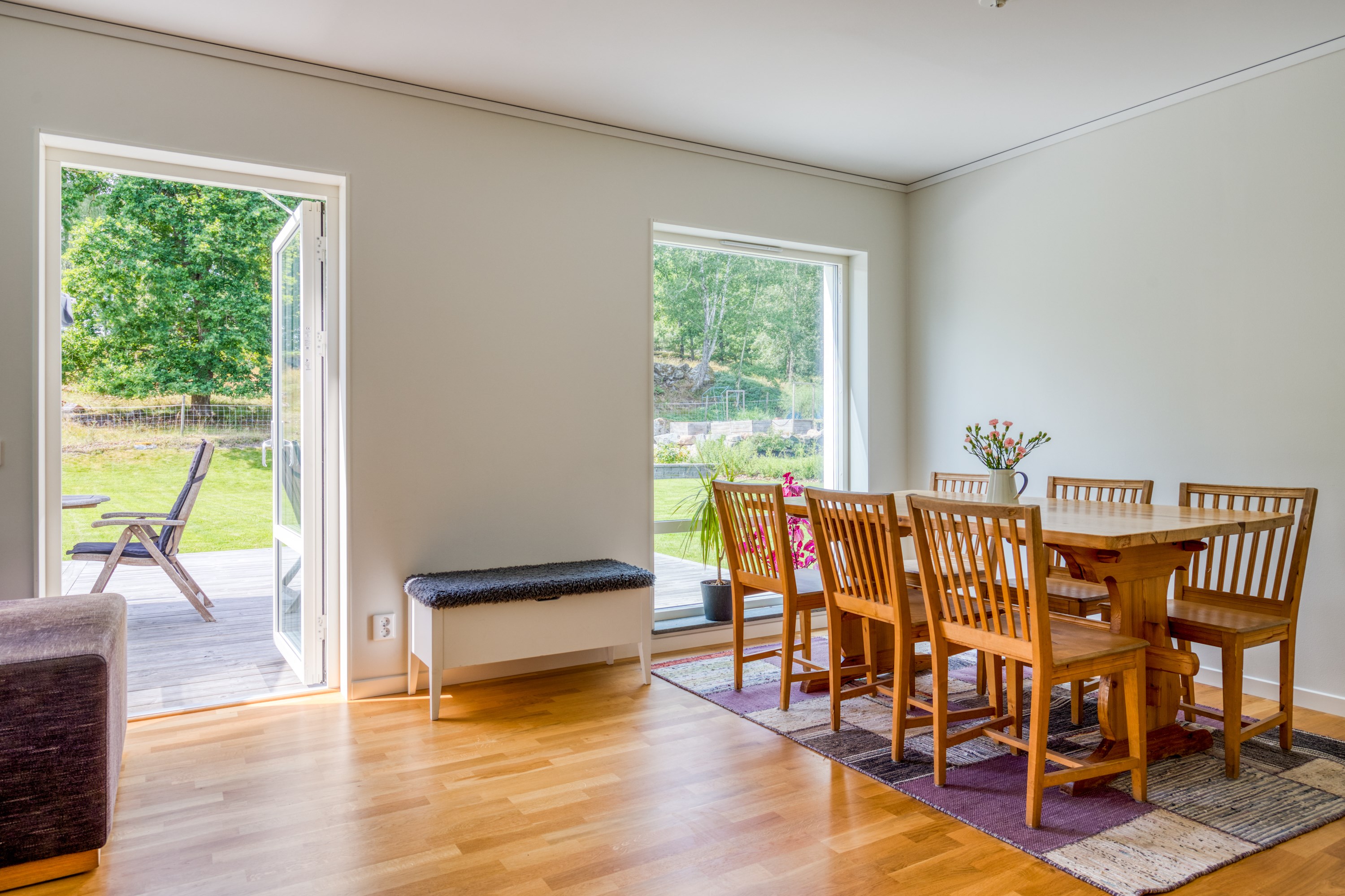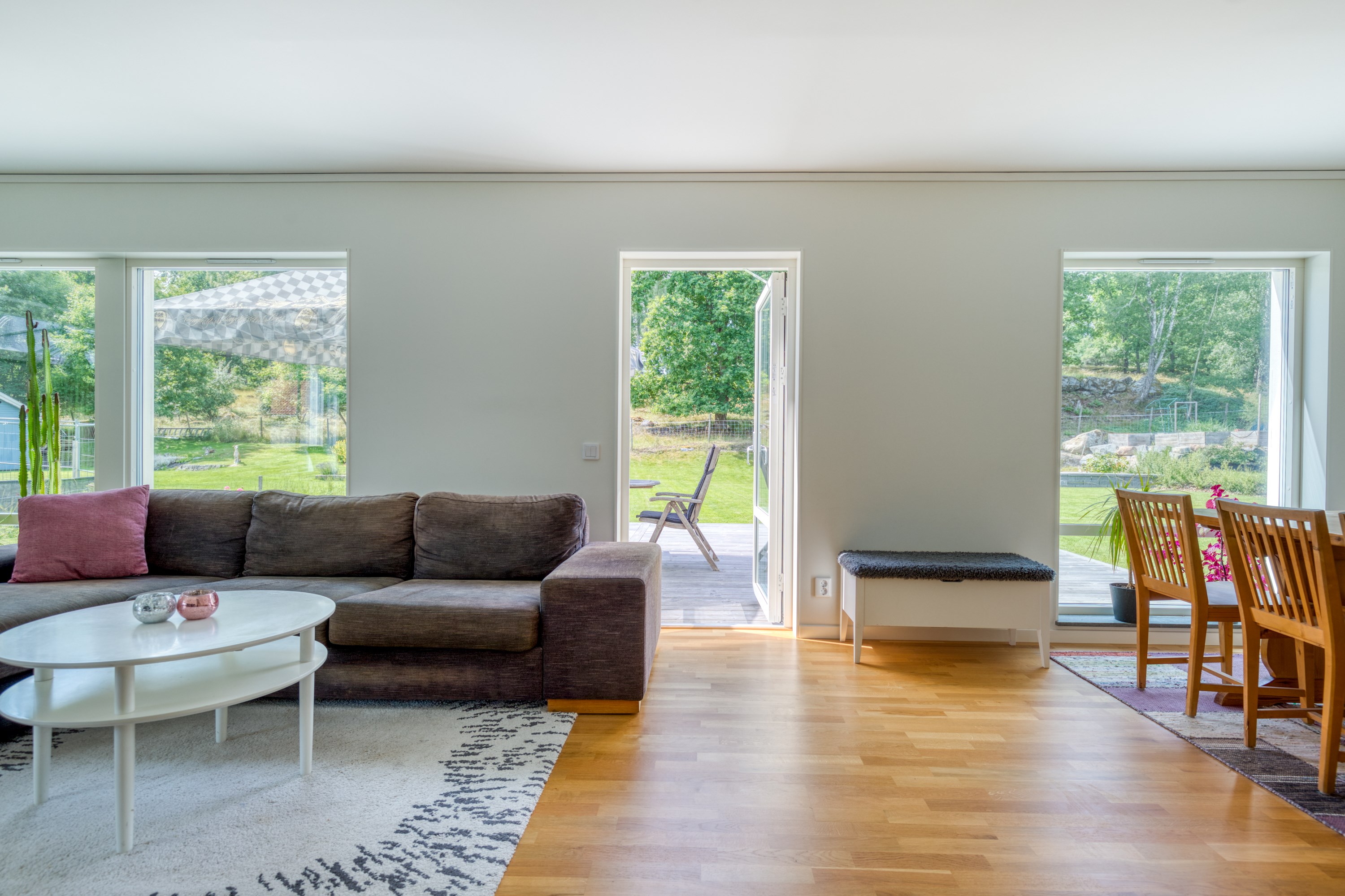 Stort och ljust vardagsrum med plats för ordentligt matbord och soffgrupp. Härligt fönsterparti med glas från golv till tak samt altandörr ut mot baksidan av huset. Ekparkett golv och vitmålade väggar.