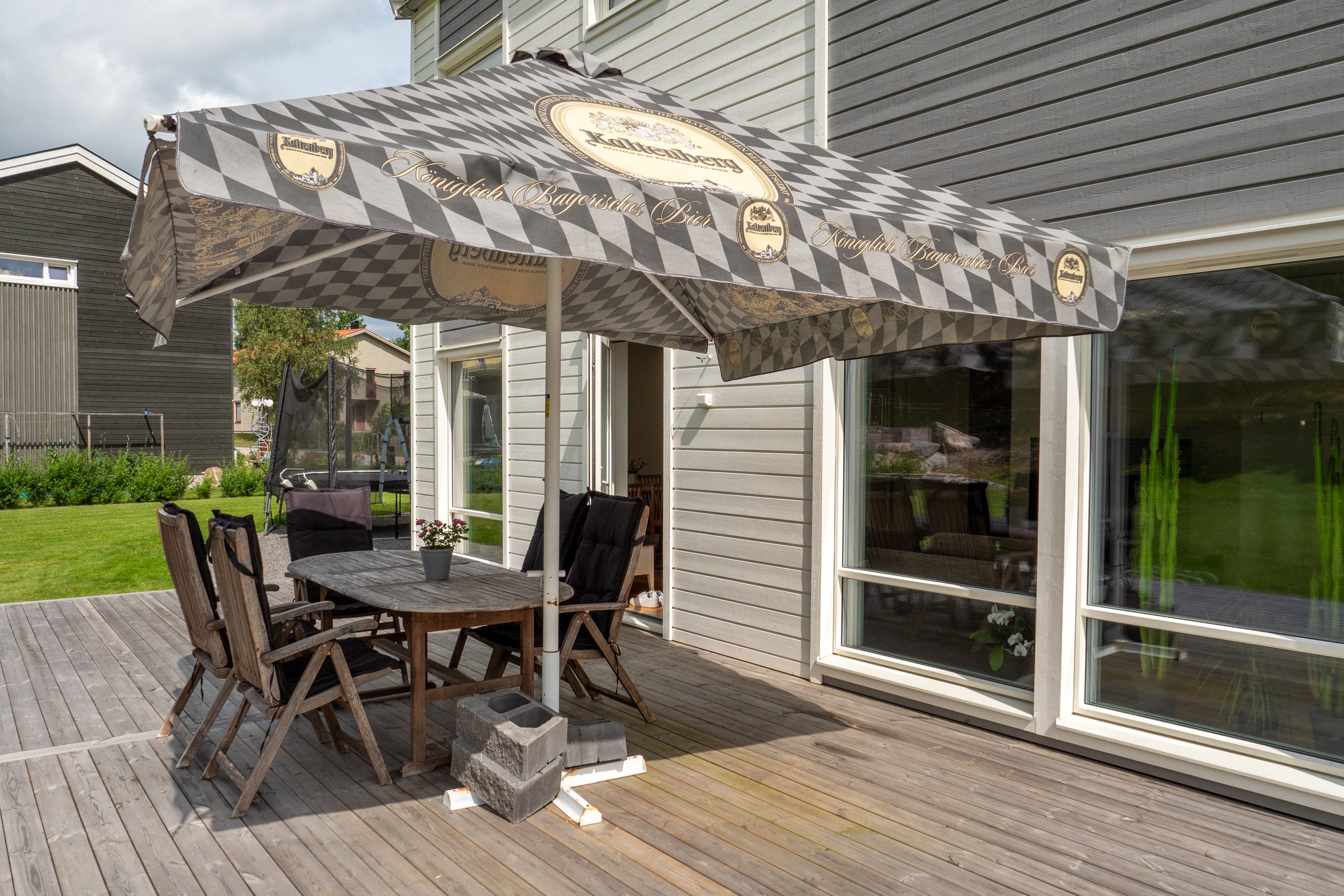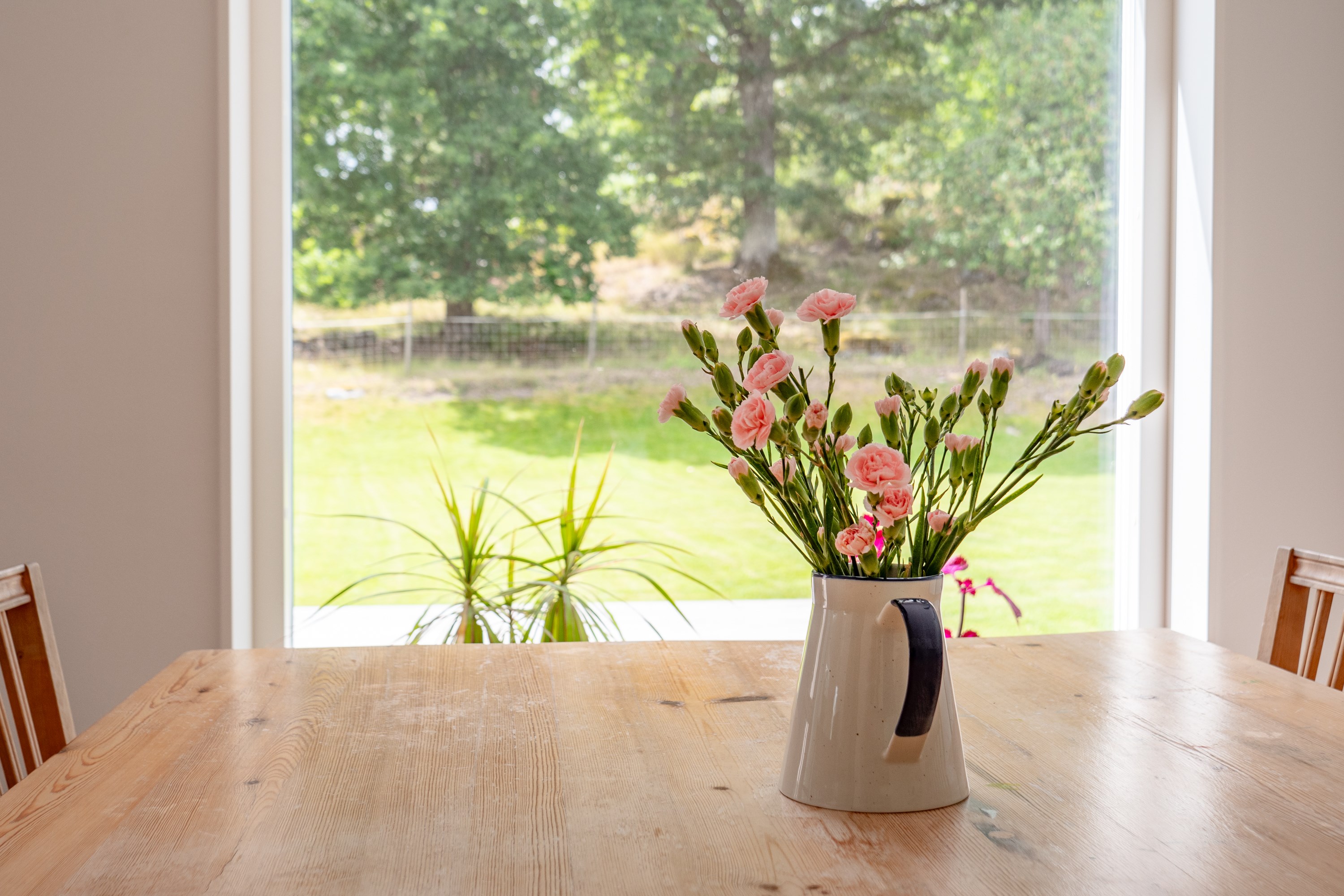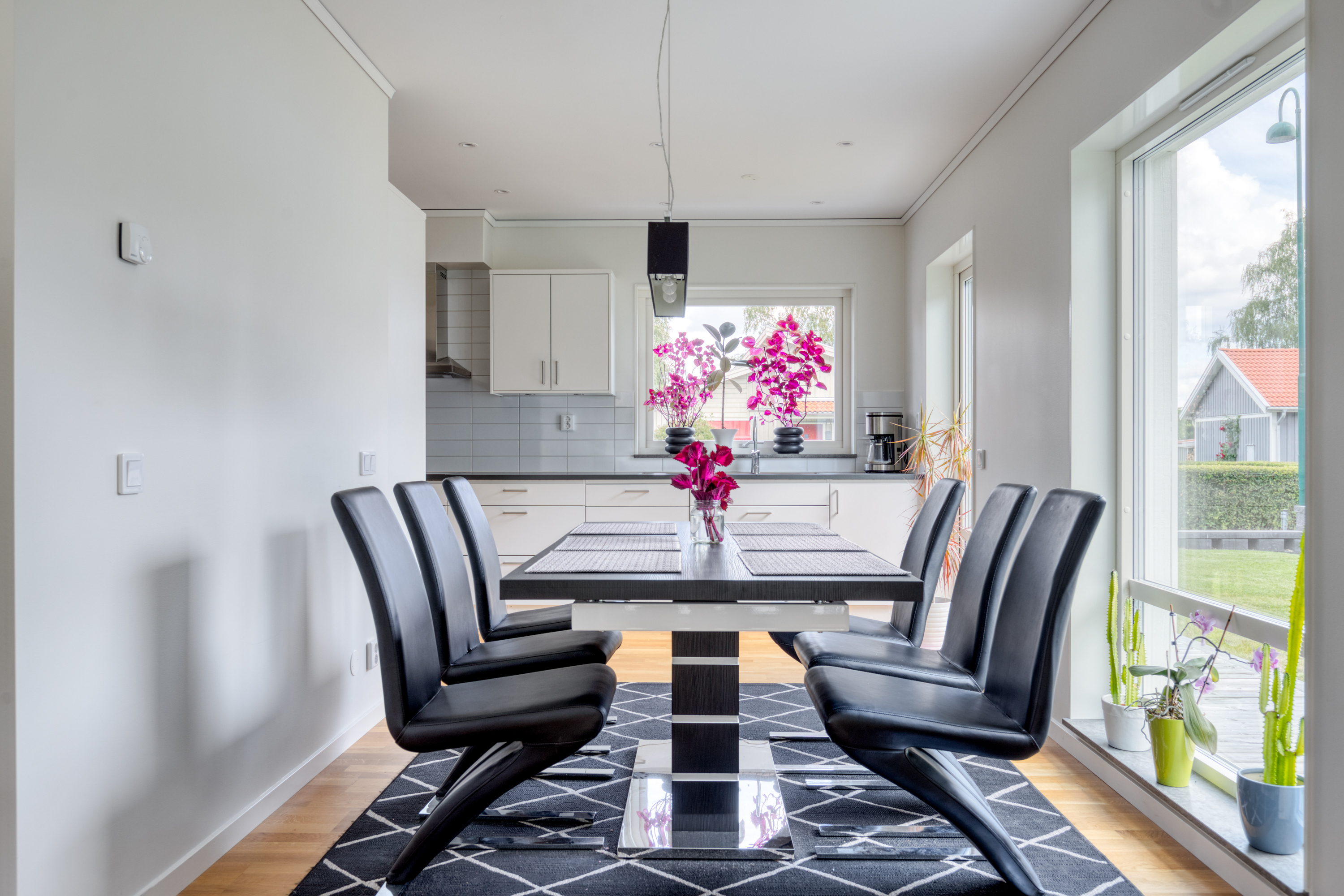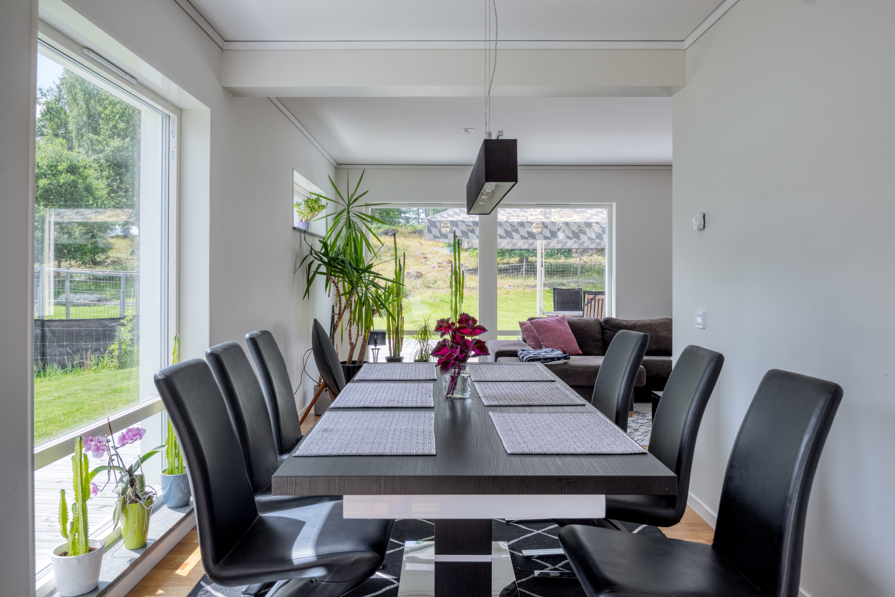 Stort och ljust vardagsrum med plats för ordentligt matbord och soffgrupp. Härligt fönsterparti med glas från golv till tak samt altandörr ut mot baksidan av huset. Ekparkett golv och vitmålade väggar.