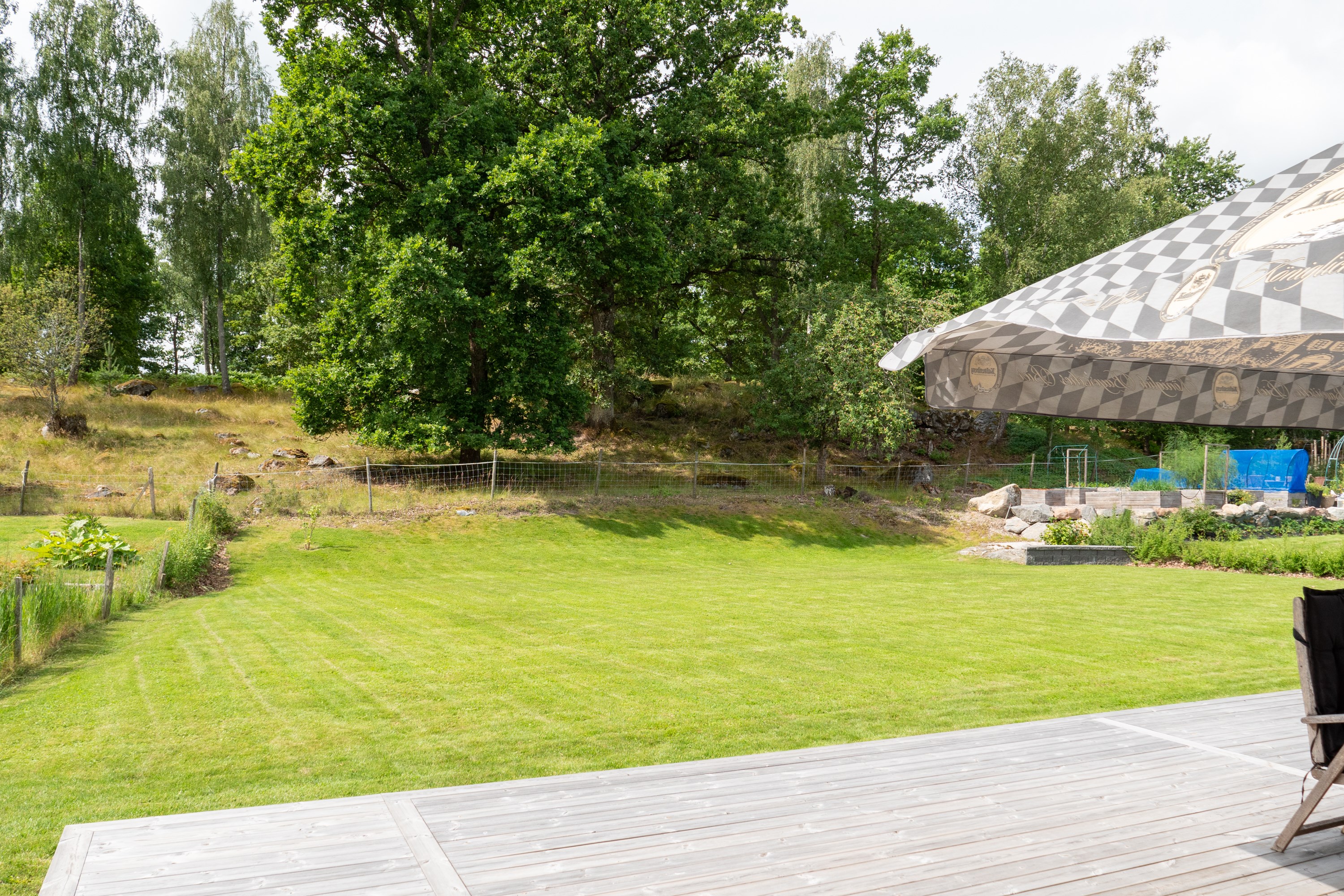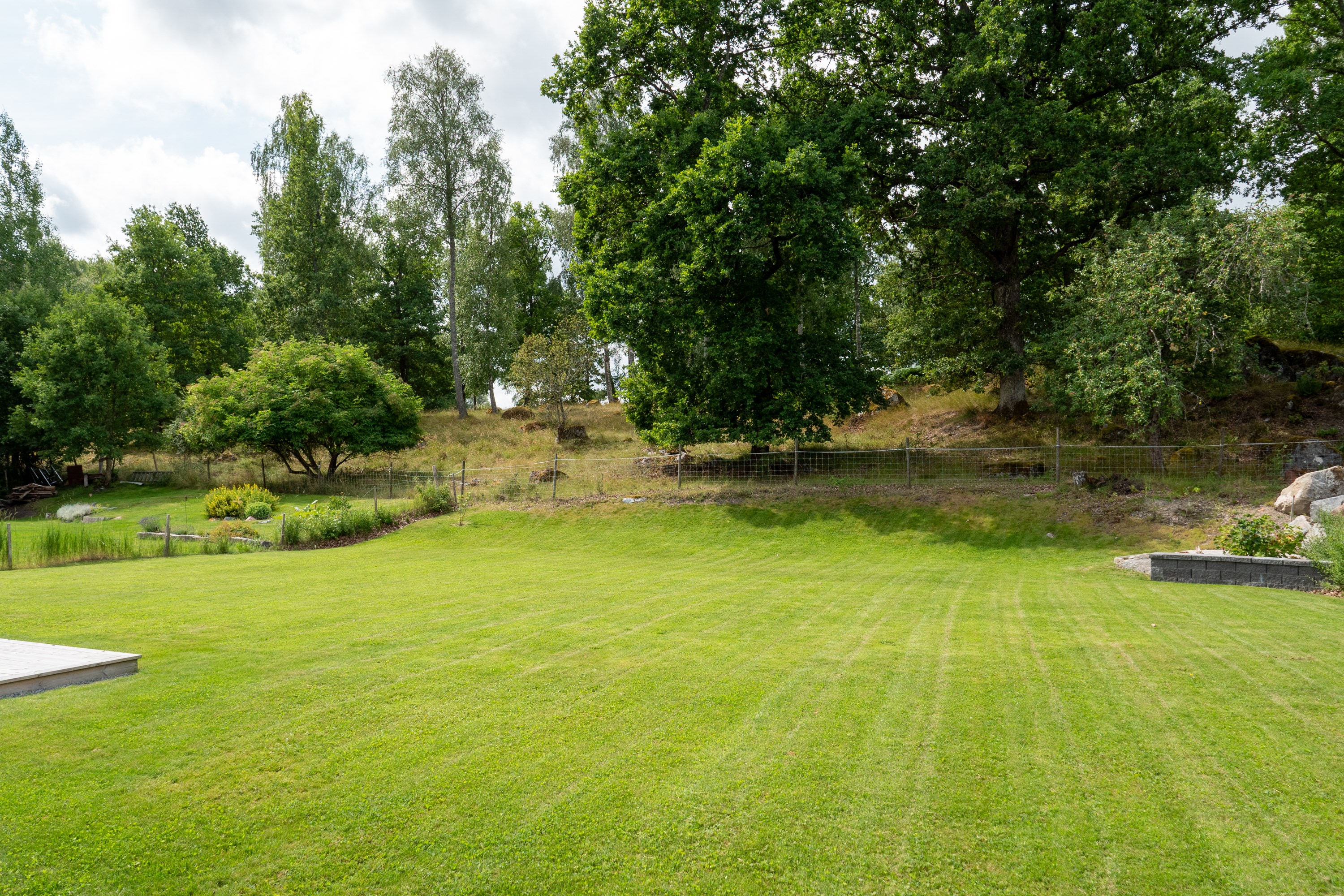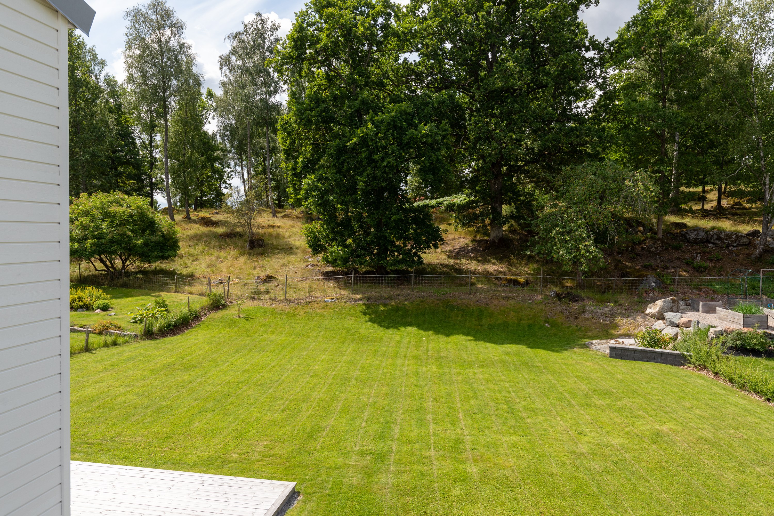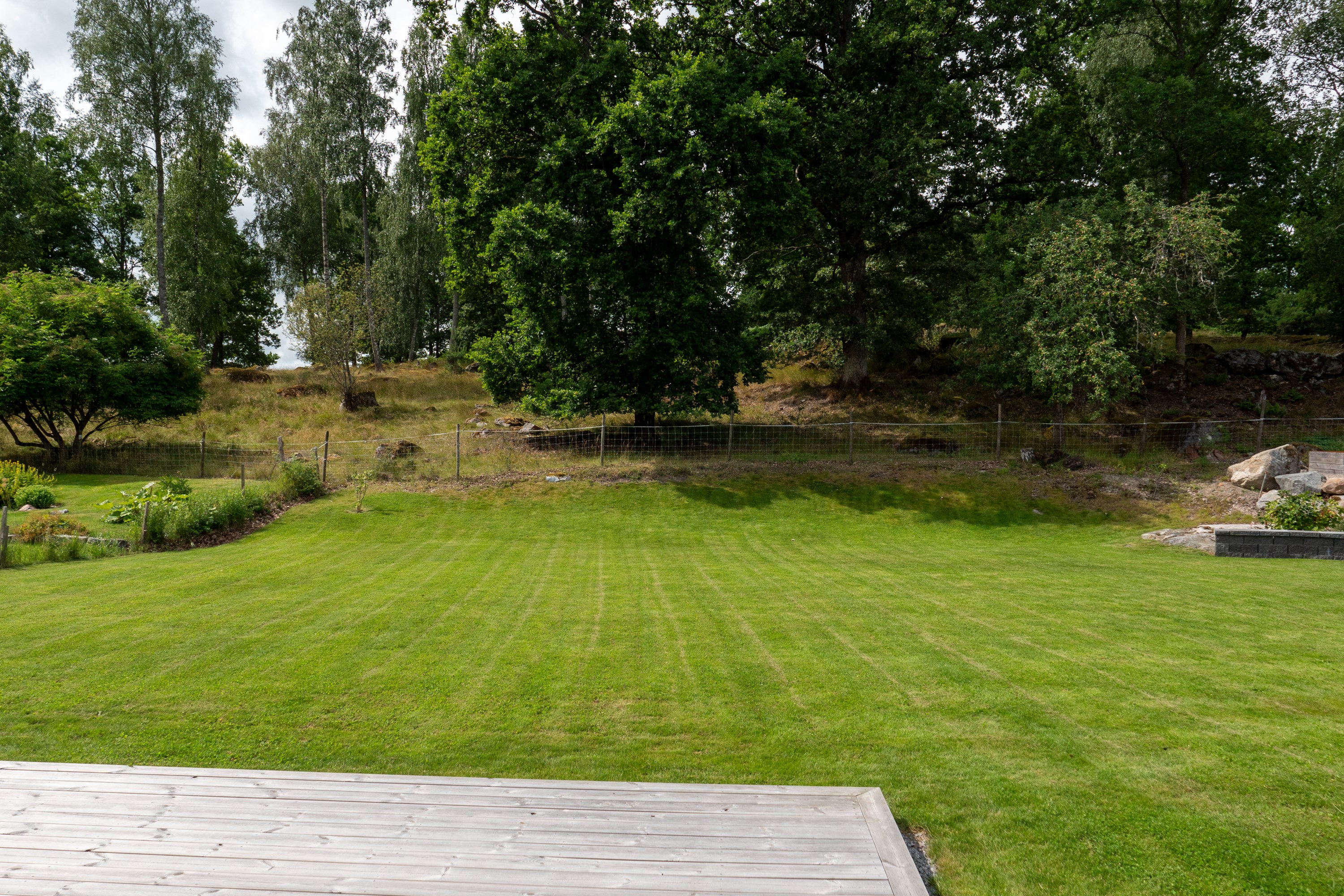 Plan trädgårds tom och hela baksidan mot allmänning.