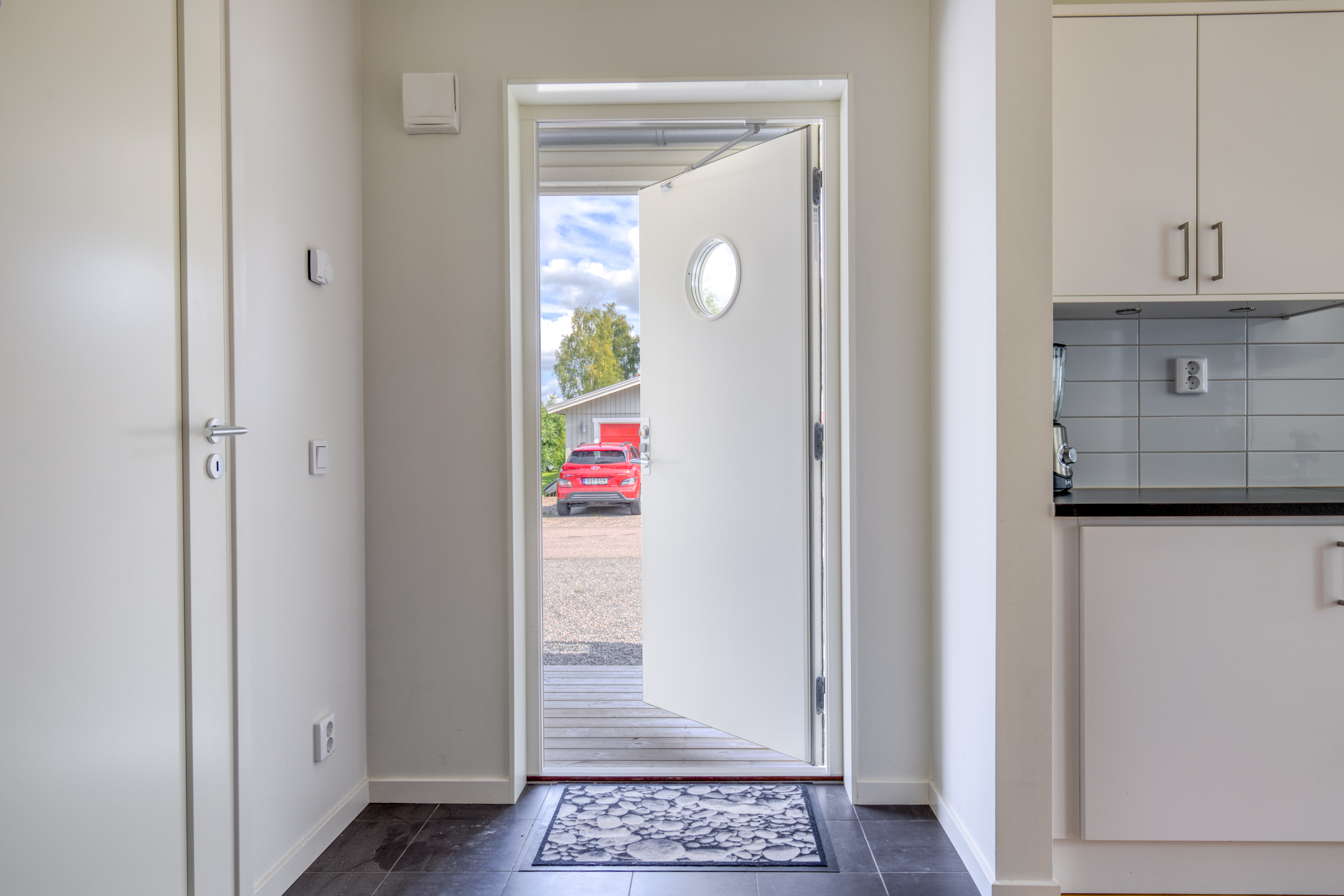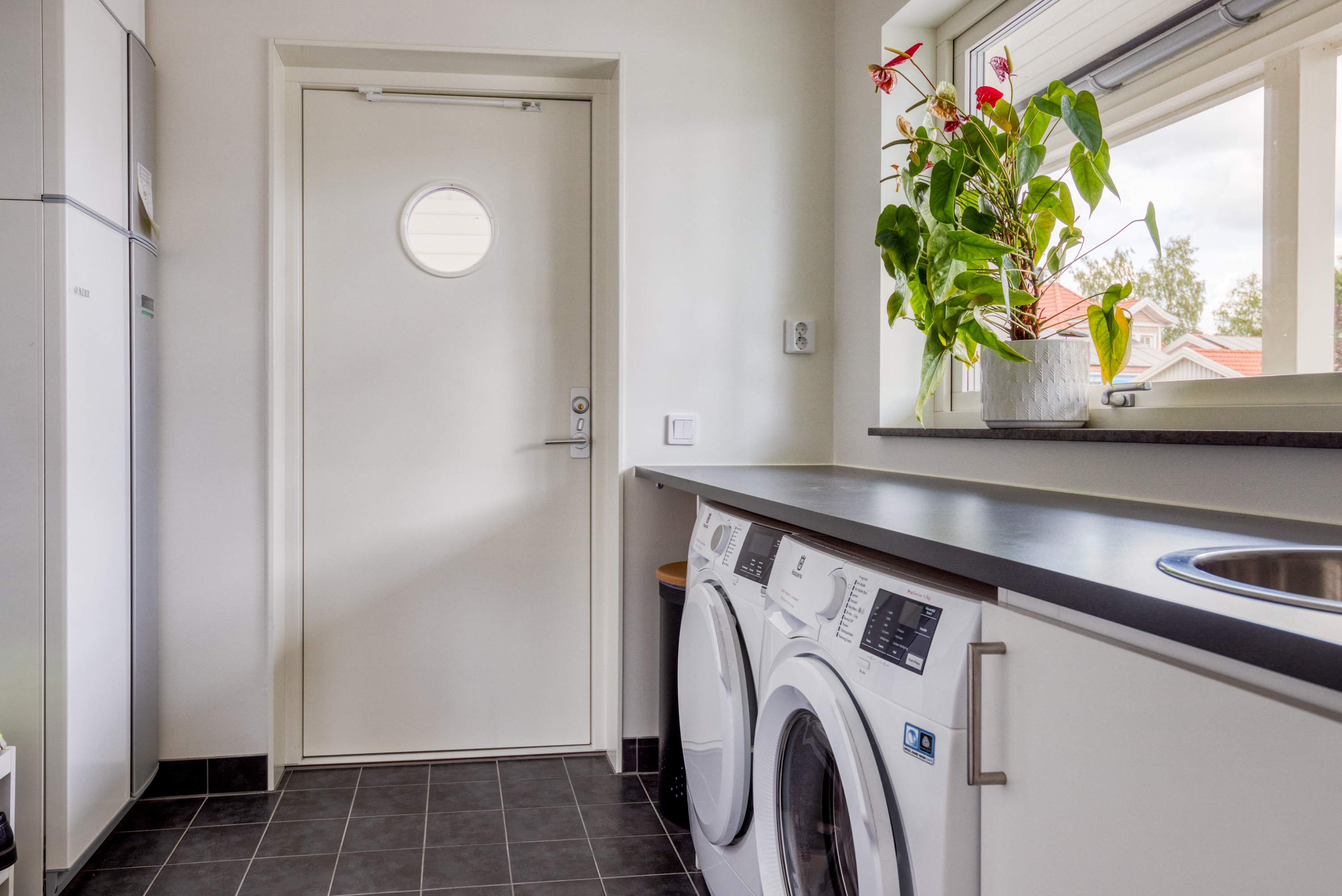 I anslutning till carport finns en groventré/tvättstuga med klinkergolv i grå ton samt vitmålade väggar. Här finns frånluftsvärmepump, tvättmaskin samt torkskåp. Även bra förvaring med skåp/garderob samt en tvättbänk. Ett fönster.