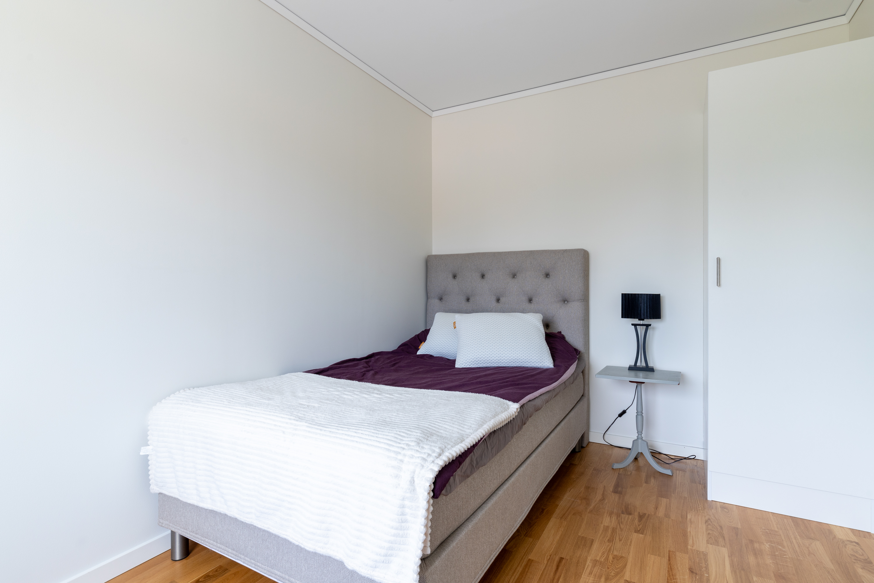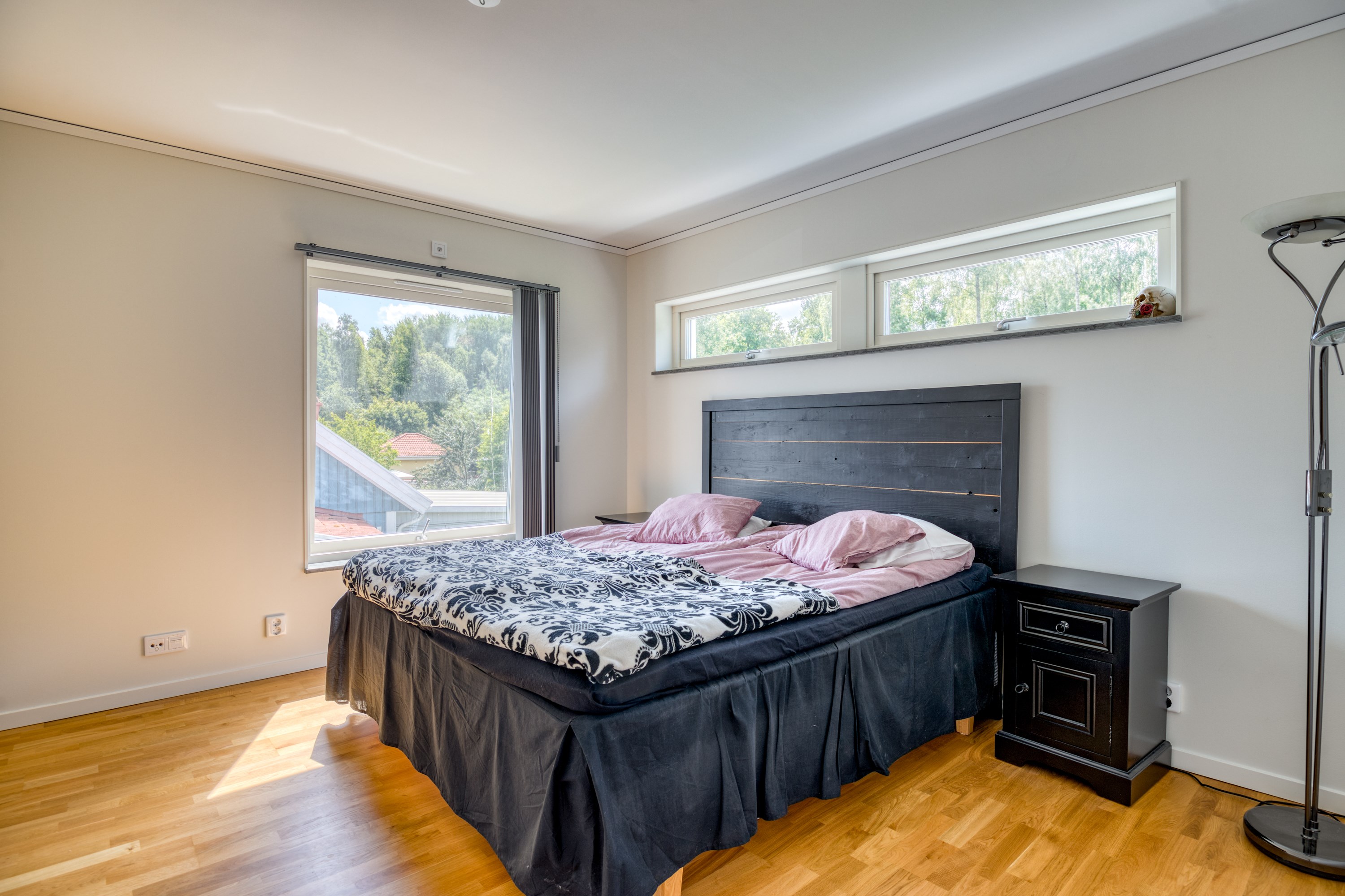 Stort sovrum med plats för dubbelsäng och förvaring. Flera garderob. Ekparkett golv och vitmålade väggar.