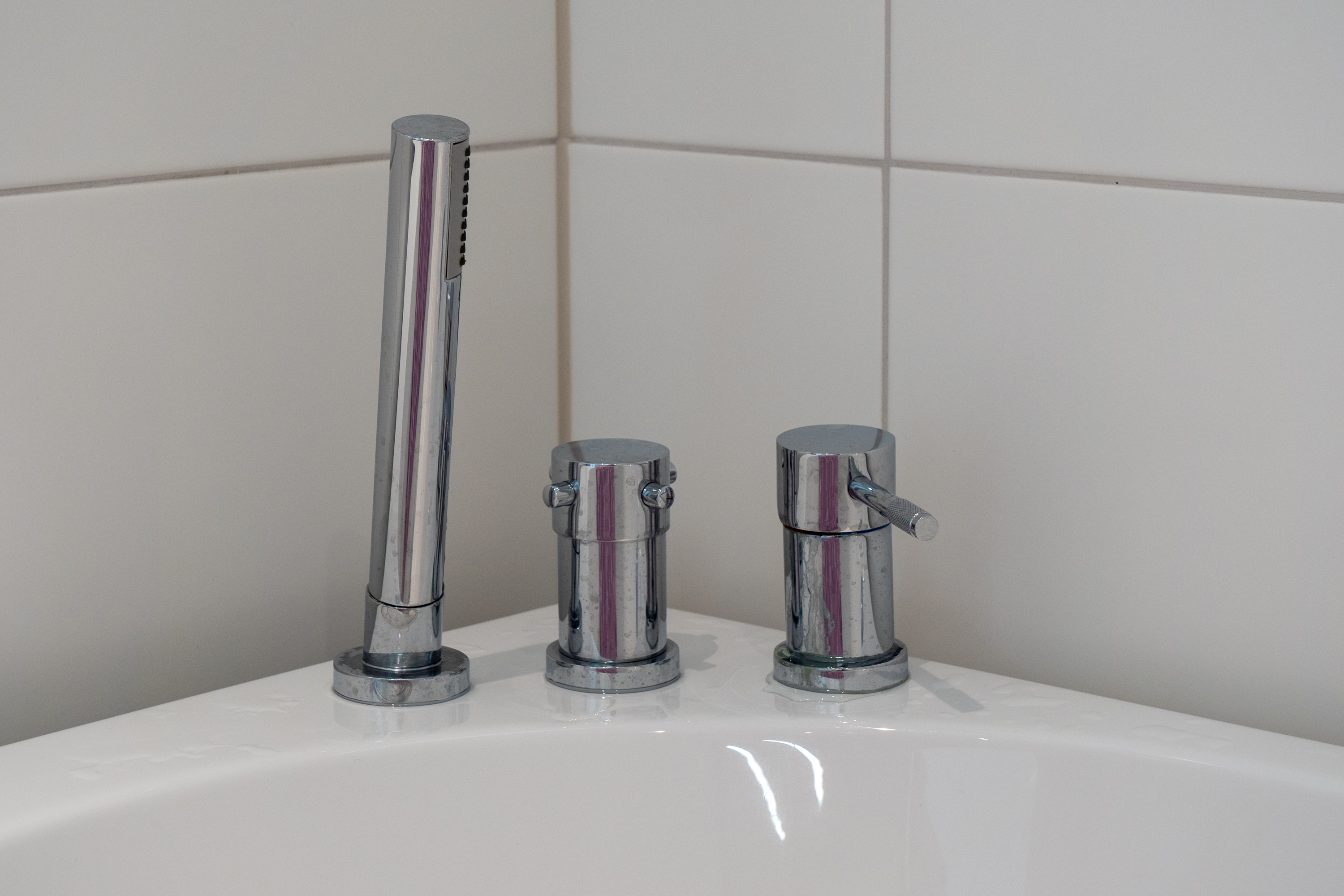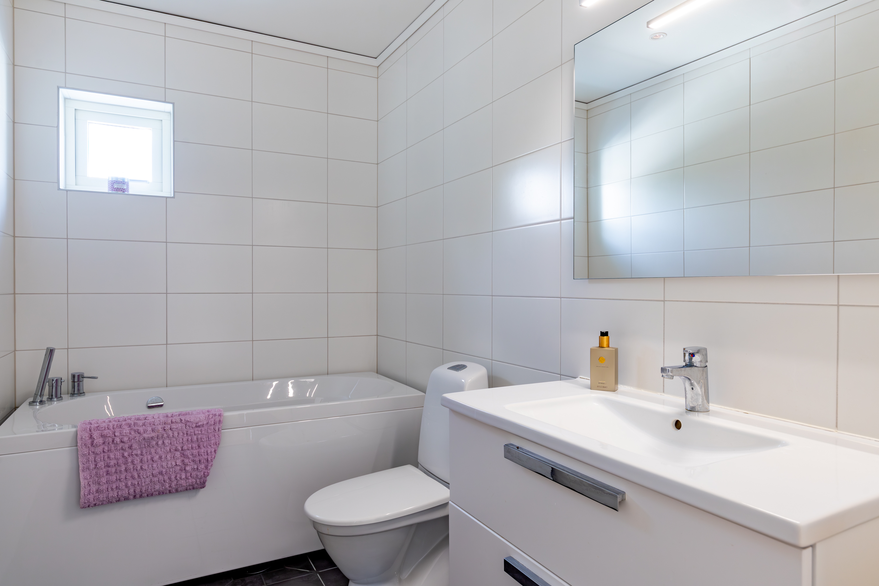 Helkaklat badrum med svart klinkergolv och vitt kakel på väggarna. Här finns badkar. Handfat i kommod, spegelskåp och wc. fönster med trivsamt ljusinsläpp.