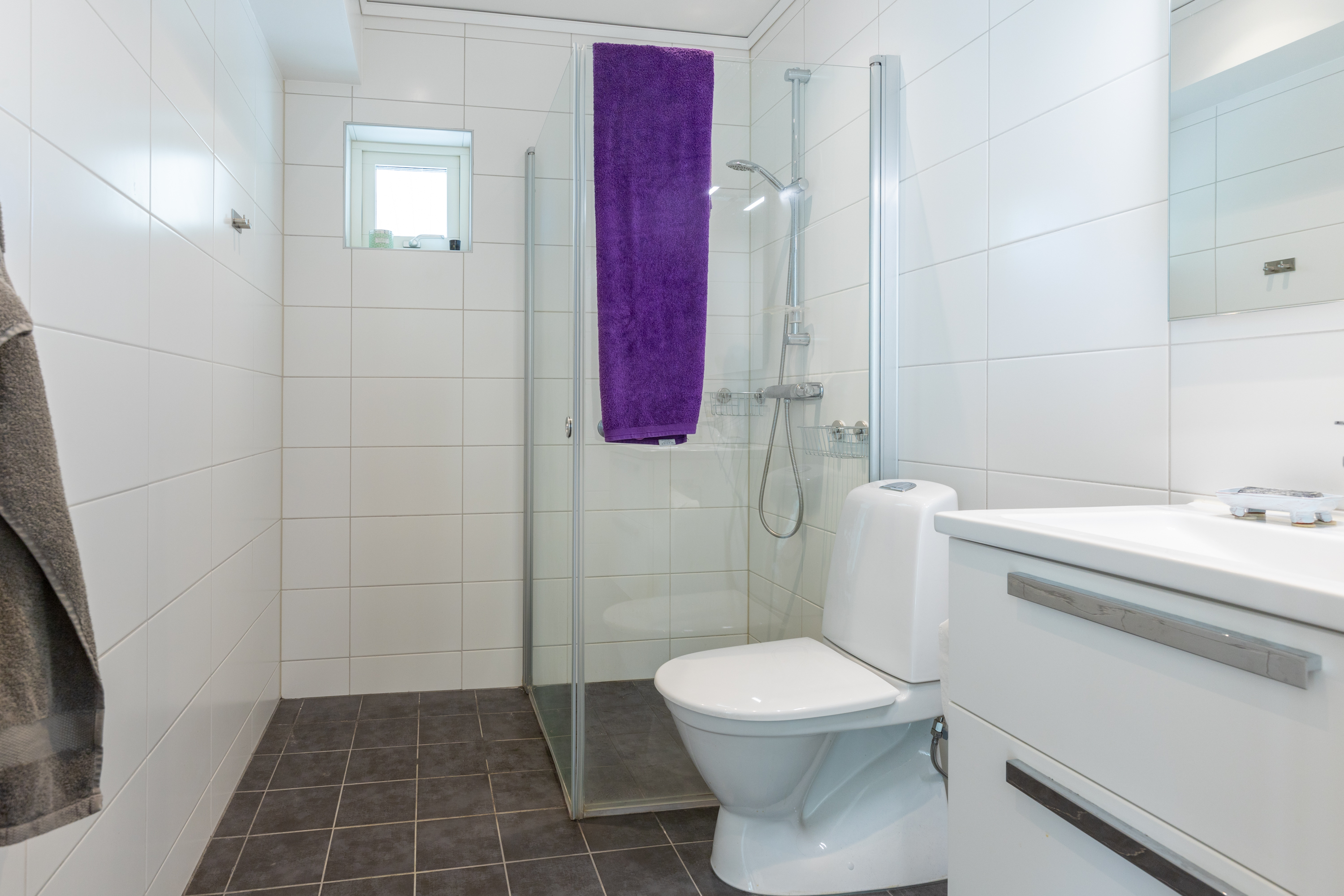 Helkaklat badrum med svart färgat klinker golv och vitt kakel . Badrummet är stort och rymmer dusch, handfat i kommod samt wc. Här finns även handdukstork, spotlights i taket samt ett fönster.