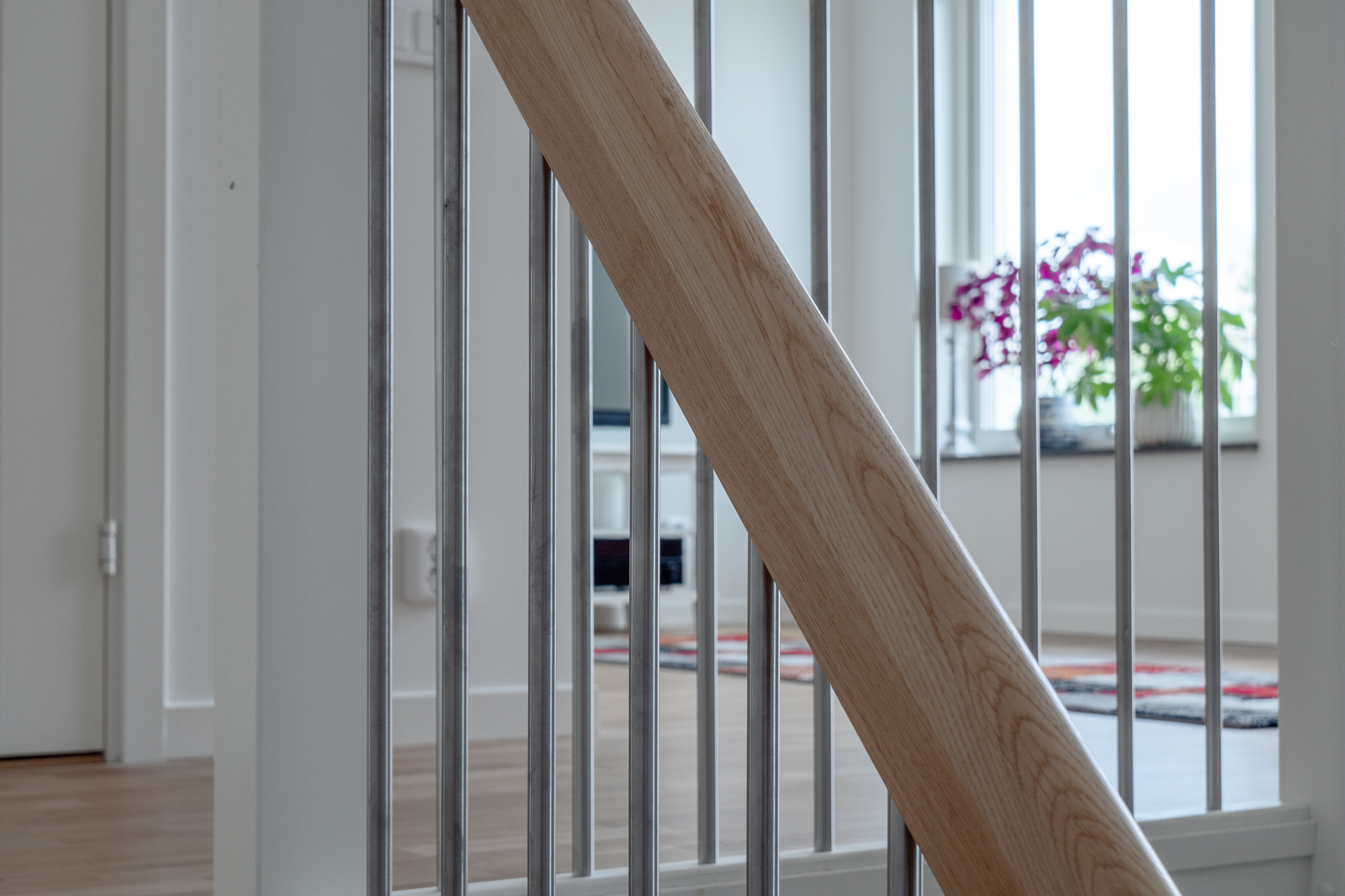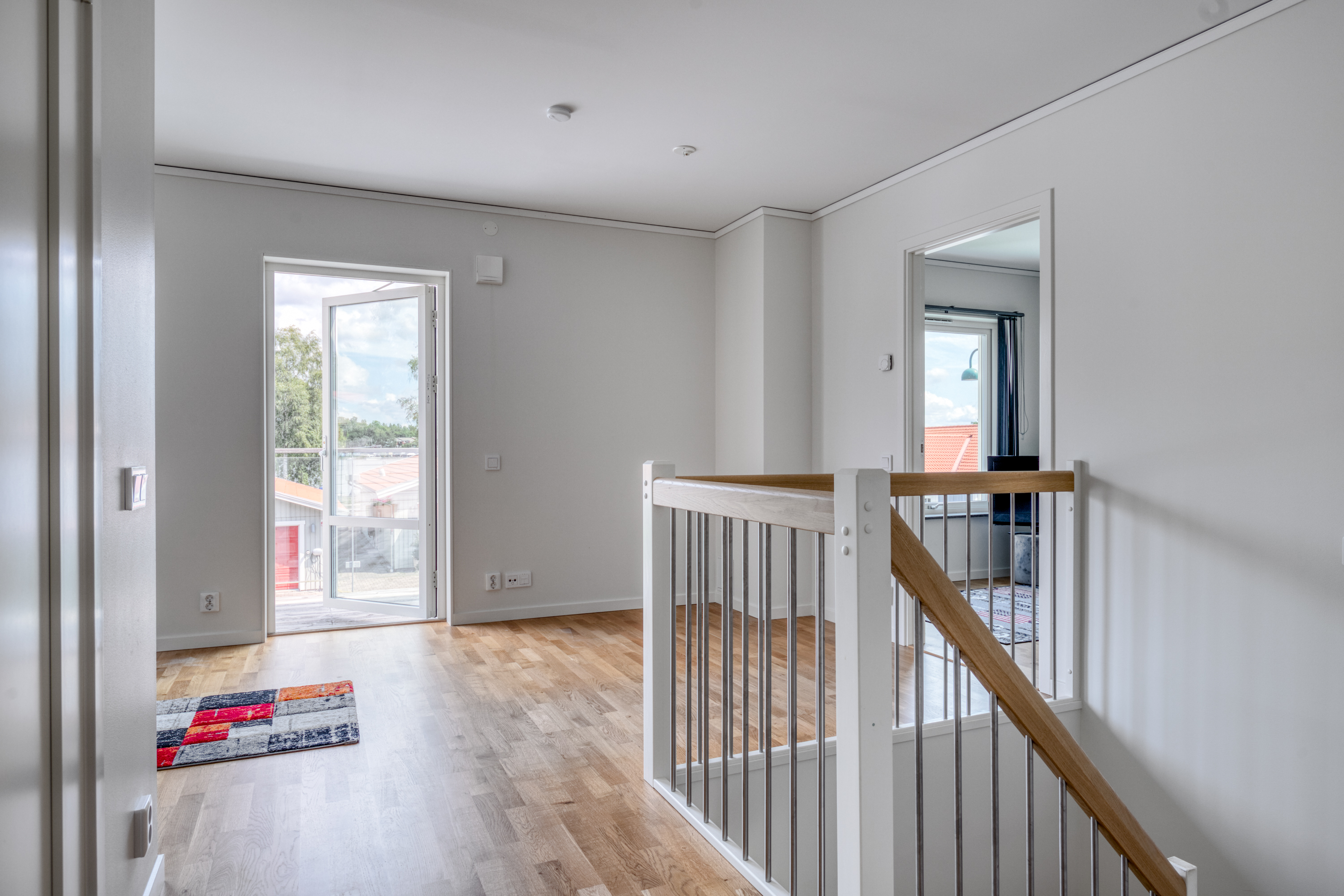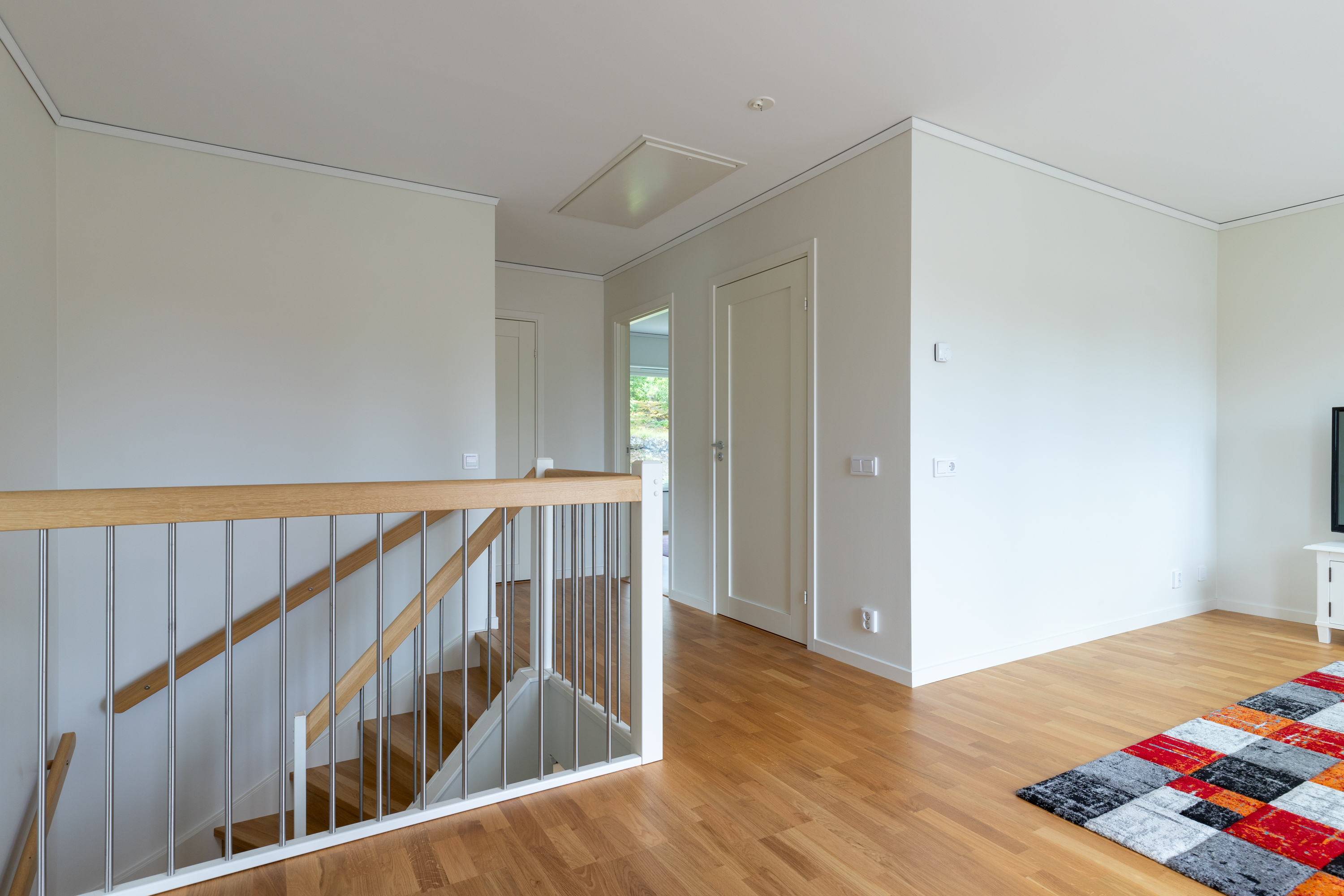 Ljus och rymlig hall med bra förvaringsmöjligheter Under tappen bra med förvaring. Ek parkett golv samt vitmålade väggar.
