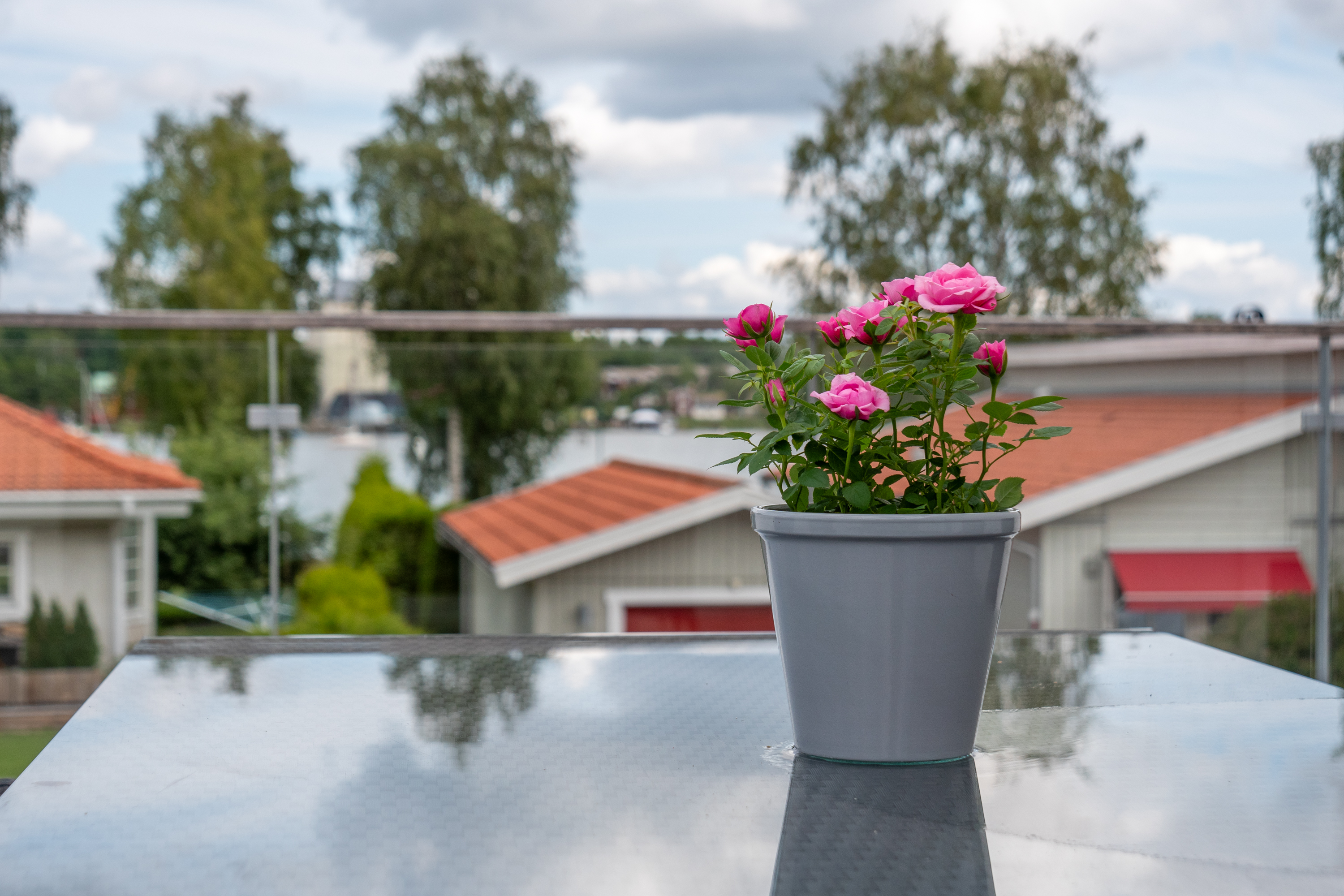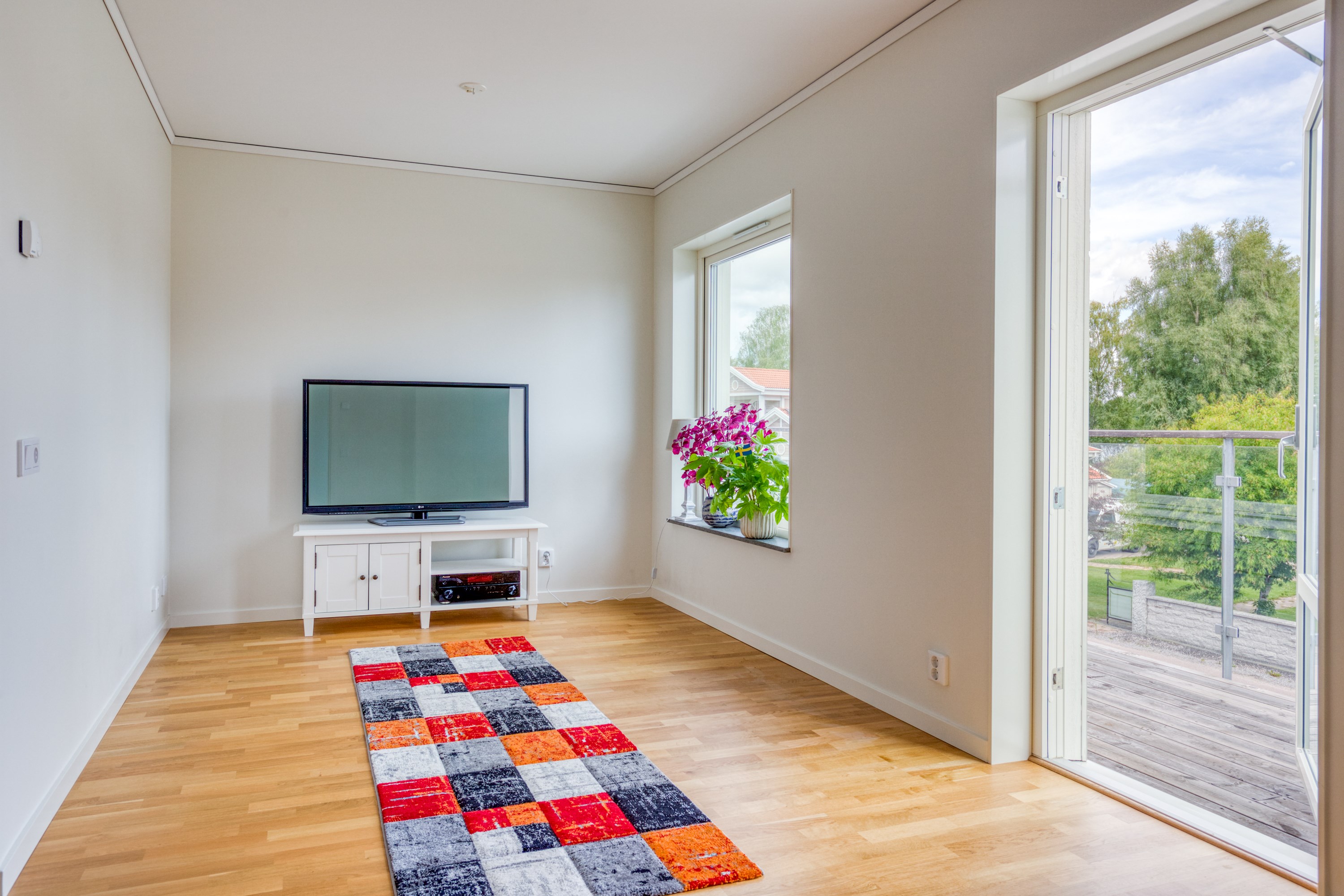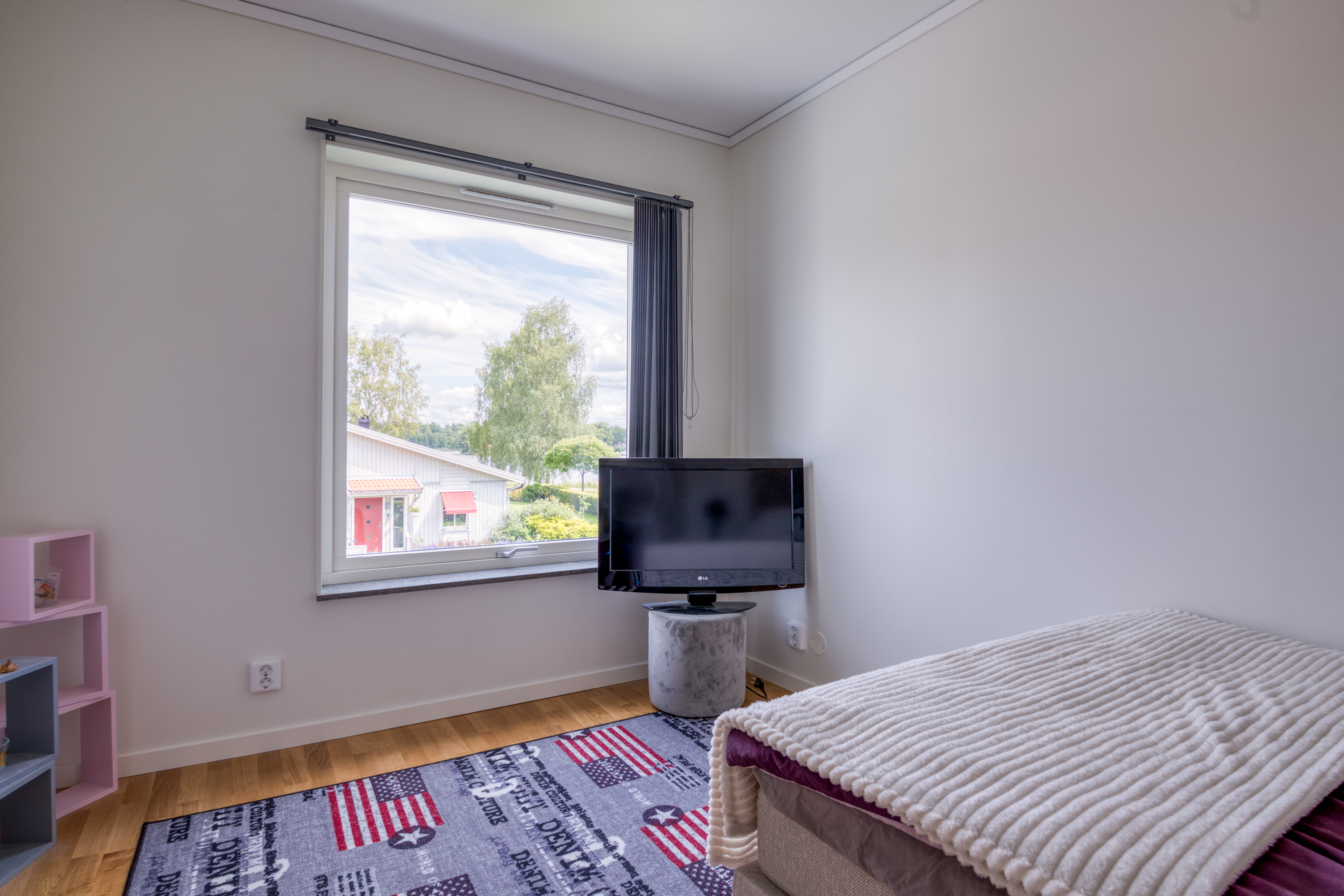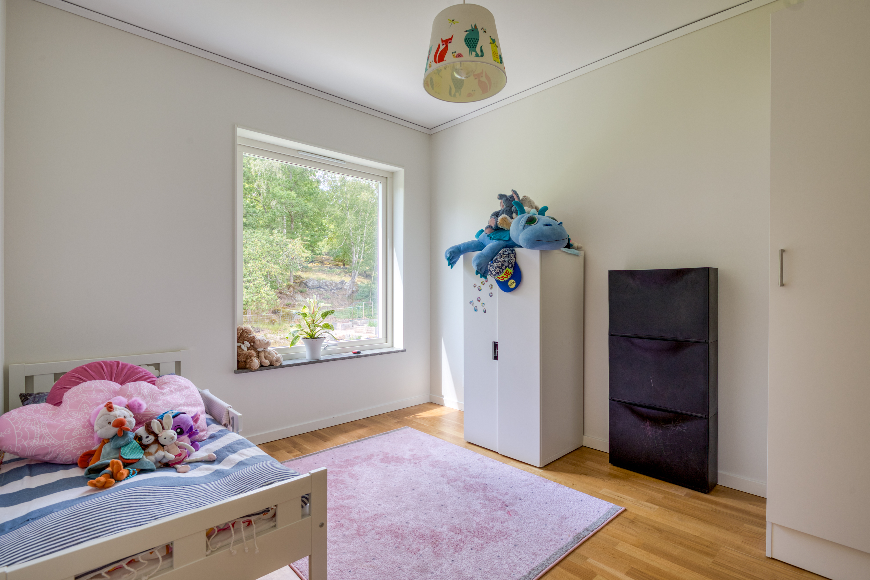 Rymligt och ljust rum med parkettgolv och vitmålade väggar. Stora fönster och balkongdörr ut till stor balkong i vinkel och utsikt mot Mälaren. Plats för soffmöbel och läshörna/kontorsplats.