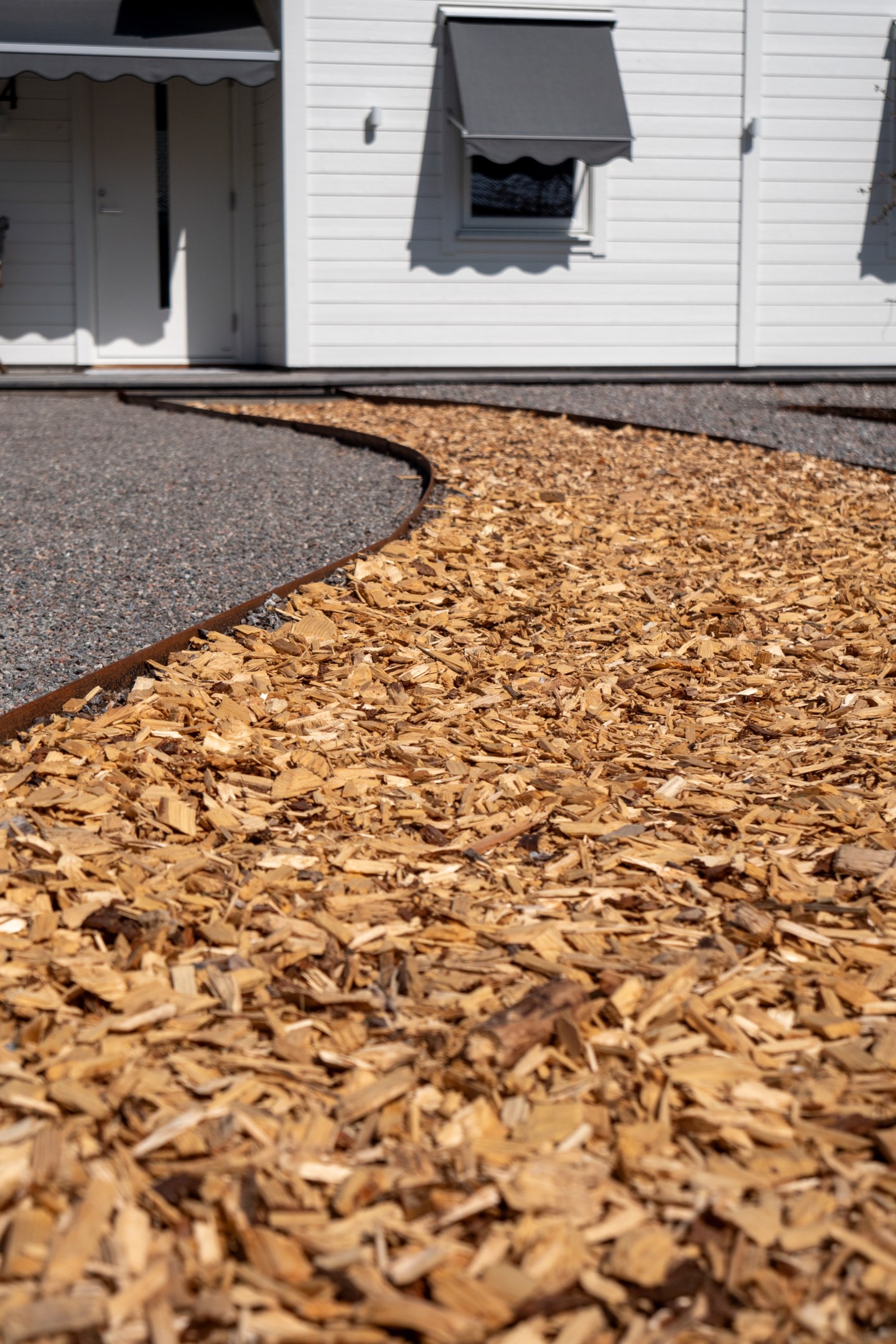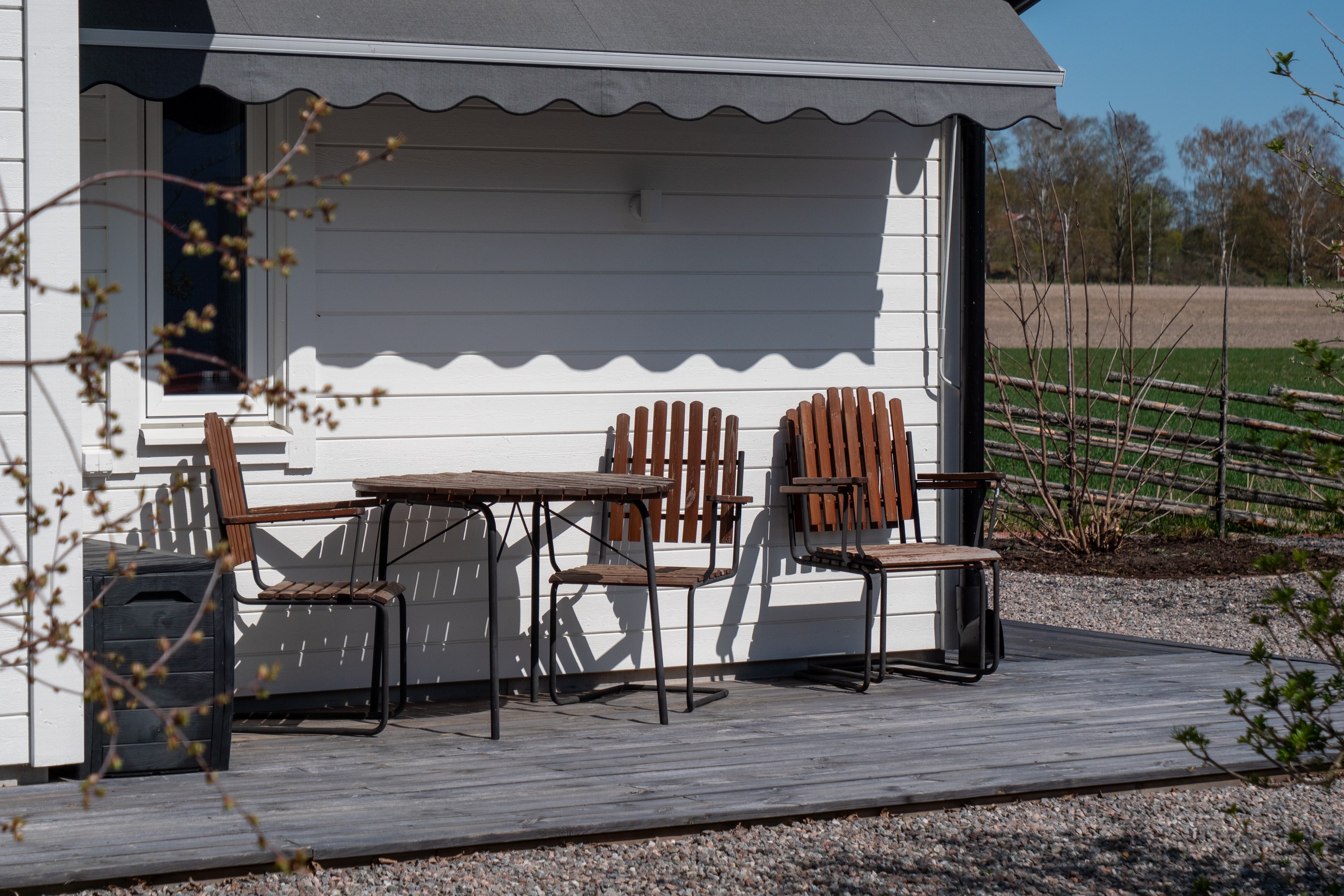 Fasad: Entré sidan: Fönstermarkiser, för de 2 sovrummen, regleras inifrån rummen. Väggmarkis vid huvudingången och sittplatser. Väggmarkis vid ovanför sittgrupp, i vinkel längst till höger Baksidan, Markis vid utgången fr. sovrum 3