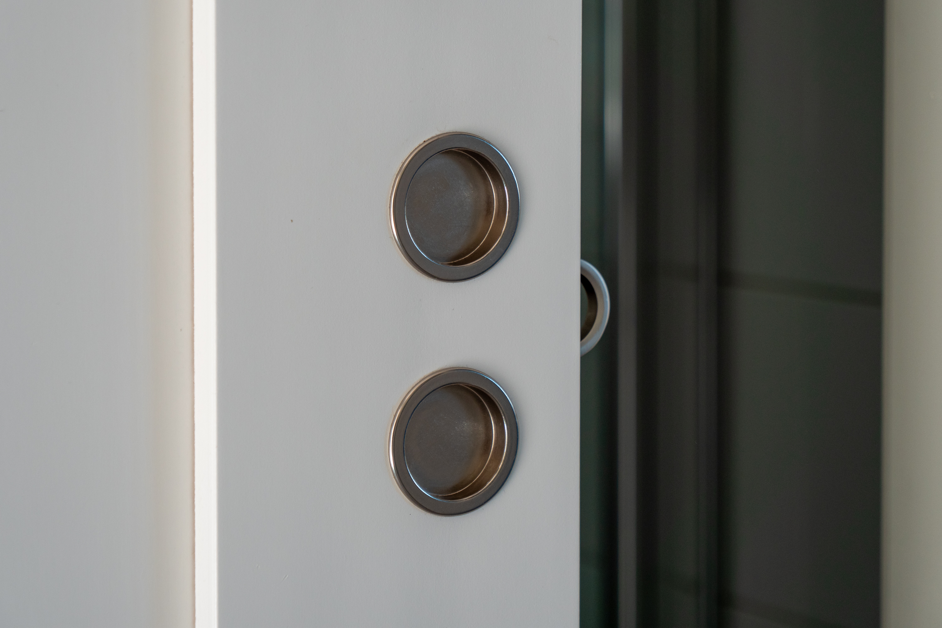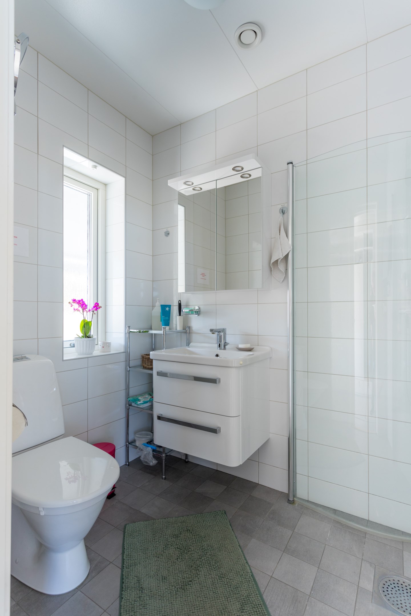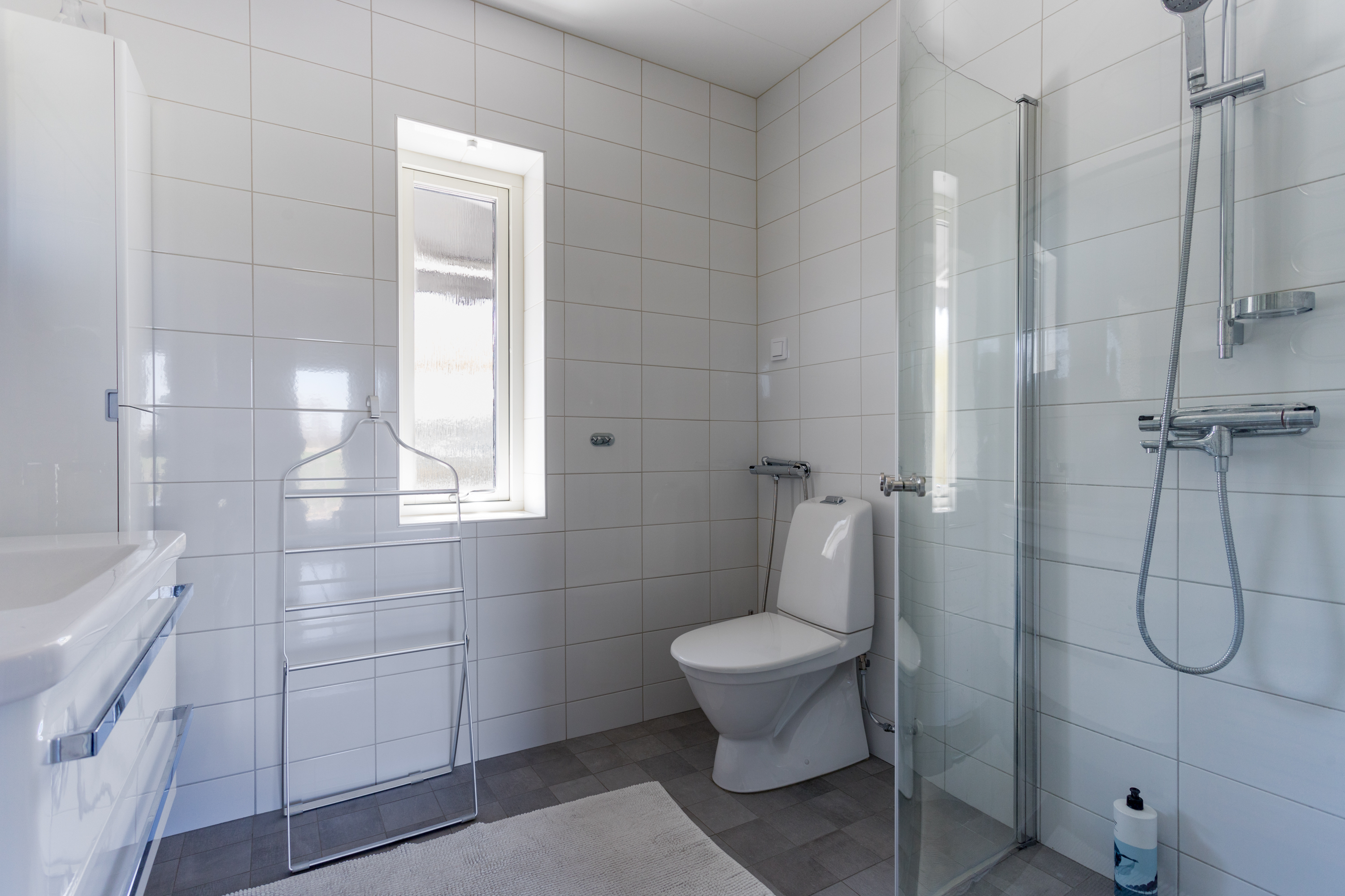 Ljus målade väggar och klinkergolv. Dux Avantis, garderobssystem.
