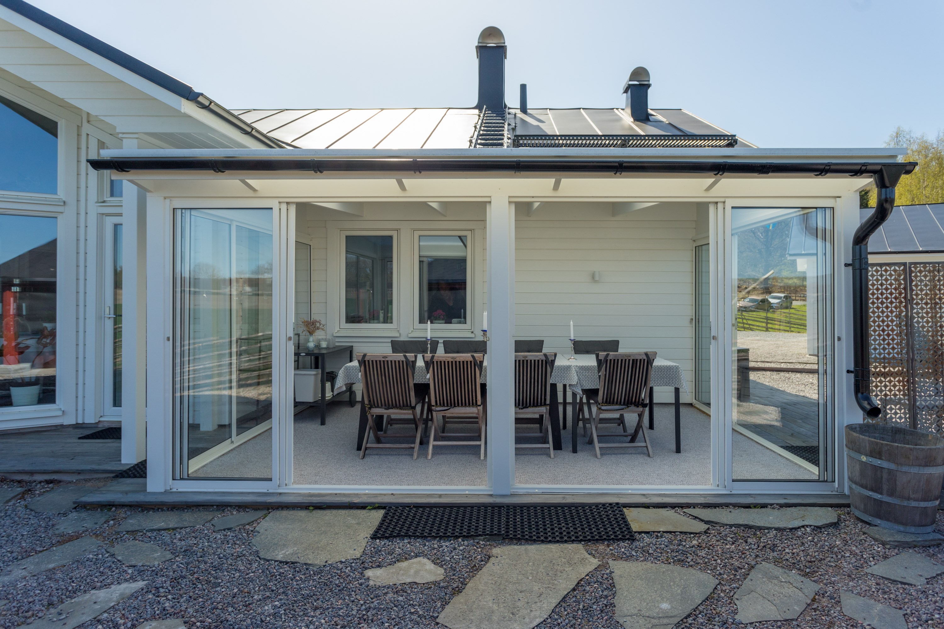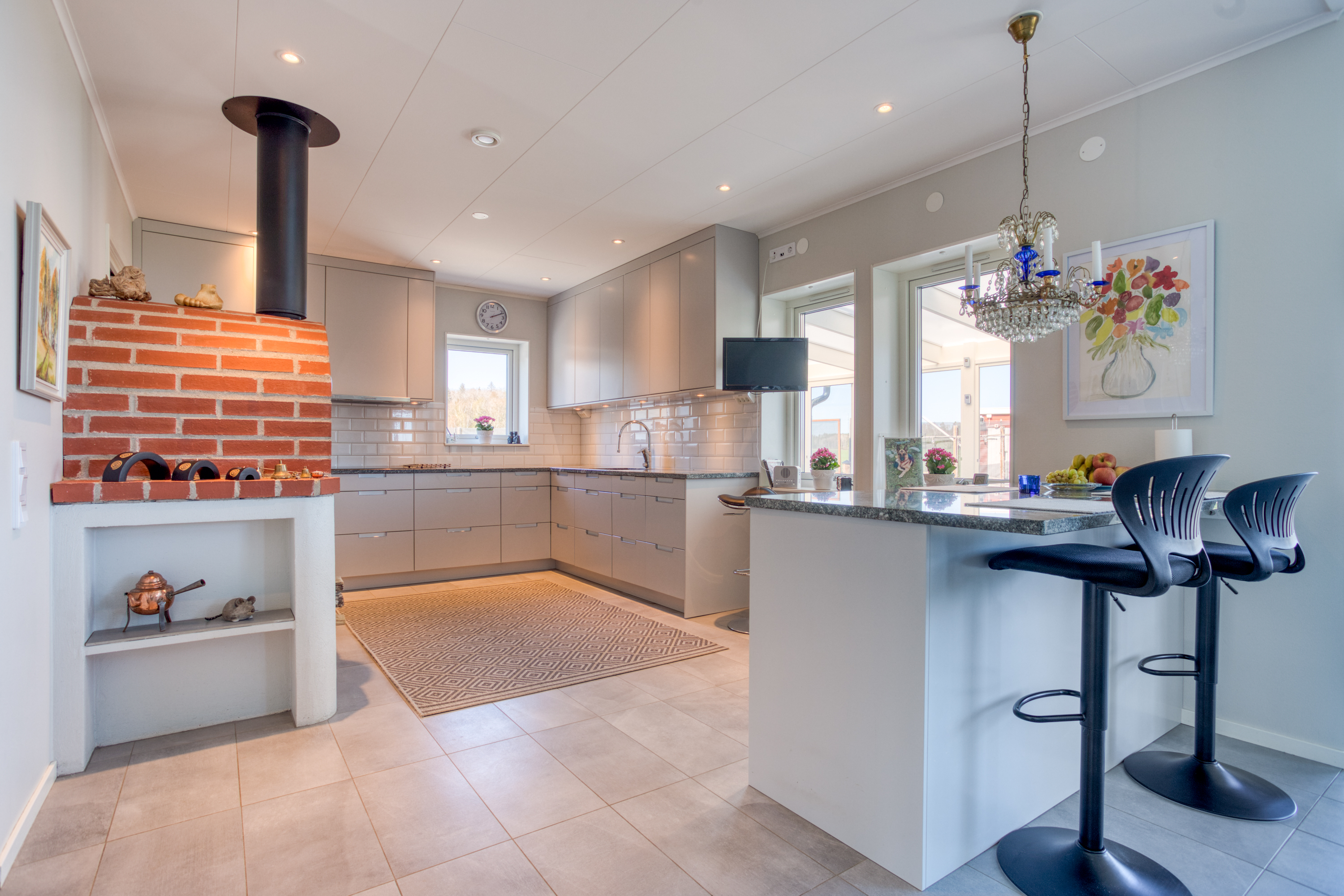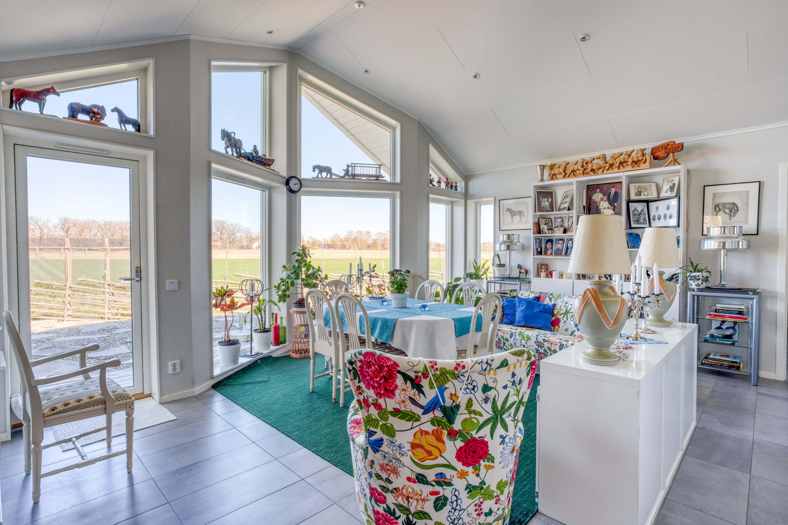 Med plats för den stora familjen. Ljus gråa väggar, klinkergolv och hel fönstervägg och utgång till stenlagd uteplats.