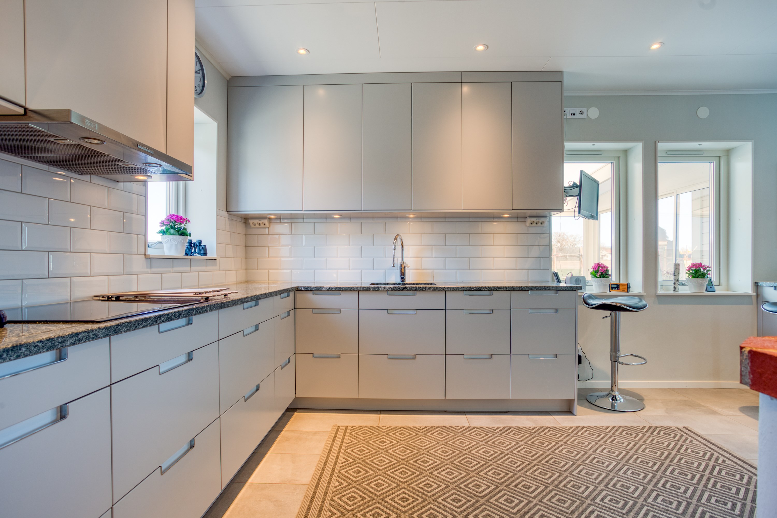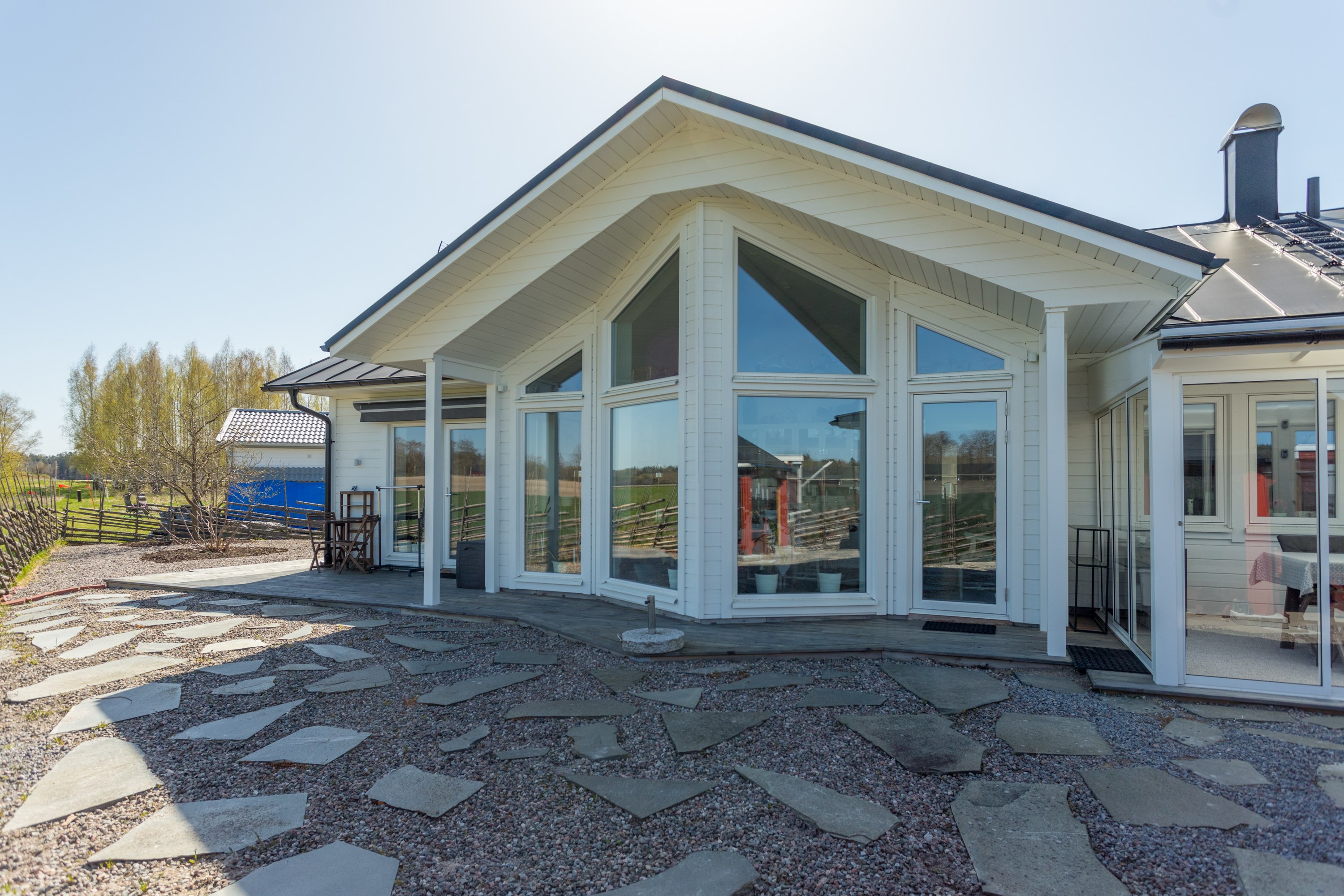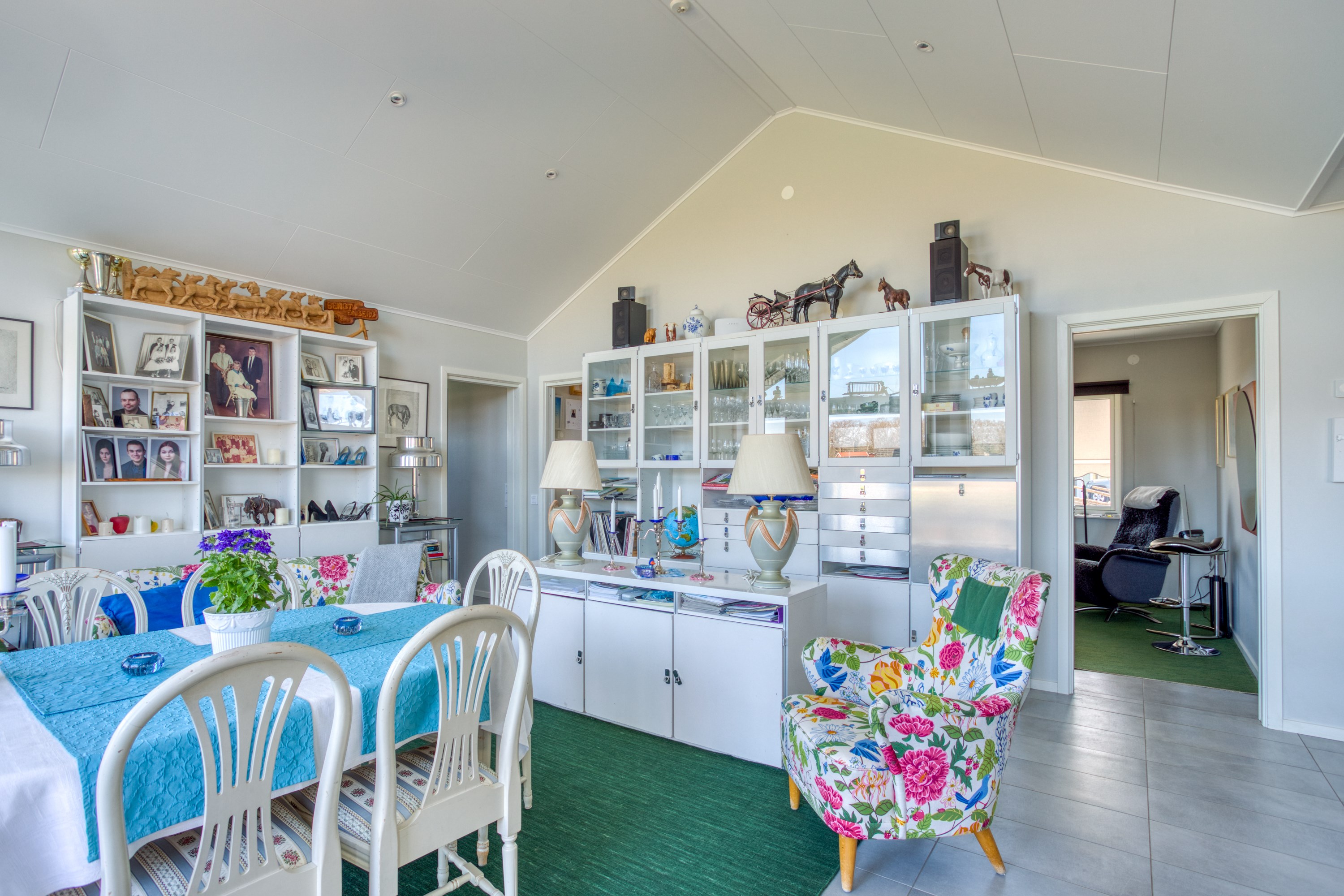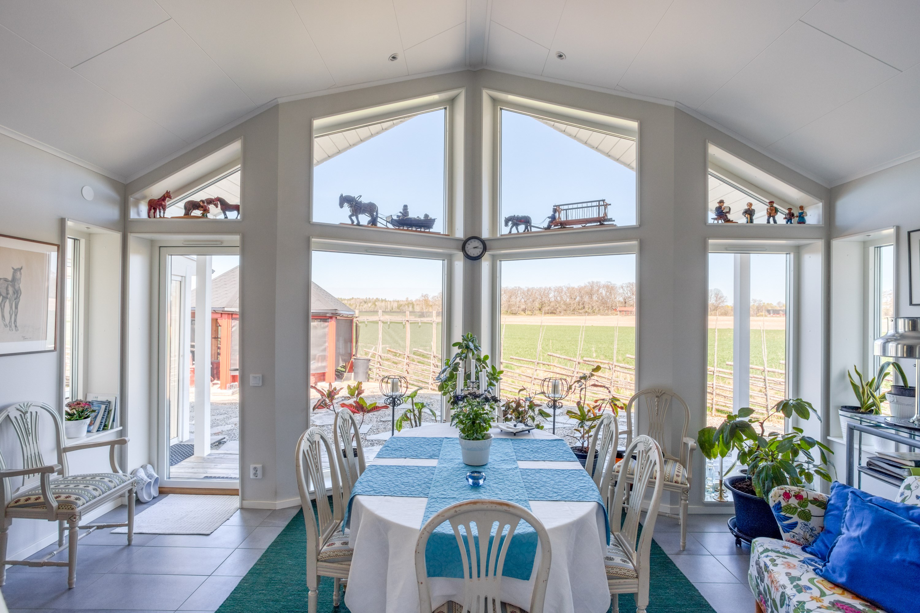 Med plats för den stora familjen. Ljus gråa väggar, klinkergolv och hel fönstervägg och utgång till stenlagd uteplats.