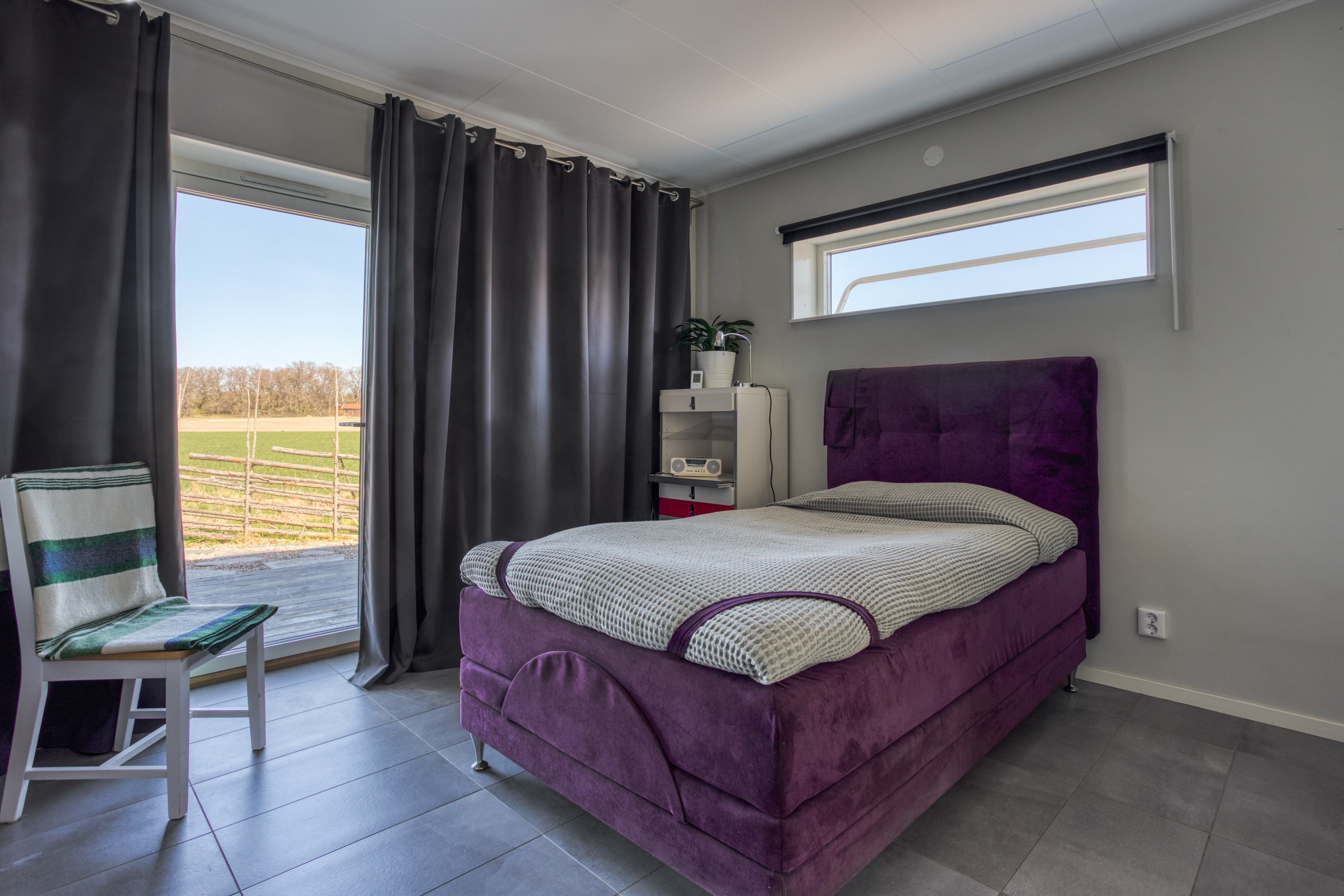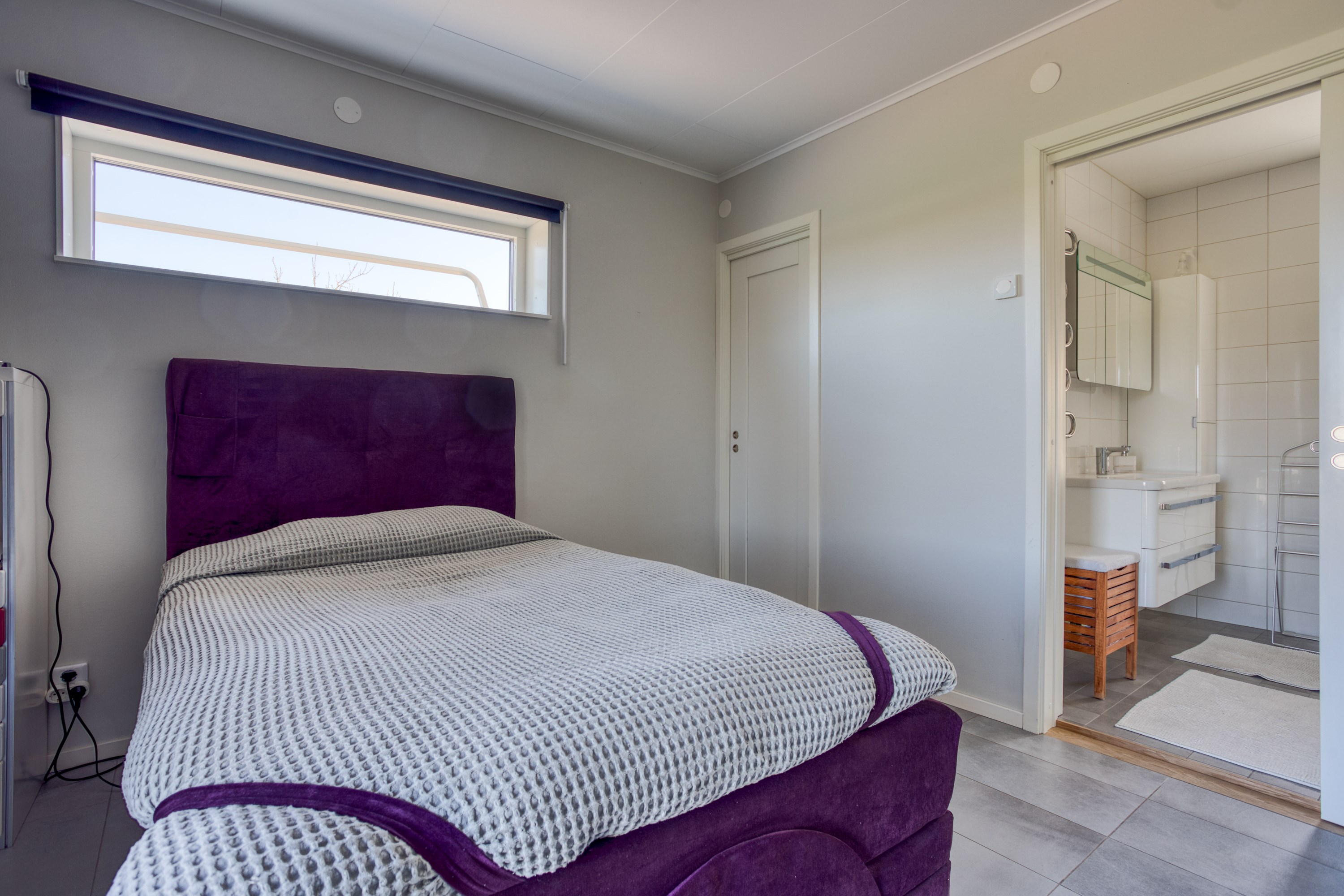Rymligt master bedroom, målade väggar, klinkergolv. Klädkammare med bra med förvaring. Utgång till trädgården.
