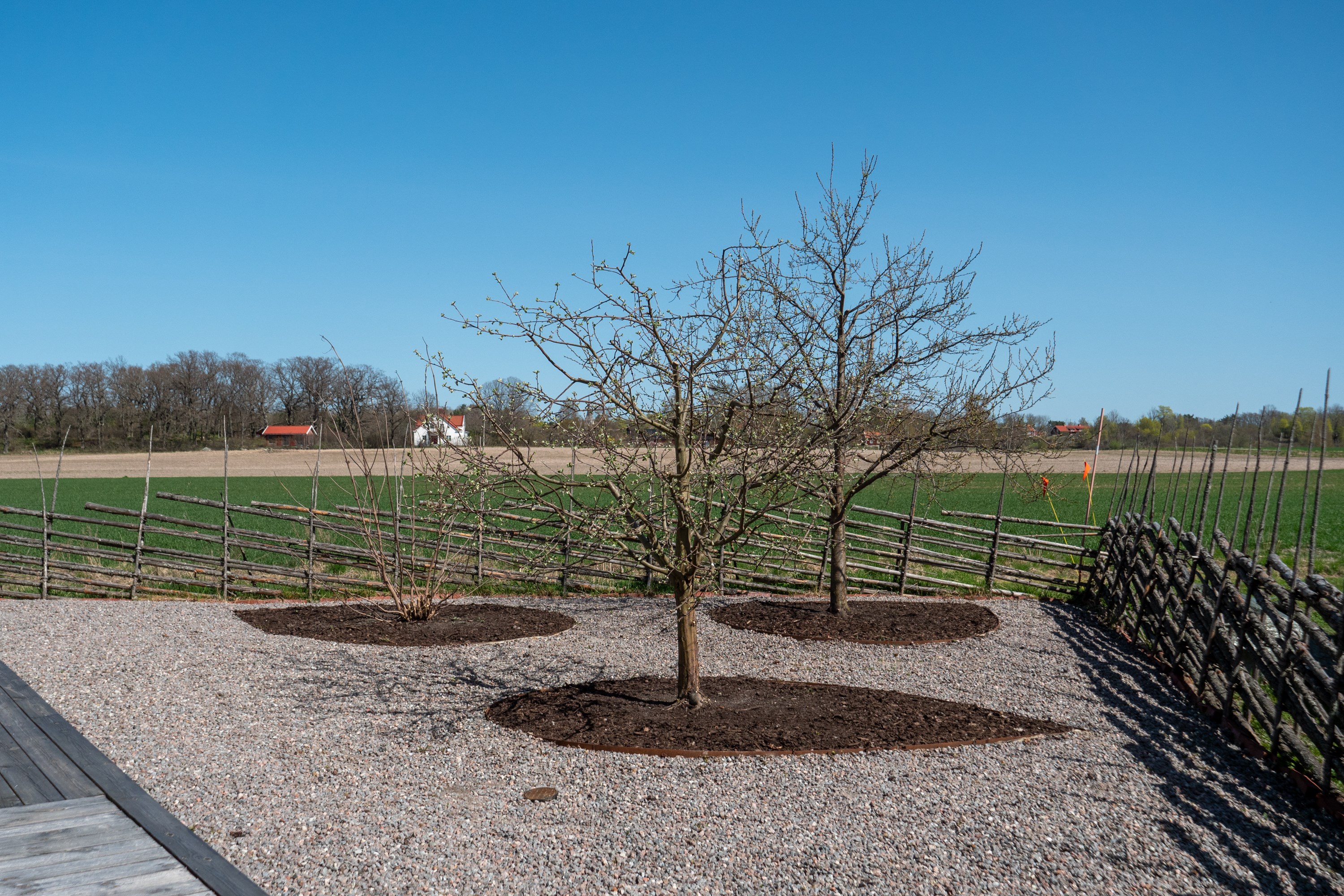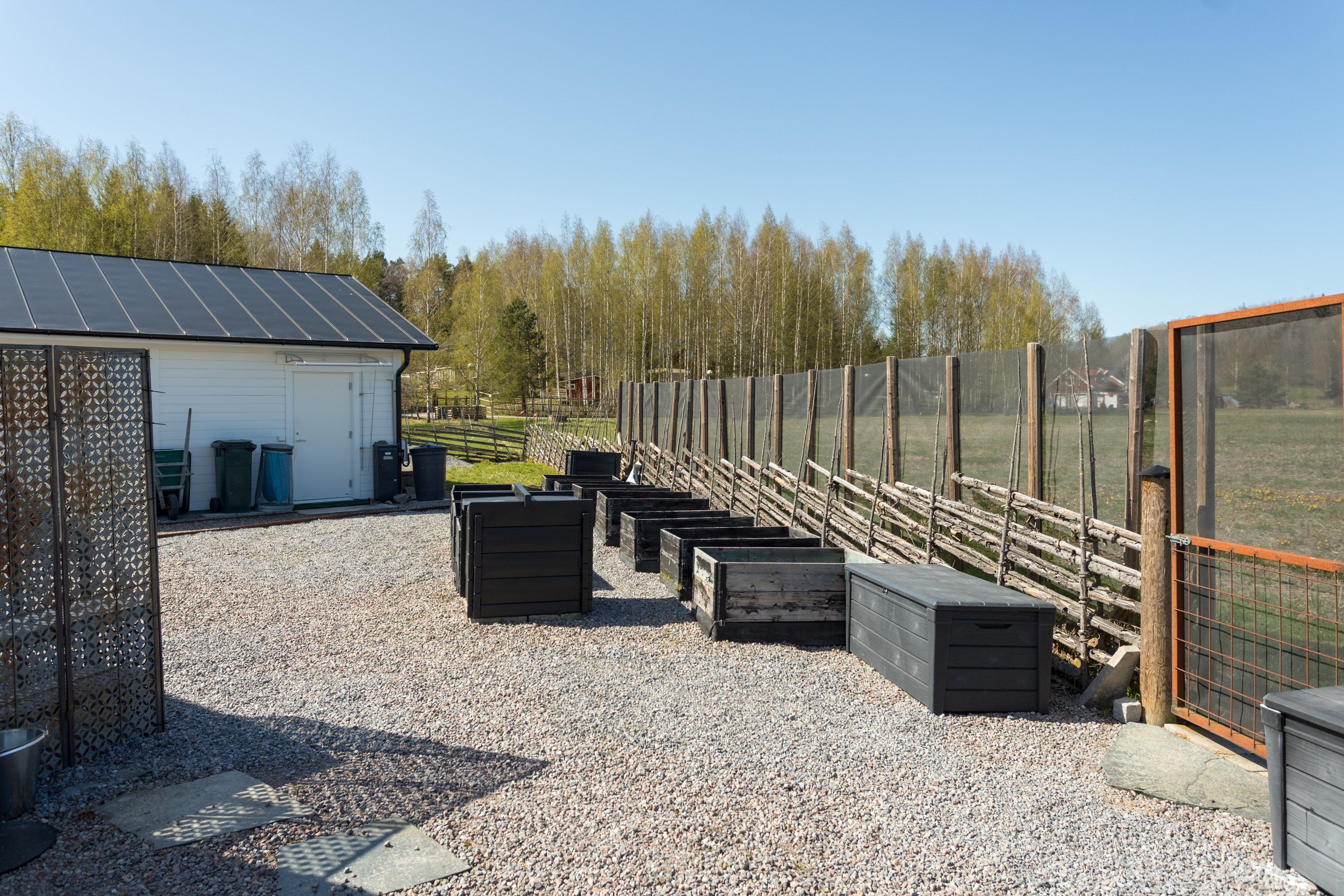 Vacker tomt indelad flera rum. Flera odlingslådor i pallkragar. Fruktträd och bärbuskar så som äpplen, plommon, körsbär och fläder. "Fruktträden dignar av Plommon, Höstäpple och Vinteräpplen Bra skörd detta år".