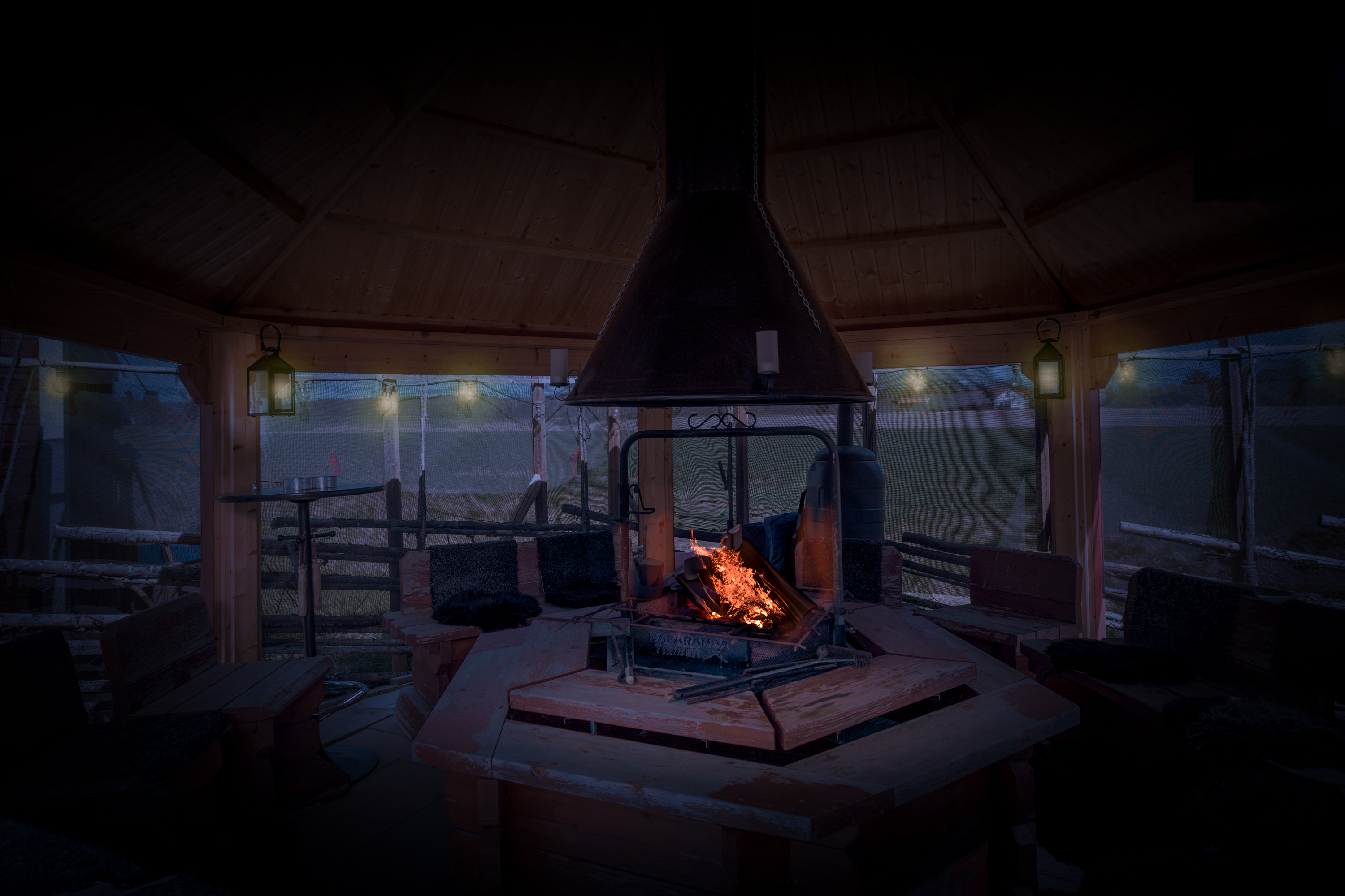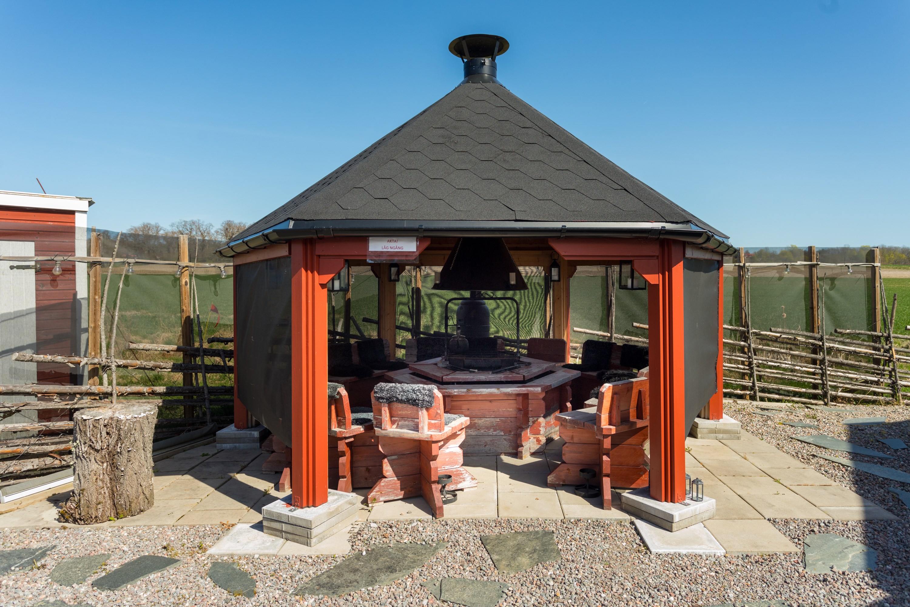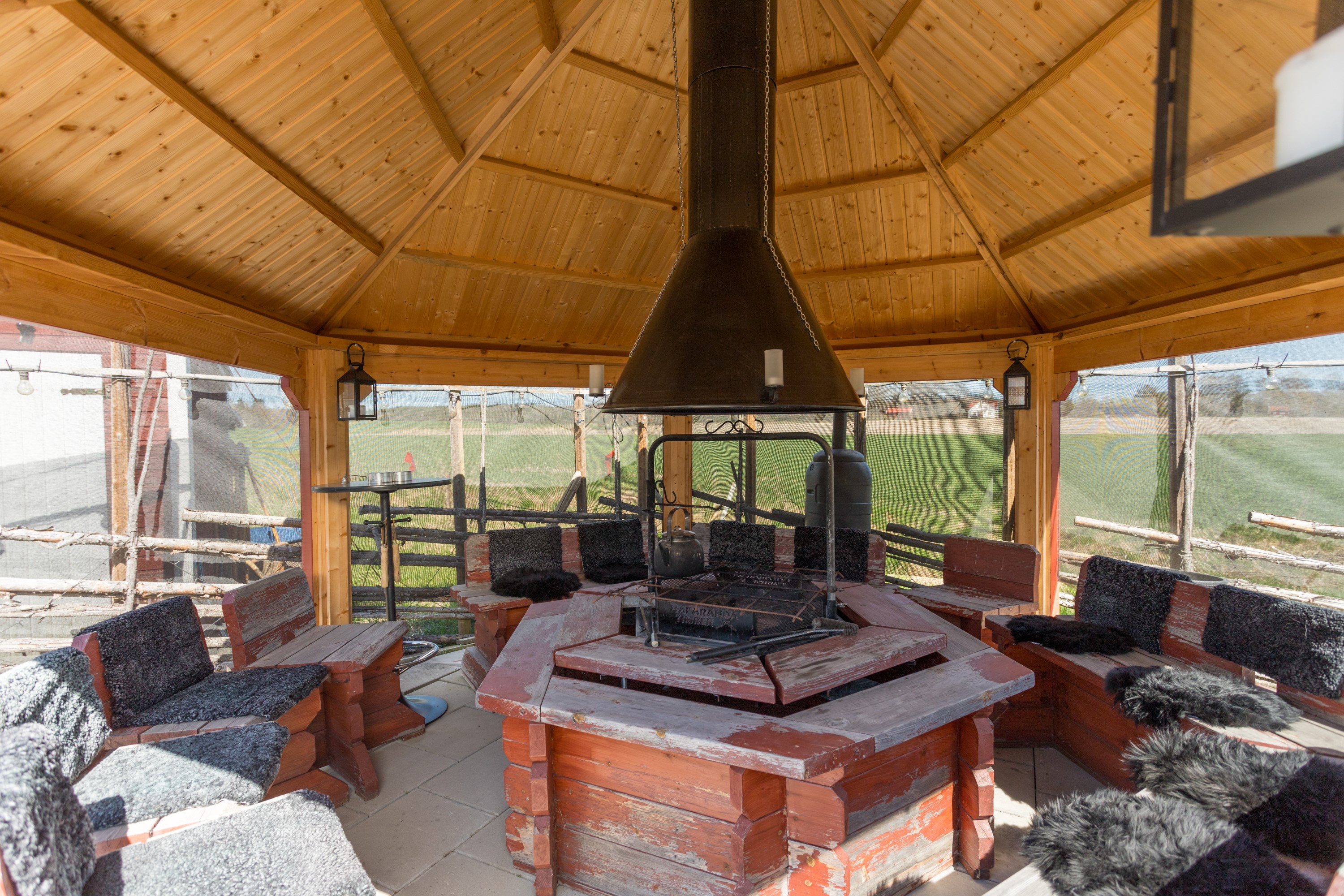 Inglasat uterum byggt 2021 ca 13 kvm. Stor lägereld med stort tak för skydd mot snö och regn. Flera sittplatser i alla väderstreck.