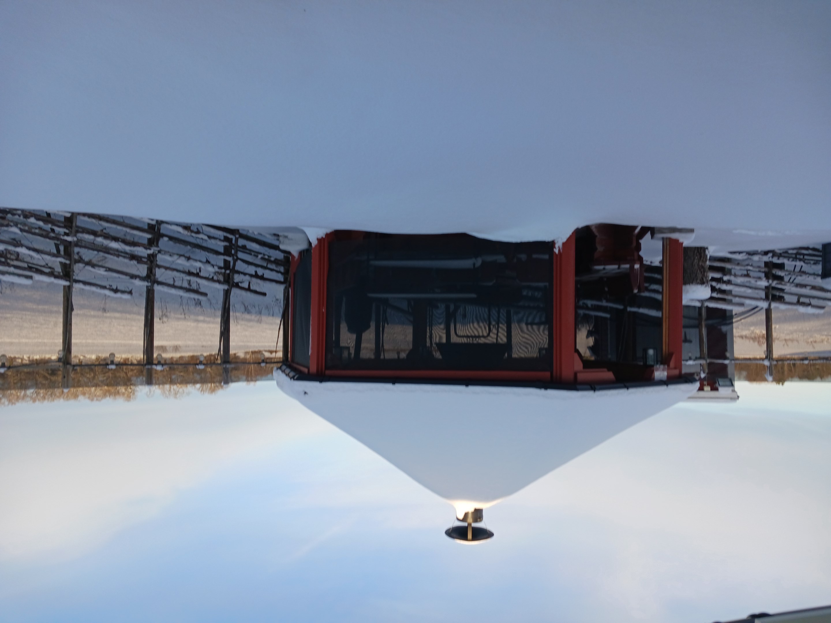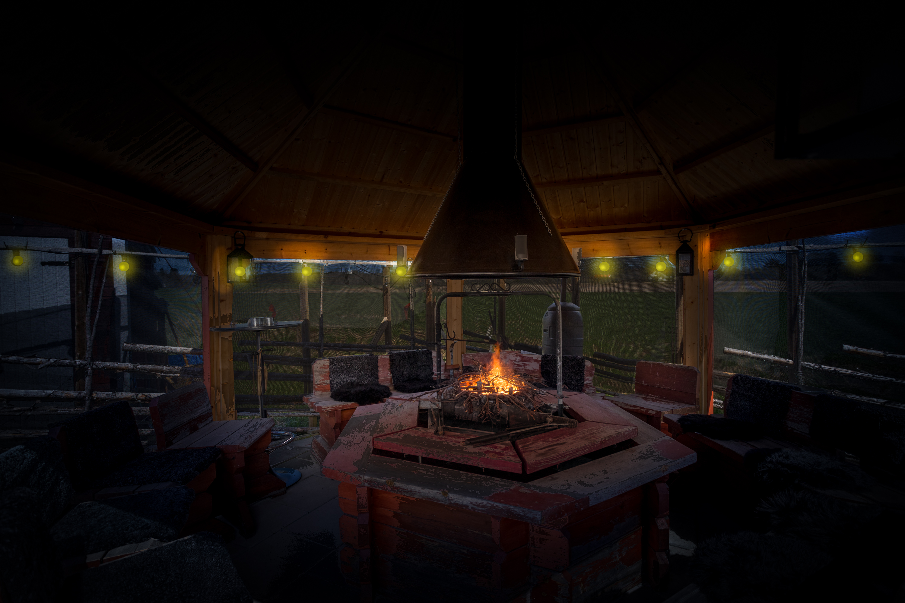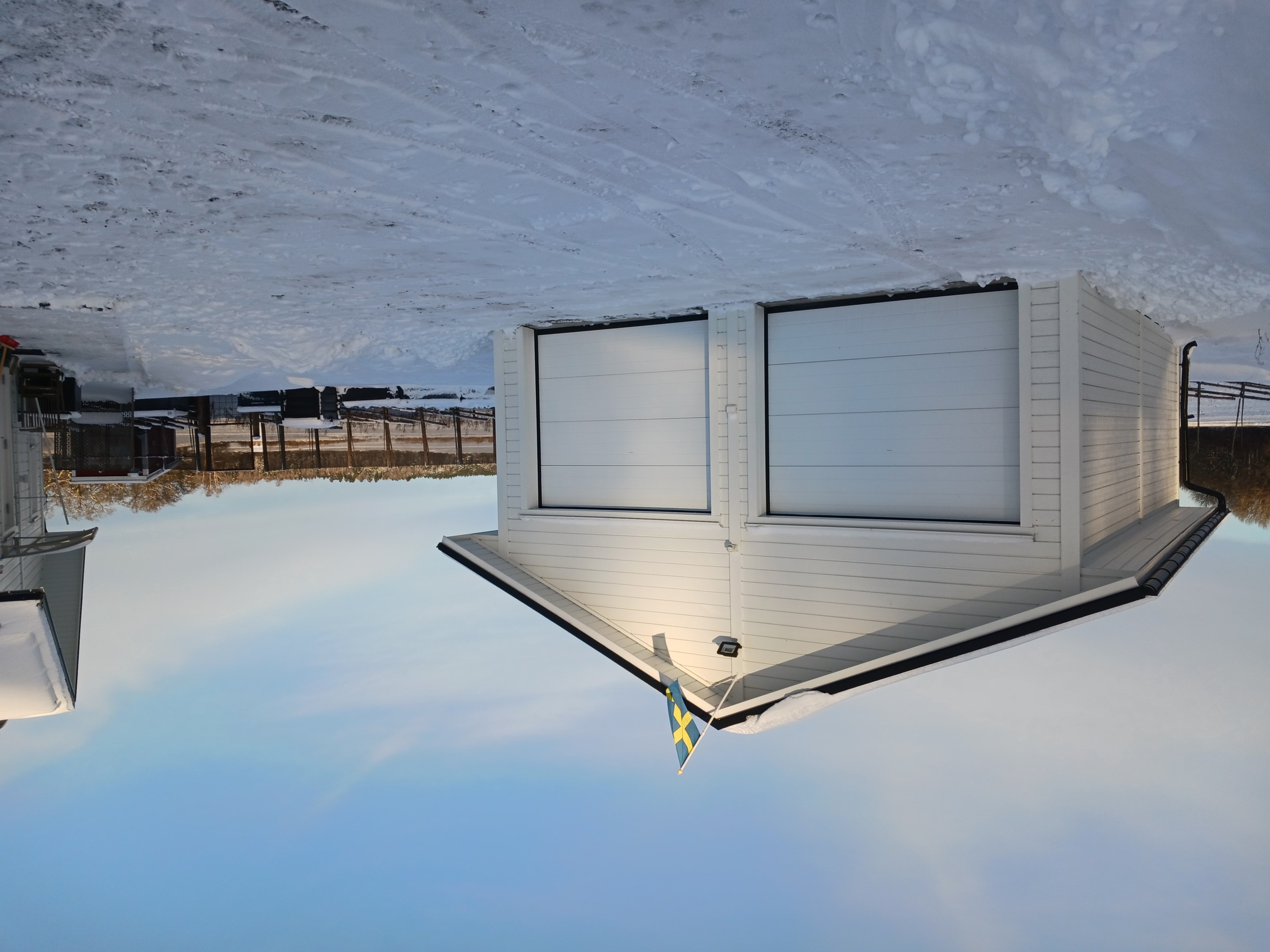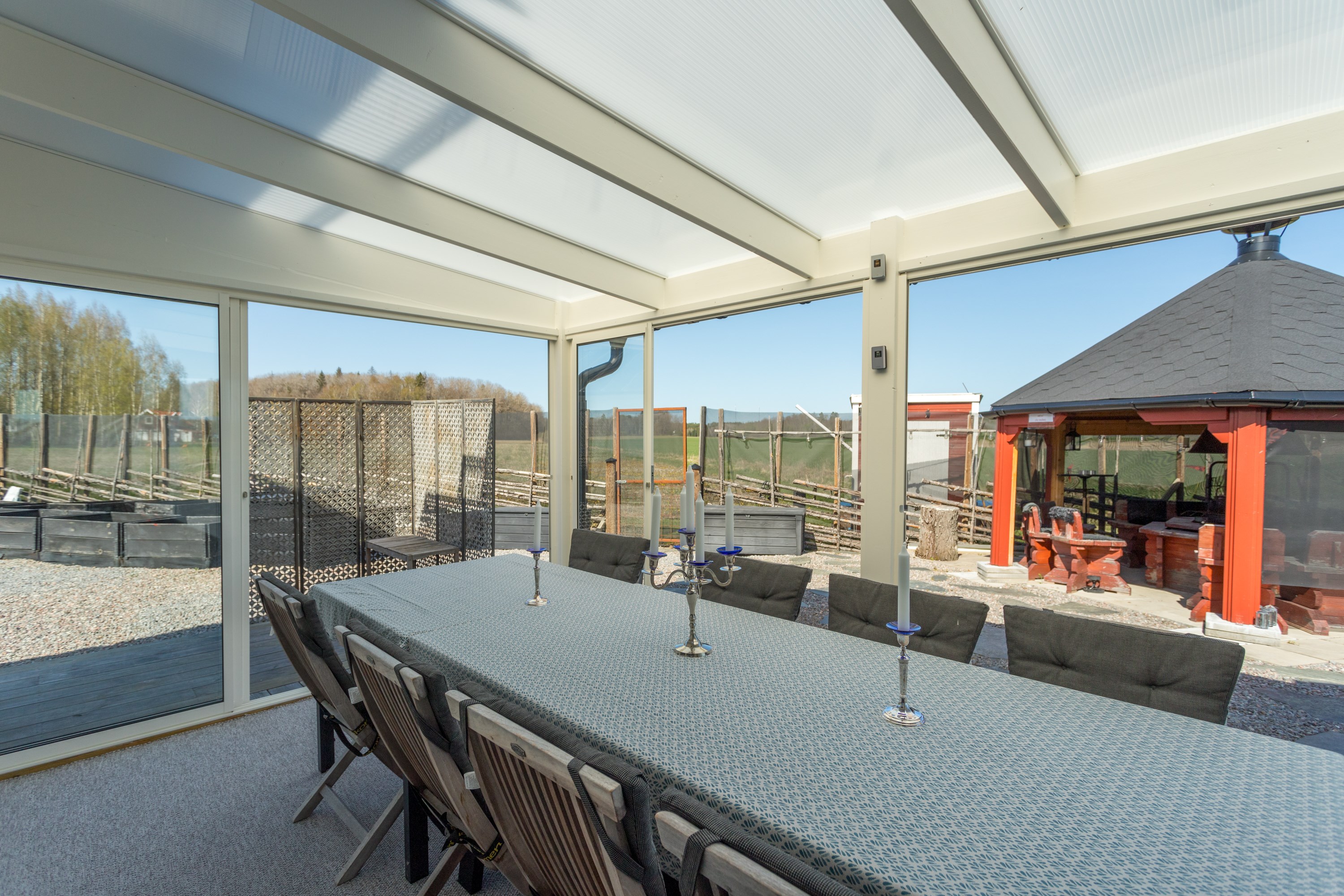 Inglasat uterum byggt 2021 ca 13 kvm. Stor lägereld med stort tak för skydd mot snö och regn. Flera sittplatser i alla väderstreck.