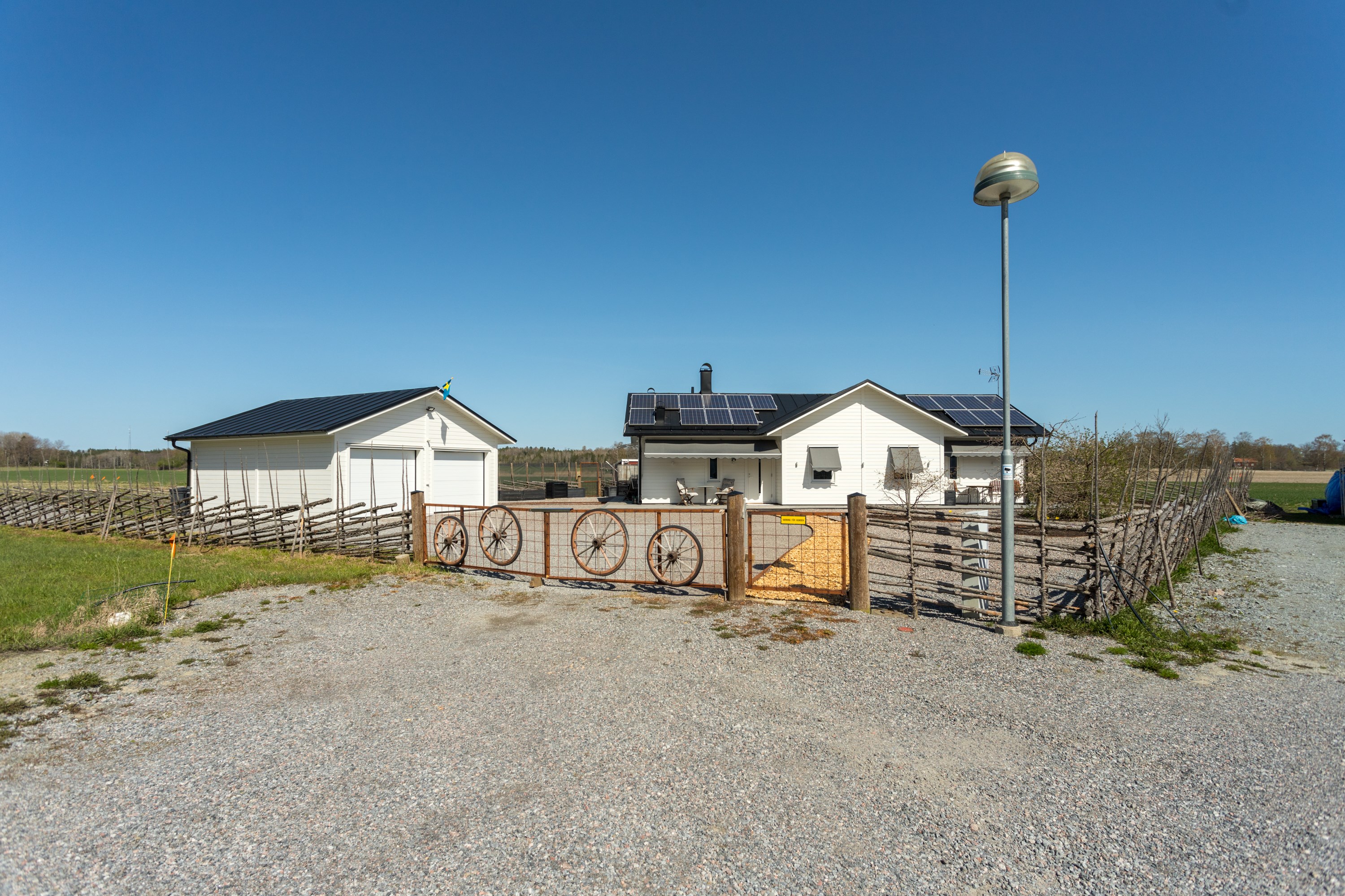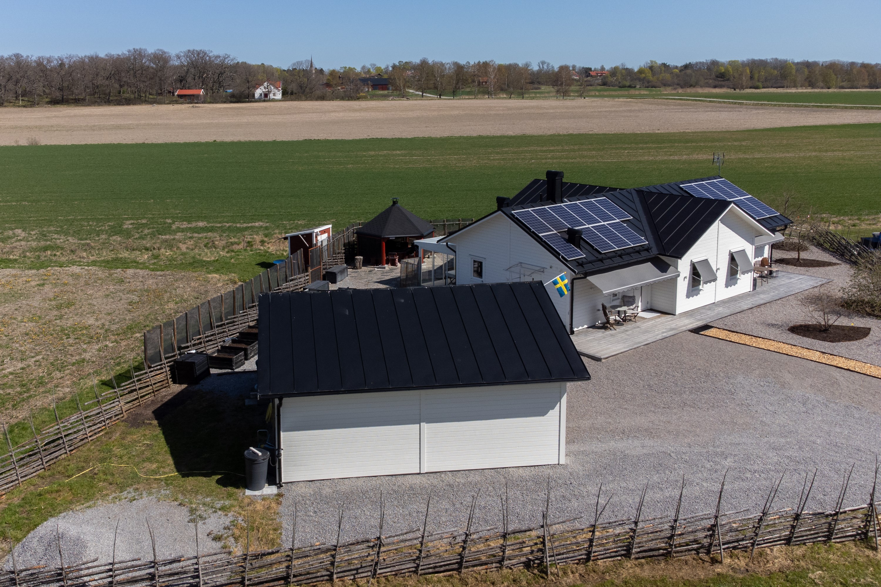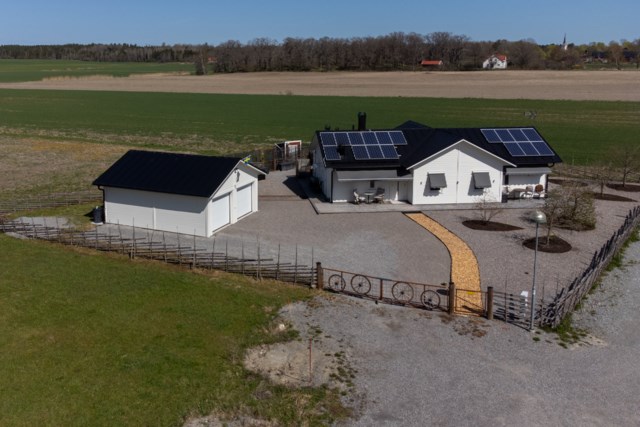 Ett litet detaljplanerat villa område, i jordbruksbygd på Aspö mellan Strängnäs och Enköping! En Gärdesgård runt hela tomten, med gånggrind på fram- och baksidan, samt en 2 delad kör grind i stålkonstruktion. Här kan man verkligen koppla av. Njuta av alla vilda djur! Nästan dagligen kan man se, ute på odlings fälten. Älg, Dovhjort, Rådjur. Inte minst flytt fåglar, som vilar upp sig innan de flyger vidare till Norra Sverige. Bra kikare är värdefullt att ha tillhands, på strategiska platser. Säljaren har varit sin egen ”byggherre” under hela planerings- och byggprocessen, från år 2016 och till inflyttningen juni 2017, för utom ”snickarfärdigt” enligt avtal med Västkustvillan för Trubadur 98. med ytter- och innerväggar. Dubbelgarage, med takskjutsportar. Övriga hantverkare upphandlades separat. Säljaren anlitade lokala, kända och välrekommenderade leverantörer och hantverkare under hela byggprocessen. Endast ”skalet” med ytter- och innerväggar till Trubadur 98 upphandlades. Egen beställning: Alla innerdörrar är skjutdörrar, vilket gör huset lätt möblerat! Klinkergolv i hela huset, med golvvärme, lättstädat! I köksdelen finns en vedeldad Italiensk bakugn, som murats upp på plats. Alla bakredskap ingår i försäljningen. En eluppvärmd handdukshängare finns på höger sida av ugnen, för kökshandduk och disktrasa. Köksinredningen har många finesser, och tillverkat på ett snickeri i Malmköping. Granitbänkar i vinkel, och på köksön med kyl och frysskåp inunder. Frysbox, Kyl o Frysskåp, finns som ”lager” i garaget. Där finns även Avantiskåp för konserver och torra varor. I hygienutrymmet för gäster, har tvättstället rörelse fri vattenarmatur, likaså i stora hygienutrymmet. Förberett för elektronisk bidé. se länk. https://www.facebook.com/svancare/videos/automatisk-bid%25C3%25A9toalett-med-tv%25C3%25A4tt-och-torkfunktion-bidette-r3/282985695702994/?locale=sv_SE Dux Avantis, garderobssystem finns i hall och de två mindre sovrummen. Ingår! I grovingången, ut till garaget, finns vägg-/hyllsystem ELFA, likaså i garaget. Ingår i försäljningen! En c:a 13 kvm. Inglasning finns på baksidan, med öppningsbara glaspartier på 3 sidor. En oljebaserad masonitskiva, som fuktspärr ligger under heltäckningsmattan. Rummet kan rymma upp till 10-12 personer, när man möblerar upp med långbord. Inredningen kan säljas separat! Lägereld, med ”Stor tak” för skydd mot regn och snö, från Haparanda Timber. Sittplatser för upp till 14 personer, med Vind nät, finns framför uterummet. Alla special verktyg, och björkved som finns kvar i 2 dynlådor ingår. Fastigheten förberedd, redan vid planeringsarbetet år 2016, för eventuella kristider! I dubbelgaraget finns det skåp och hyllor, som kan lagra konserver/torra varor samt vatten, som förnyas med regelbundet. En Italiensk vedeldad bakugn, uppmurad på plats, med ved utrymme inunder. Investeringskostnad c:a 35.000:- Lägerelden, från Haparanda Timber, för upp till 14 personer, under tak och med vindskydd. Många redskap för matlagning ingår vid försäljning. Investeringskostnad c:a 50.000:- . Även björkved som finns kvar vid försäljning ingår. Lantbrukare på Aspö kan levererar, 30 cm kluven och torr björkved och kan lagras upp i 2 stora Dyn lådor som ingår vid försäljning.