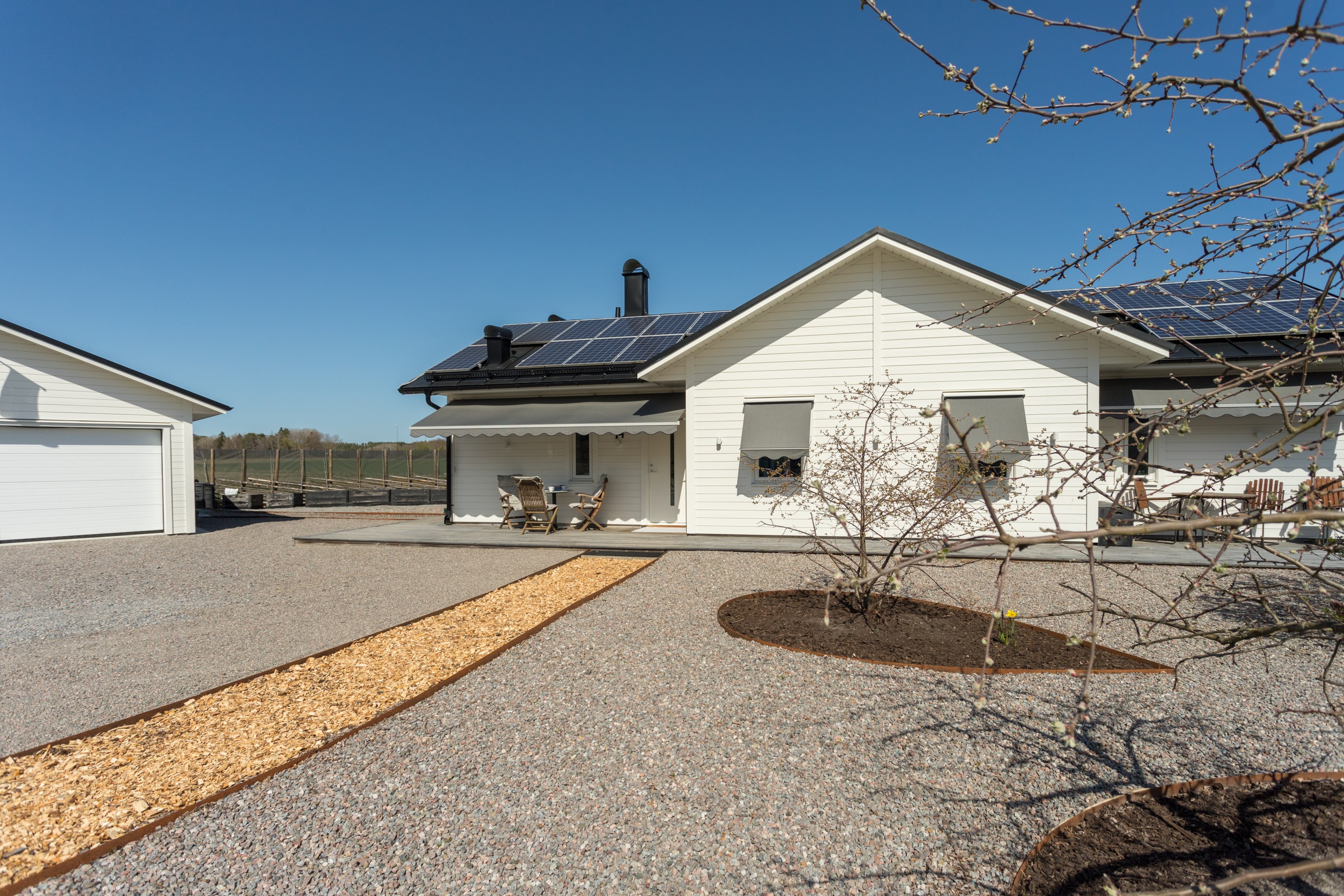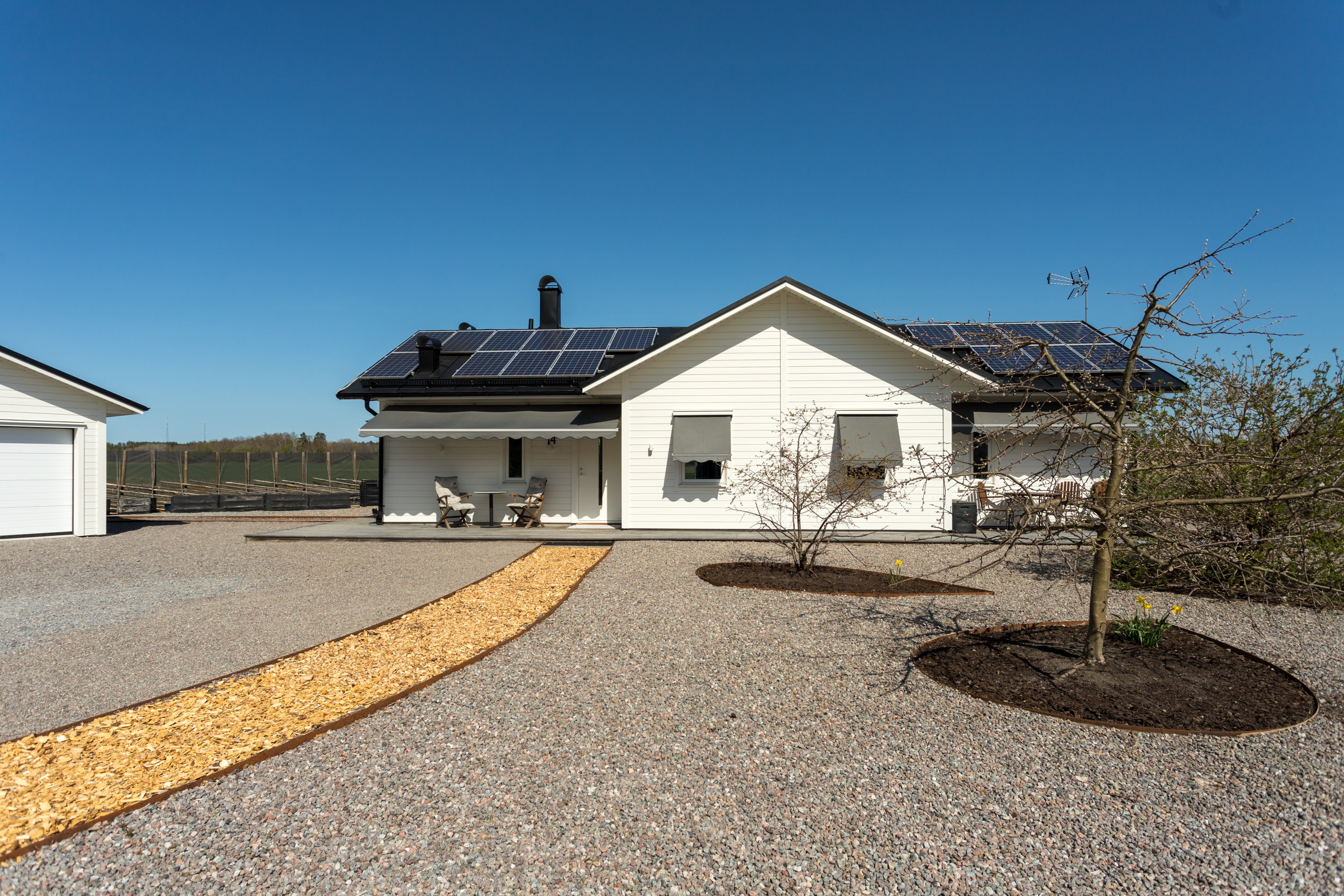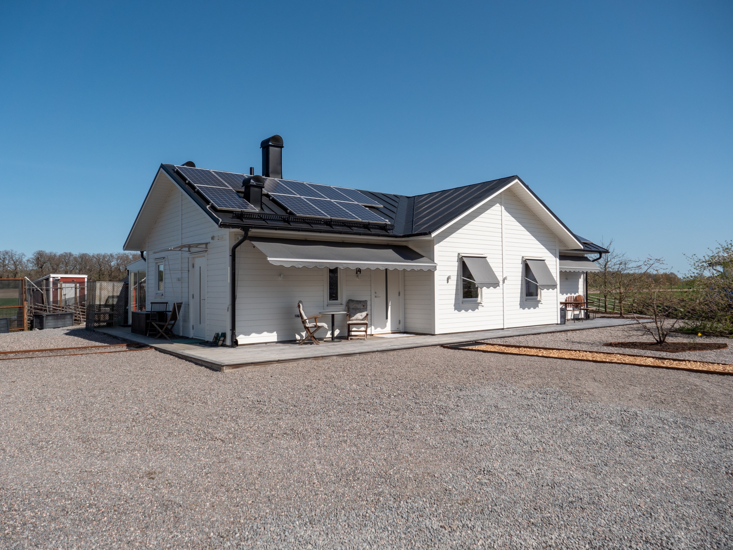 Ett litet detaljplanerat villa område, i jordbruksbygd på Aspö mellan Strängnäs och Enköping! En Gärdesgård runt hela tomten, med gånggrind på fram- och baksidan, samt en 2 delad kör grind i stålkonstruktion. Här kan man verkligen koppla av. Njuta av alla vilda djur! Nästan dagligen kan man se, ute på odlings fälten. Älg, Dovhjort, Rådjur. Inte minst flytt fåglar, som vilar upp sig innan de flyger vidare till Norra Sverige. Bra kikare är värdefullt att ha tillhands, på strategiska platser. Säljaren har varit sin egen ”byggherre” under hela planerings- och byggprocessen, från år 2016 och till inflyttningen juni 2017, för utom ”snickarfärdigt” enligt avtal med Västkustvillan för Trubadur 98. med ytter- och innerväggar. Dubbelgarage, med takskjutsportar. Övriga hantverkare upphandlades separat. Säljaren anlitade lokala, kända och välrekommenderade leverantörer och hantverkare under hela byggprocessen. Endast ”skalet” med ytter- och innerväggar till Trubadur 98 upphandlades. Egen beställning: Alla innerdörrar är skjutdörrar, vilket gör huset lätt möblerat! Klinkergolv i hela huset, med golvvärme, lättstädat! I köksdelen finns en vedeldad Italiensk bakugn, som murats upp på plats. Alla bakredskap ingår i försäljningen. En eluppvärmd handdukshängare finns på höger sida av ugnen, för kökshandduk och disktrasa. Köksinredningen har många finesser, och tillverkat på ett snickeri i Malmköping. Granitbänkar i vinkel, och på köksön med kyl och frysskåp inunder. Frysbox, Kyl o Frysskåp, finns som ”lager” i garaget. Där finns även Avantiskåp för konserver och torra varor. I hygienutrymmet för gäster, har tvättstället rörelse fri vattenarmatur, likaså i stora hygienutrymmet. Förberett för elektronisk bidé. se länk. https://www.facebook.com/svancare/videos/automatisk-bid%25C3%25A9toalett-med-tv%25C3%25A4tt-och-torkfunktion-bidette-r3/282985695702994/?locale=sv_SE Dux Avantis, garderobssystem finns i hall och de två mindre sovrummen. Ingår! I grovingången, ut till garaget, finns vägg-/hyllsystem ELFA, likaså i garaget. Ingår i försäljningen! En c:a 13 kvm. Inglasning finns på baksidan, med öppningsbara glaspartier på 3 sidor. En oljebaserad masonitskiva, som fuktspärr ligger under heltäckningsmattan. Rummet kan rymma upp till 10-12 personer, när man möblerar upp med långbord. Inredningen kan säljas separat! Lägereld, med ”Stor tak” för skydd mot regn och snö, från Haparanda Timber. Sittplatser för upp till 14 personer, med Vind nät, finns framför uterummet. Alla special verktyg, och björkved som finns kvar i 2 dynlådor ingår. Fastigheten förberedd, redan vid planeringsarbetet år 2016, för eventuella kristider! I dubbelgaraget finns det skåp och hyllor, som kan lagra konserver/torra varor samt vatten, som förnyas med regelbundet. En Italiensk vedeldad bakugn, uppmurad på plats, med ved utrymme inunder. Investeringskostnad c:a 35.000:- Lägerelden, från Haparanda Timber, för upp till 14 personer, under tak och med vindskydd. Många redskap för matlagning ingår vid försäljning. Investeringskostnad c:a 50.000:- . Även björkved som finns kvar vid försäljning ingår. Lantbrukare på Aspö kan levererar, 30 cm kluven och torr björkved och kan lagras upp i 2 stora Dyn lådor som ingår vid försäljning.