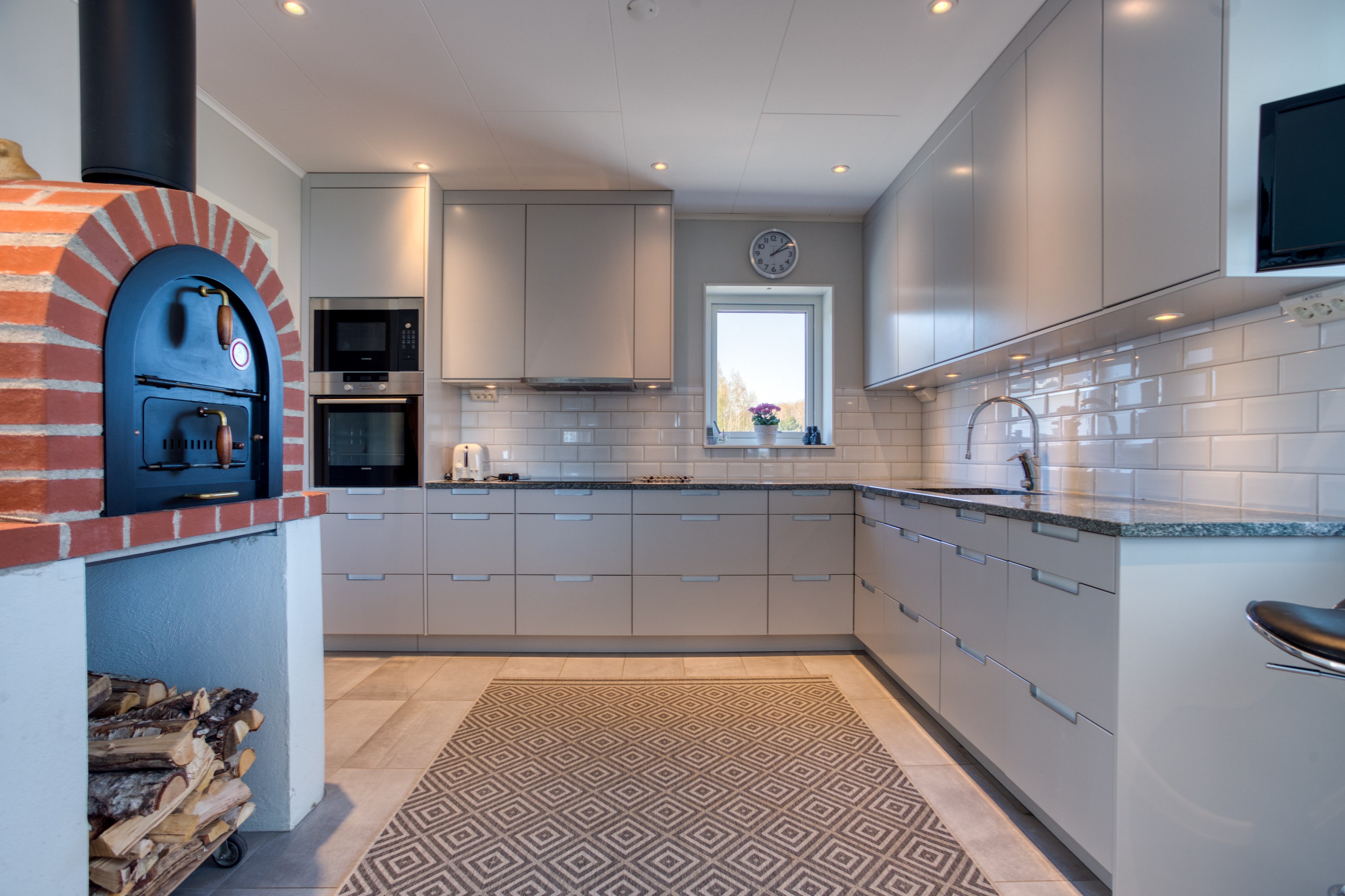 Hjärtat av huset det stora ljusa köket med flera stora fönster som ger ett vackert ljusinsläpp och utgång till altan och granne med åkermark. Matplats för minst 12 personer. Arbetsdel i köket, i mitten en köksö, bra med förvaring och arbetsytor, spis, fläkt och rostfri ho. kyl/frys, varmluftsugn och mikrovågsugn. Diskmaskin , rostfri diskho. Ljust grå köksluckor, vitt kakel över arbetsbänkar som är i granit. I köksdelen finns en vedeldad Italiensk bakugn, som murats upp på plats. ”En eluppvärmd handdukshängare finns på höger sida av fundamentet till ugnen.