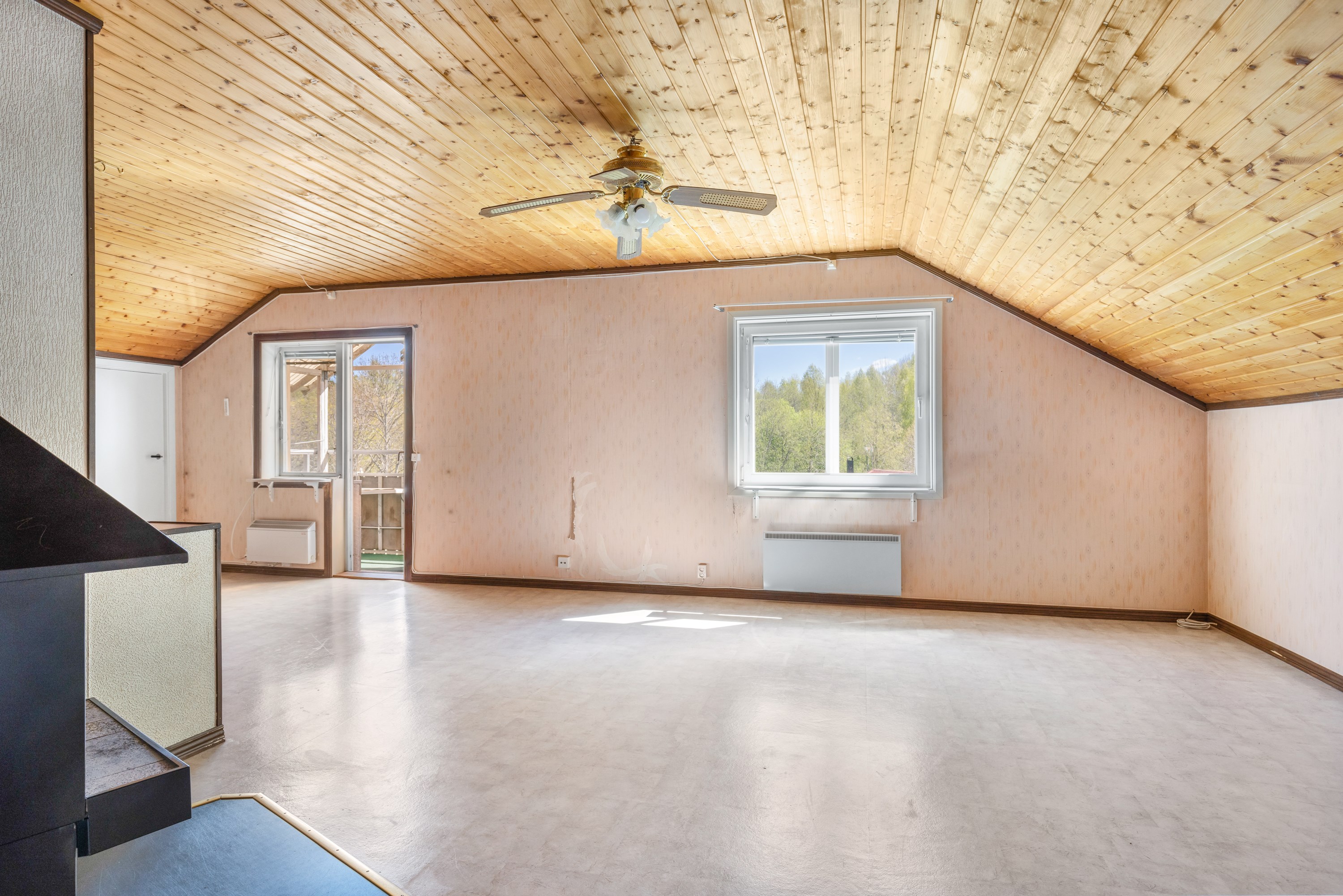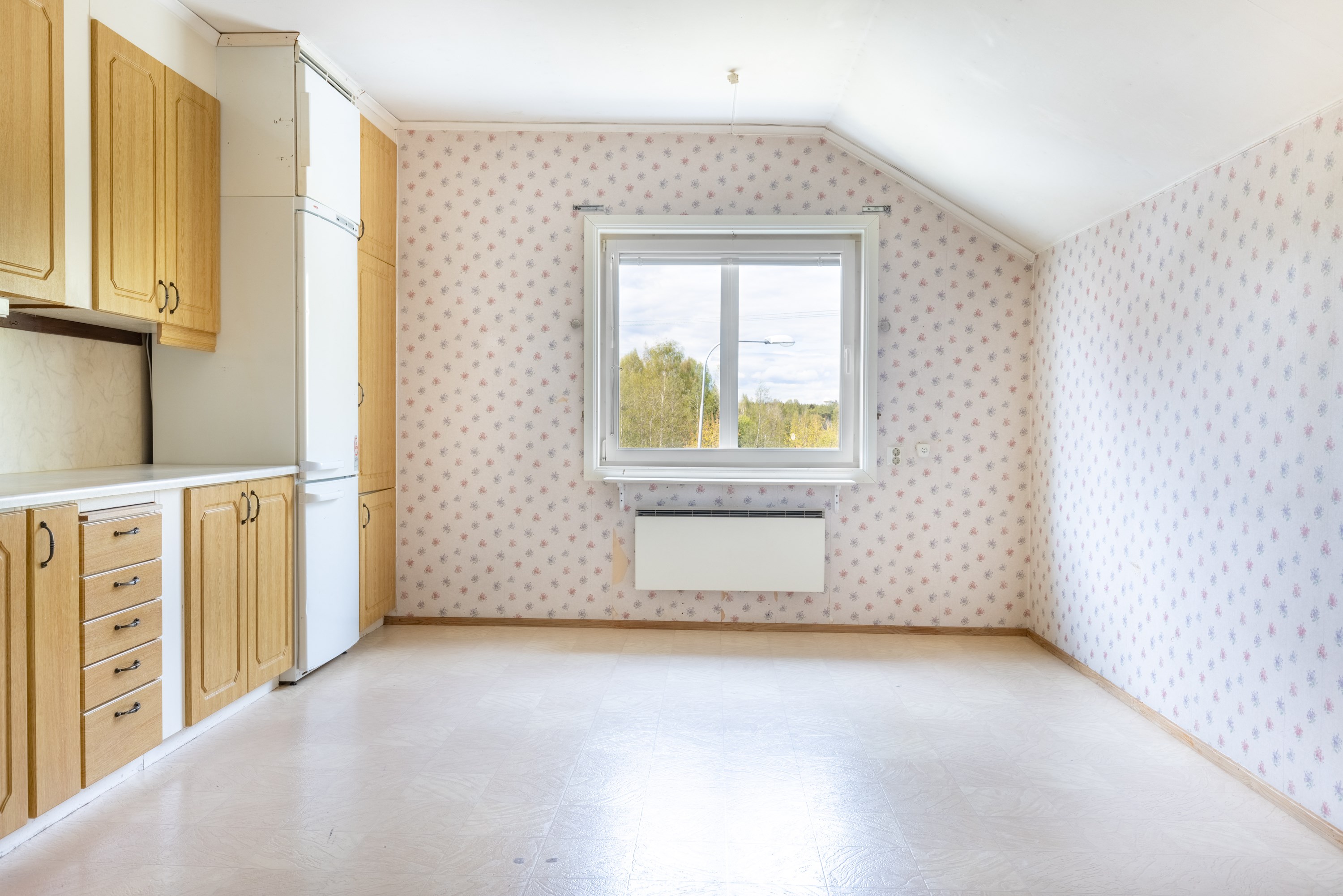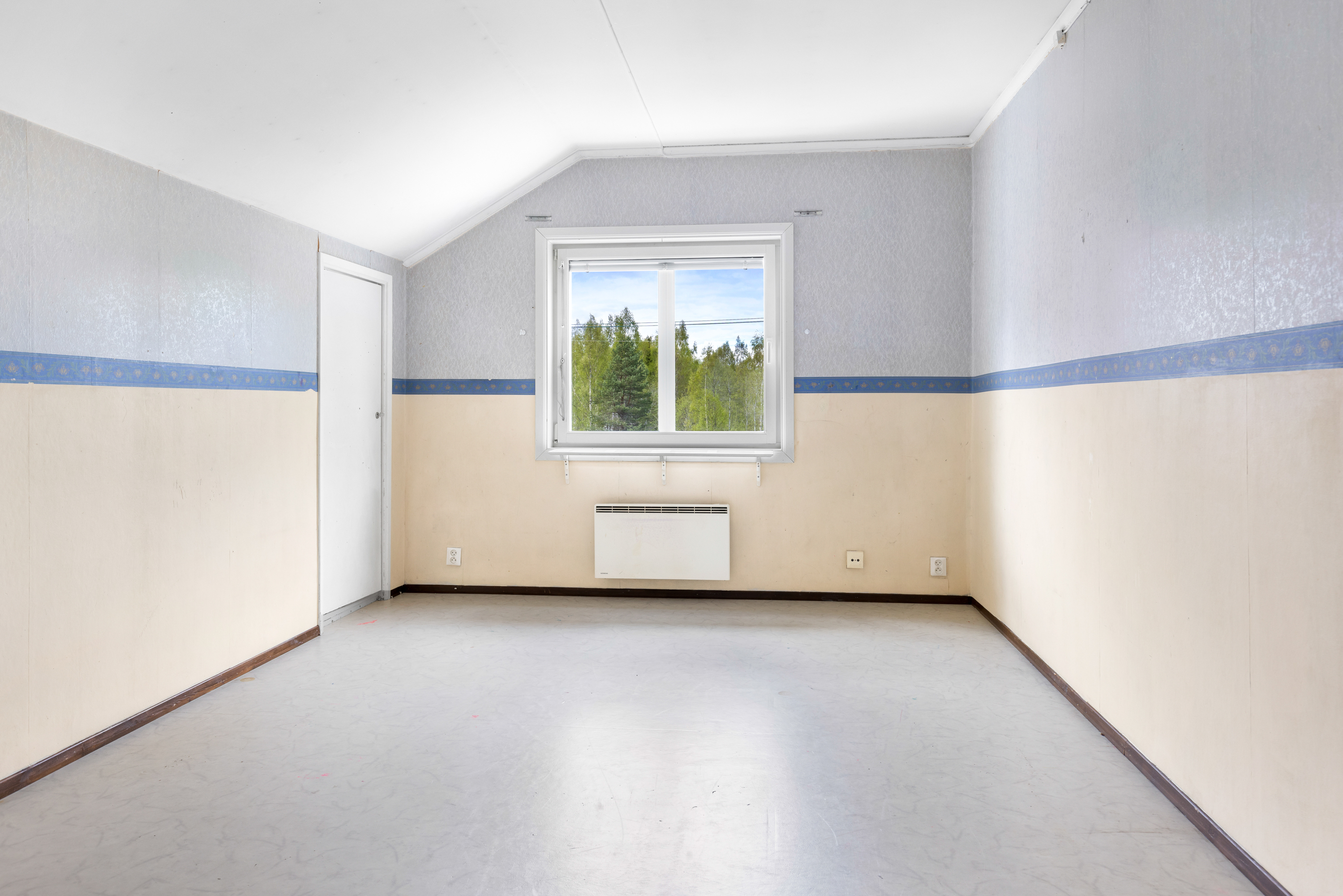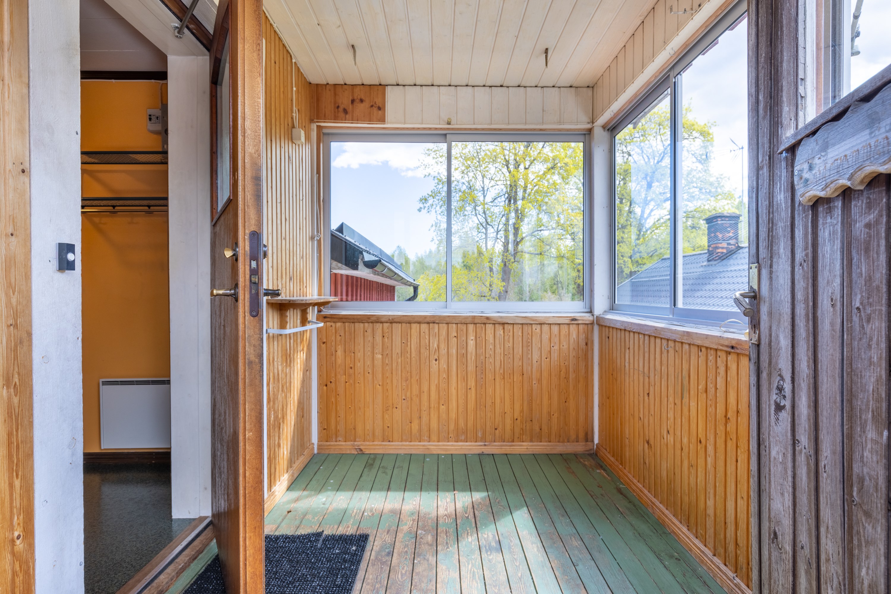 Bostaden på övre plan består av 2 rok och nås via en trapp på utsidan av huset. Entré via inglasad veranda som går vidare in i långsmal hall. Till höger ligger ett stort vardagsrum med kamin, som även skulle kunna delas av för att få ett till sovrum, garderober finns längs ena väggen samt kattvind för extra förvaring. Utgång till balkong. På andra sidan hallen ligger ett sovrum med garderob och kattvind. Vidare kommer man till det rymliga köket som är utrustad med spis (-22), fläkt, kyl/frys. Plats för matgrupp och även här en kattvind för extra förvaring. Badrummet har våtrumsmatta på golv och väggar, tvättmaskin, WC (-22), duschhörna med nyare våtrumsmatta, varmvattenberedare.