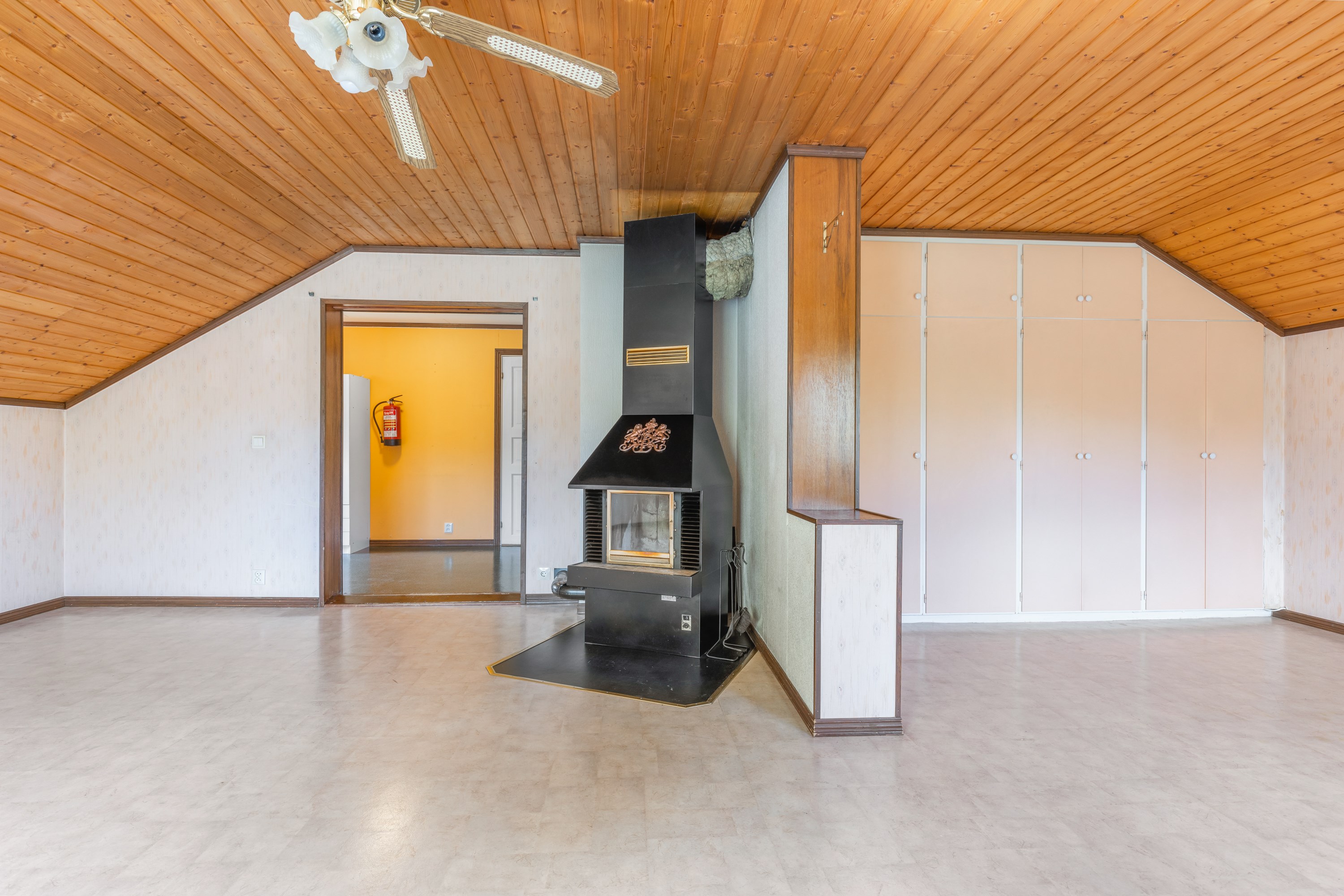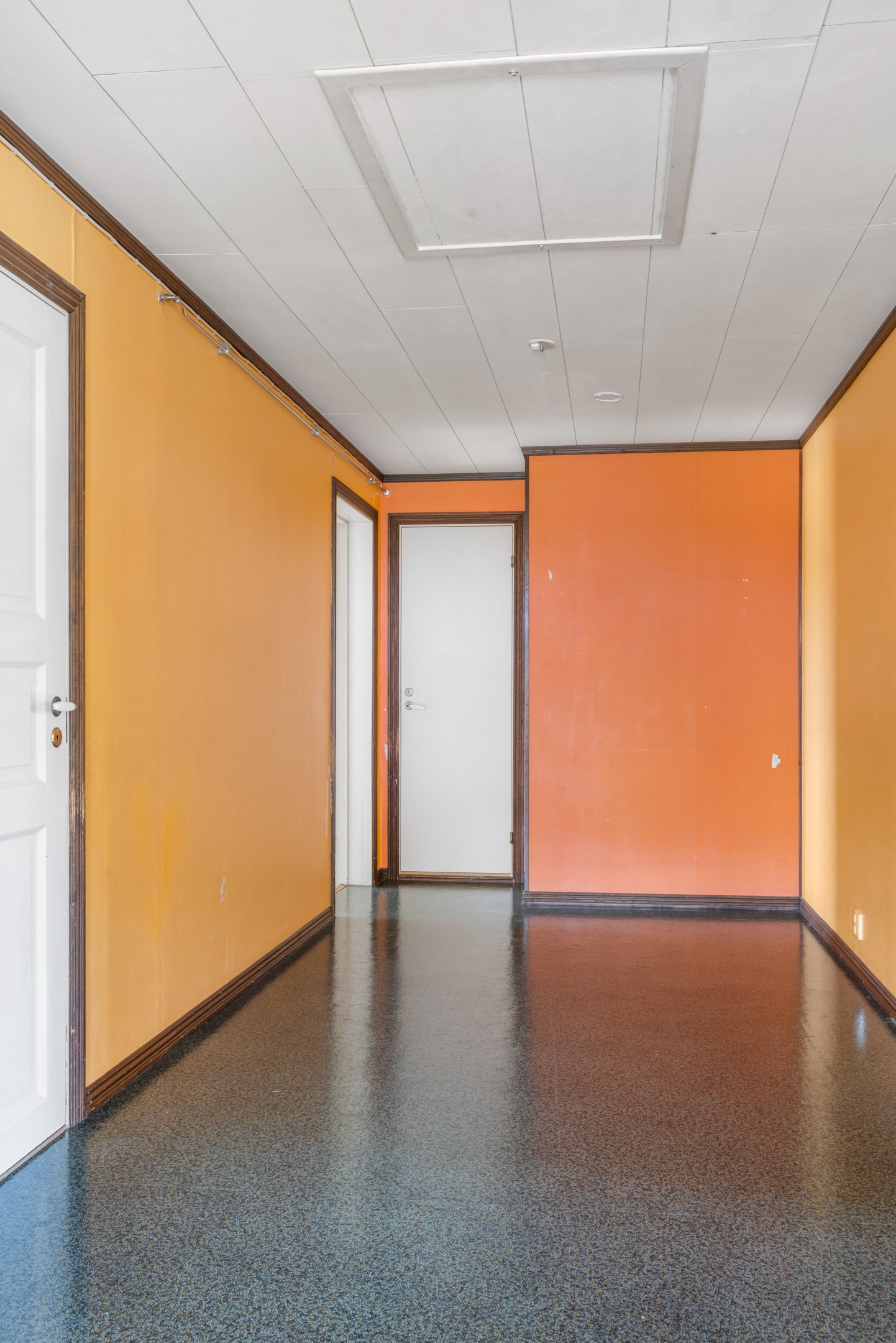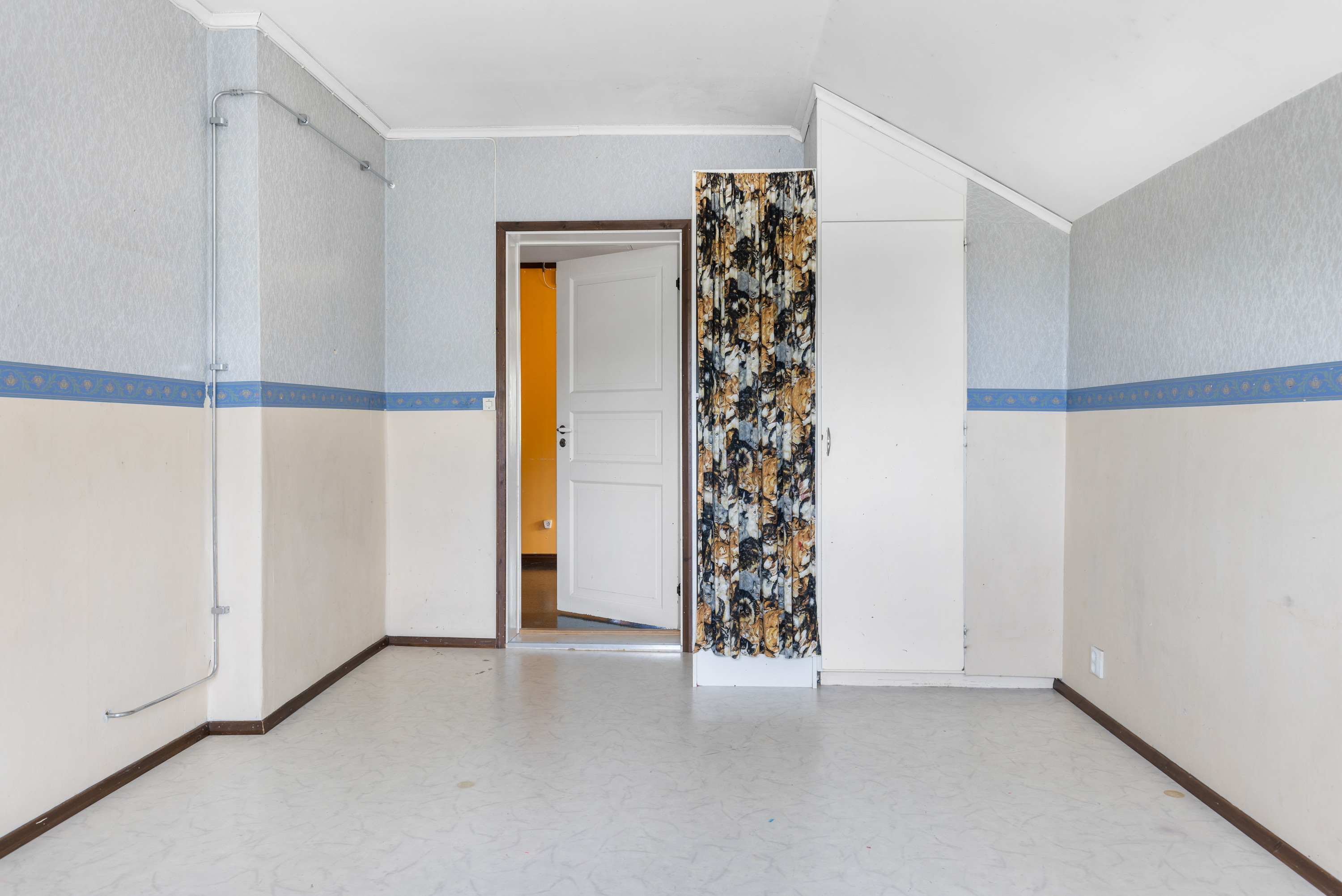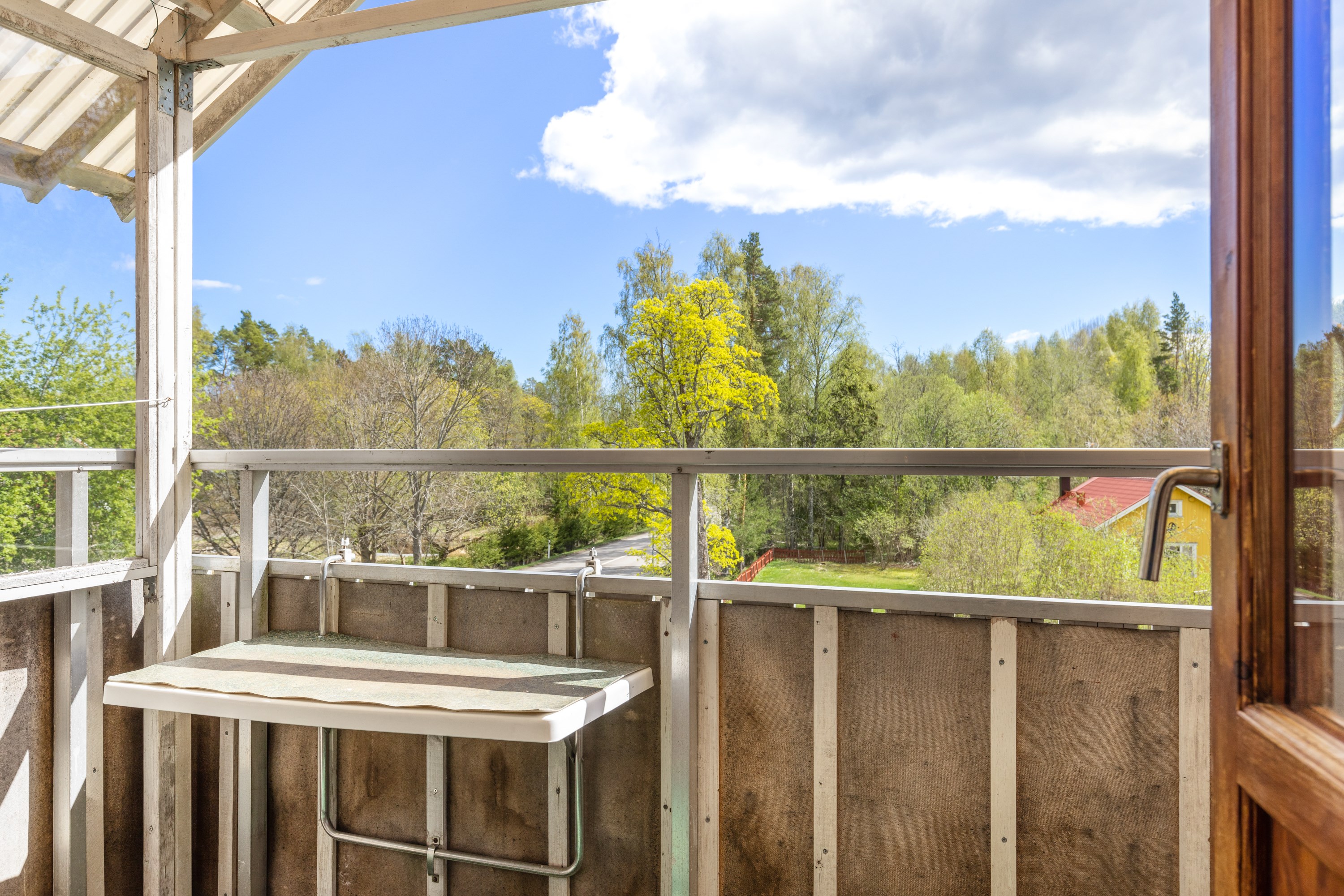 Bostaden på övre plan består av 2 rok och nås via en trapp på utsidan av huset. Entré via inglasad veranda som går vidare in i långsmal hall. Till höger ligger ett stort vardagsrum med kamin, som även skulle kunna delas av för att få ett till sovrum, garderober finns längs ena väggen samt kattvind för extra förvaring. Utgång till balkong. På andra sidan hallen ligger ett sovrum med garderob och kattvind. Vidare kommer man till det rymliga köket som är utrustad med spis (-22), fläkt, kyl/frys. Plats för matgrupp och även här en kattvind för extra förvaring. Badrummet har våtrumsmatta på golv och väggar, tvättmaskin, WC (-22), duschhörna med nyare våtrumsmatta, varmvattenberedare.