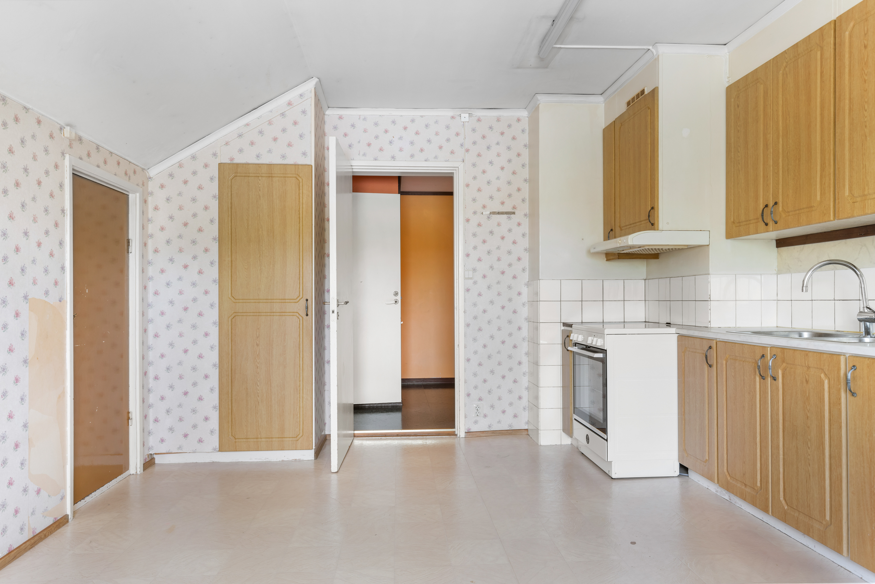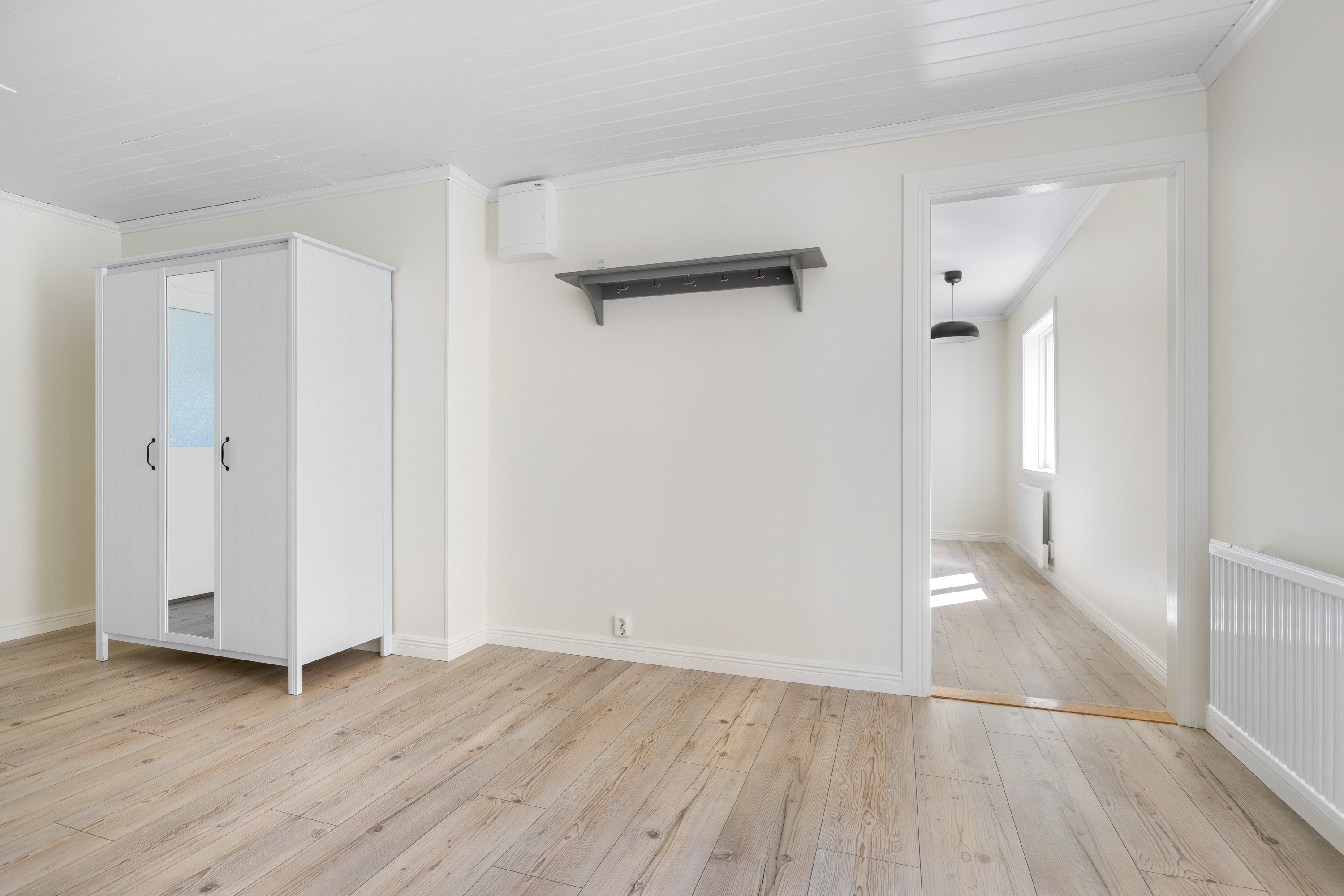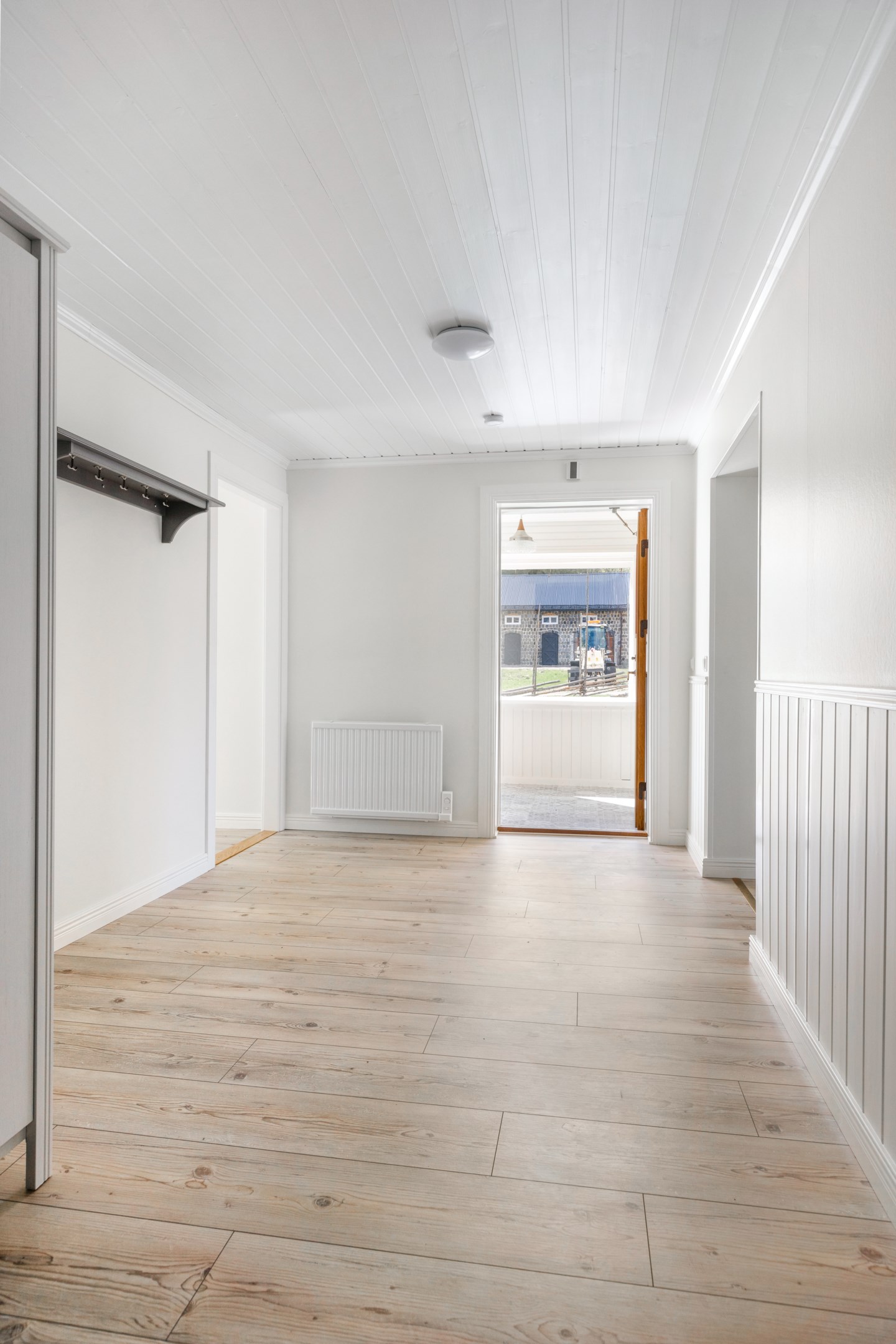 Helrenoverad, ljus och fräsch bostad om 3 rok. Ingång via farstukvist med plats för klädavhängning och skor som leder vidare till inre hall. I slutet av hallen ligger badrum med dusch, tvättmaskin, WC, varmvattenberedare. Till höger från hallen ligger kök som är utrustat med kyl/frys, spis, fläkt, diskmaskin och har plats för matbord. Innanför köket ligger ett av sovrummen som har garderober och plats för dubbelsäng. Åt andra hållet från entrén ligger ett lättmöblerat vardagsrum med kamin och ytterligare ett sovrum med garderobsvägg och även här plats för dubbelsäng. Genomgående har den här lägenheten renoverats under 2020 och har stilrena material och färgval, samtliga vitvaror byttes 2020.