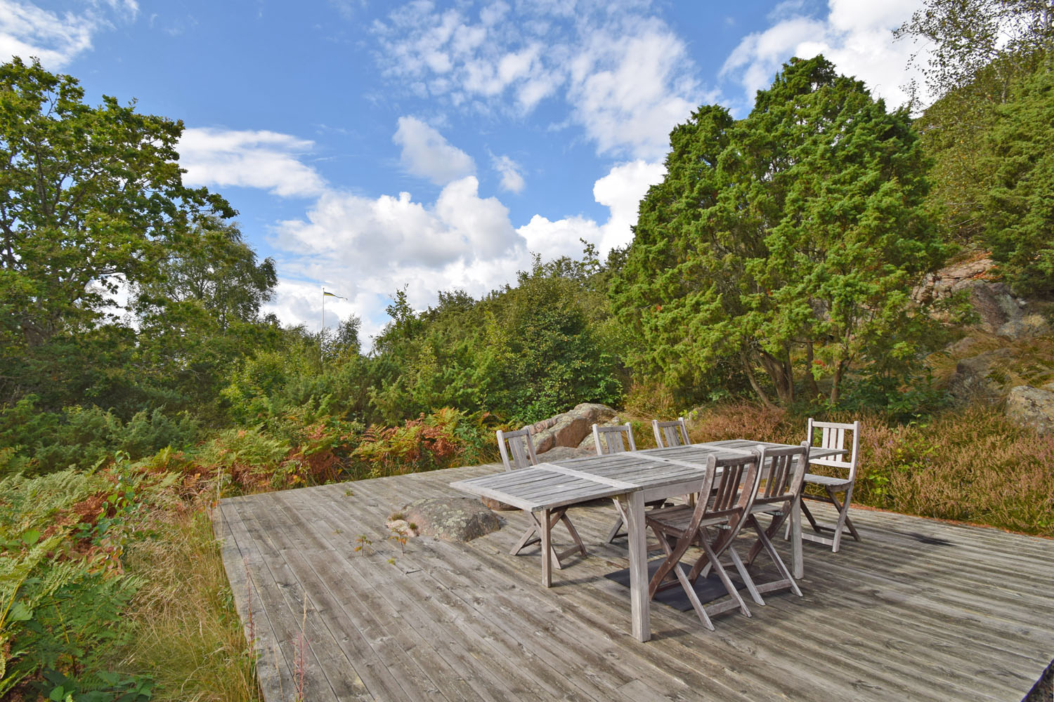 Tomten består av en kombination av naturtomt och gräsmatta. Den rymliga och välskötta trädgården rymmer både plan gräsyta, en flaggstång och naturliga nivåskillnader med berg i dagen som lyfter fram områdets karaktär. Det finns gott om plats för både avkoppling, rekreation och olika aktiviteter. Bostaden erbjuder dessutom uteplatser på både fram- och baksida, vilket ger sol hela dagen. Från bergsplatån får man en härlig utsikt och en påtaglig känsla av närheten till havet. Tomten erbjuder fina möjligheter för den som önskar utveckla den vidare med fler planteringar, träd, buskar eller odlingar.