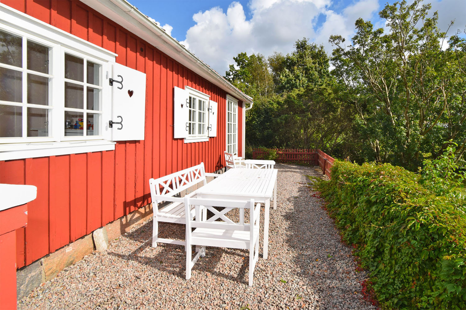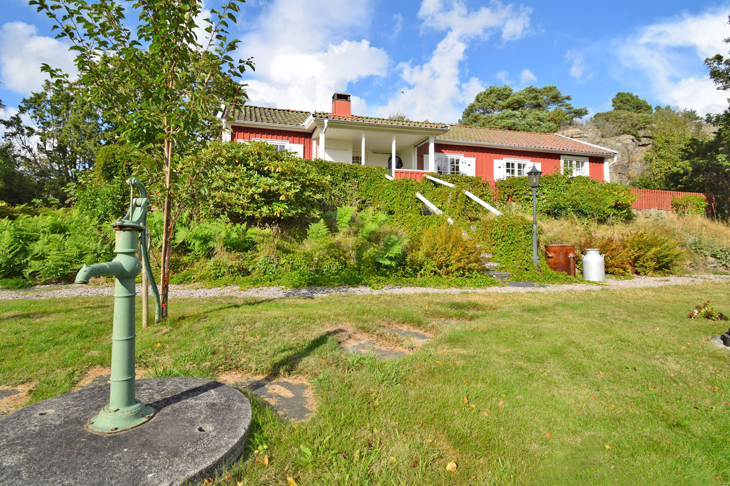 En bevarad och genuin stentrappa leder upp till bostaden och den välkomnande verandan. Här finns en inbjudande sittplats – perfekt för morgonkaffet. Verandans infravärmen gör den användbar från tidig vår till sen höst. En grusad gång löper utmed hela huset och ramas in av häckar och grönska, medan trädgårdsbelysning vid grind, ingång och stentrappa skapar trygghet och stämning även när mörkret faller. Den vitmålade verandan, prydd med snickarglädje och fönsterluckor med hjärtan, ger ett charmigt och varmt första intryck – en känsla som för tankarna till Astrid Lindgrens värld. Bostadens rödmålade träpanel med vita knutar samt hängrännor och stuprör i vit plåt förstärker denna idylliska atmosfär. Här bor man i ett hem fyllt av omtanke, värme – och plats för både lek och skratt.