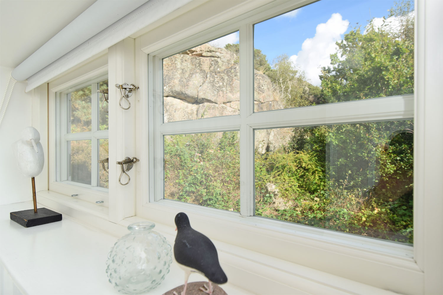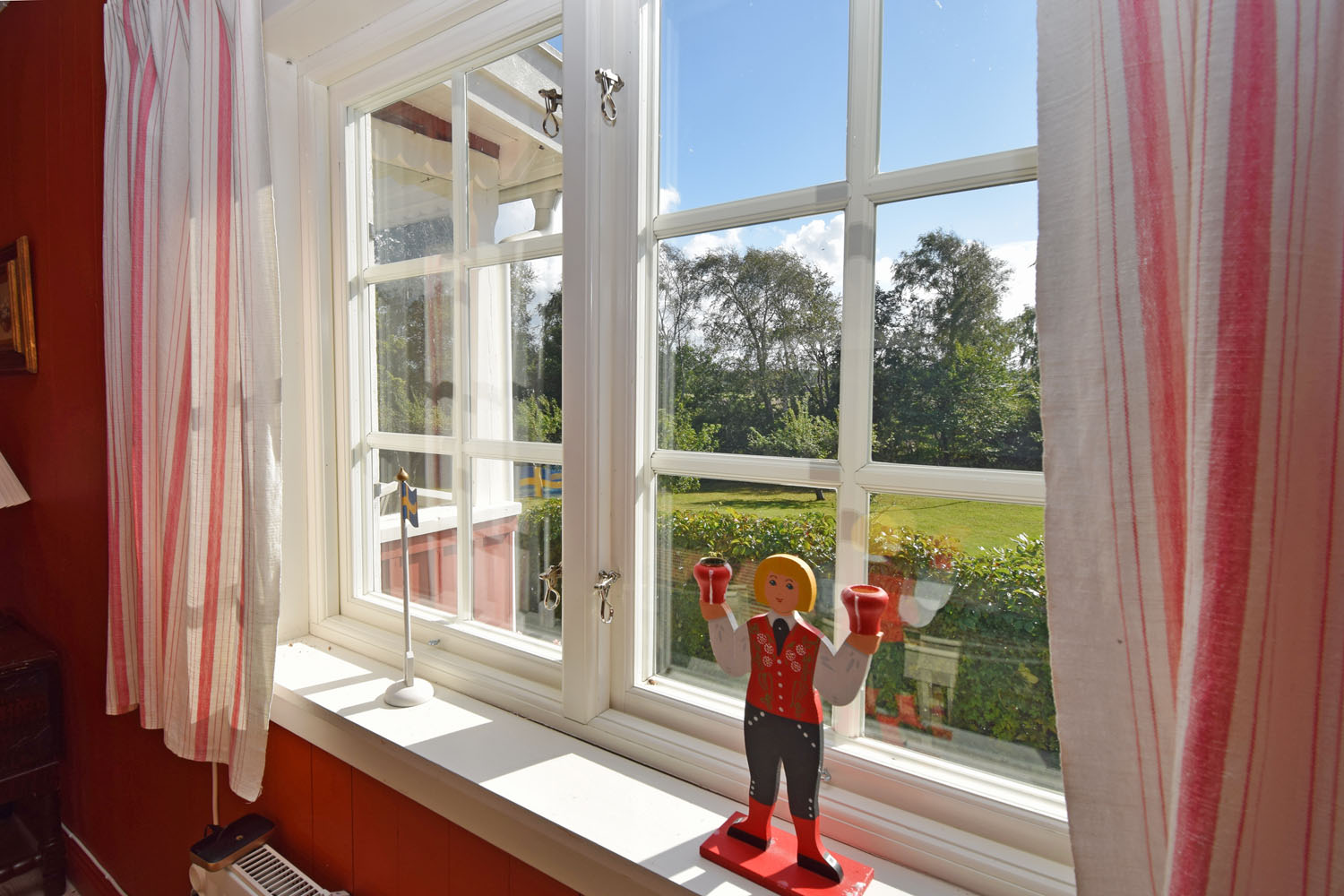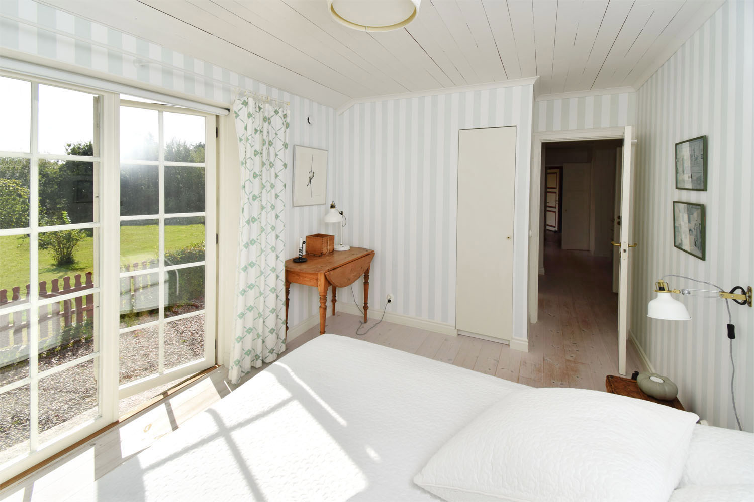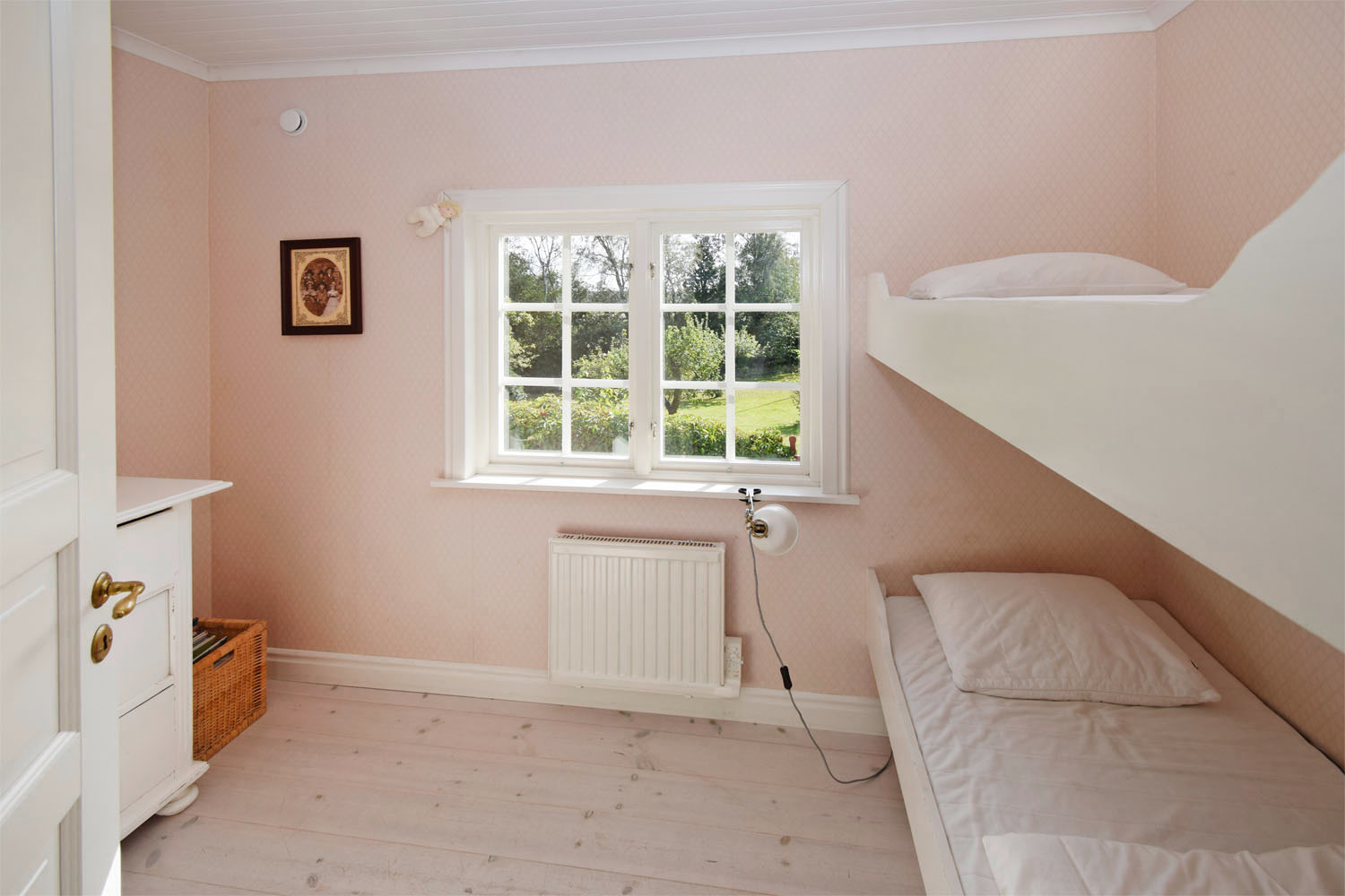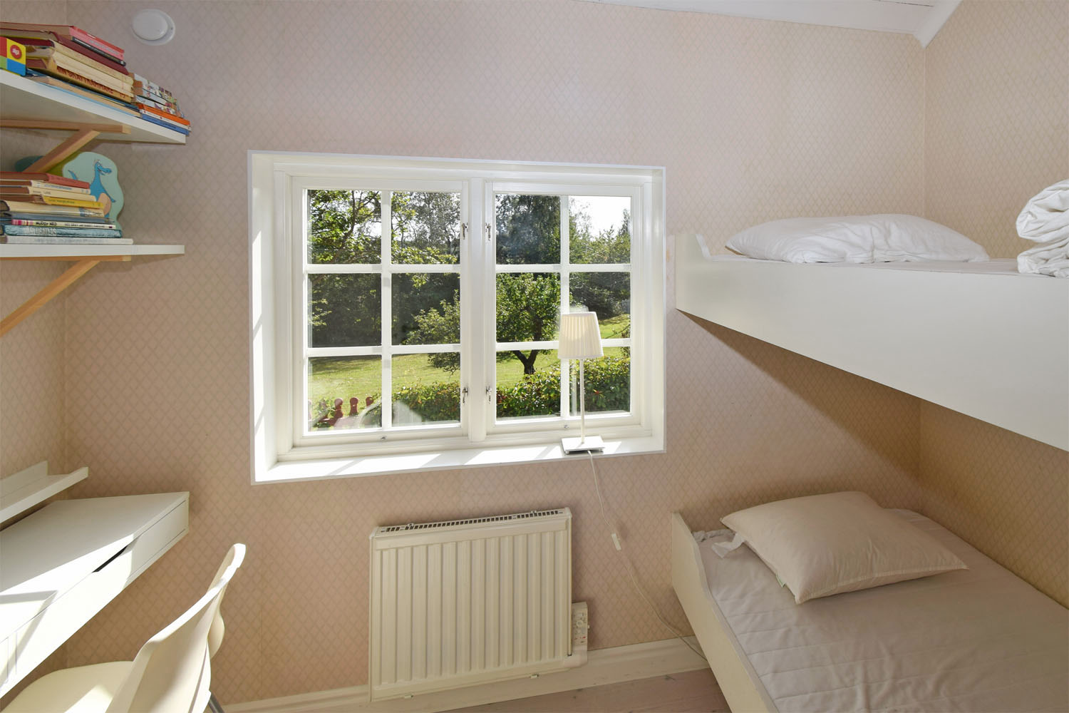 Vitmålade takstolar och tak i övrigt. Snedtak med lågt i tak. Fönster ut mot trädgården.