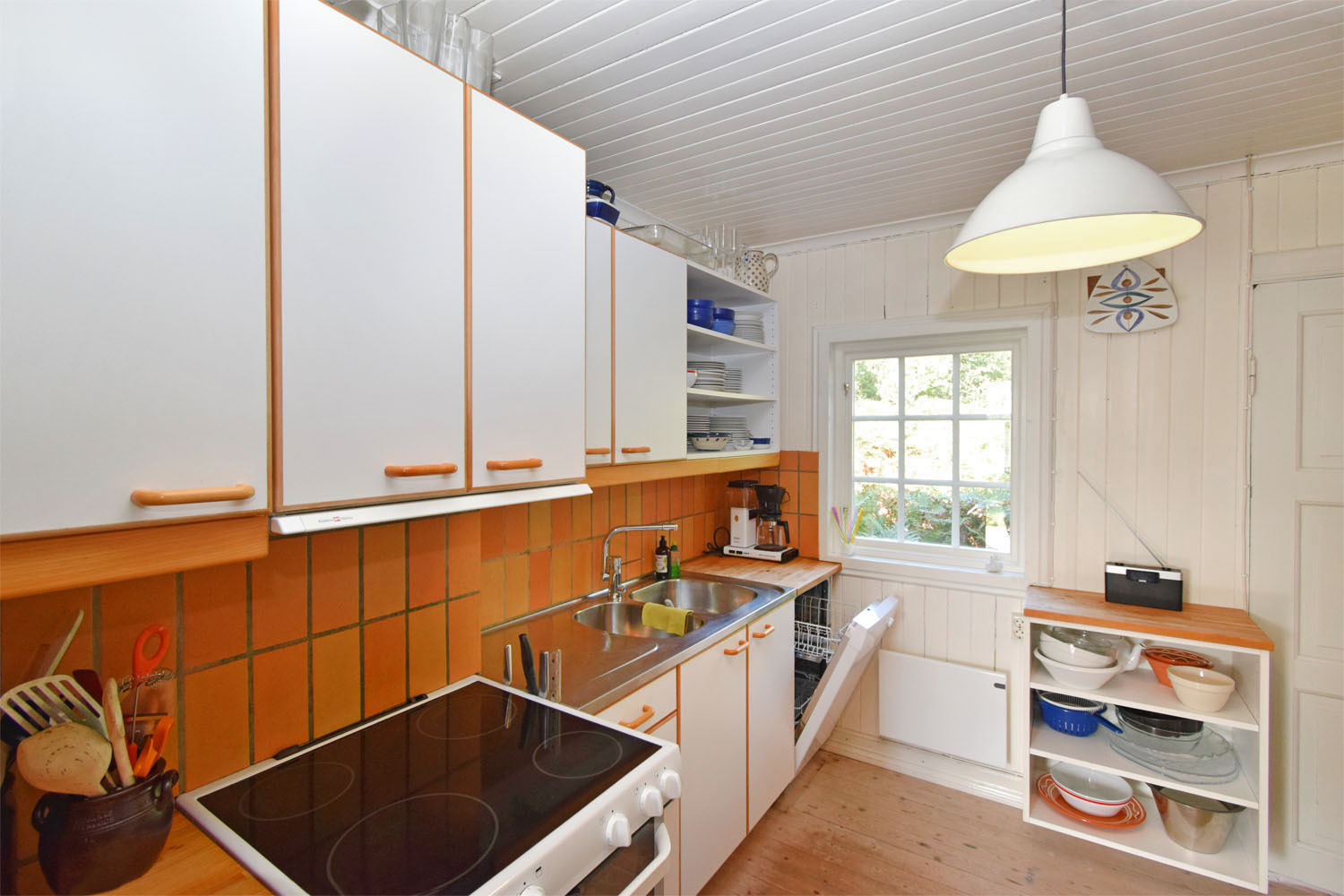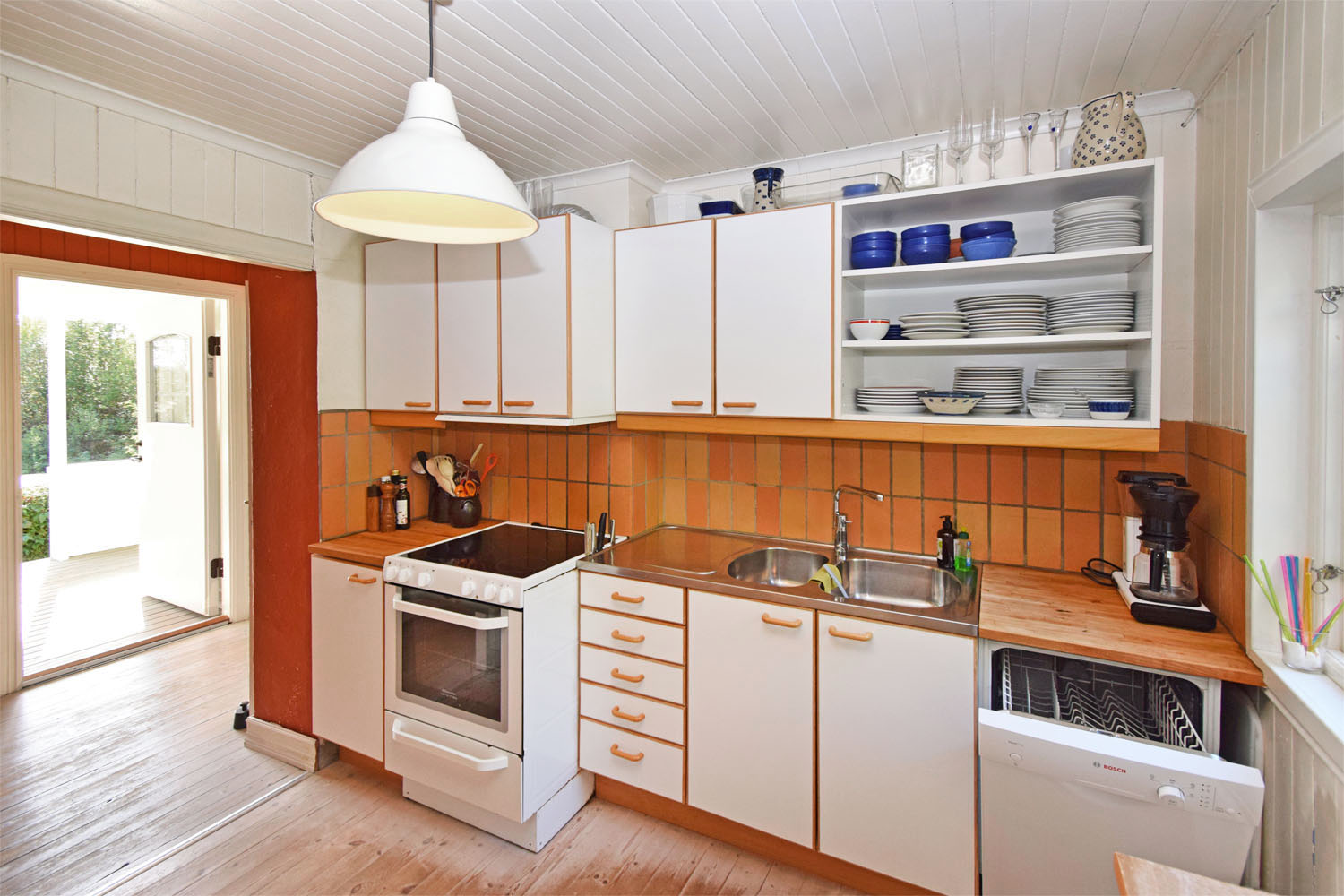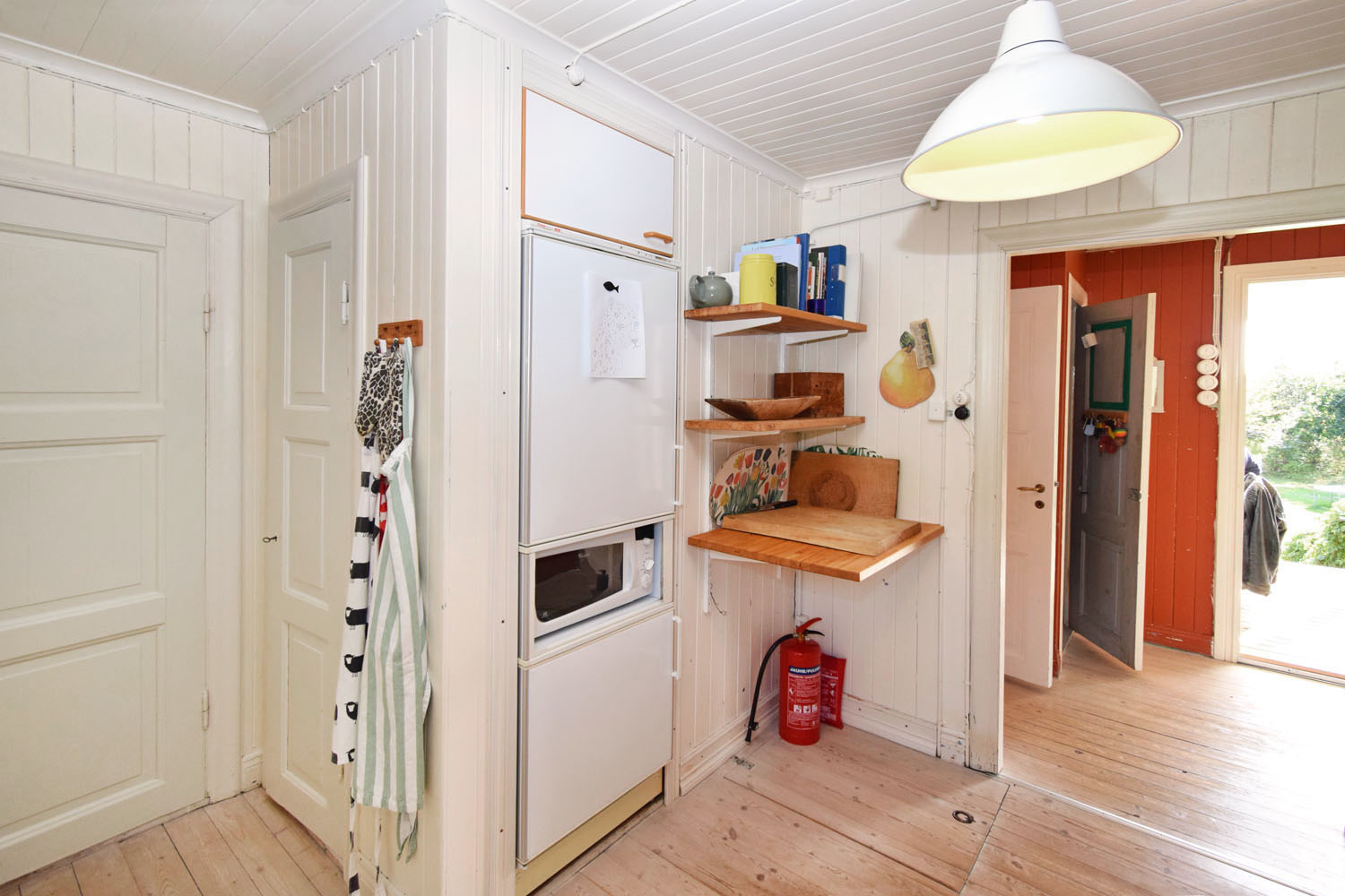 I direkt anslutning till hallen ligger det lantliga köket med överskåp med vita luckor och underskåp. Vit målad stående träpanel med diskbänk och 2 hovar. Inbyggd diskmaskin, spis och spisfläkt samt inbyggd kyl och frys samt mikro..