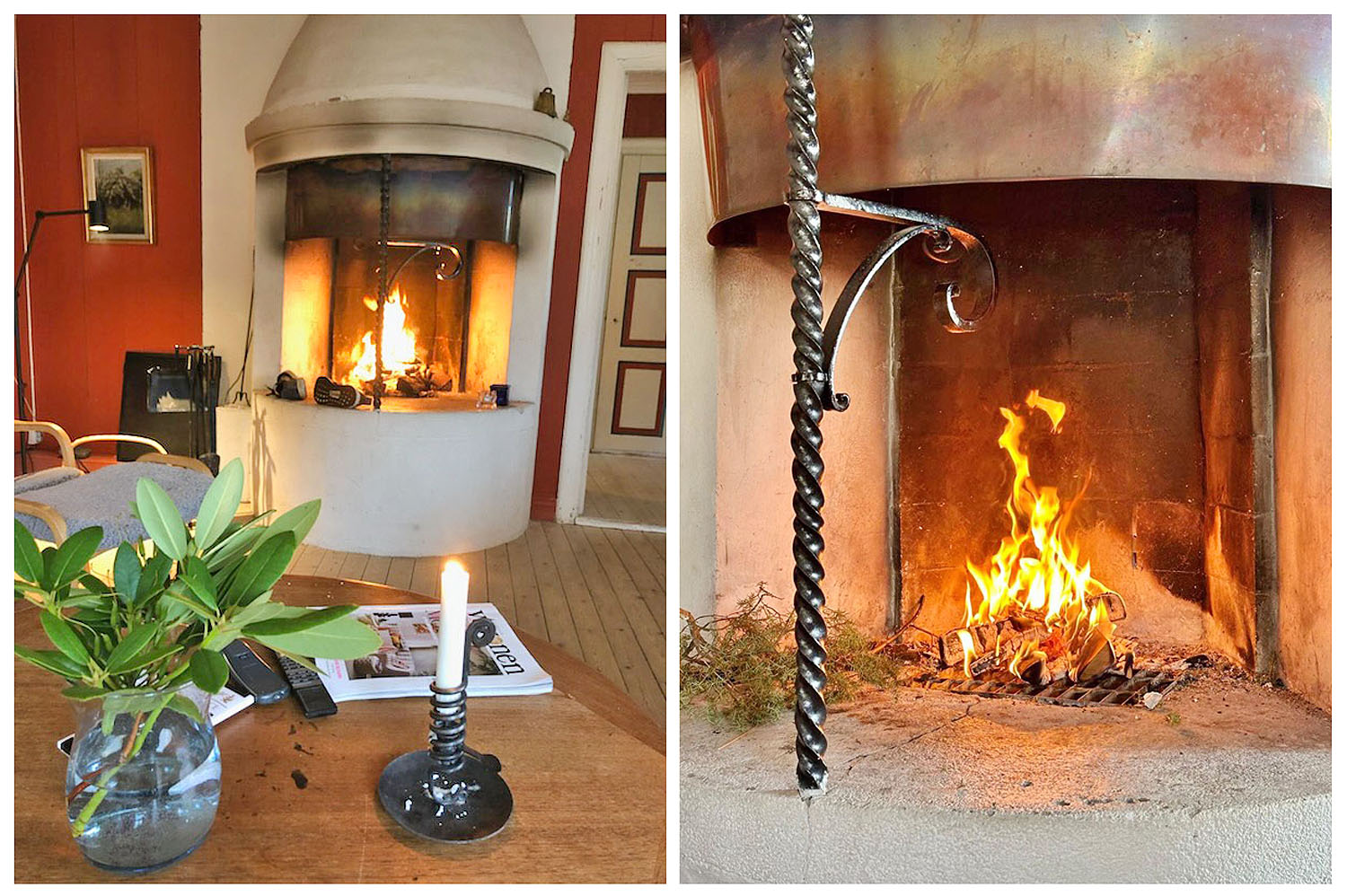 Rymligt och ljust vardagsrum som bjuder in till både större sammankomster, middagar och avkopplande stunder med familj och vänner. Med sina generösa 29 kvm golvyta skapar rummet gott om plats för både matbord, soffgrupp och tv-hörna. De två charmiga sovalkoverna förstärker den hemtrevliga känslan och uppskattas av såväl yngre som äldre. Den pampiga öppna spisen utgör rummets självklara mittpunkt – vitmurad med bevarad murstock och en naturlig samlingsplats året runt, oavsett väder och årstid. Rummets karaktär fångas av de rödmålade väggarna i stående träpanel, i vacker kontrast till de vitmålade bjälkarna och snedtaket. Det ger en varm, genuin och inbjudande atmosfär som passar många olika stilar. Sovalkovernas blå detaljer och vitmålade insidor förstärker uttrycket av ett hem med omsorg, historia och själ.