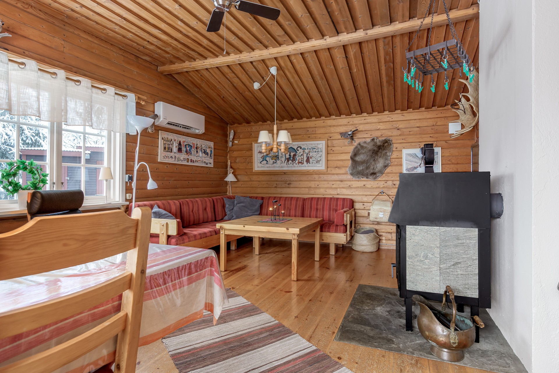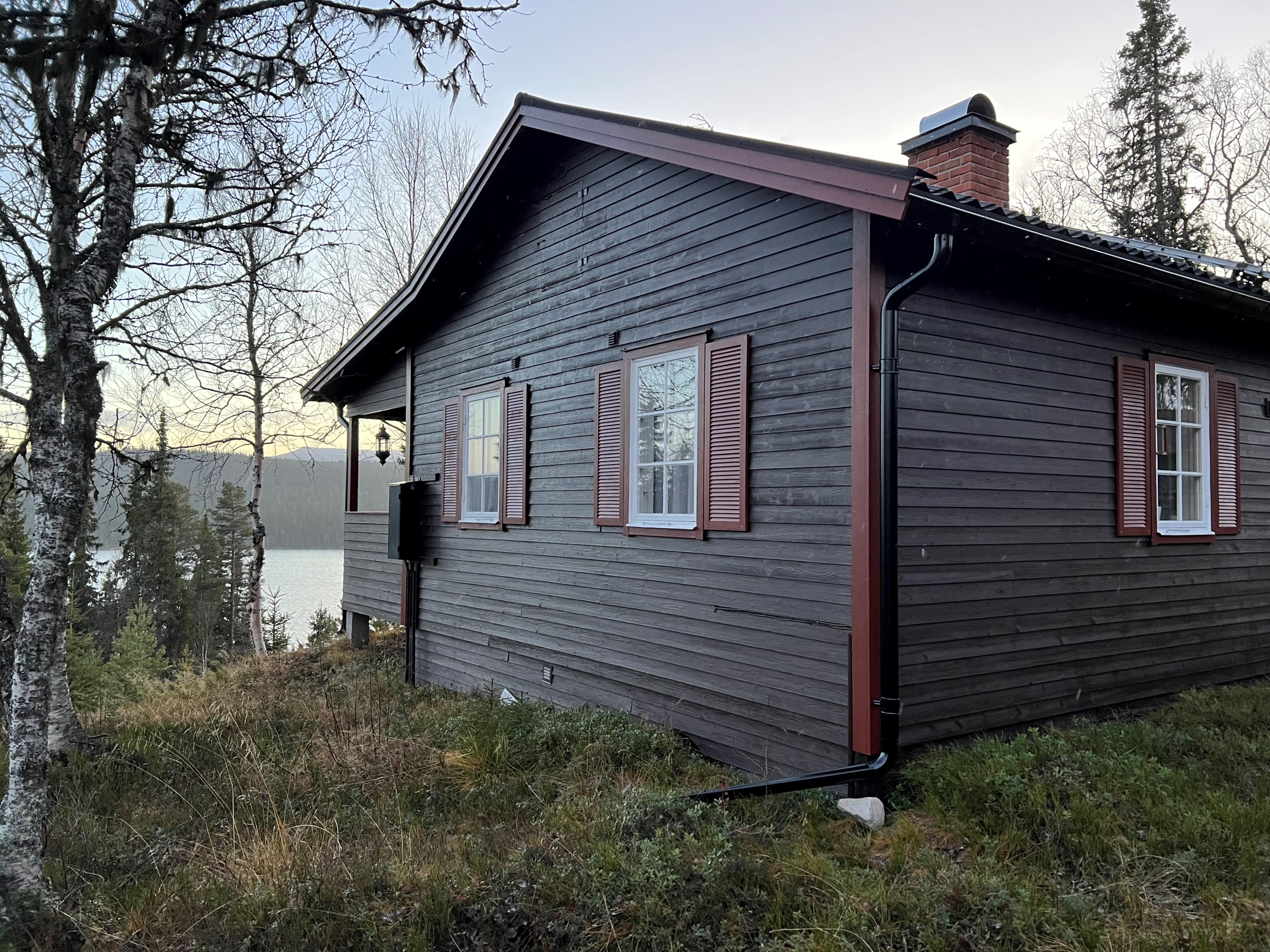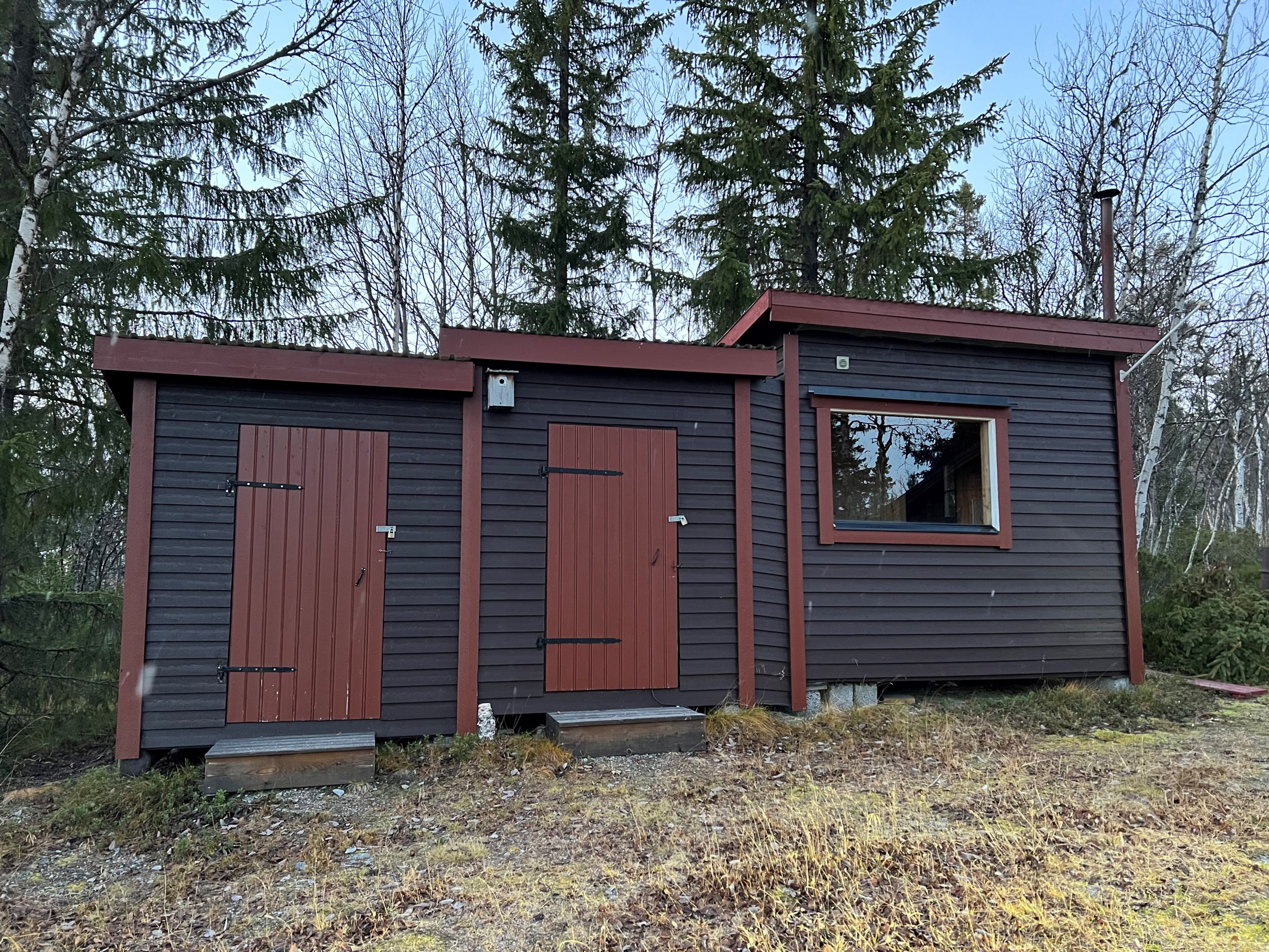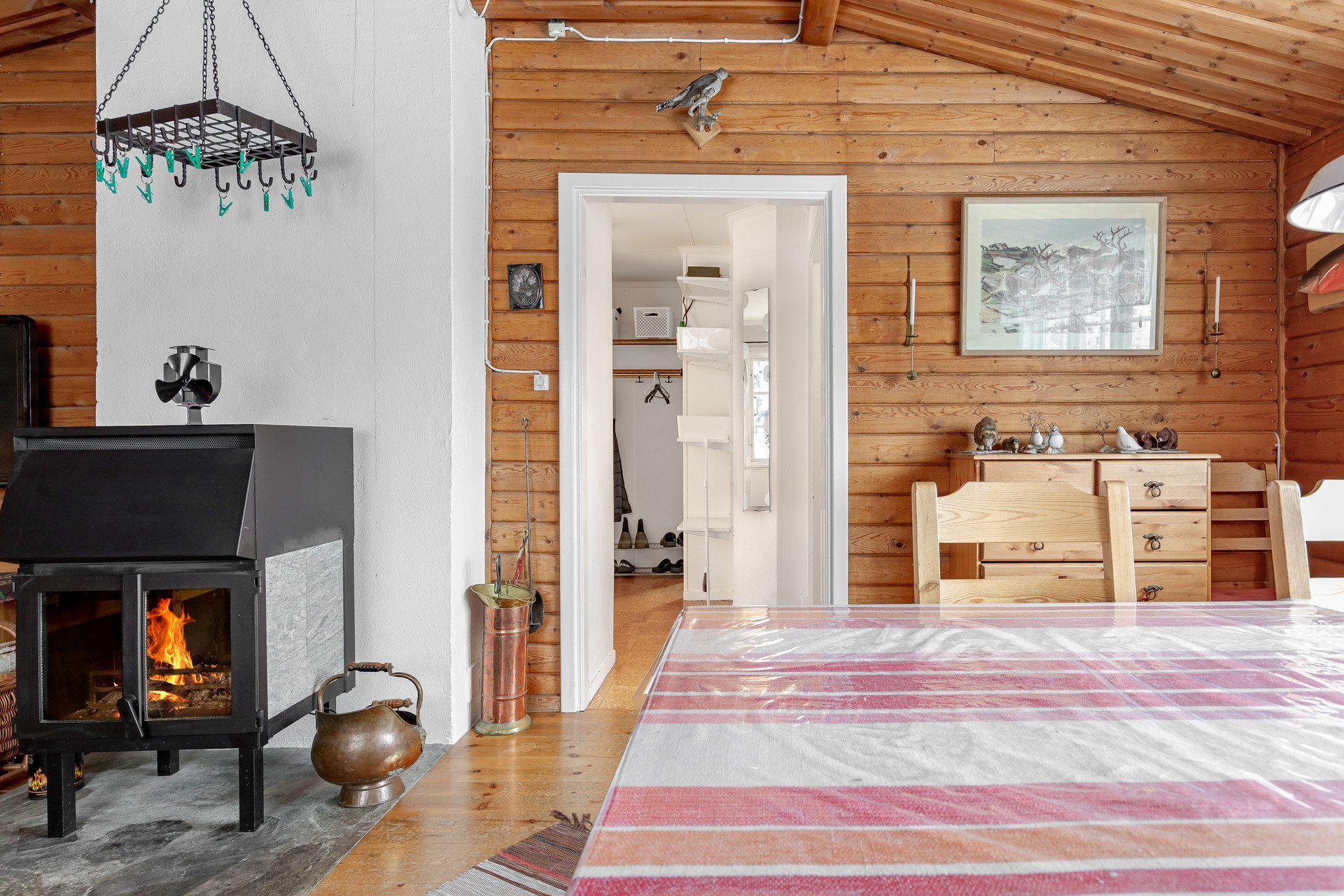 INTERIÖR HUVUDBYGGNAD: Hallrum med ingång till badrum direkt till höger. Plats för kläder och ytterskor finns både i hallen och längre in i huset mellan sovrummen. Hallen har korkmatta på golv, målad väv på väggar och målade skivor i tak. Badrummet inrymmer dusch med draperi, handfat, wc och varmvattenberedare. Plastmatta på golv och väggar samt målade skivor i tak. Rakt fram från hallen finns köket med bänkar på vardera sida om fönstret längst in. Här finns vedspis, elektrisk spis med 2 plattor och ugn, köksfläkt, kylskåp samt frys. Rostfri diskbänk med 2 hoar samt kakel ovanför arbetsbänken. Korkmatta på golv, målad väv på väggar och målade skivor i tak. Till vänster om hallen finns vardagsrum med hörnsoffa samt matplats för 4-6 personer. Ovanför soffan finns en luft-luftvärmepump från 2020 installerad. En stor braskamin står direkt till höger om ingången till rummet. Fönster i två väderstreck ger ett fint ljusinsläpp och utsikten från matbordet tröttnar man inte på. Här syns Blåstöten rakt fram och sjön nedanför sluttningen framför huset. Rummet har också ett sadeltak vilket gör känslan lite större. Trägolv, träpanel på väggar och i tak. Den högra delen av huset består av två identiska sovrum med våningssäng i vardera rum. Mellan rummen finns en förlängning av hallen där kläder och skor får sin naturliga plats. Sovrummen har trägolv, målad väv på väggar och målade skivor i tak. Båda sovrummen har också dubbla garderober.
