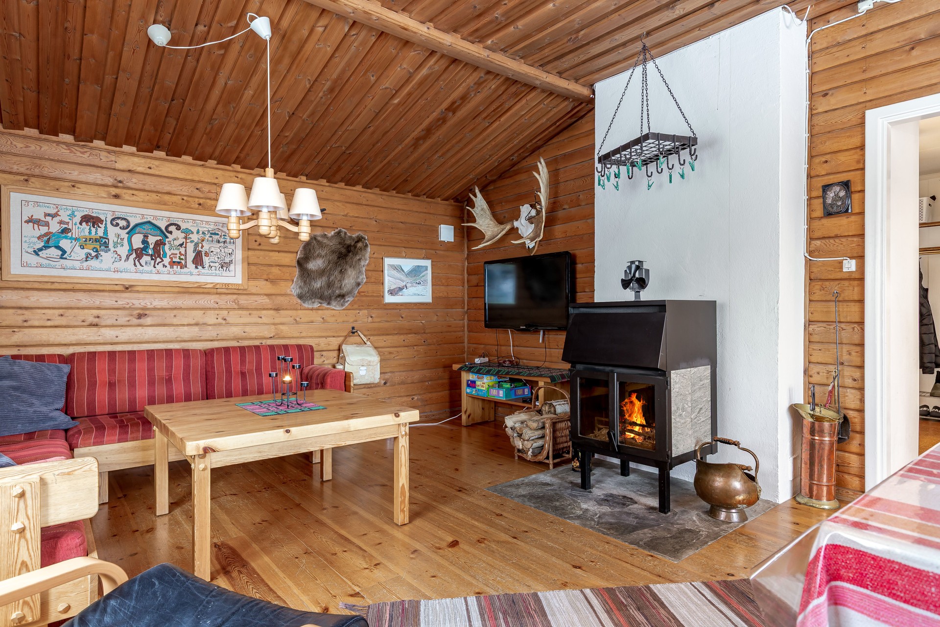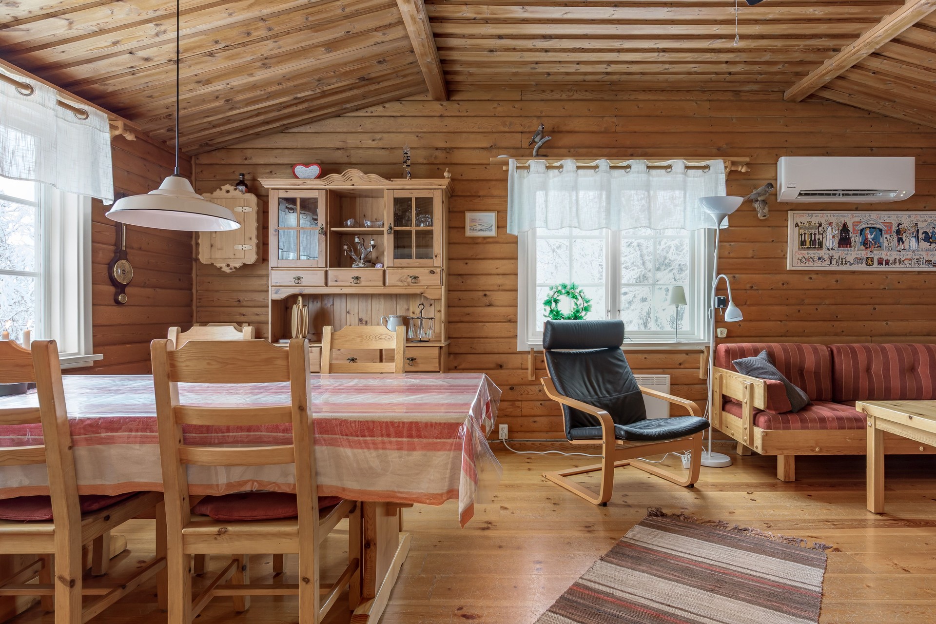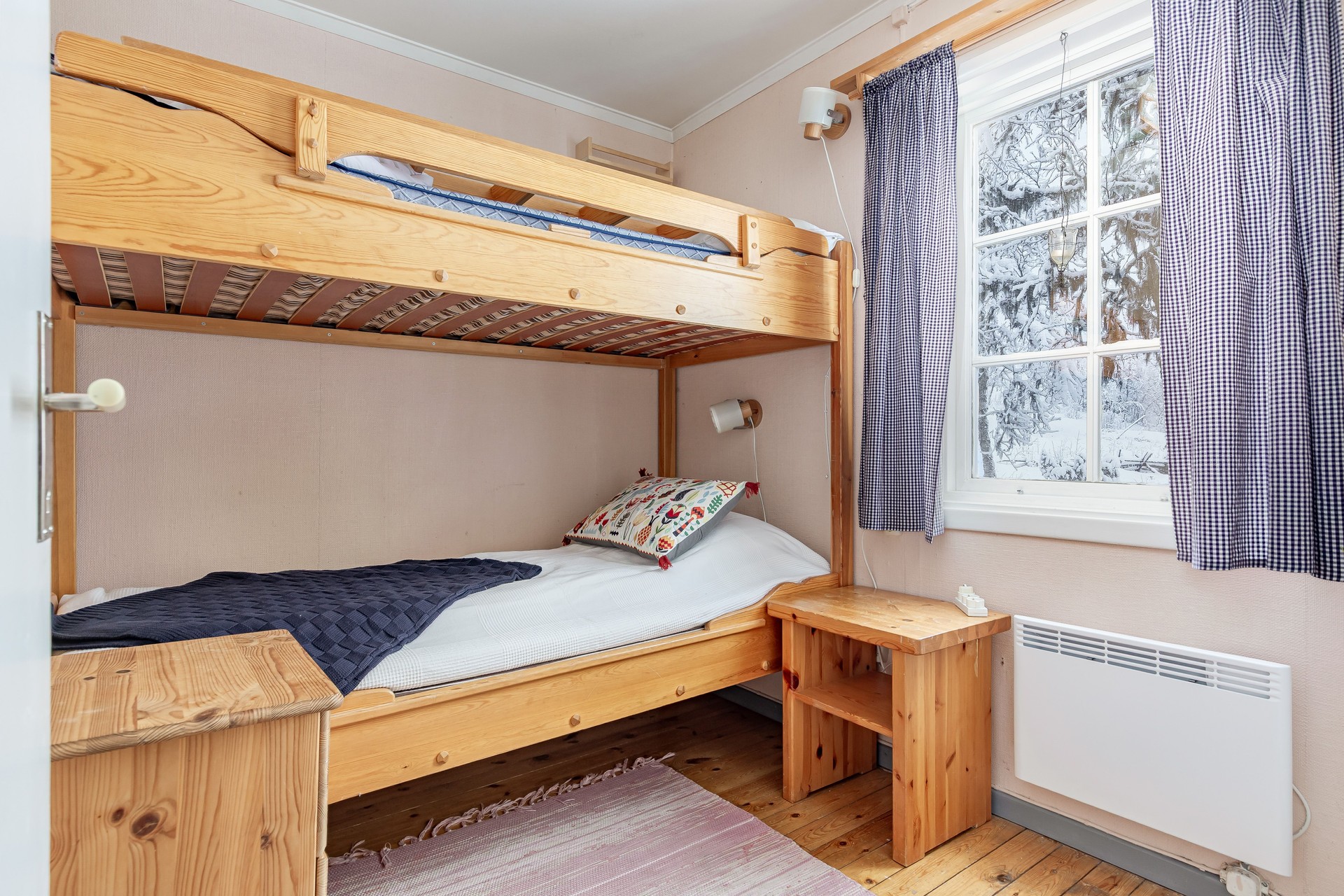 INTERIÖR HUVUDBYGGNAD: Hallrum med ingång till badrum direkt till höger. Plats för kläder och ytterskor finns både i hallen och längre in i huset mellan sovrummen. Hallen har korkmatta på golv, målad väv på väggar och målade skivor i tak. Badrummet inrymmer dusch med draperi, handfat, wc och varmvattenberedare. Plastmatta på golv och väggar samt målade skivor i tak. Rakt fram från hallen finns köket med bänkar på vardera sida om fönstret längst in. Här finns vedspis, elektrisk spis med 2 plattor och ugn, köksfläkt, kylskåp samt frys. Rostfri diskbänk med 2 hoar samt kakel ovanför arbetsbänken. Korkmatta på golv, målad väv på väggar och målade skivor i tak. Till vänster om hallen finns vardagsrum med hörnsoffa samt matplats för 4-6 personer. Ovanför soffan finns en luft-luftvärmepump från 2020 installerad. En stor braskamin står direkt till höger om ingången till rummet. Fönster i två väderstreck ger ett fint ljusinsläpp och utsikten från matbordet tröttnar man inte på. Här syns Blåstöten rakt fram och sjön nedanför sluttningen framför huset. Rummet har också ett sadeltak vilket gör känslan lite större. Trägolv, träpanel på väggar och i tak. Den högra delen av huset består av två identiska sovrum med våningssäng i vardera rum. Mellan rummen finns en förlängning av hallen där kläder och skor får sin naturliga plats. Sovrummen har trägolv, målad väv på väggar och målade skivor i tak. Båda sovrummen har också dubbla garderober.