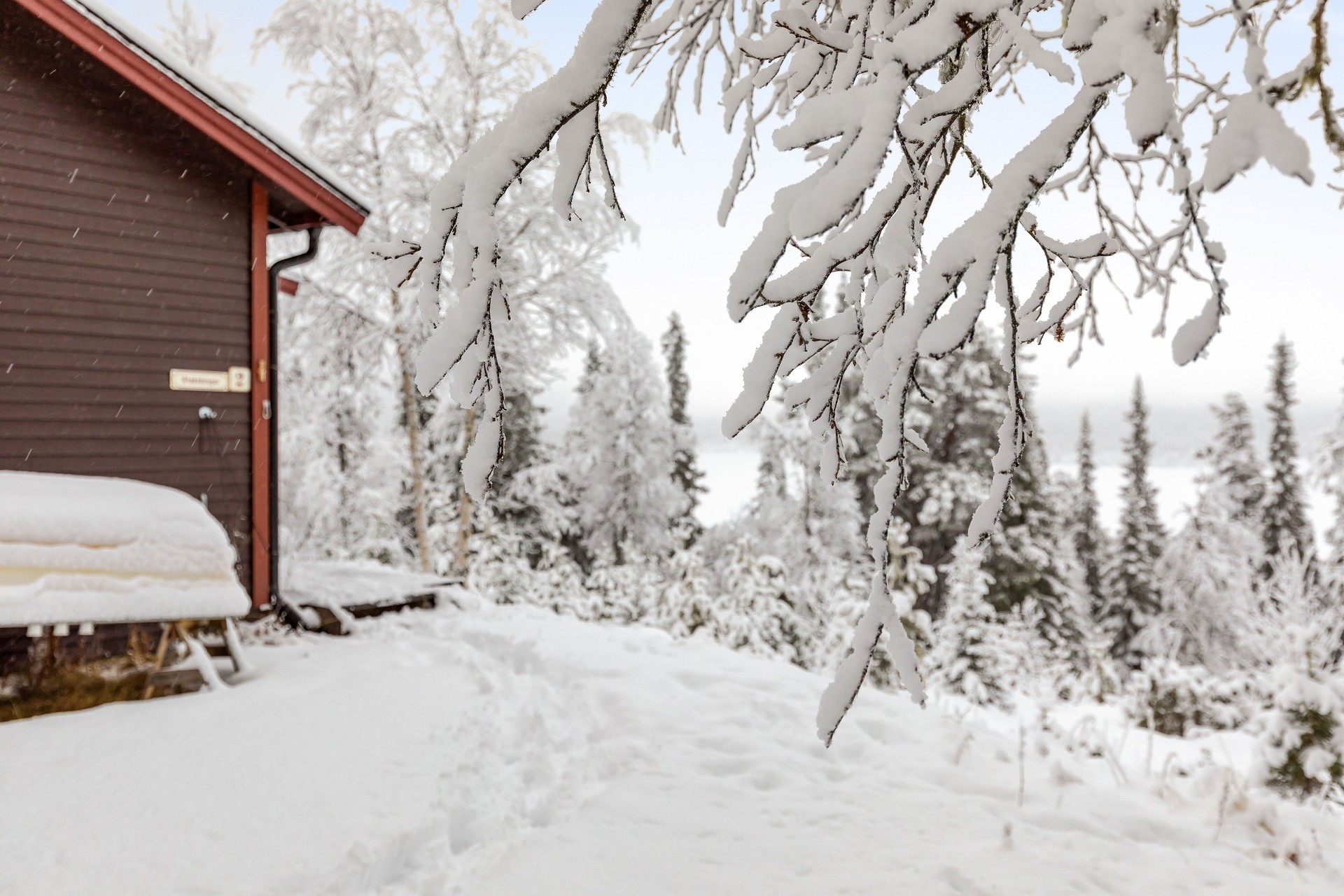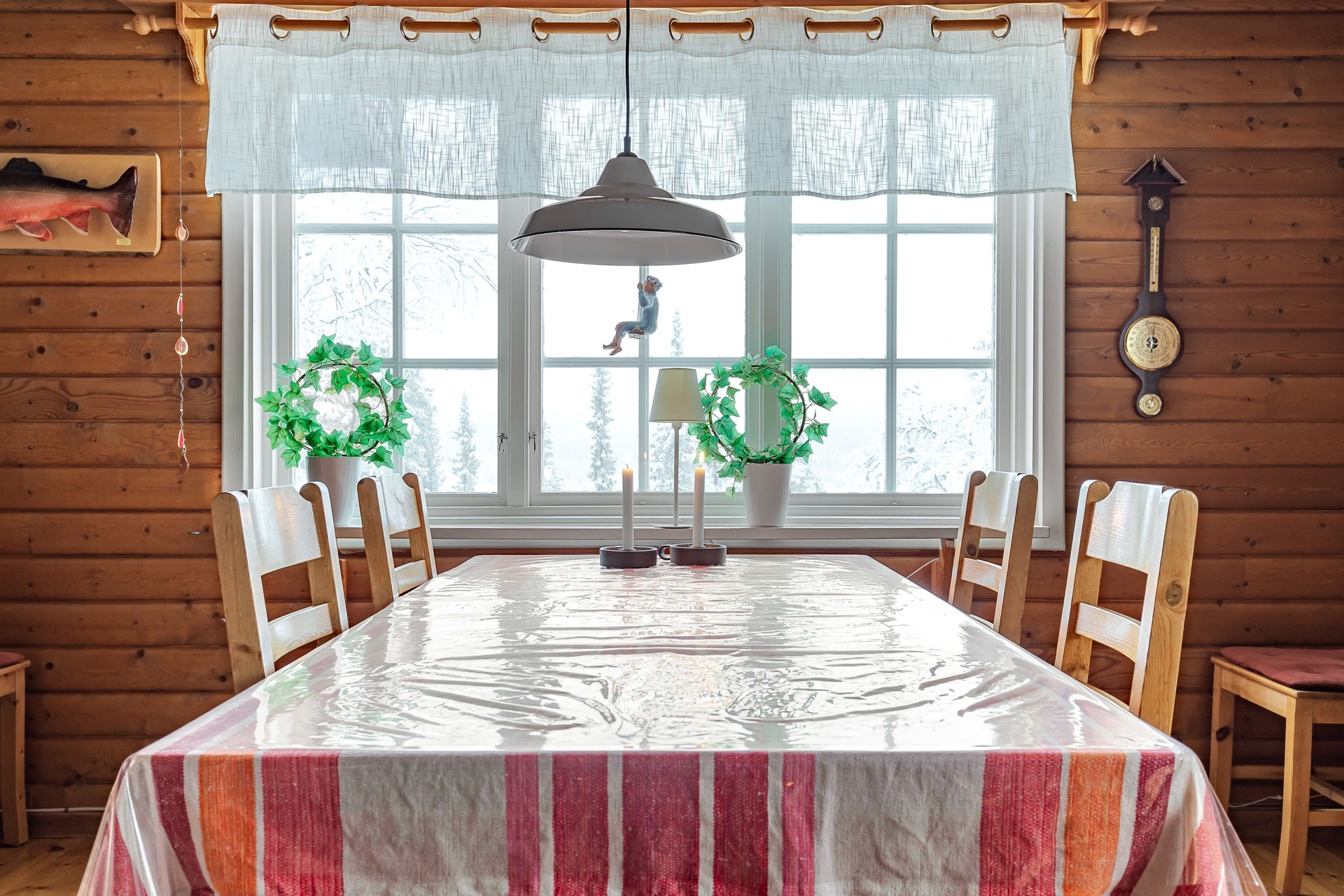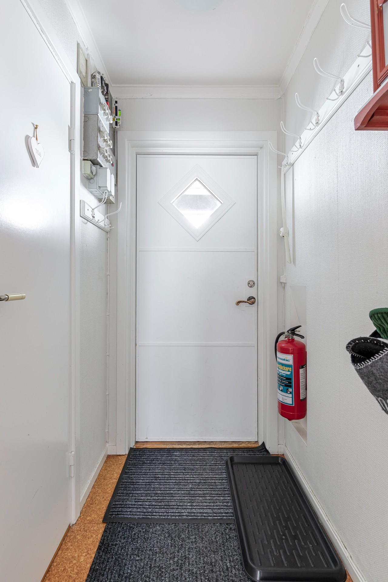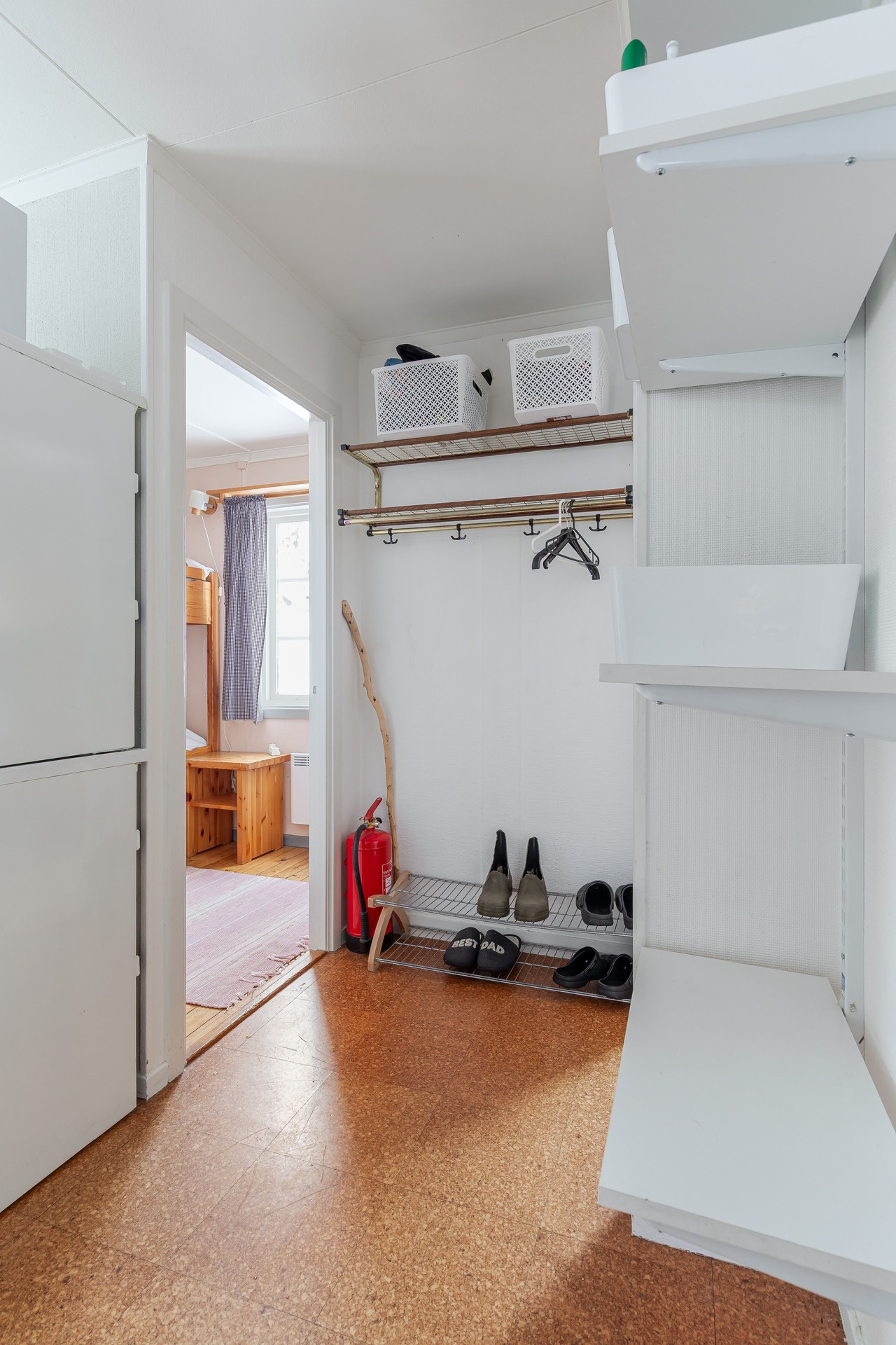 INTERIÖR HUVUDBYGGNAD: Hallrum med ingång till badrum direkt till höger. Plats för kläder och ytterskor finns både i hallen och längre in i huset mellan sovrummen. Hallen har korkmatta på golv, målad väv på väggar och målade skivor i tak. Badrummet inrymmer dusch med draperi, handfat, wc och varmvattenberedare. Plastmatta på golv och väggar samt målade skivor i tak. Rakt fram från hallen finns köket med bänkar på vardera sida om fönstret längst in. Här finns vedspis, elektrisk spis med 2 plattor och ugn, köksfläkt, kylskåp samt frys. Rostfri diskbänk med 2 hoar samt kakel ovanför arbetsbänken. Korkmatta på golv, målad väv på väggar och målade skivor i tak. Till vänster om hallen finns vardagsrum med hörnsoffa samt matplats för 4-6 personer. Ovanför soffan finns en luft-luftvärmepump från 2020 installerad. En stor braskamin står direkt till höger om ingången till rummet. Fönster i två väderstreck ger ett fint ljusinsläpp och utsikten från matbordet tröttnar man inte på. Här syns Blåstöten rakt fram och sjön nedanför sluttningen framför huset. Rummet har också ett sadeltak vilket gör känslan lite större. Trägolv, träpanel på väggar och i tak. Den högra delen av huset består av två identiska sovrum med våningssäng i vardera rum. Mellan rummen finns en förlängning av hallen där kläder och skor får sin naturliga plats. Sovrummen har trägolv, målad väv på väggar och målade skivor i tak. Båda sovrummen har också dubbla garderober.