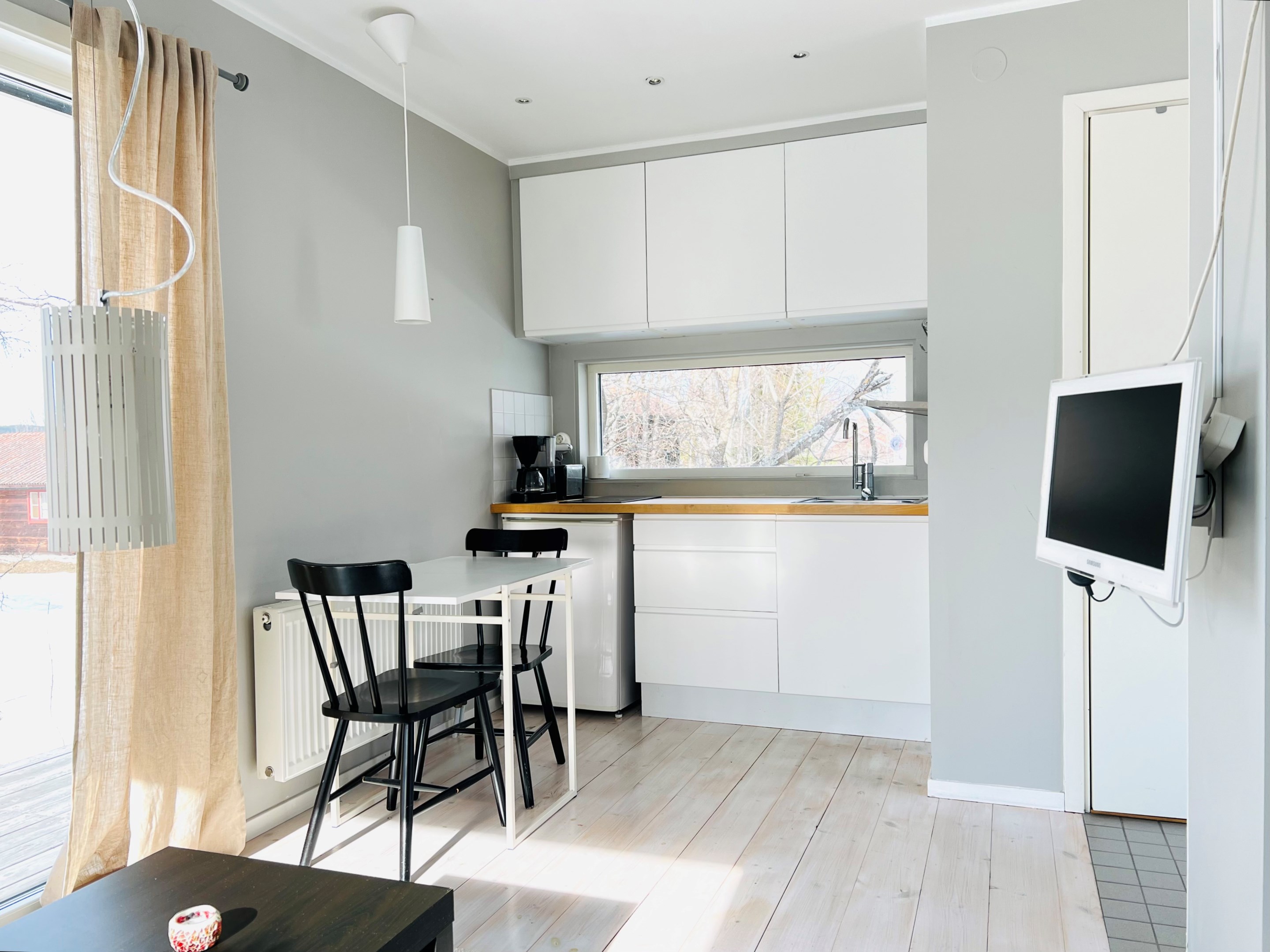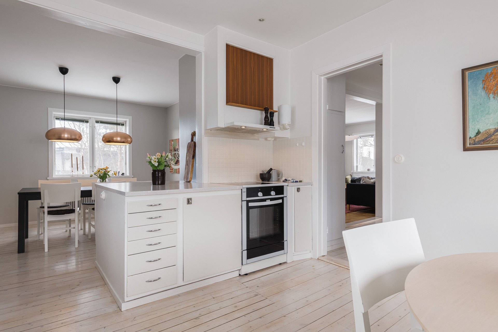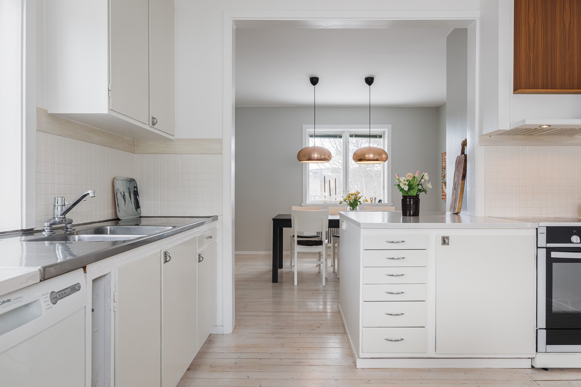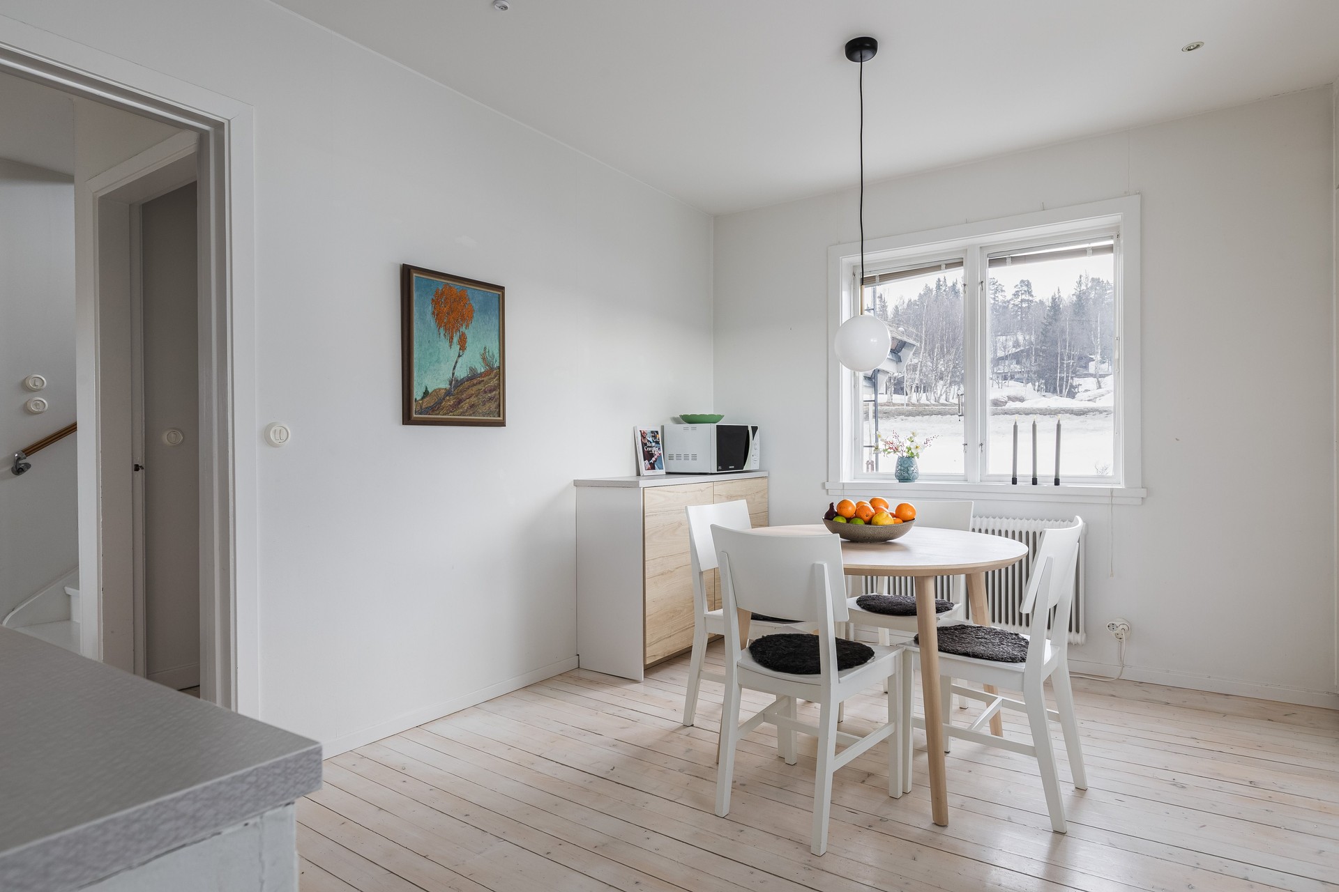 Till vänster i huset möts vi av ett ljust kök med öppning in till matsalsrummet. Köket är stort och charmigt bevarat med de äldre skåpluckorna, handtagen och bänkskivor i retrostil. Här finns spis med glashäll och ugn, köksfläkt, kyl/frys samt diskmaskin. Ett matbord för fyra står centrerat i rummet. Köket sammanlänkas med rummet intill som är möblerat med ett stort matbord och stolar där hela släkten kan samlas.