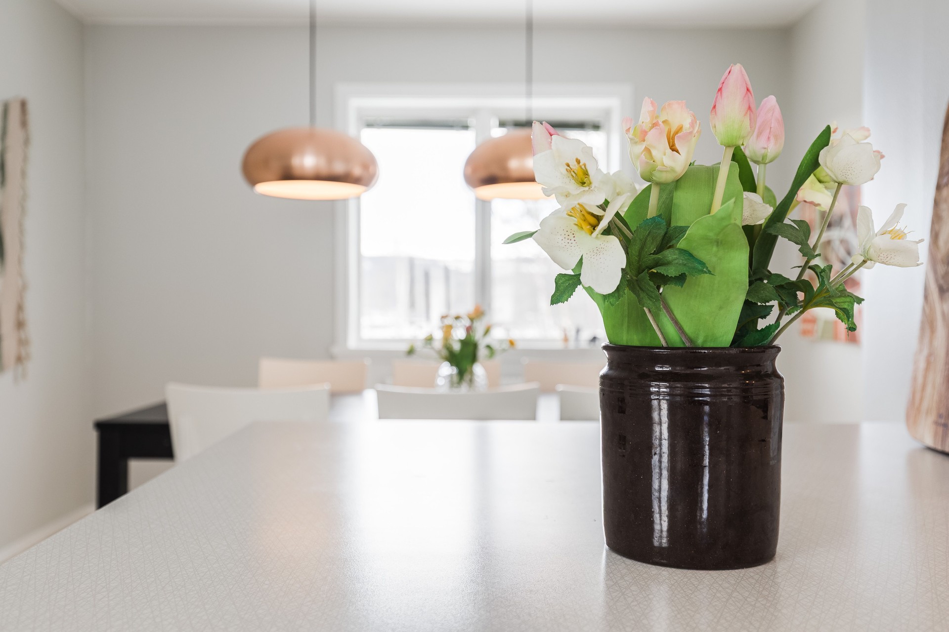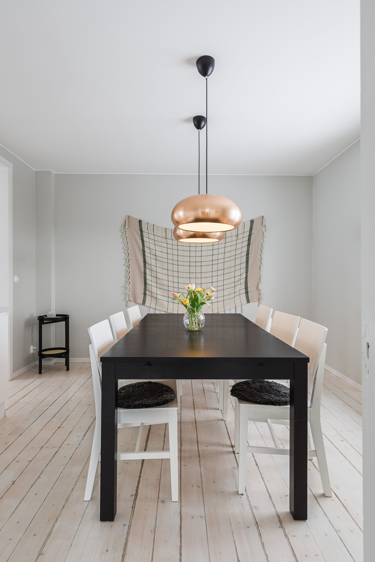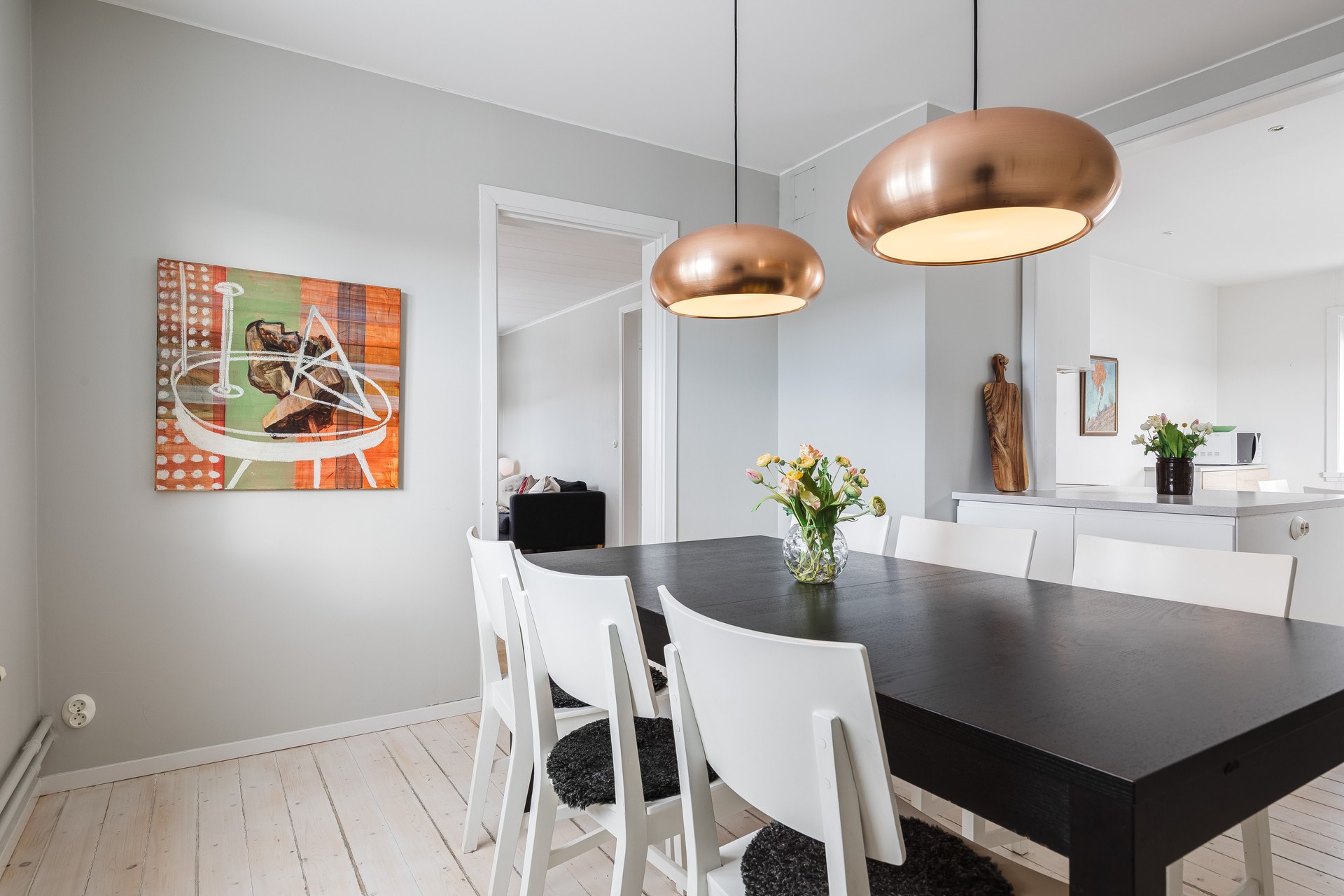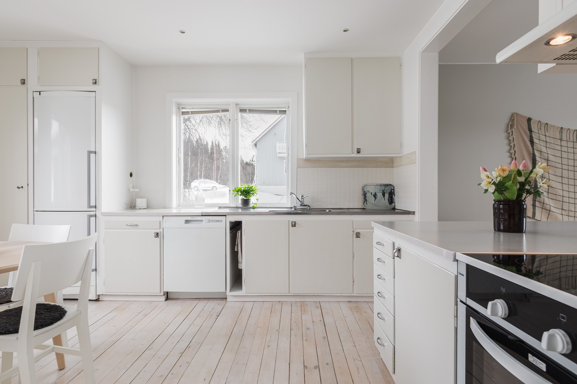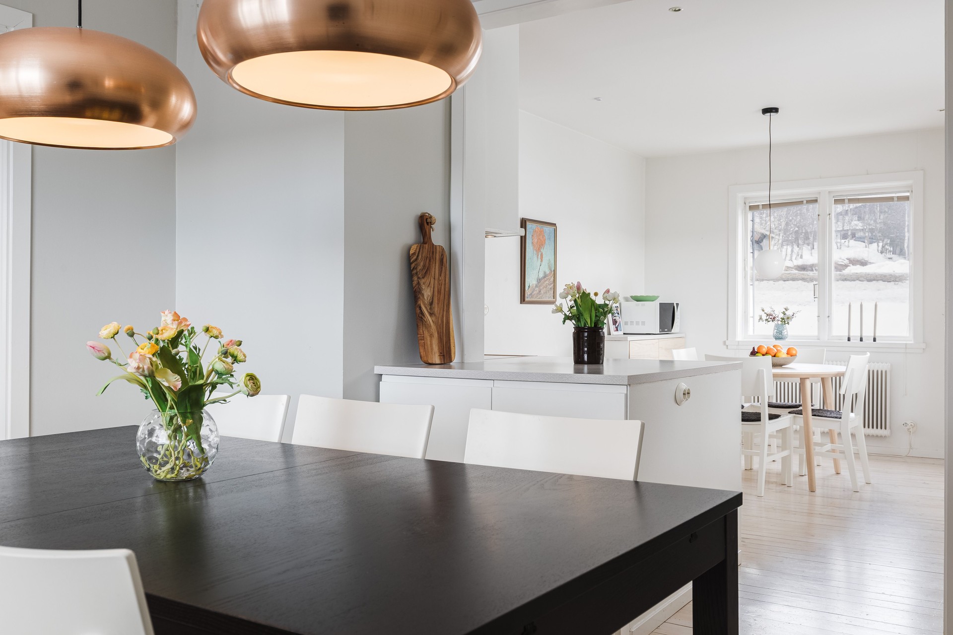 Till vänster i huset möts vi av ett ljust kök med öppning in till matsalsrummet. Köket är stort och charmigt bevarat med de äldre skåpluckorna, handtagen och bänkskivor i retrostil. Här finns spis med glashäll och ugn, köksfläkt, kyl/frys samt diskmaskin. Ett matbord för fyra står centrerat i rummet. Köket sammanlänkas med rummet intill som är möblerat med ett stort matbord och stolar där hela släkten kan samlas.