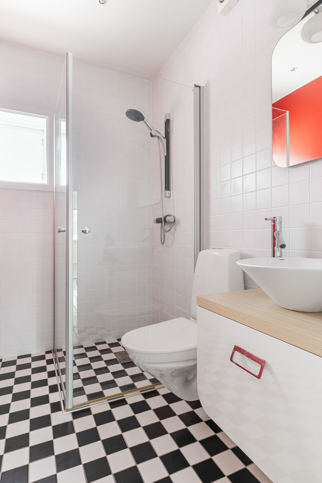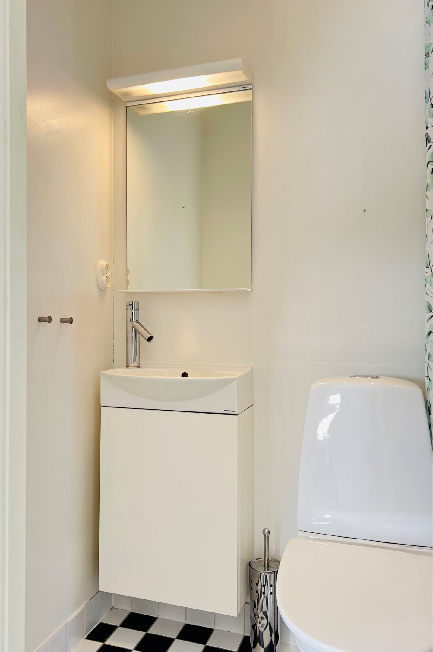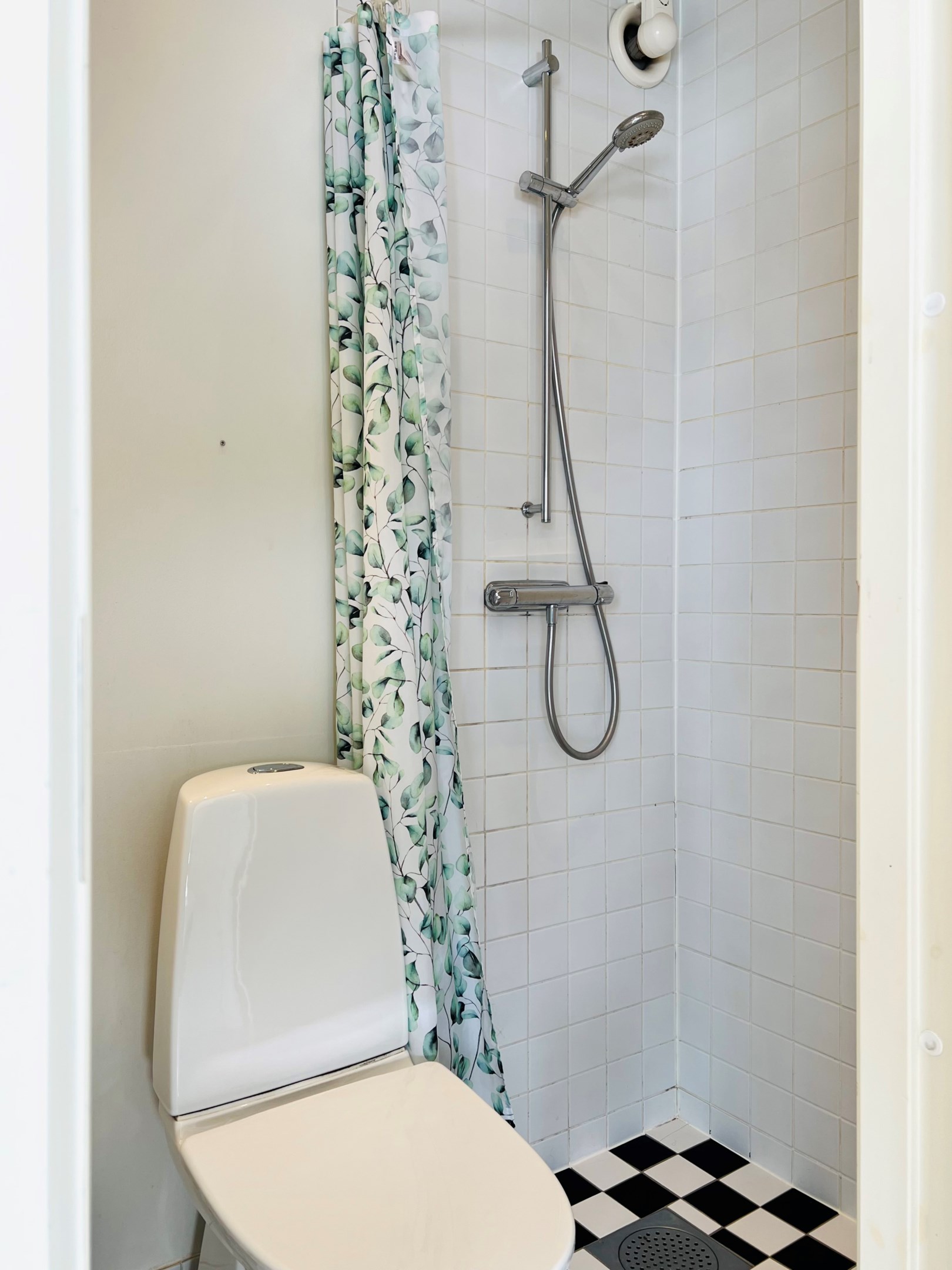 Badrummet, intill sovrummet har schackrutigt klinkergolv med elektrisk golvvärme och kakel samt målade skivor på väggar. Wc, dusch och handfat på kommod med spegelskåp ovanför.