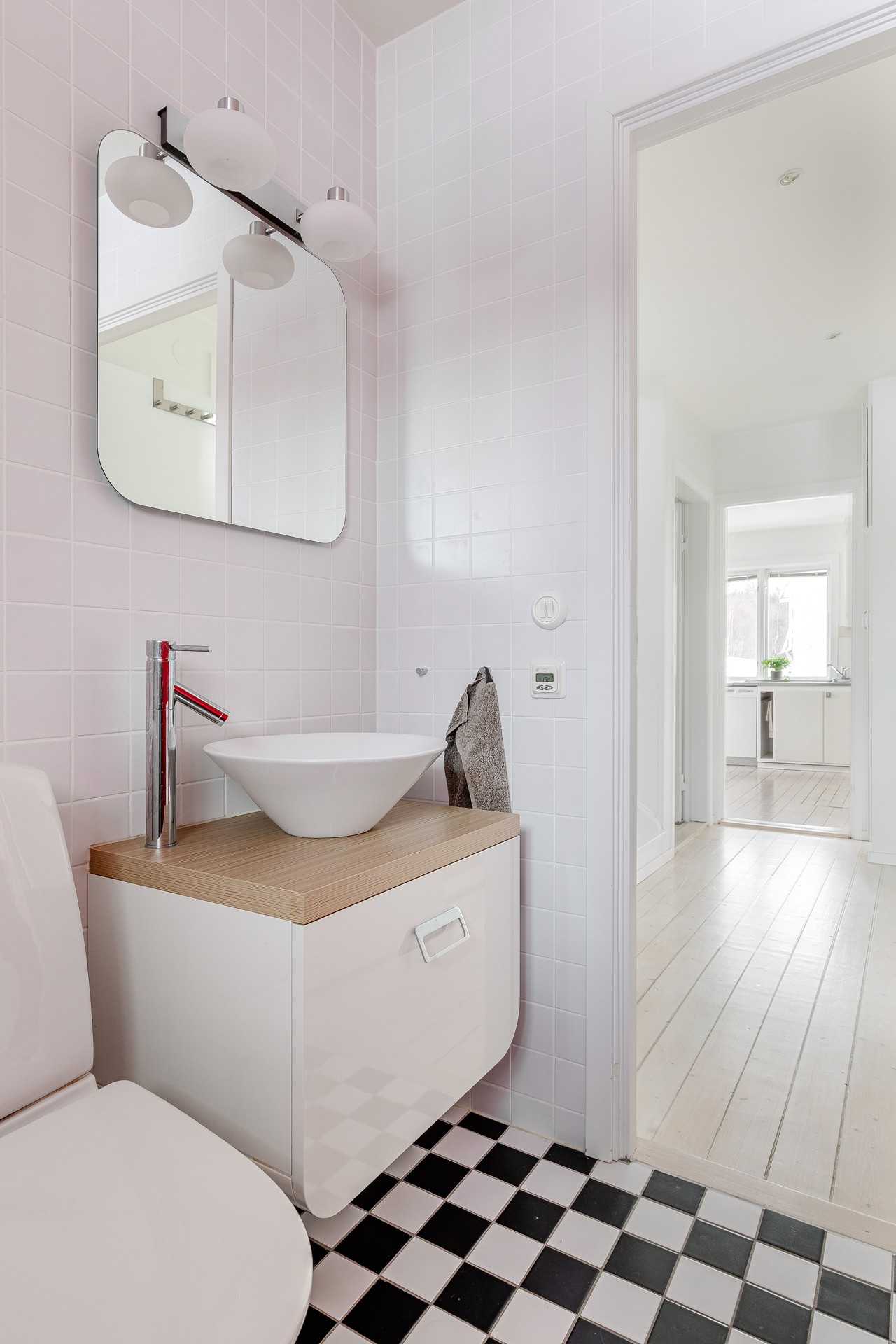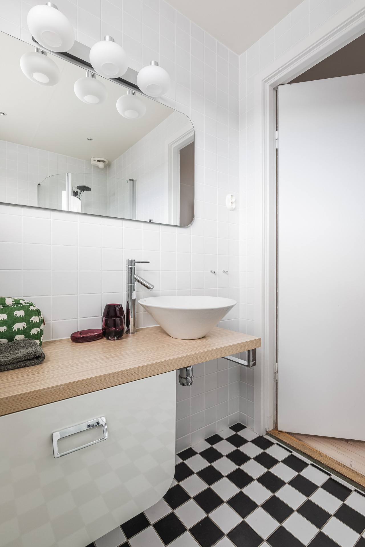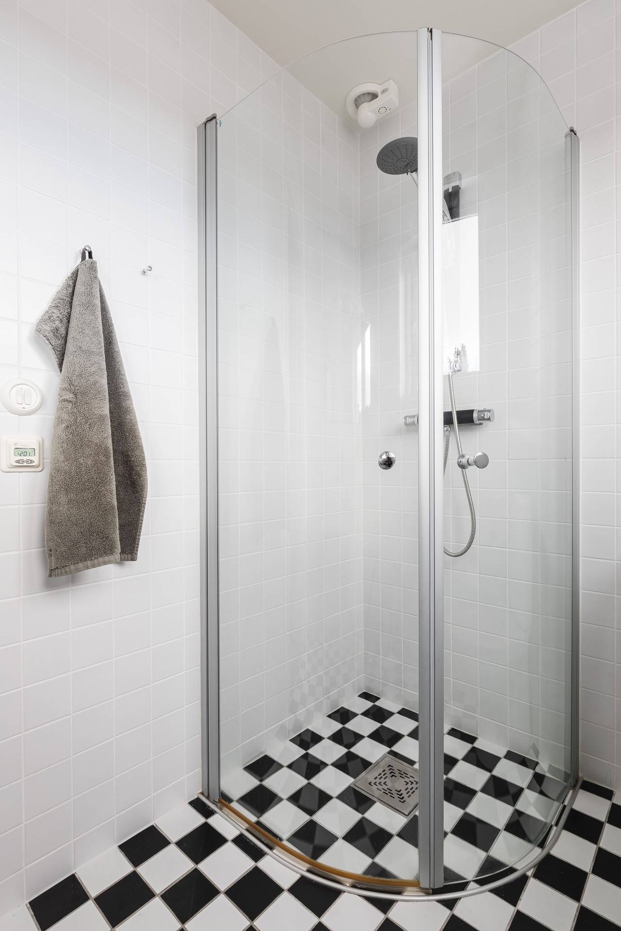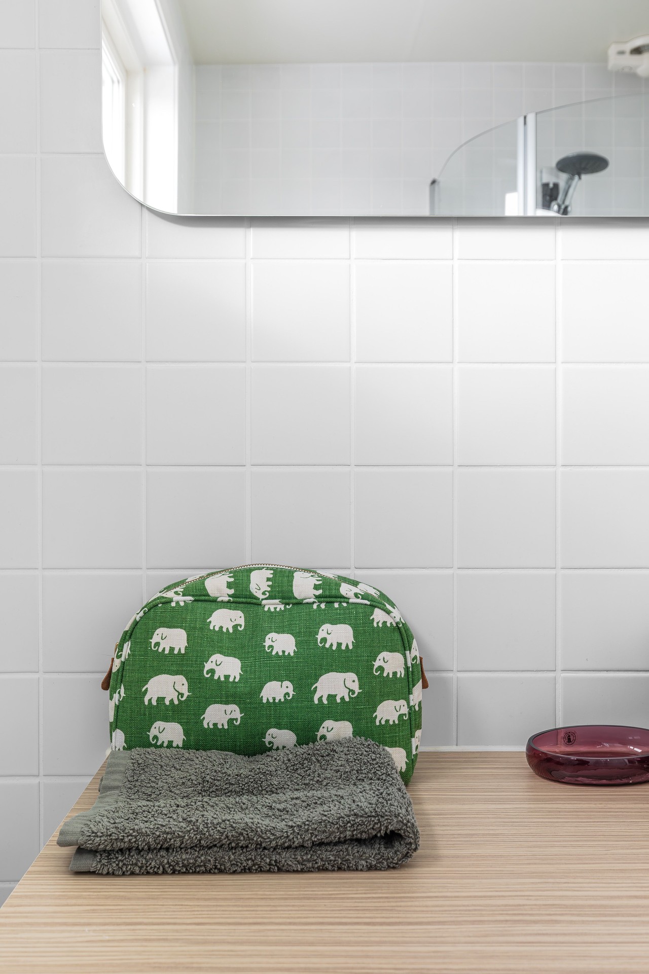 Badrummet, intill sovrummet har schackrutigt klinkergolv med elektrisk golvvärme och kakel samt målade skivor på väggar. Wc, dusch och handfat på kommod med spegelskåp ovanför.