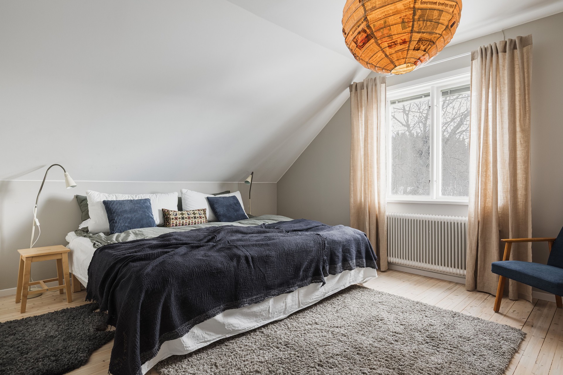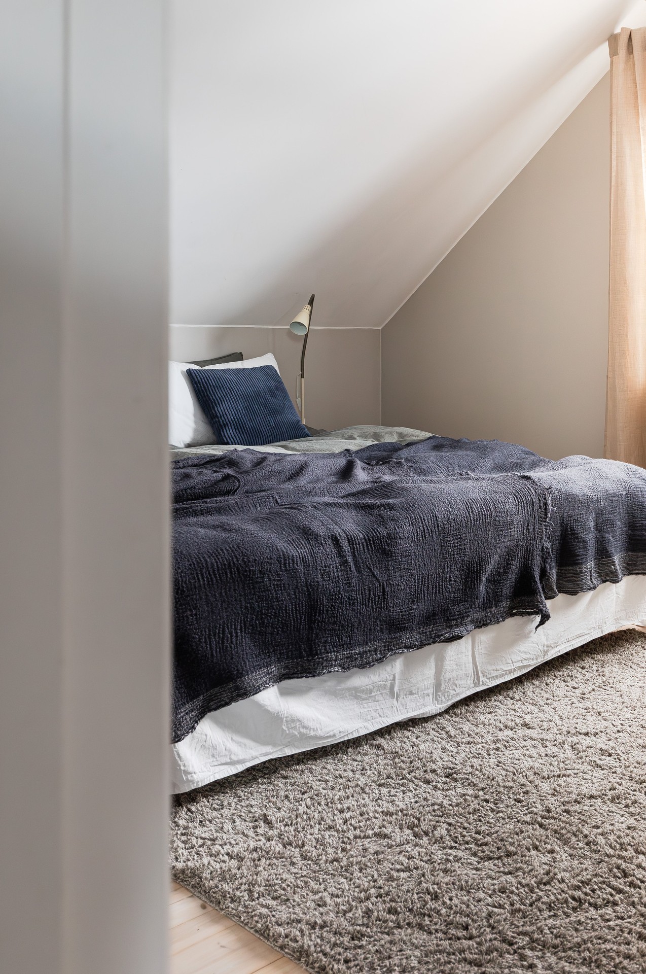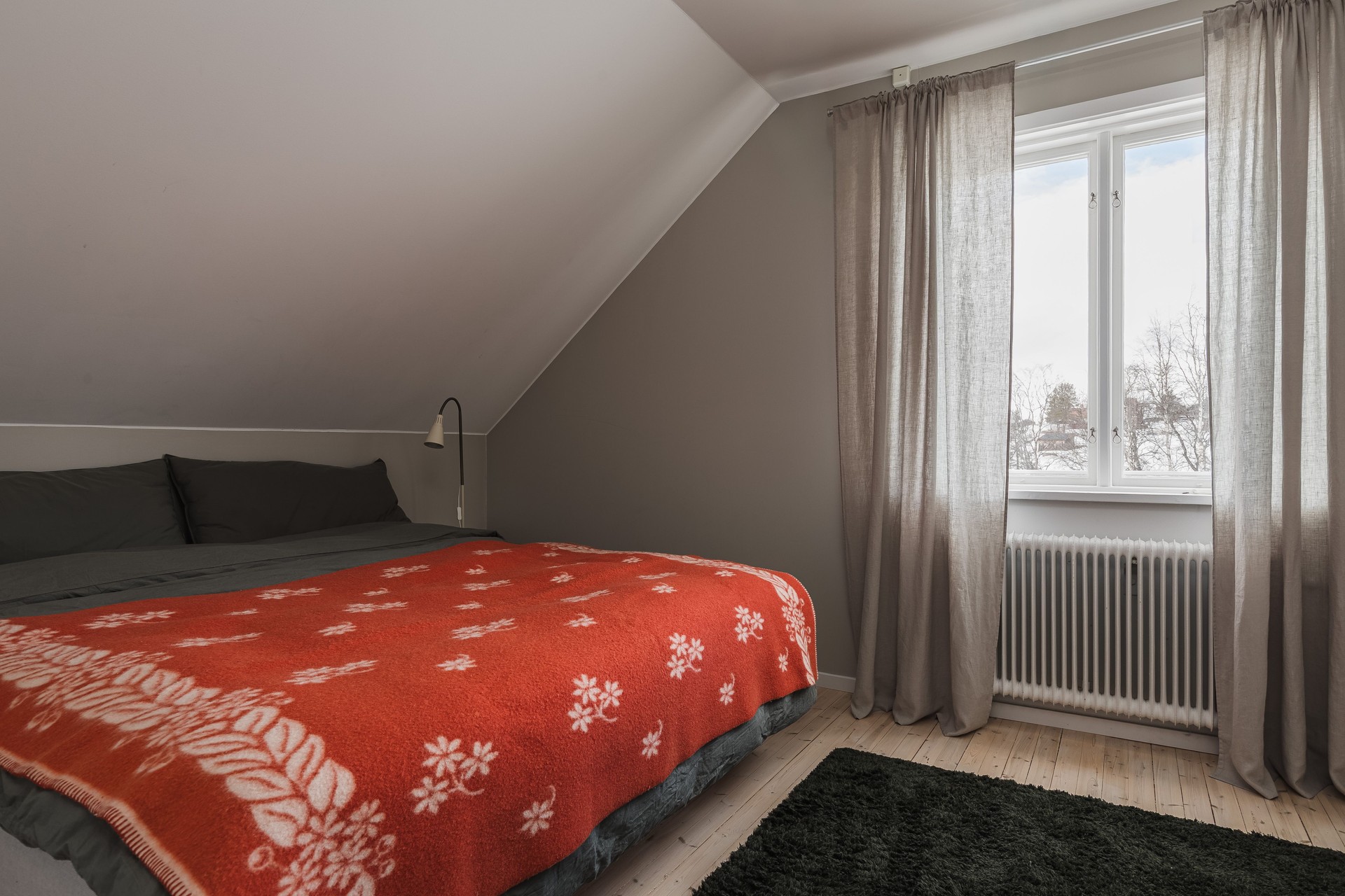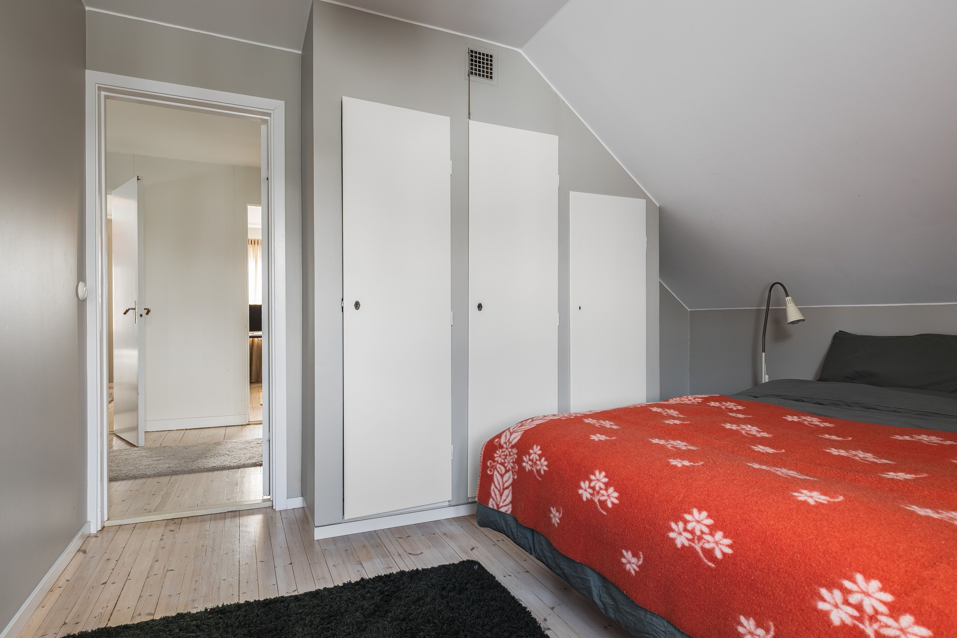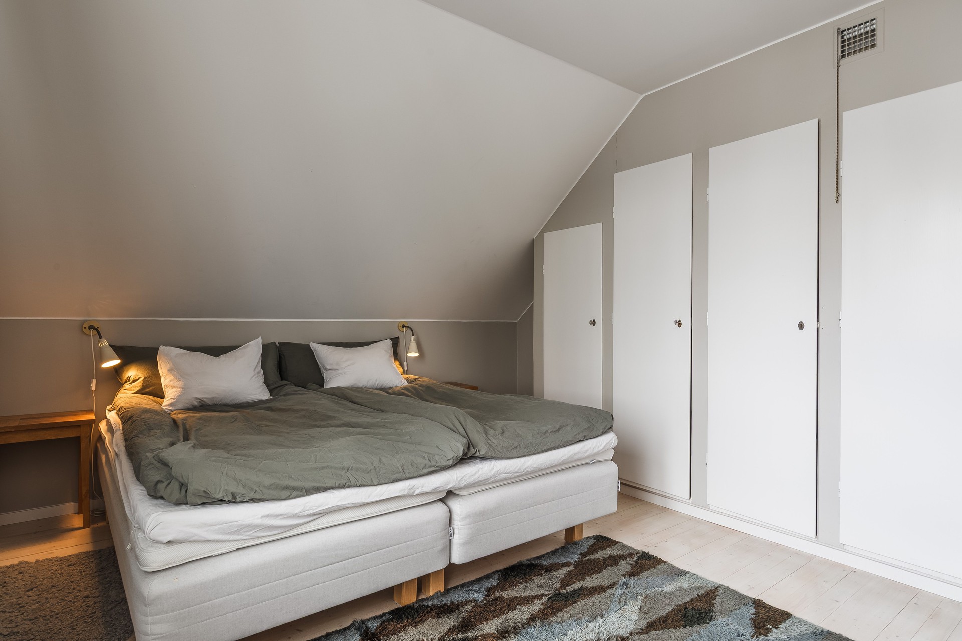 Till vänster i hallen på övre plan finns sovrum 2 med dubbelsäng och två större garderober. Trägolv, målade skivor på väggar och i tak.