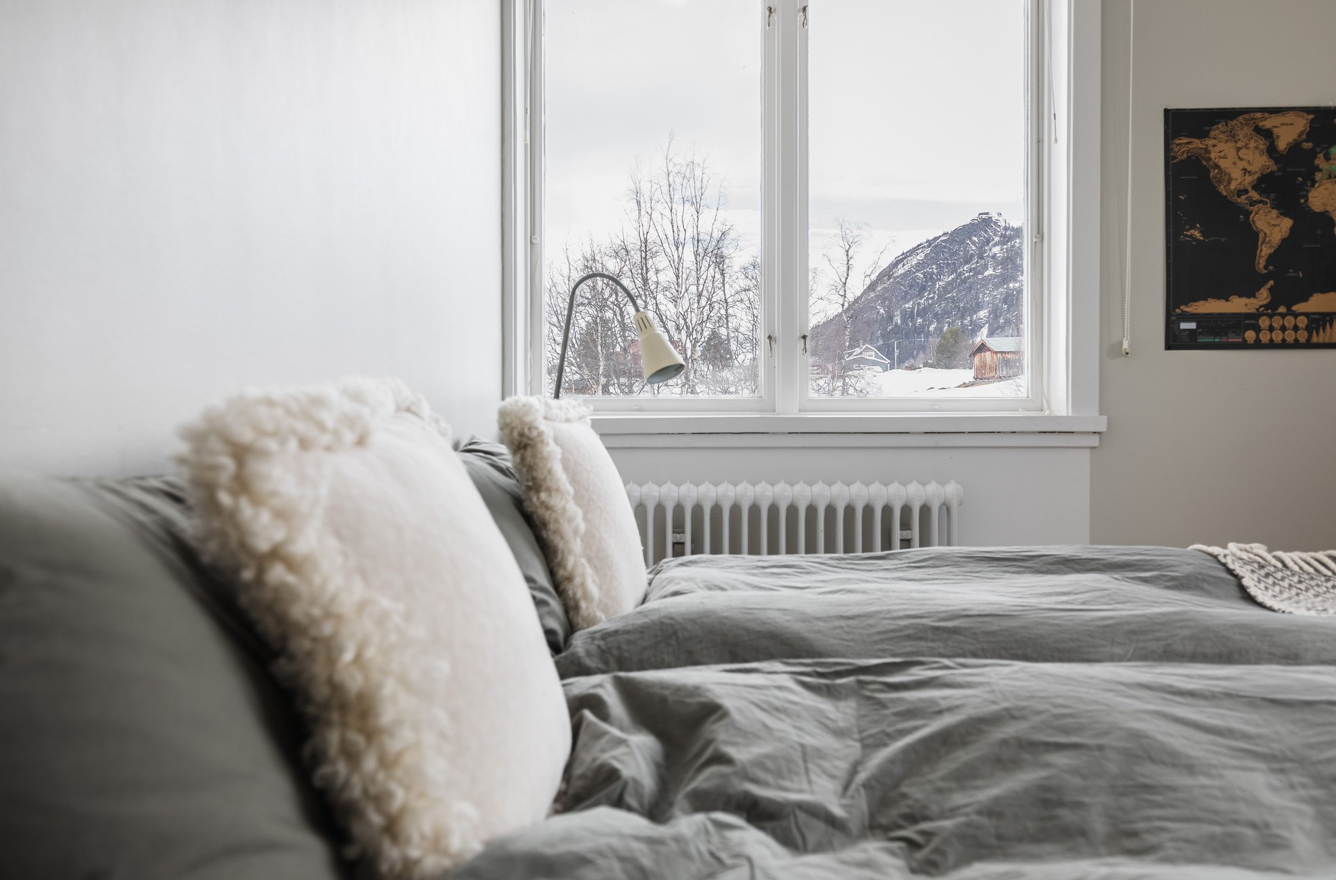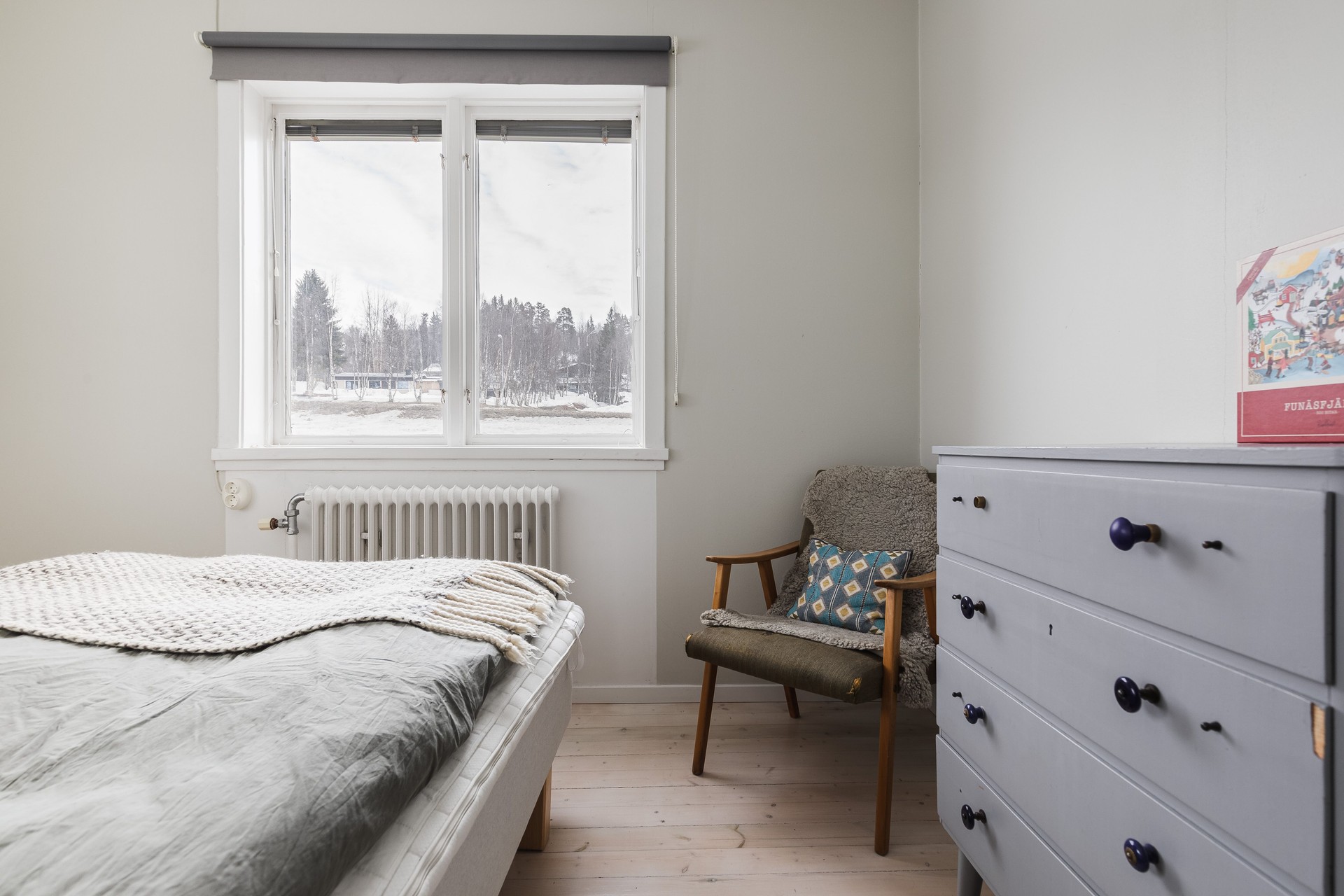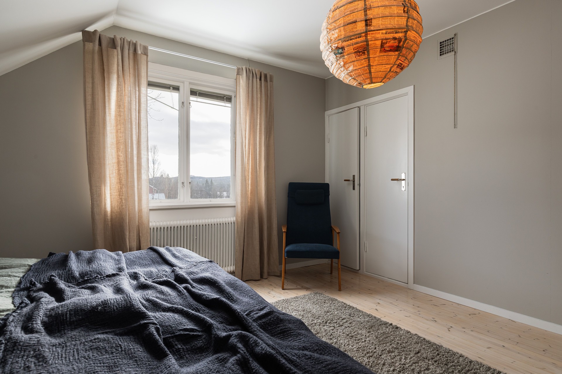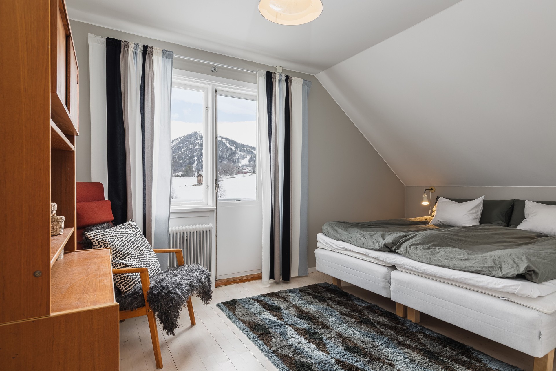 Sovrum 4 har dubbelsäng och garderober med fönsterutsikt mot Funäsdalsberget.
