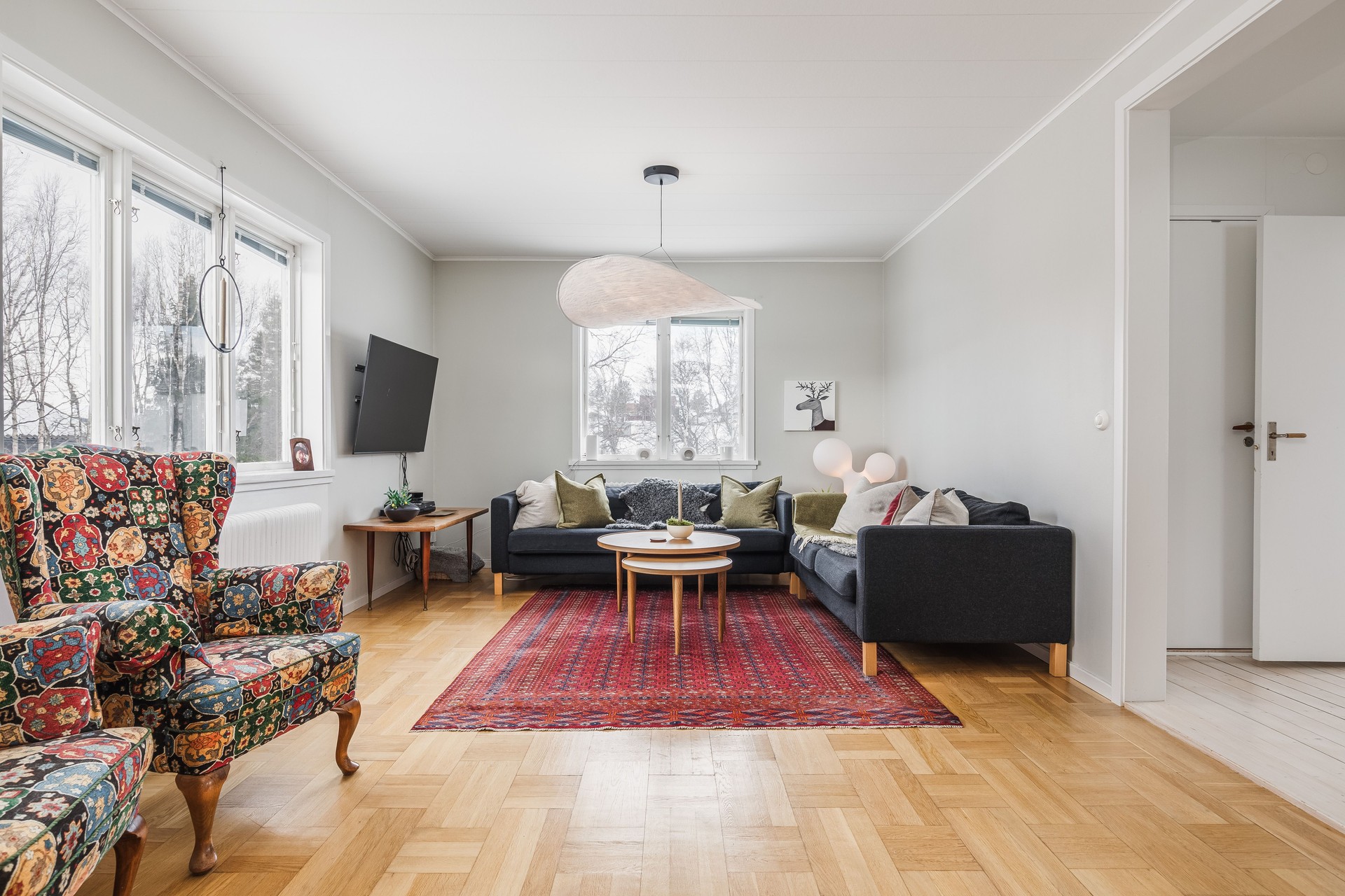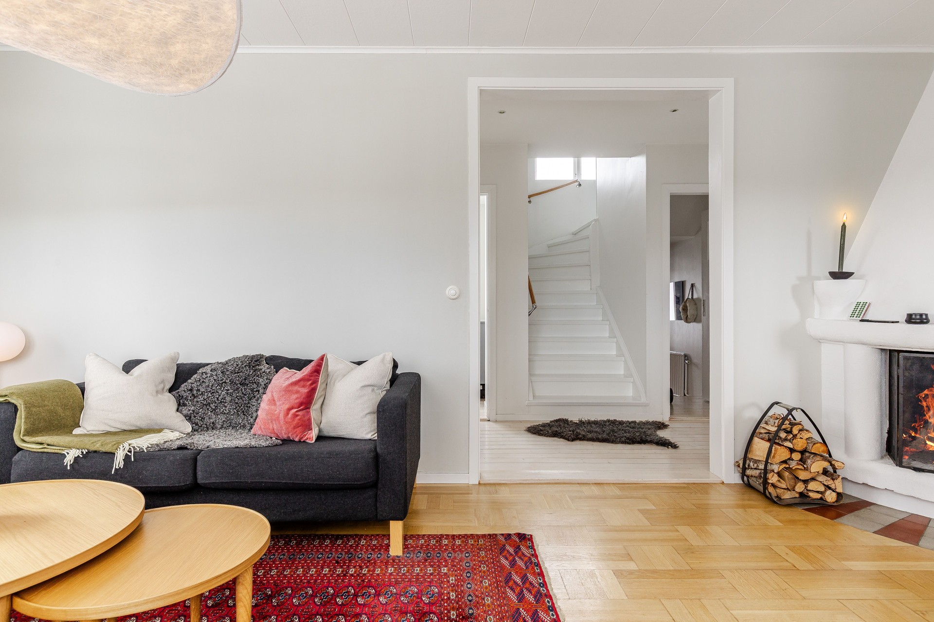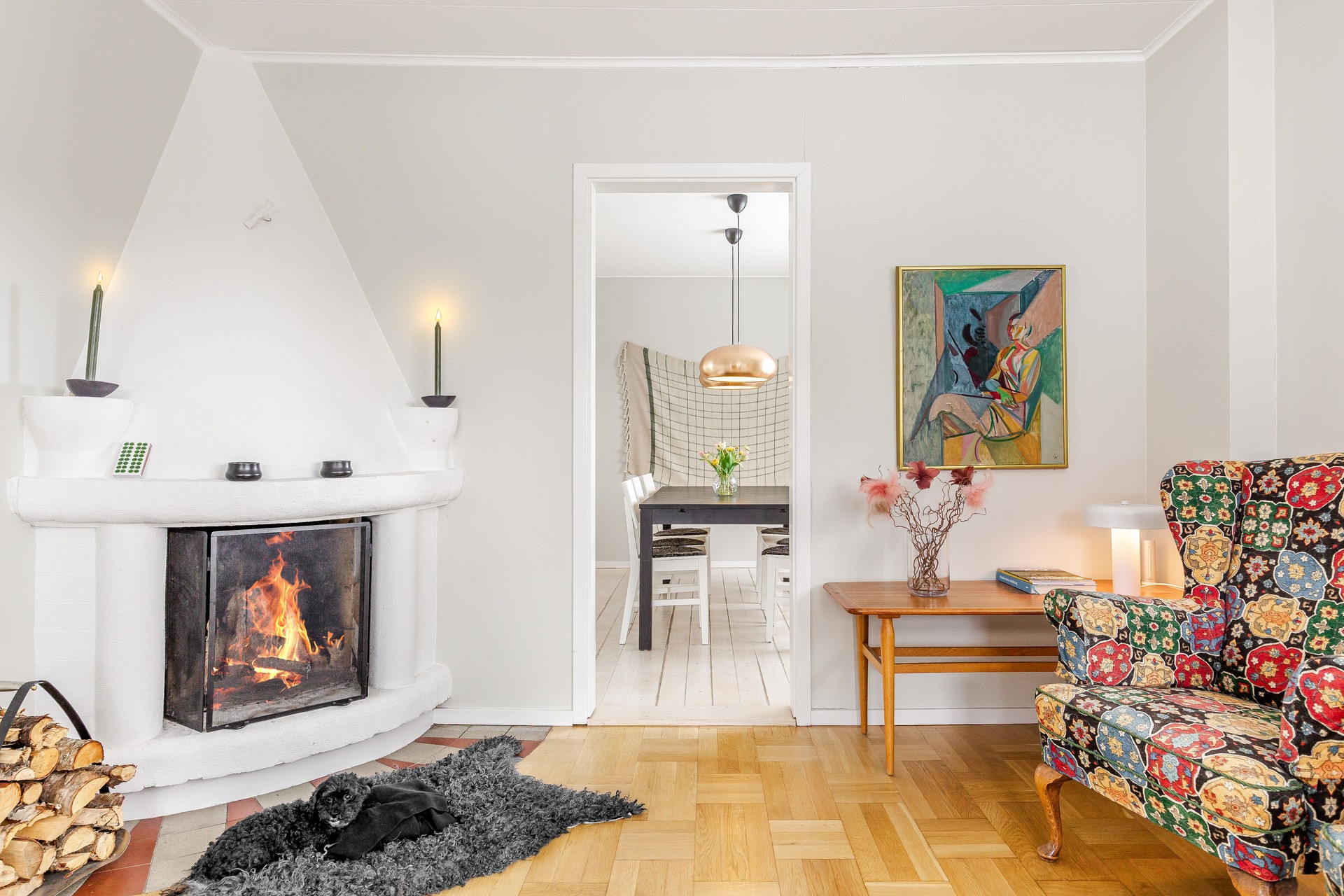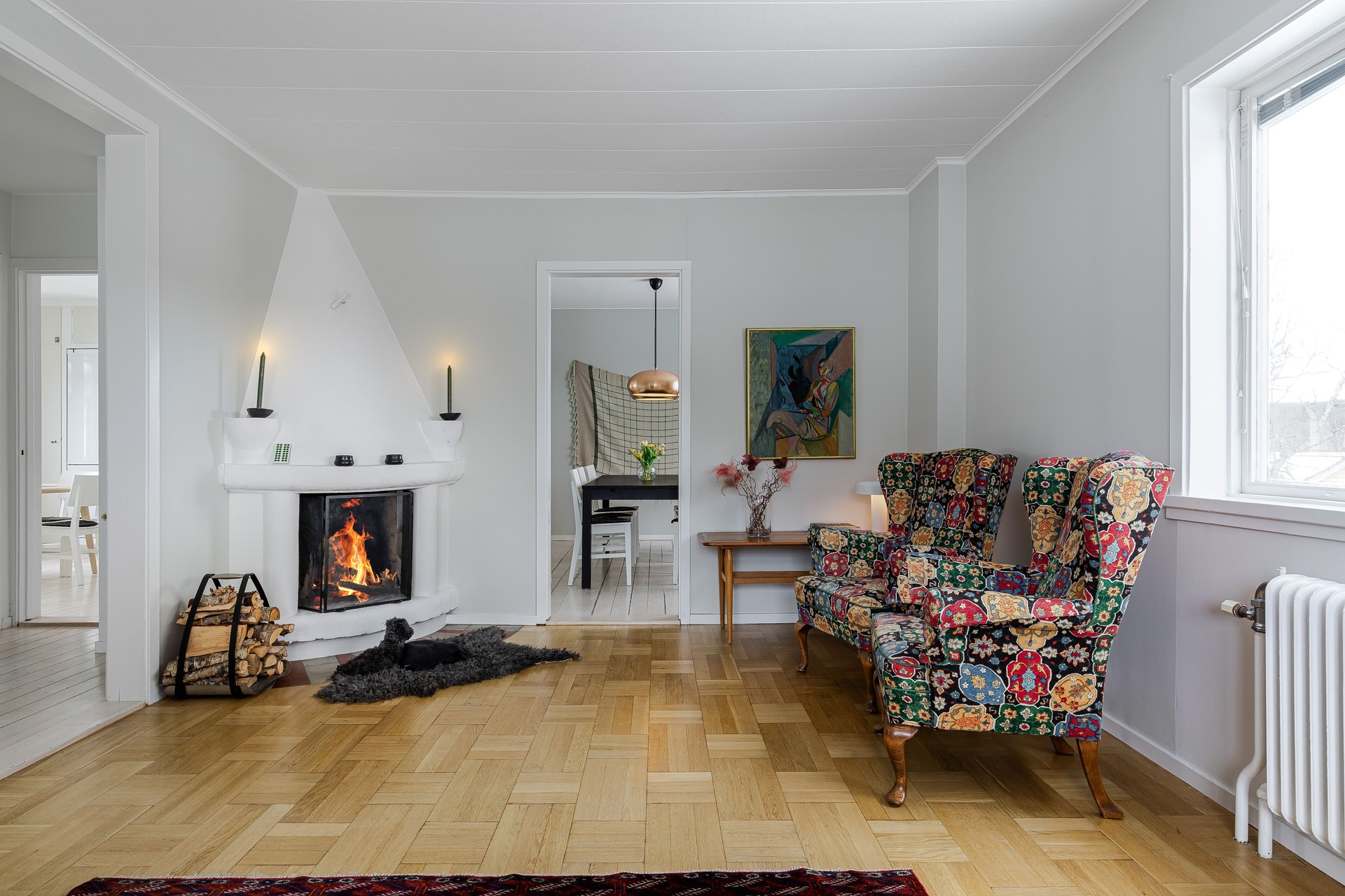 Både matsalen och hallen sammanlänkas med vardagsrummet och den fina öppna spisen intill dörröppningarna mellan rummen. Rummet är möblerat med en soffgrupp i vinkel och även två fåtöljer vid öppna spisen. Parkettgolv, målade skivor på väggar och i tak.