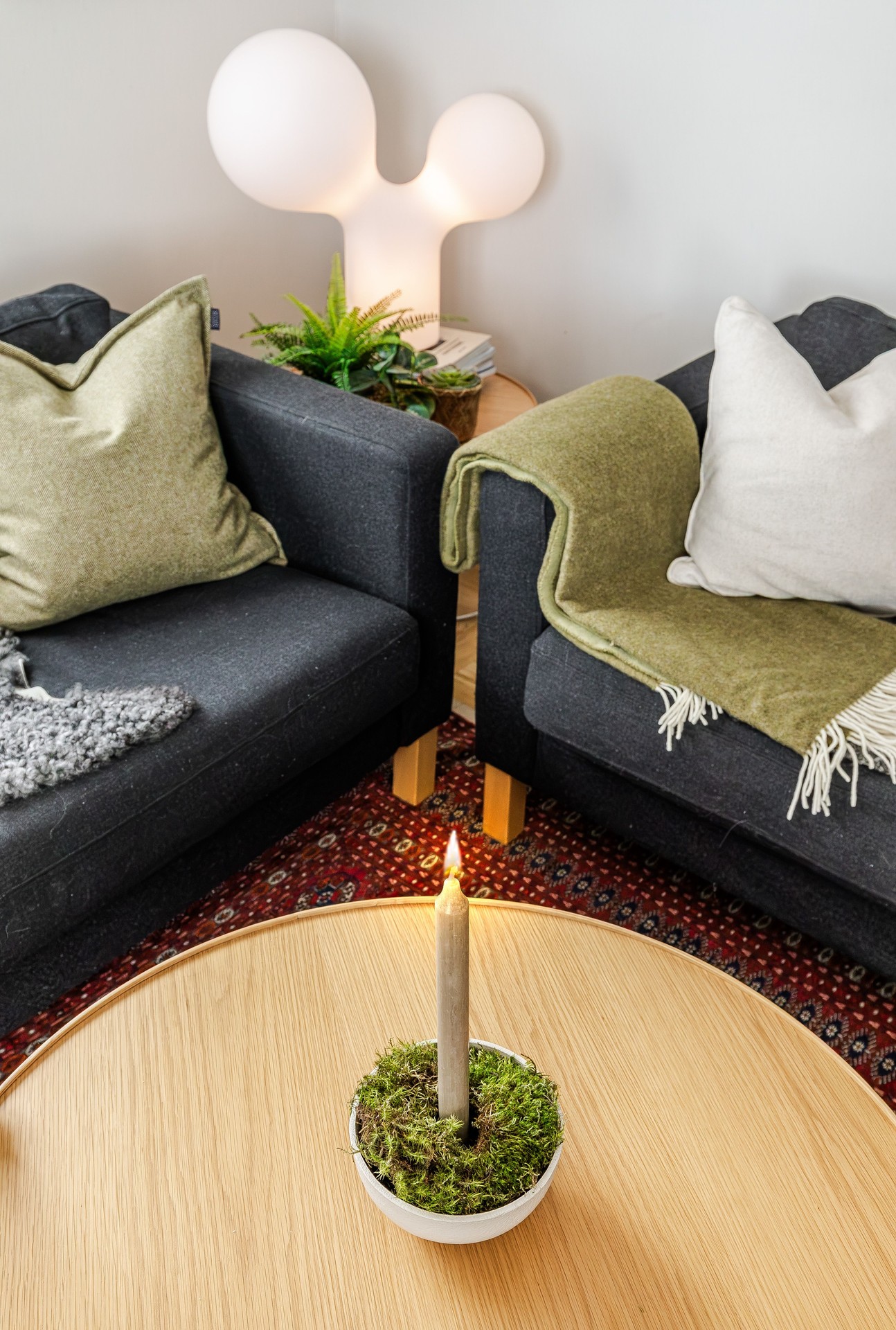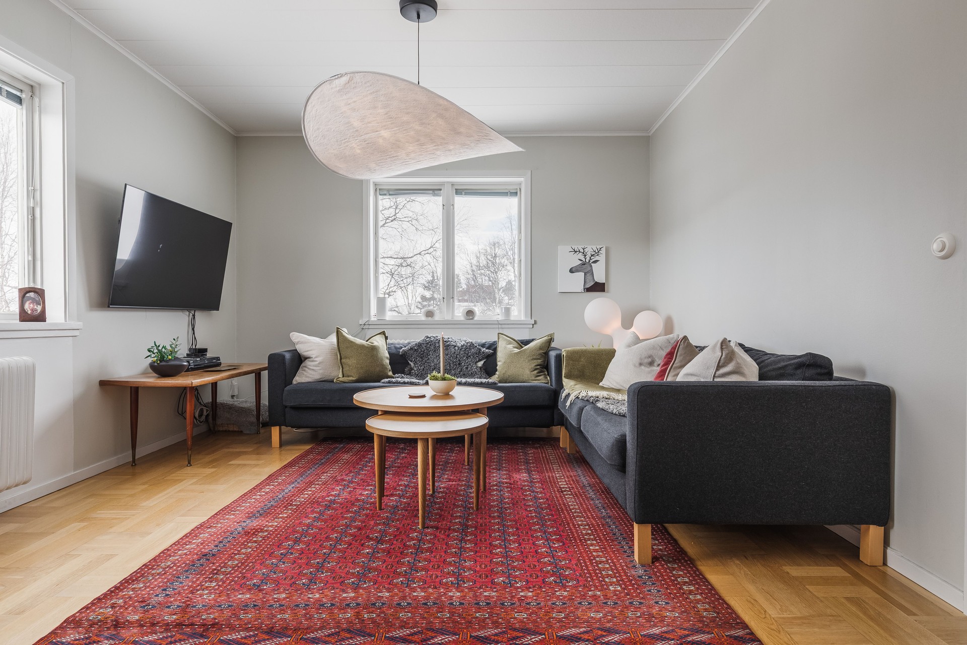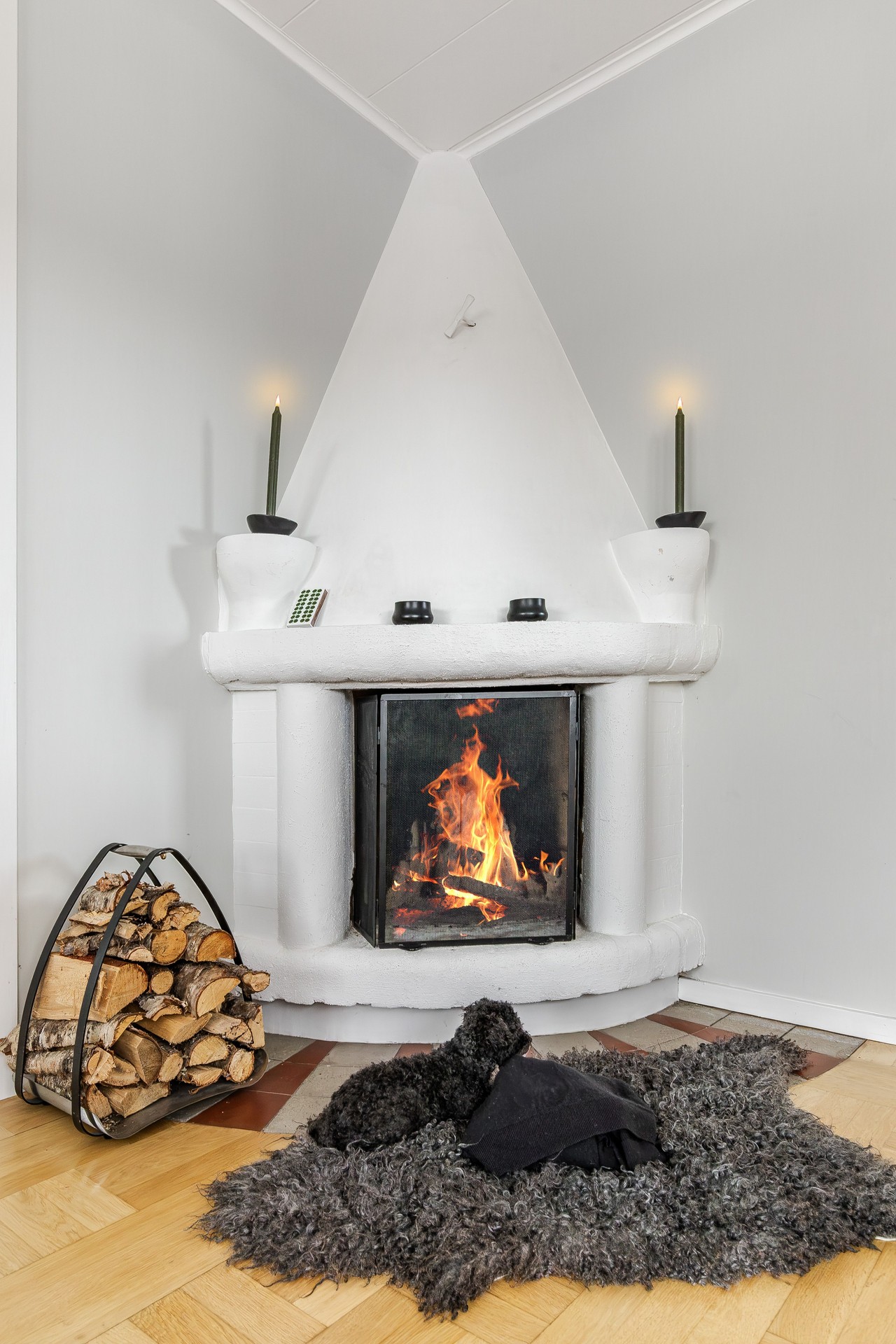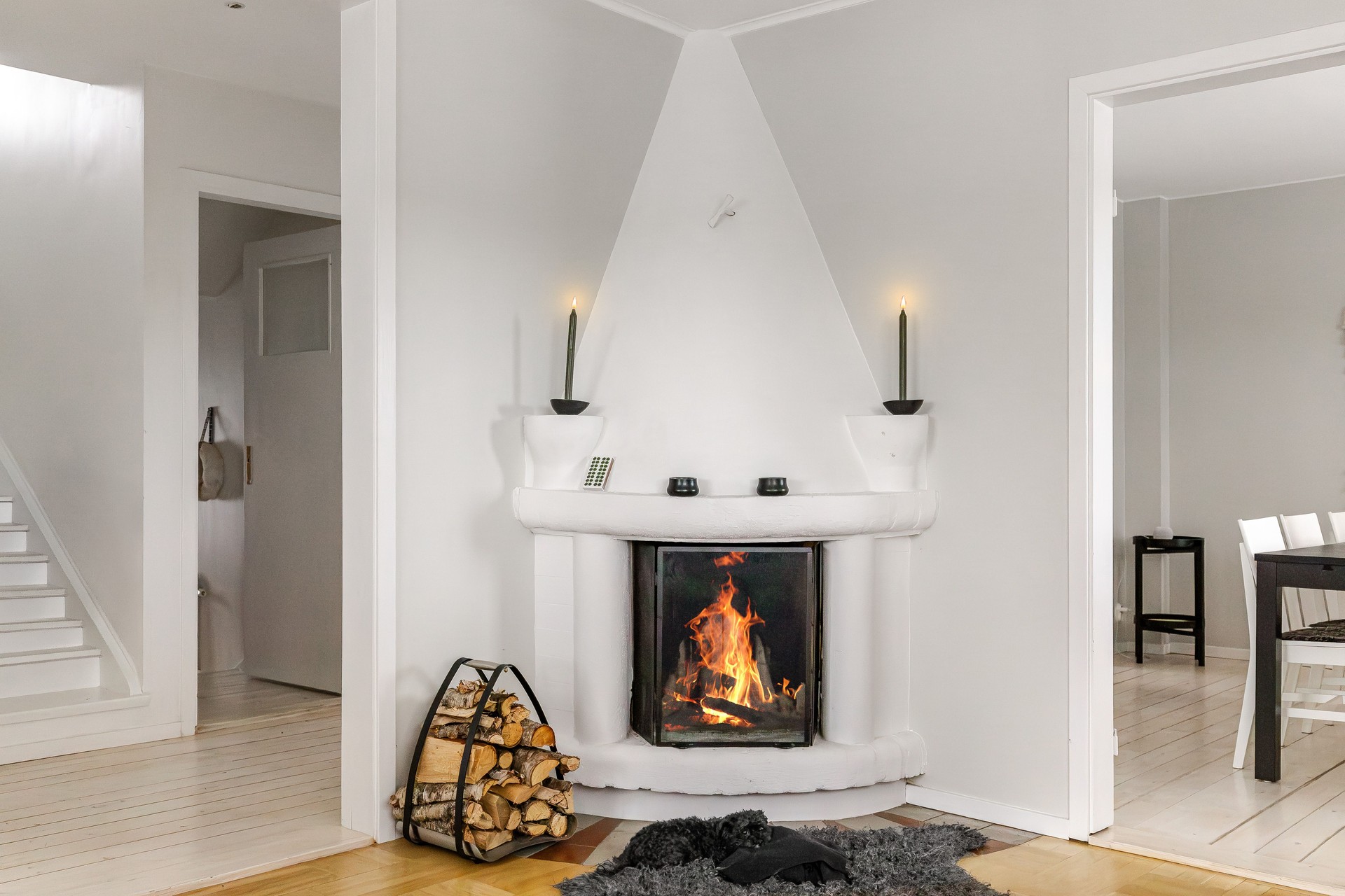 Både matsalen och hallen sammanlänkas med vardagsrummet och den fina öppna spisen intill dörröppningarna mellan rummen. Rummet är möblerat med en soffgrupp i vinkel och även två fåtöljer vid öppna spisen. Parkettgolv, målade skivor på väggar och i tak.