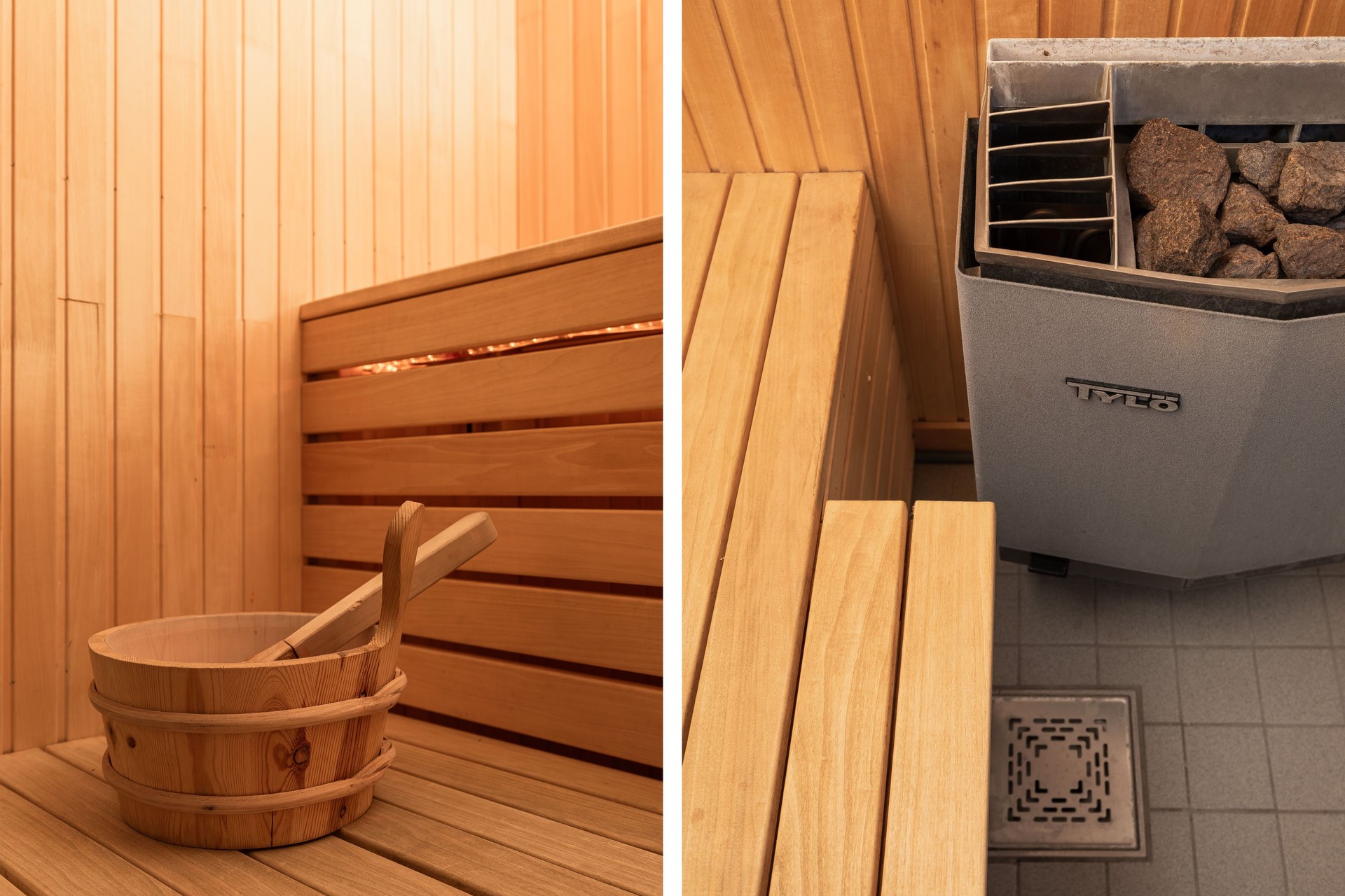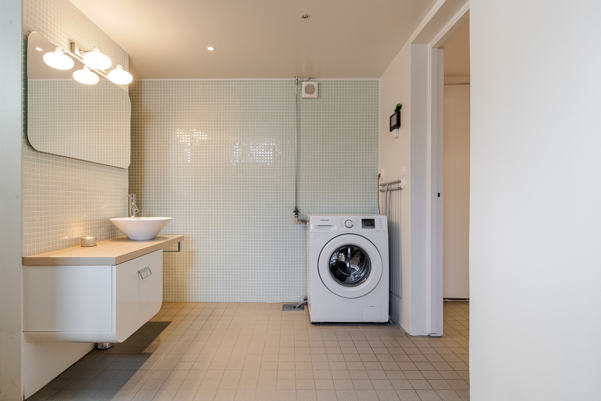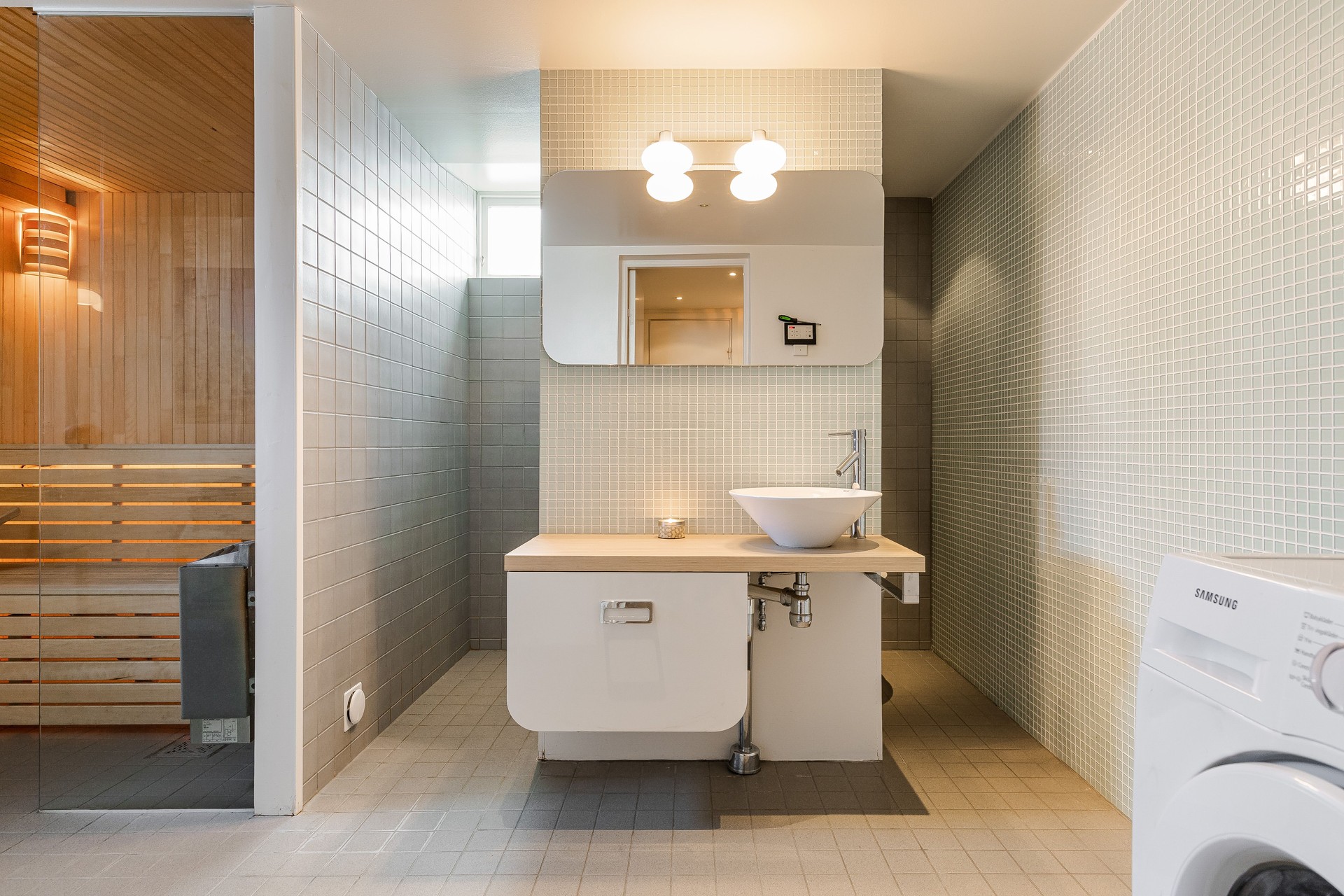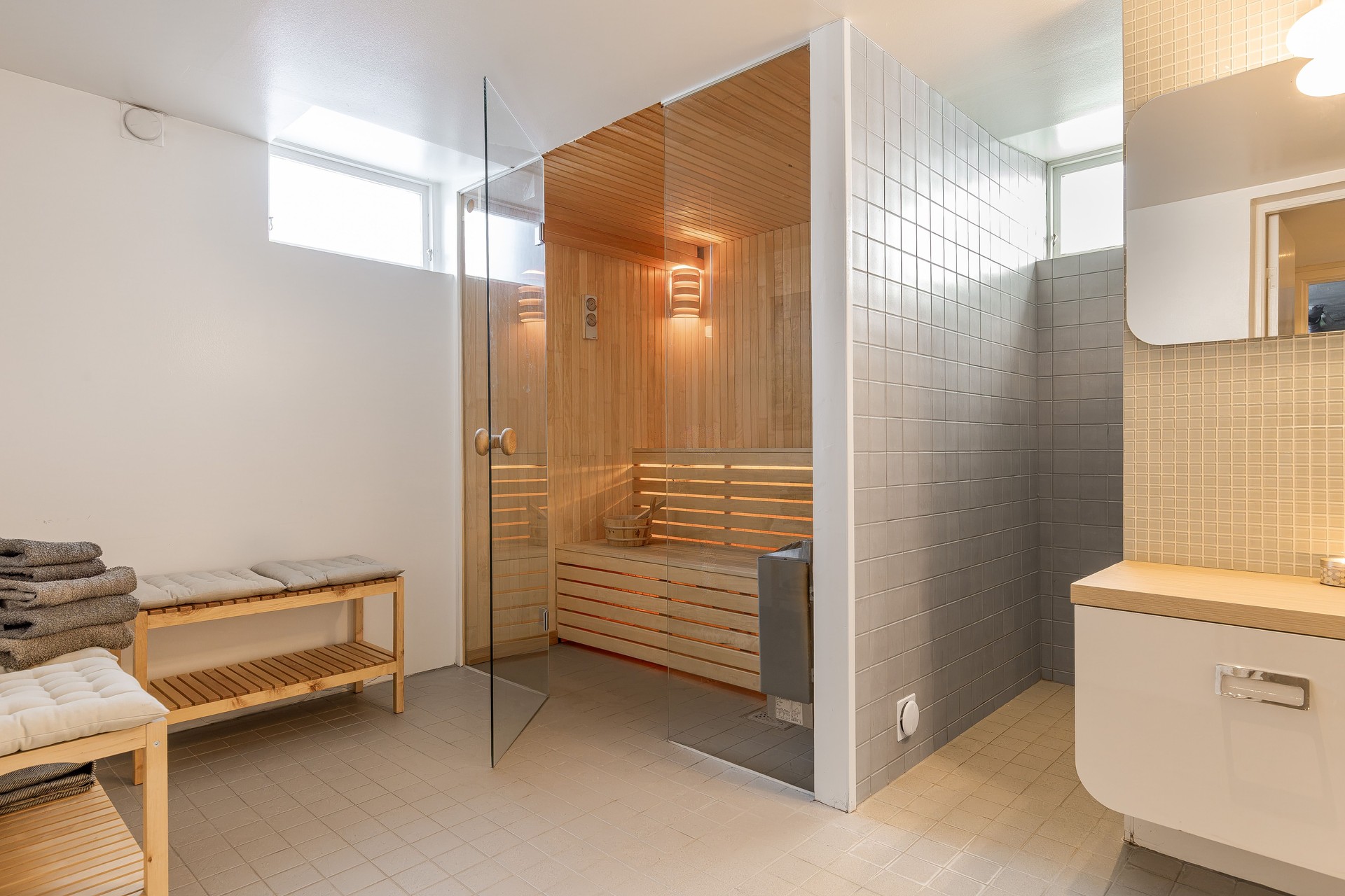 Större badrum med relaxdel intill den stora, helglasade bastun. I samma rum finns både dusch, wc och handfat med underskåp och även tvättmaskin. Golvet har vattenburen golvvärme. Kaklade väggar och målade skivor i tak.