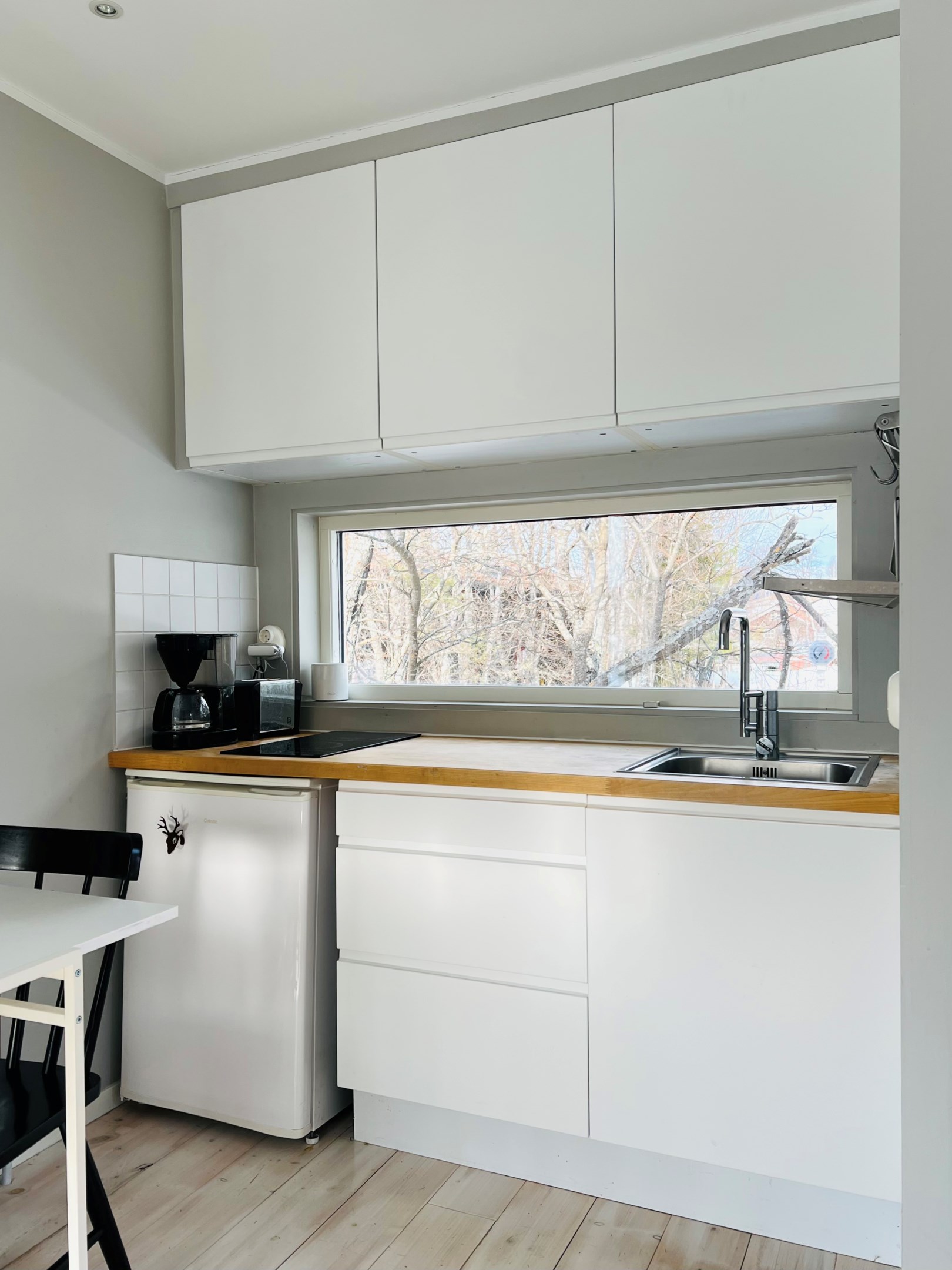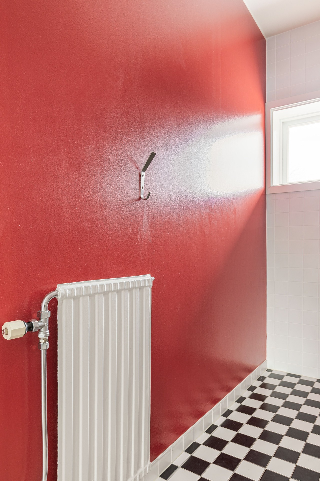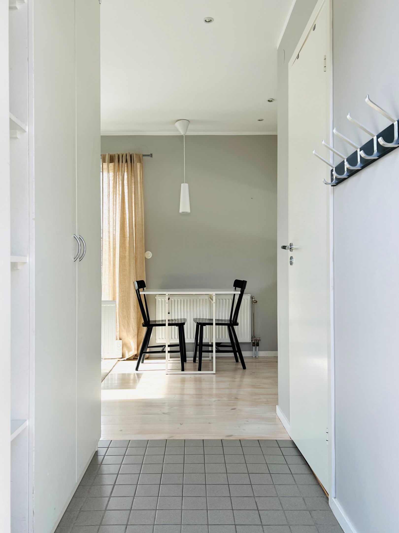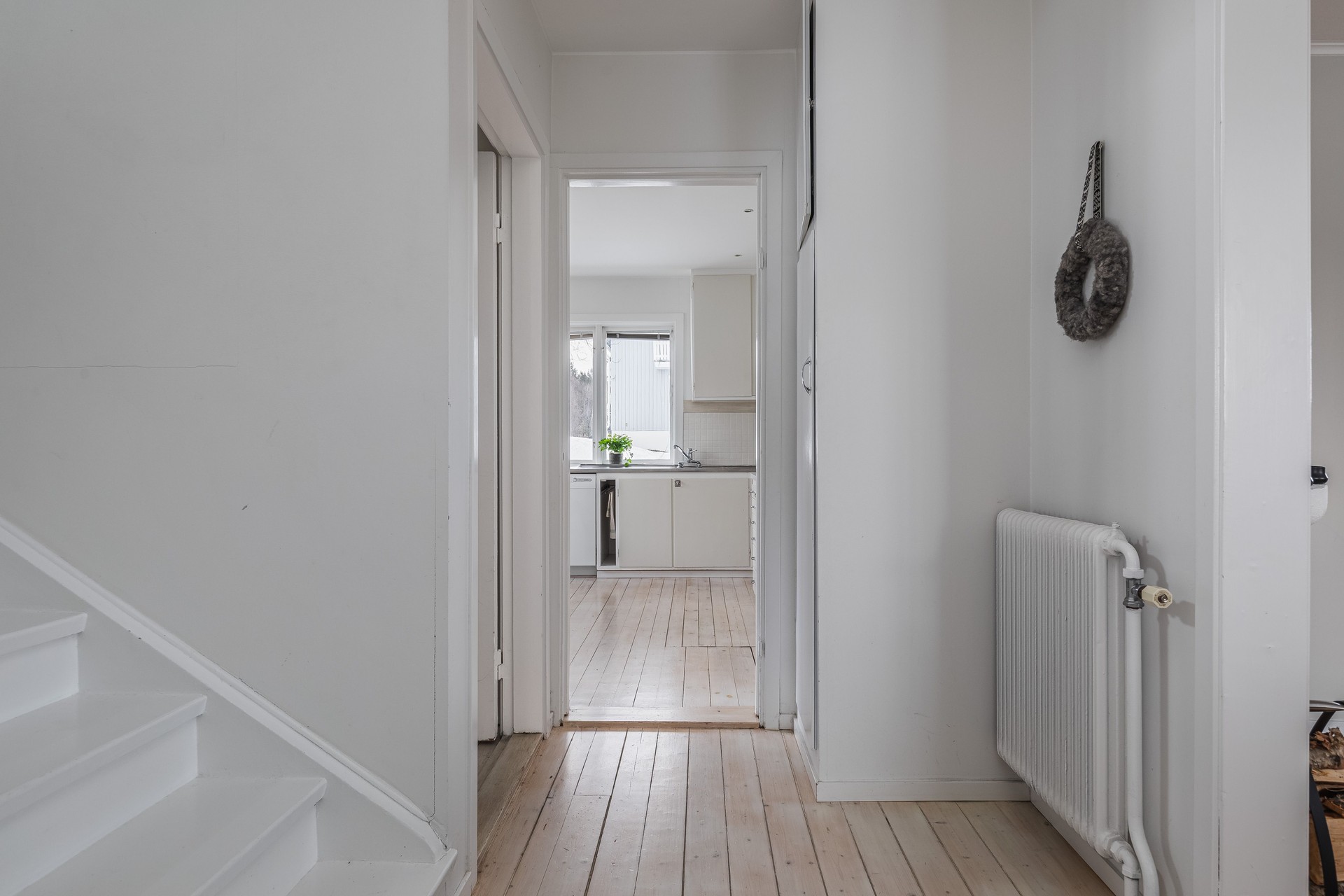 Det här praktiska hallrummet är en tillbyggnad av huset från 2011. Ca 5 kvadratmeter stort som skapar bra utrymme för familjens kläder och ytterskor. Hallen fortsätter tre trappsteg upp, förbi trapphuset ner till källarvåningen och vidare in i husets entréplan. Klinkergolv med elektrisk golvvärme, målade skivor på väggar och i tak.