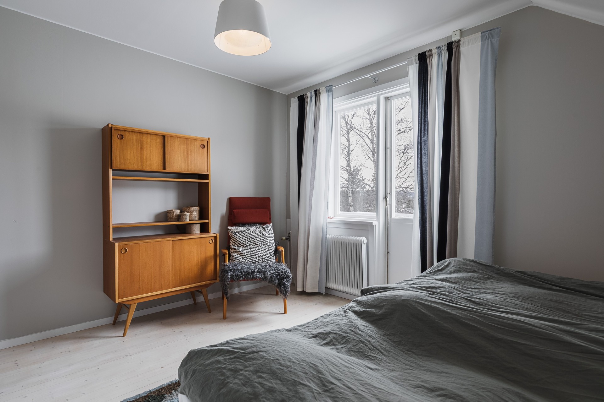 Sovrummet angränsar till trapphuset som leder upp till det övre planet. Ett större sovrum med fönster i två väderstreck, plats för dubbelsäng och garderober. Trägolv, målade skivor på väggar och i tak.