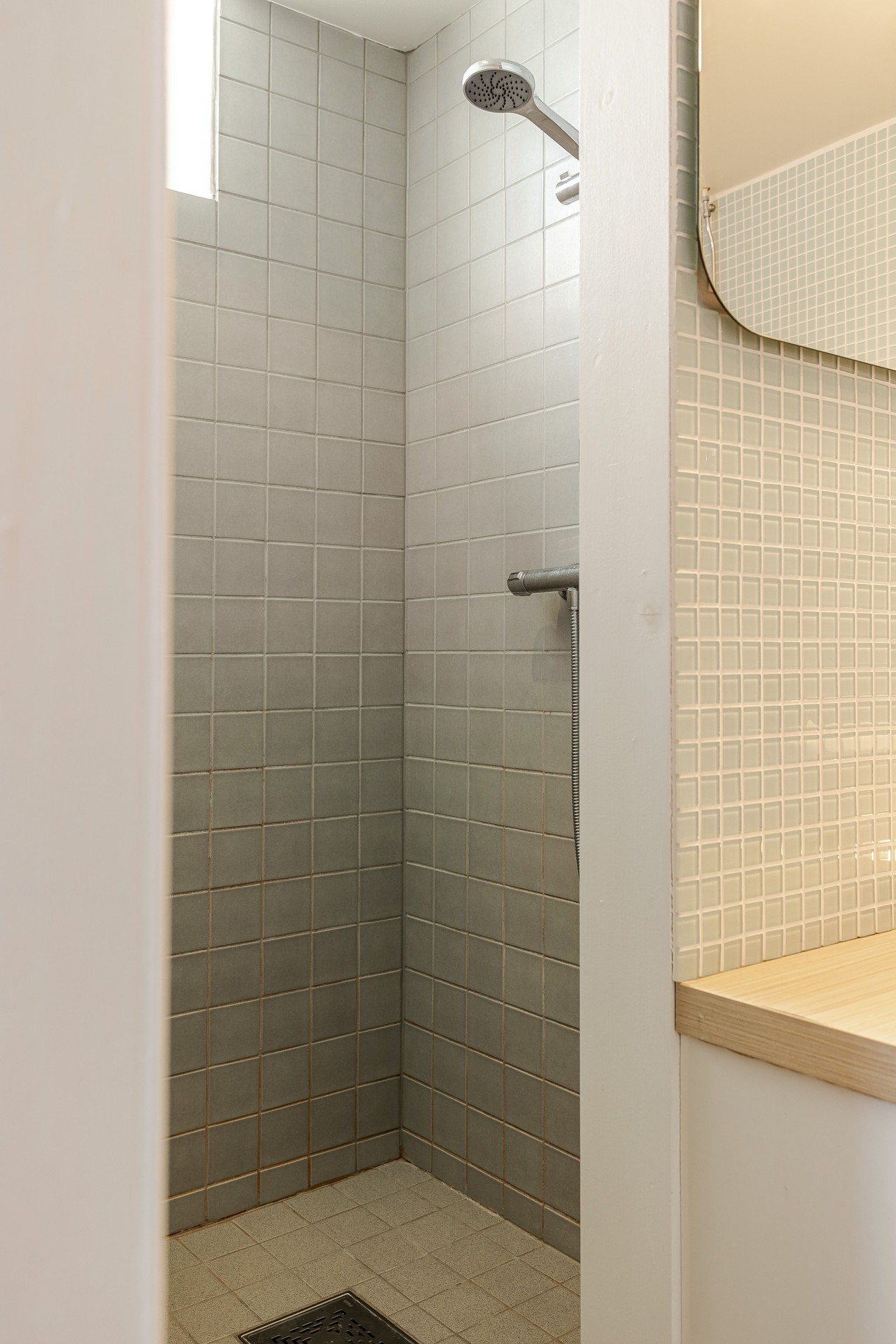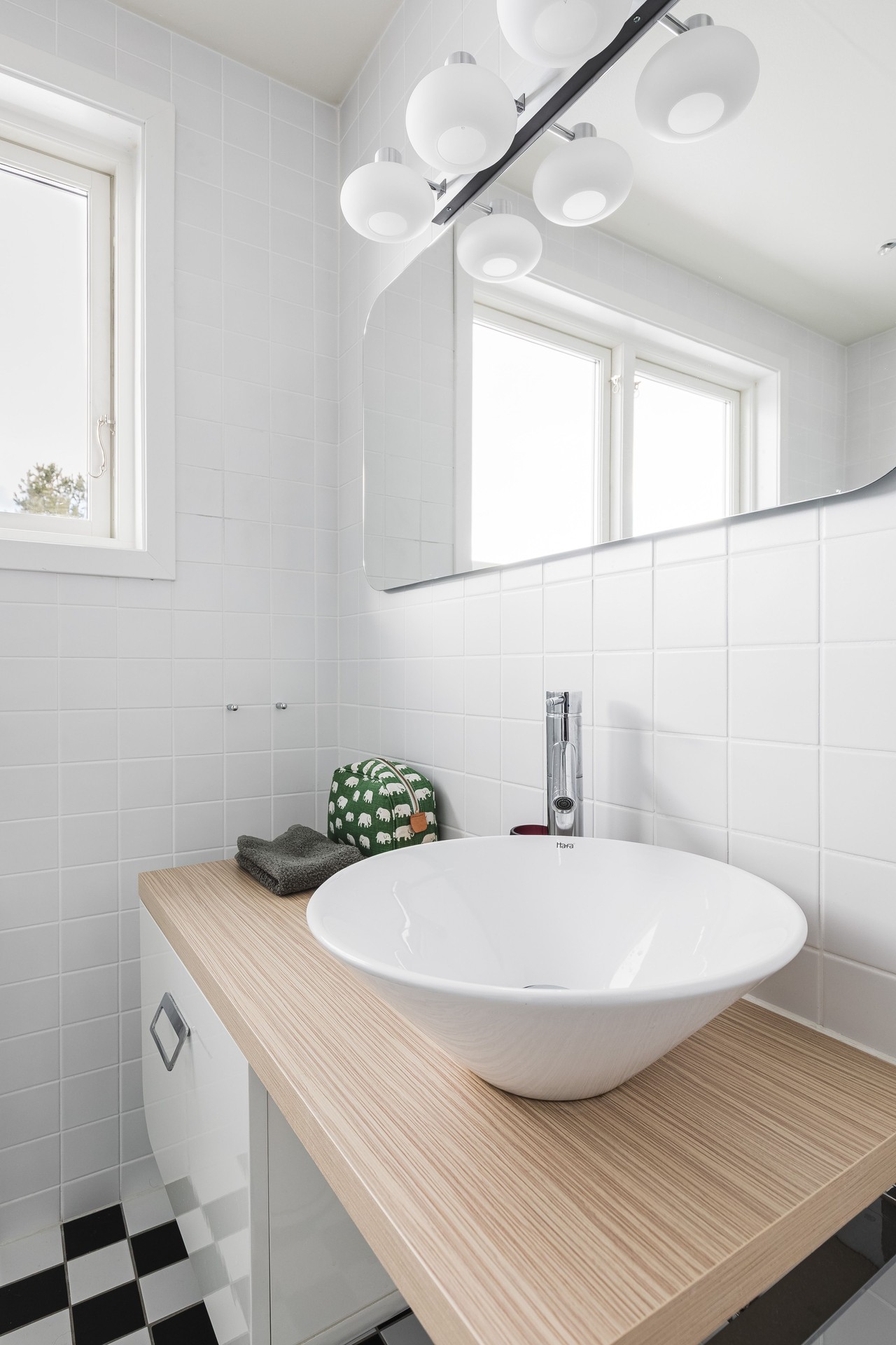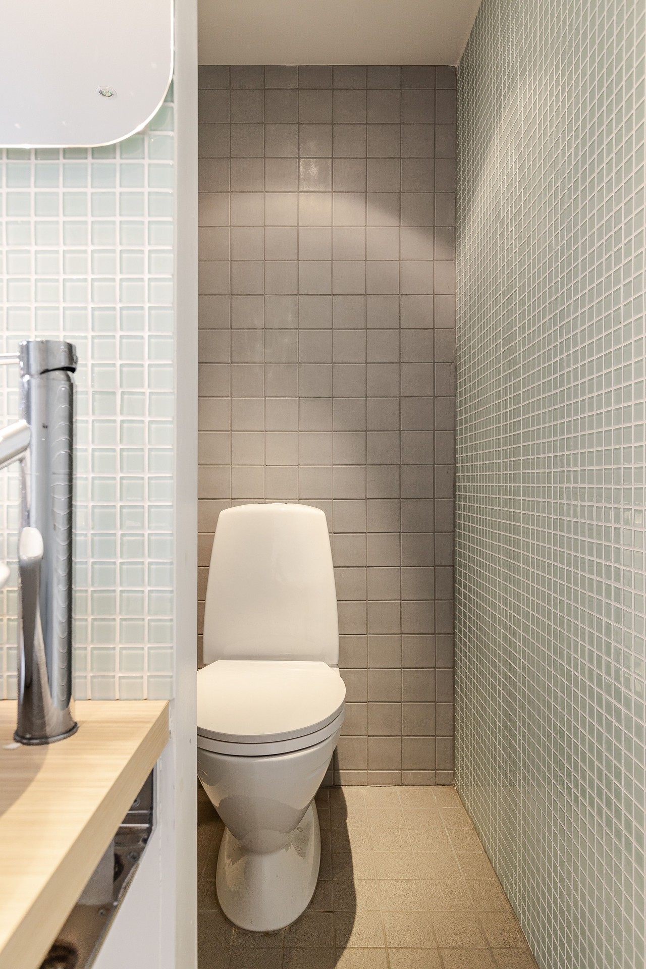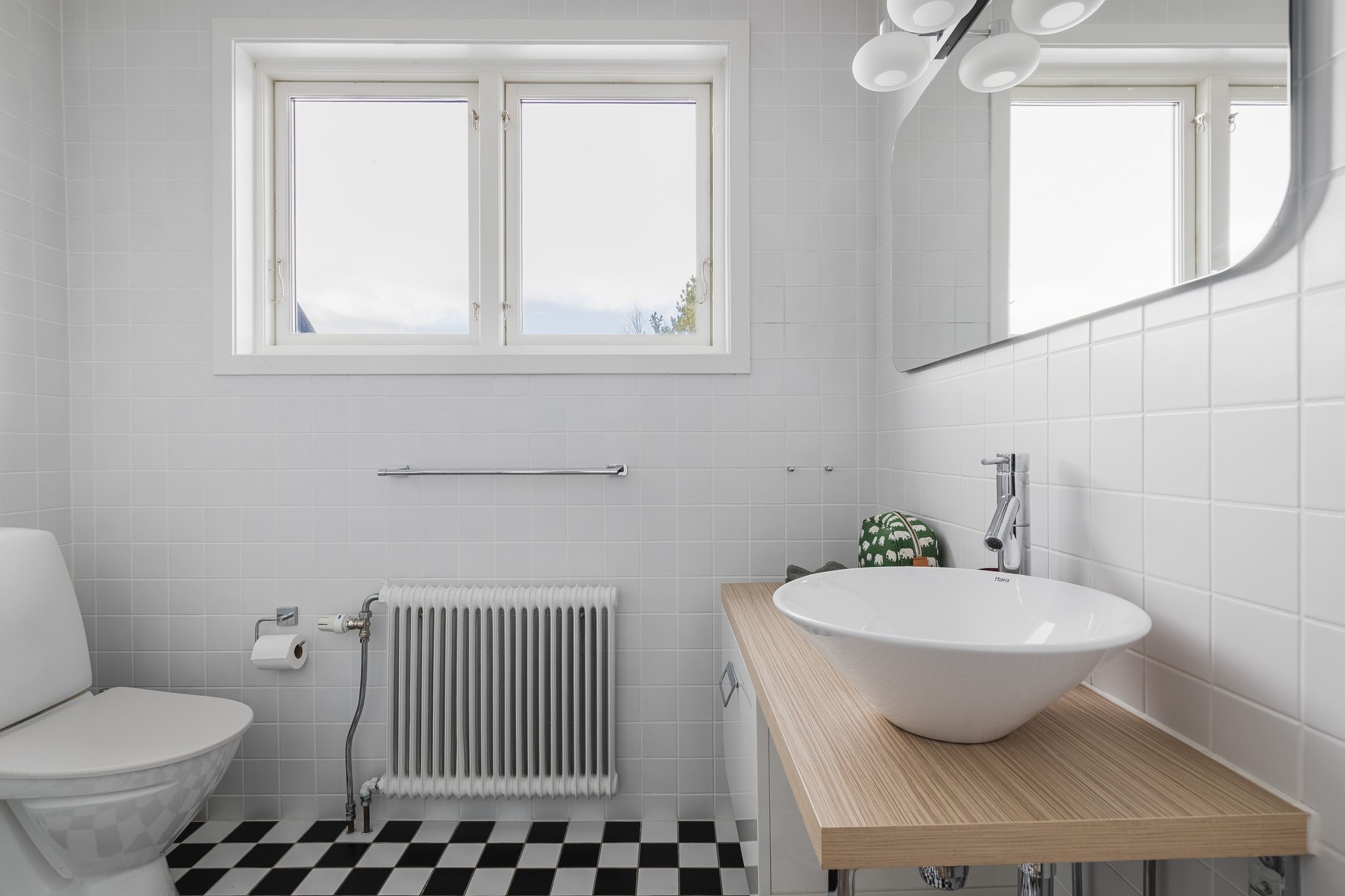 Badrummet har fönster ner, mot Funäsdalssjön och klinkergolv med elektrisk golvvärme. Wc, dusch med glasdörrar och handfat på kommod. Kaklade väggar och målade skivor i tak.